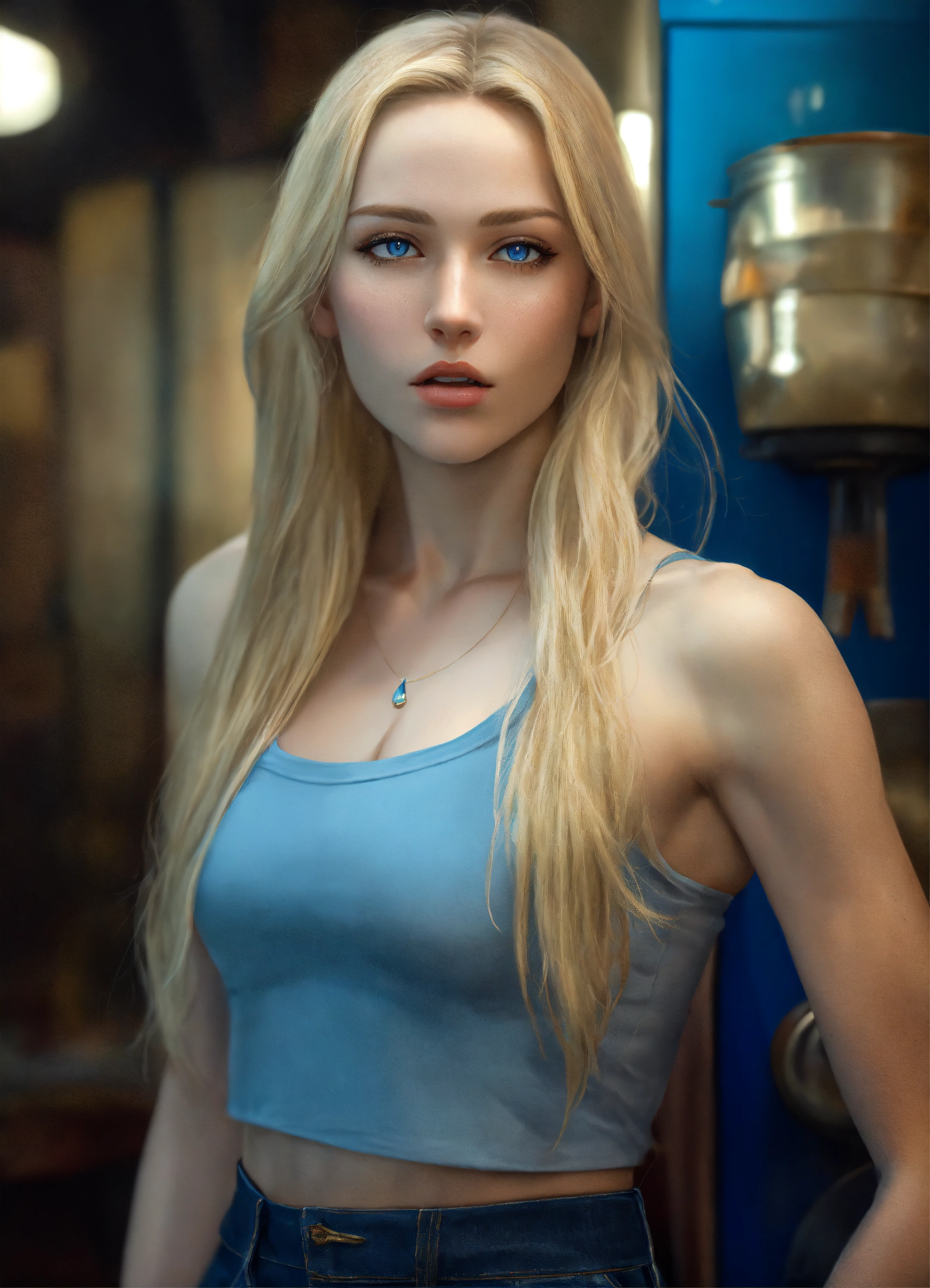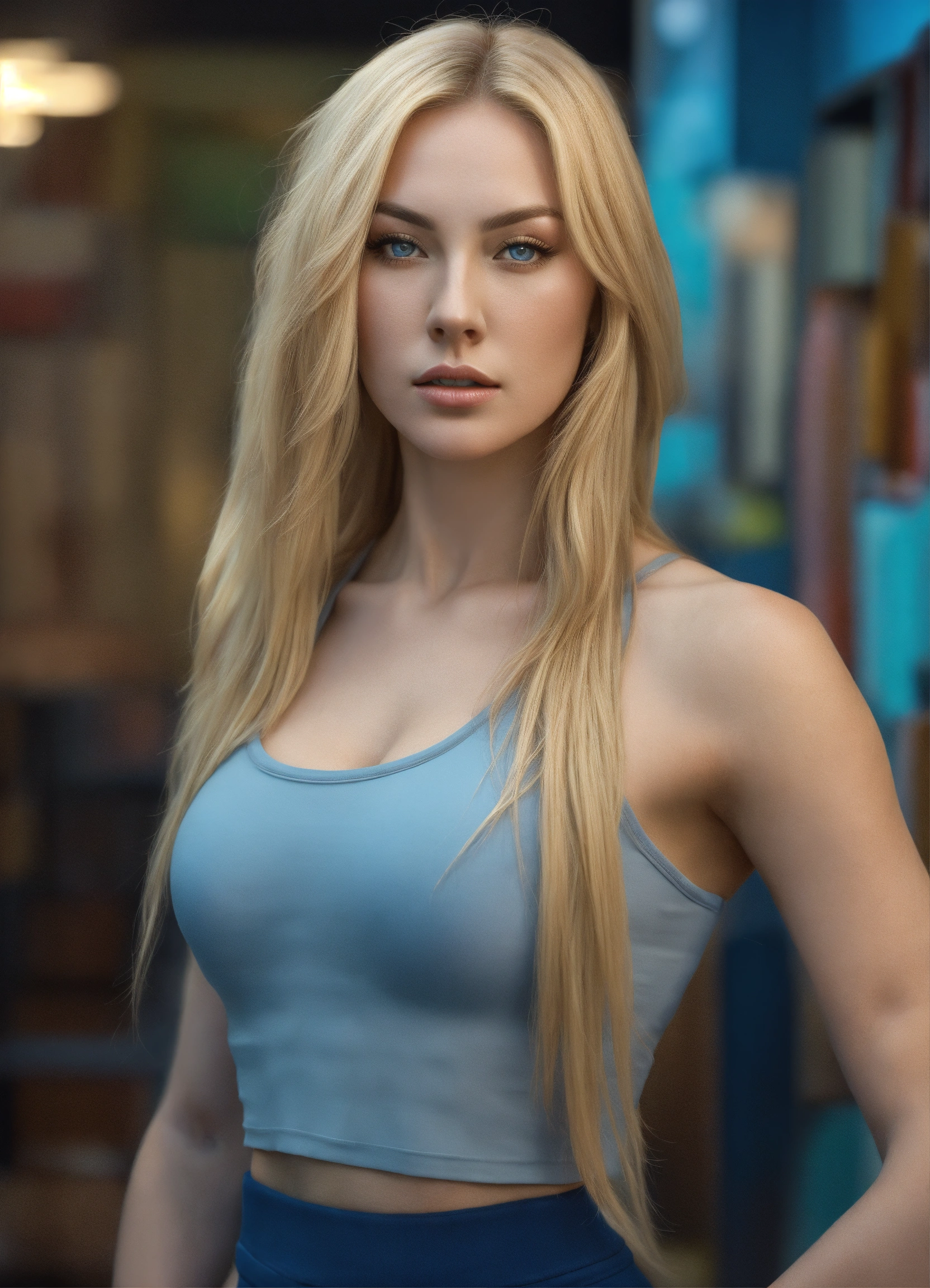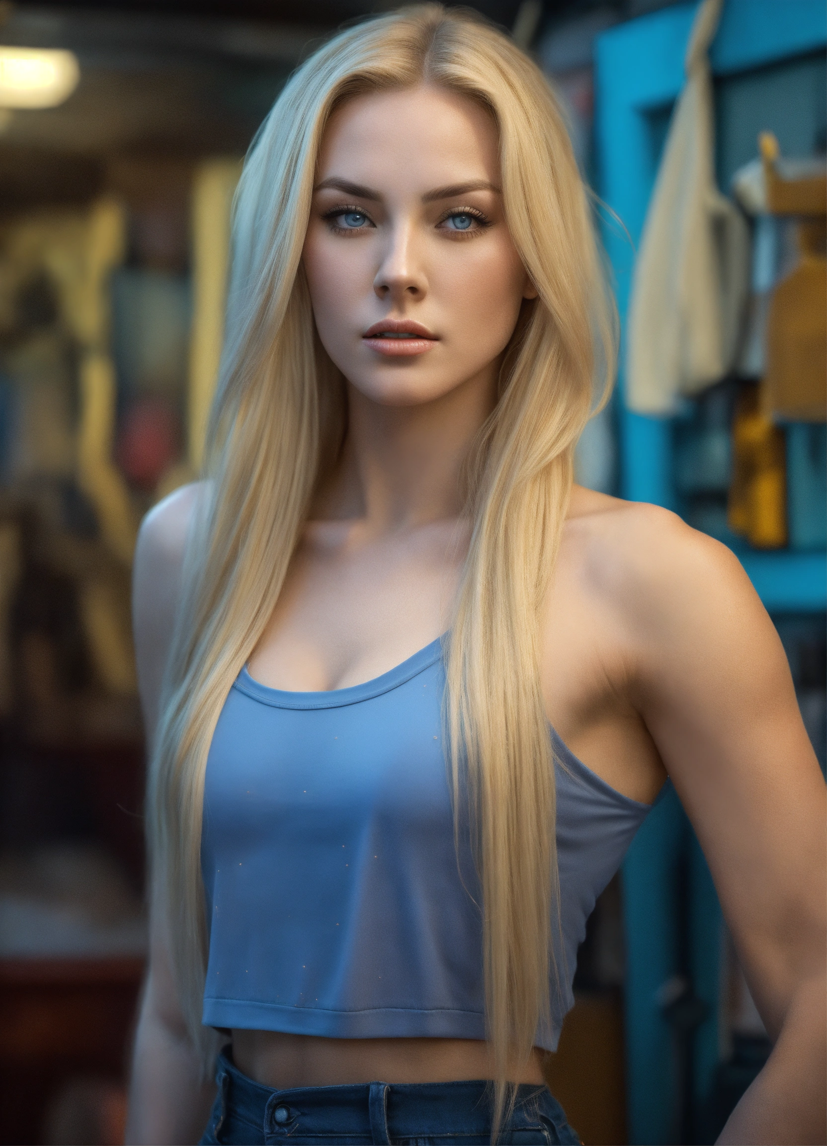 Full body potrait of a women transforming into a tall woman, extremely attractive ideal face, extremely pale white skin, long blonde hair, blue pupils, thin muscular midriff and arms, heavy chest with very confident face, hyper realistic, highly detailed, crop top, three quarter pose, 4k, hdr, smooth, sharp focus, high resolution.
