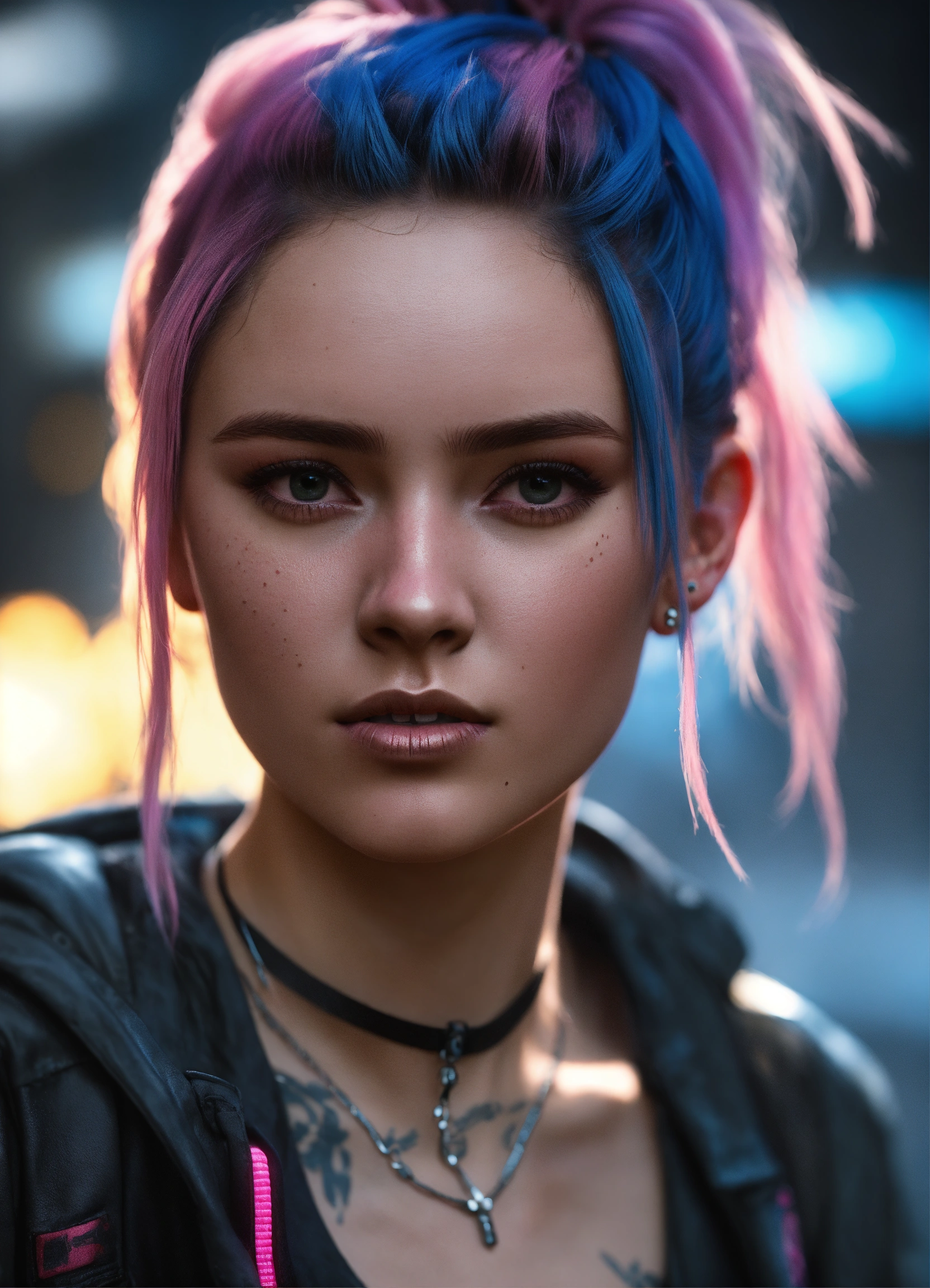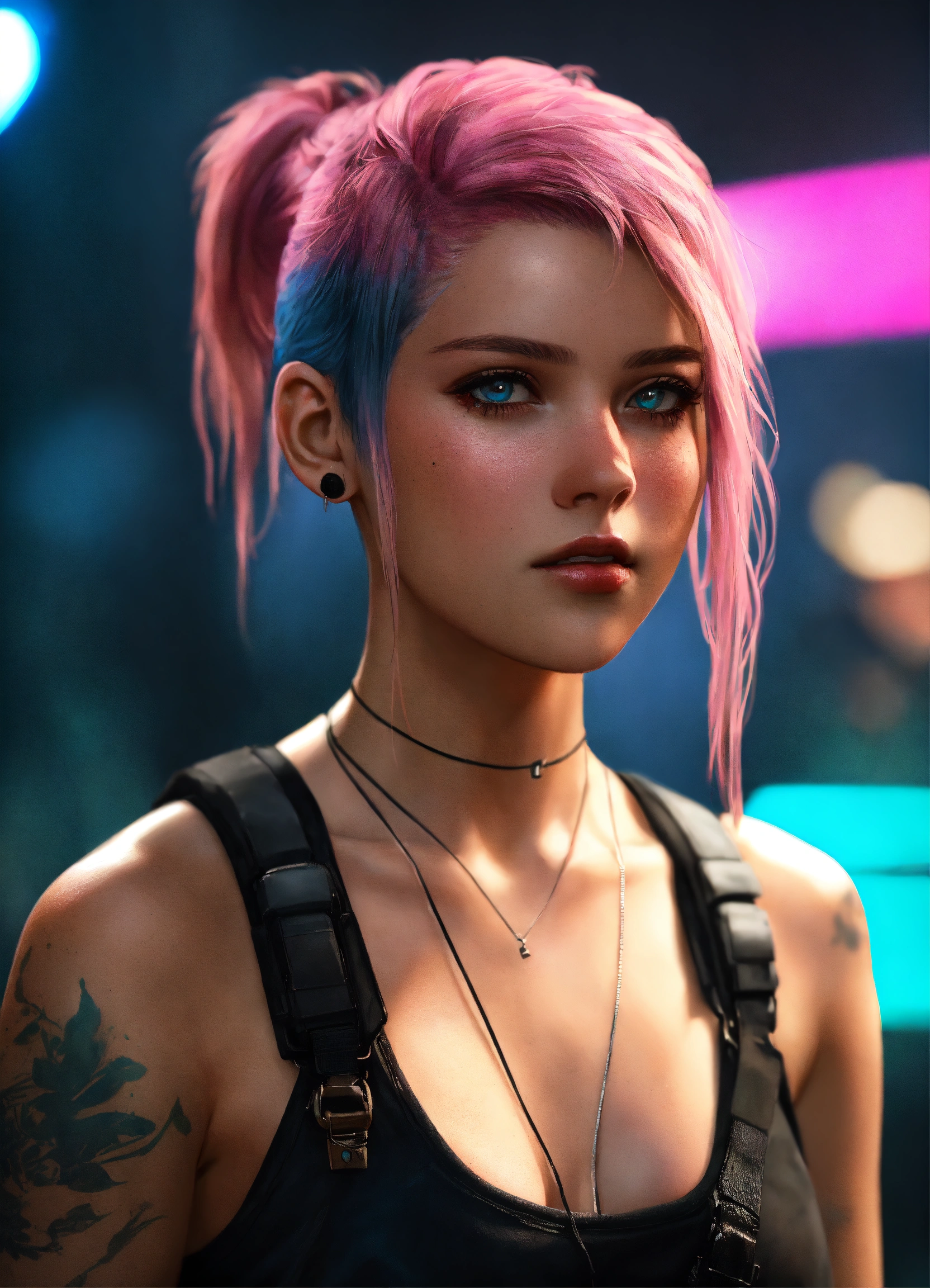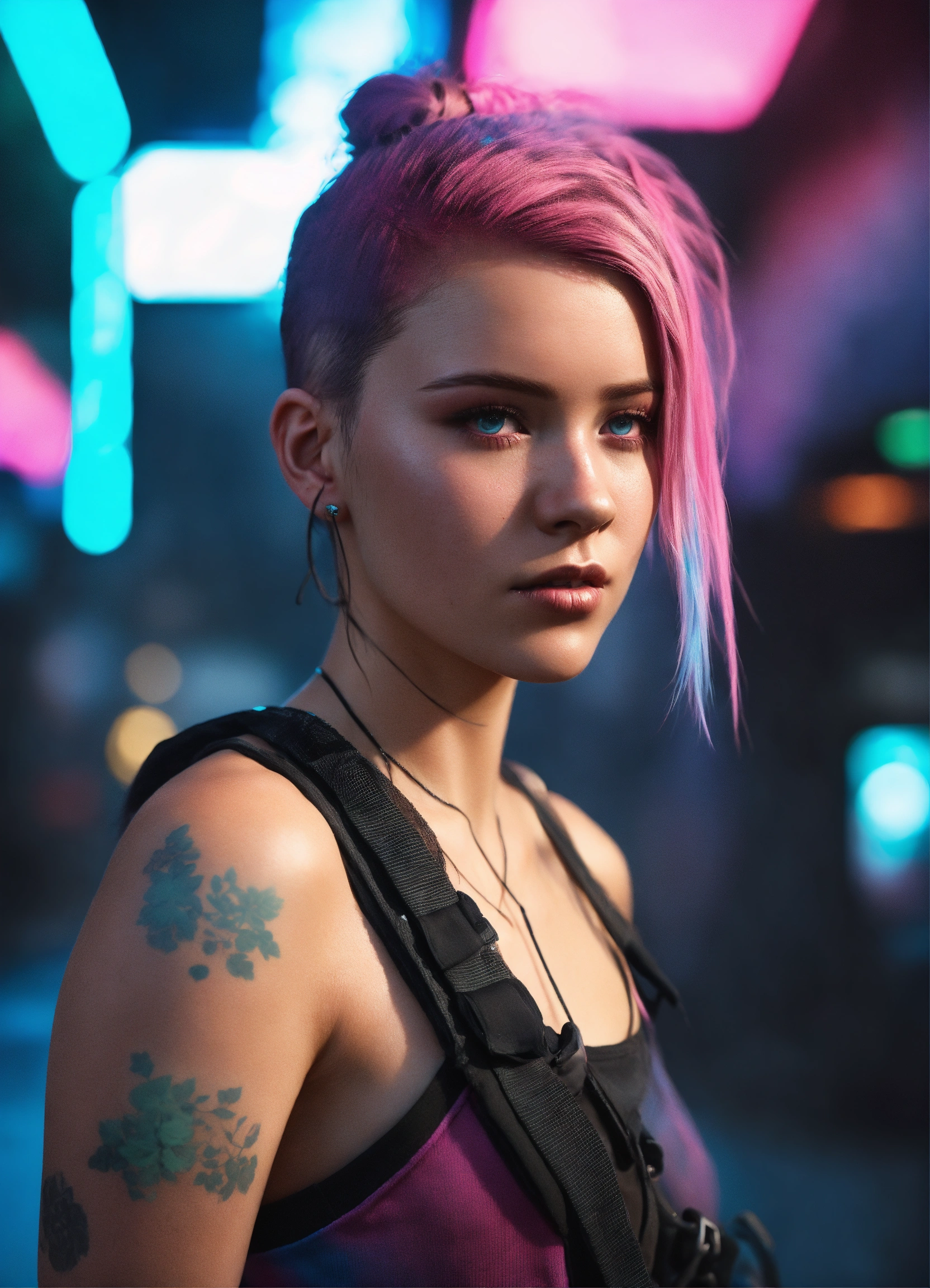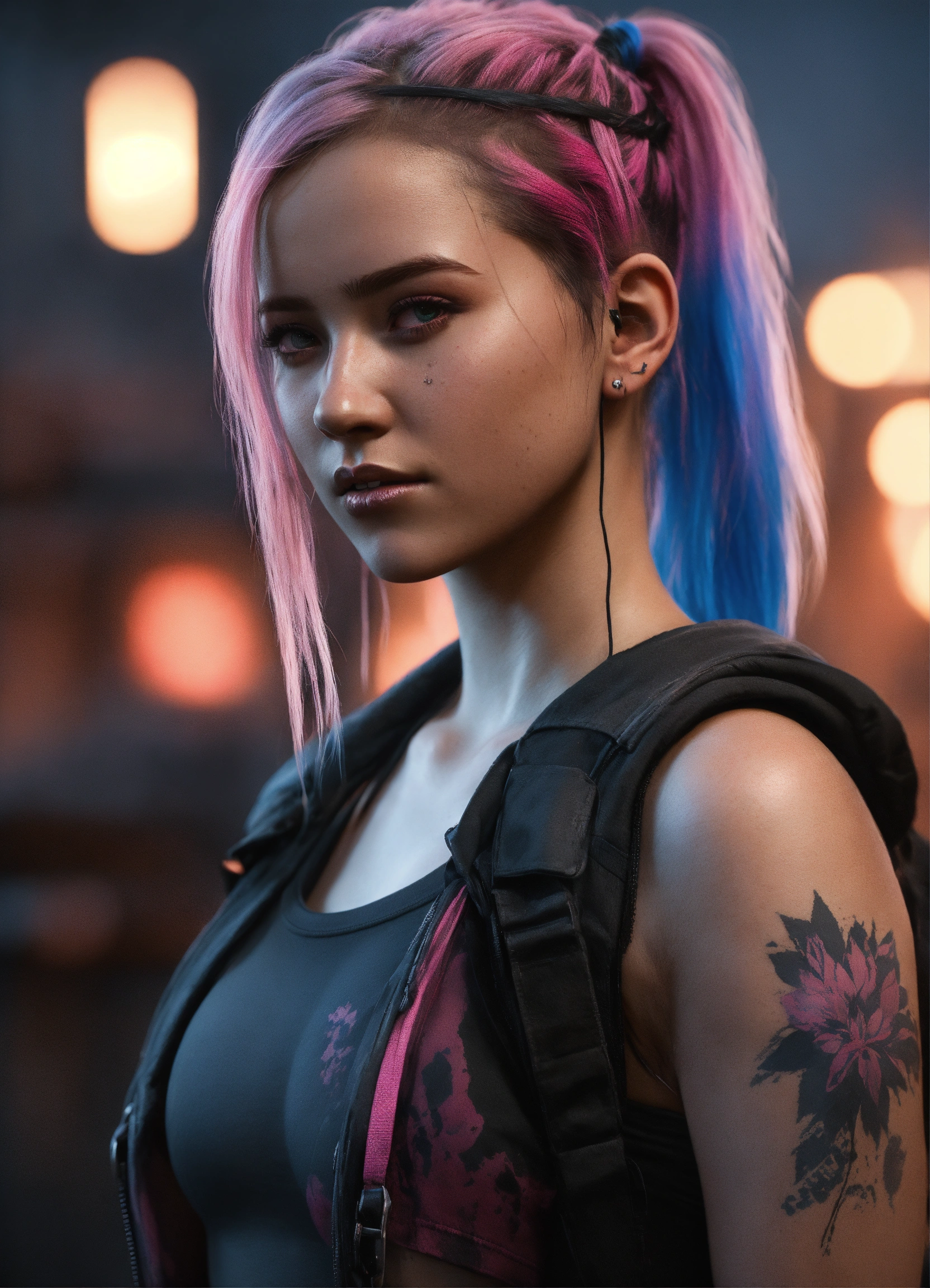Highly detailed portrait of ellie williams the last of us as a young woman 20 years old, shaven sides pink into blue ombre hair pony tail, cyberpunk, wearing black skin tight black street wear black bralette, unreal engine 5, black, grunge aesthetic!!! bokeh