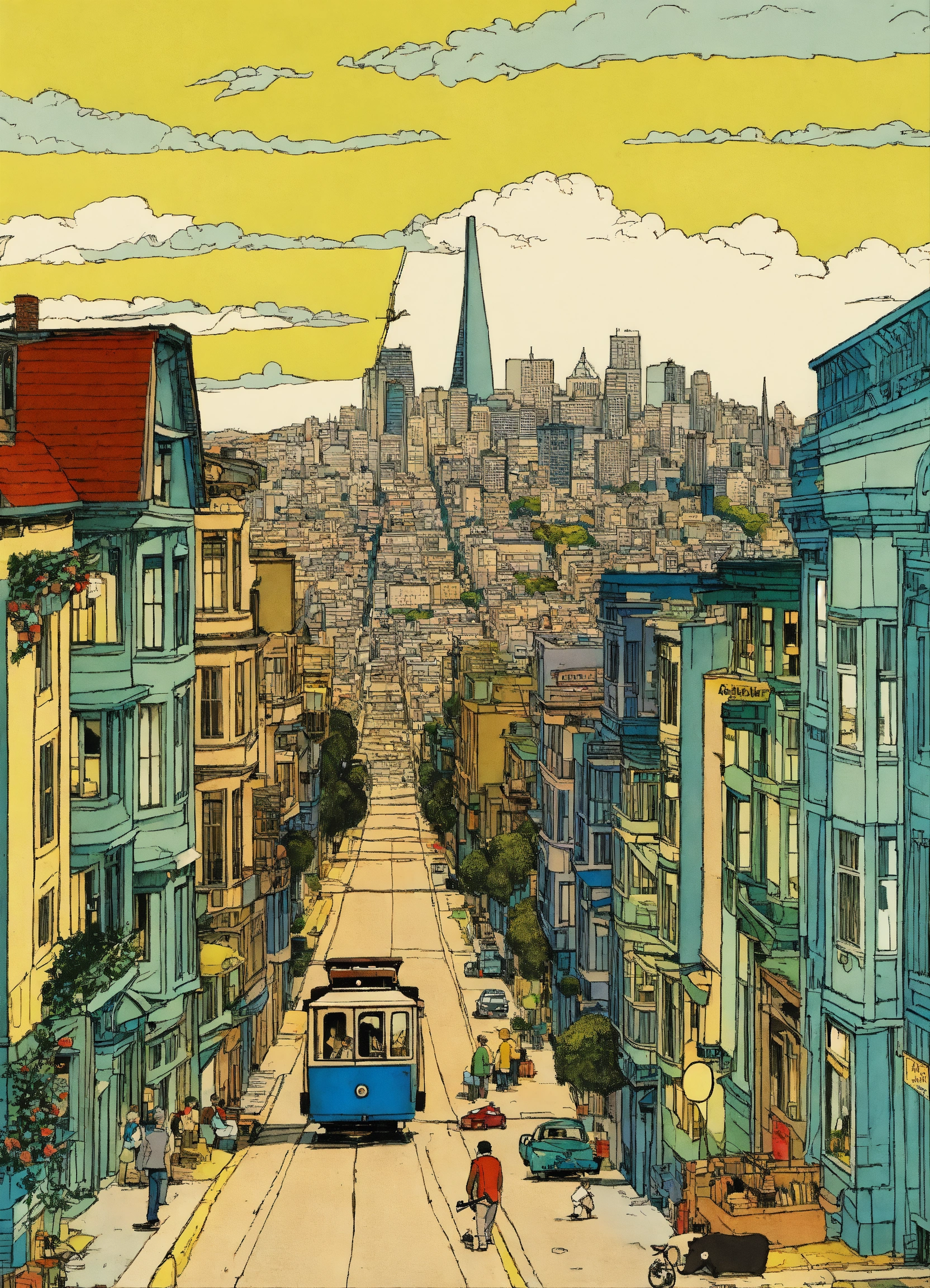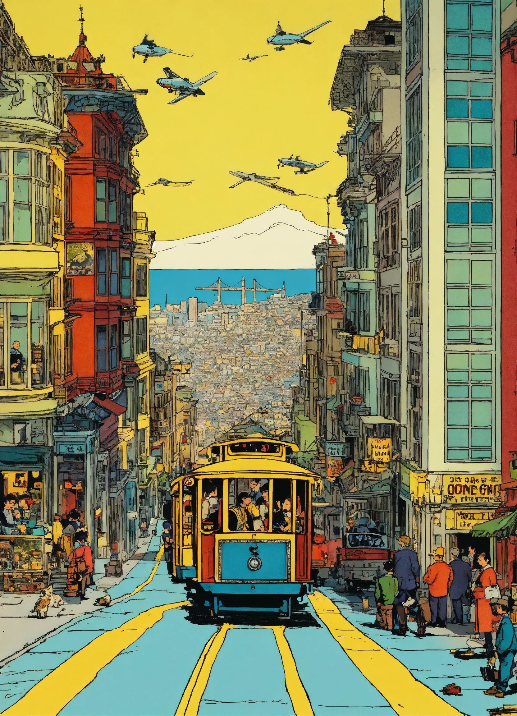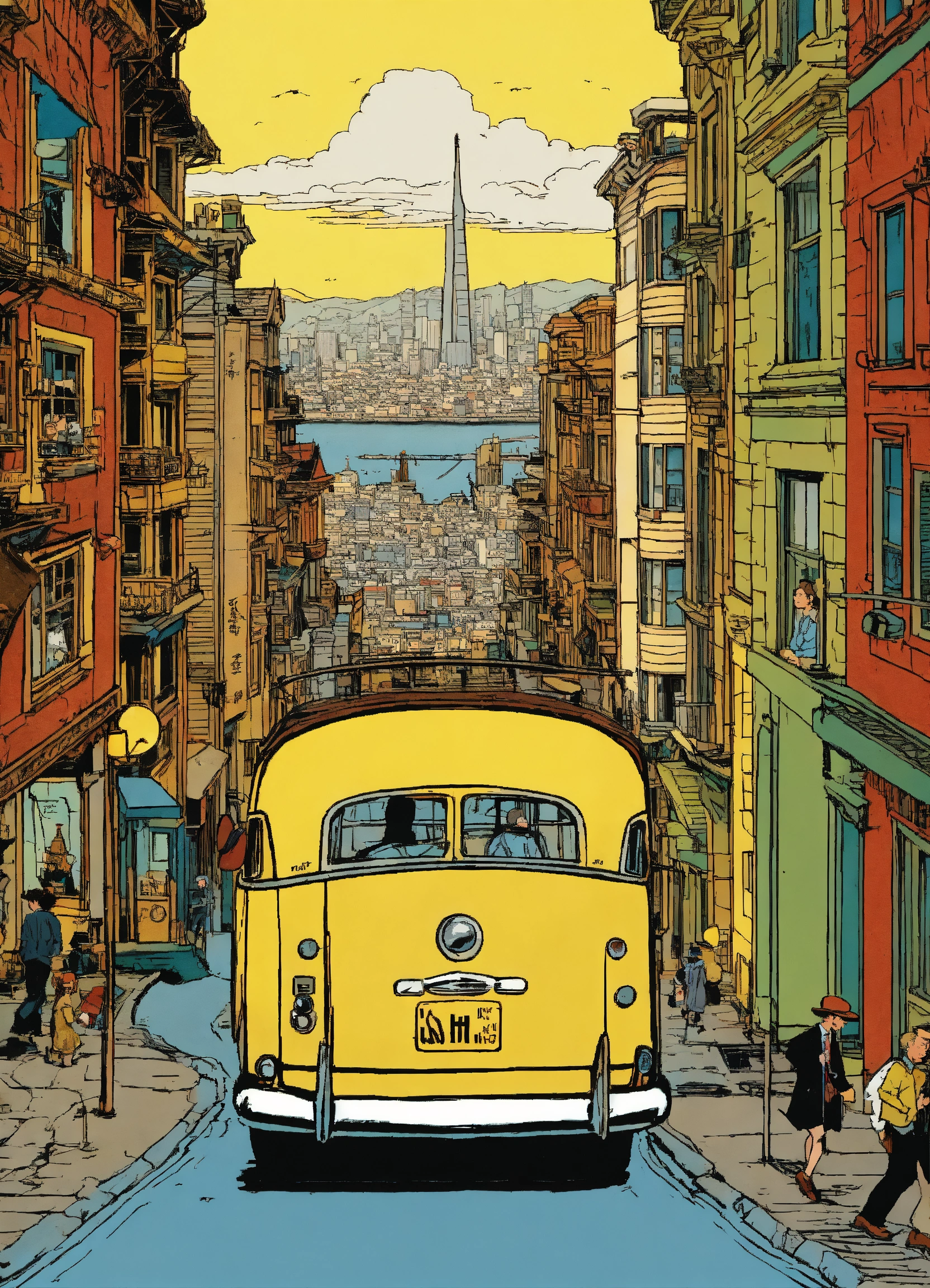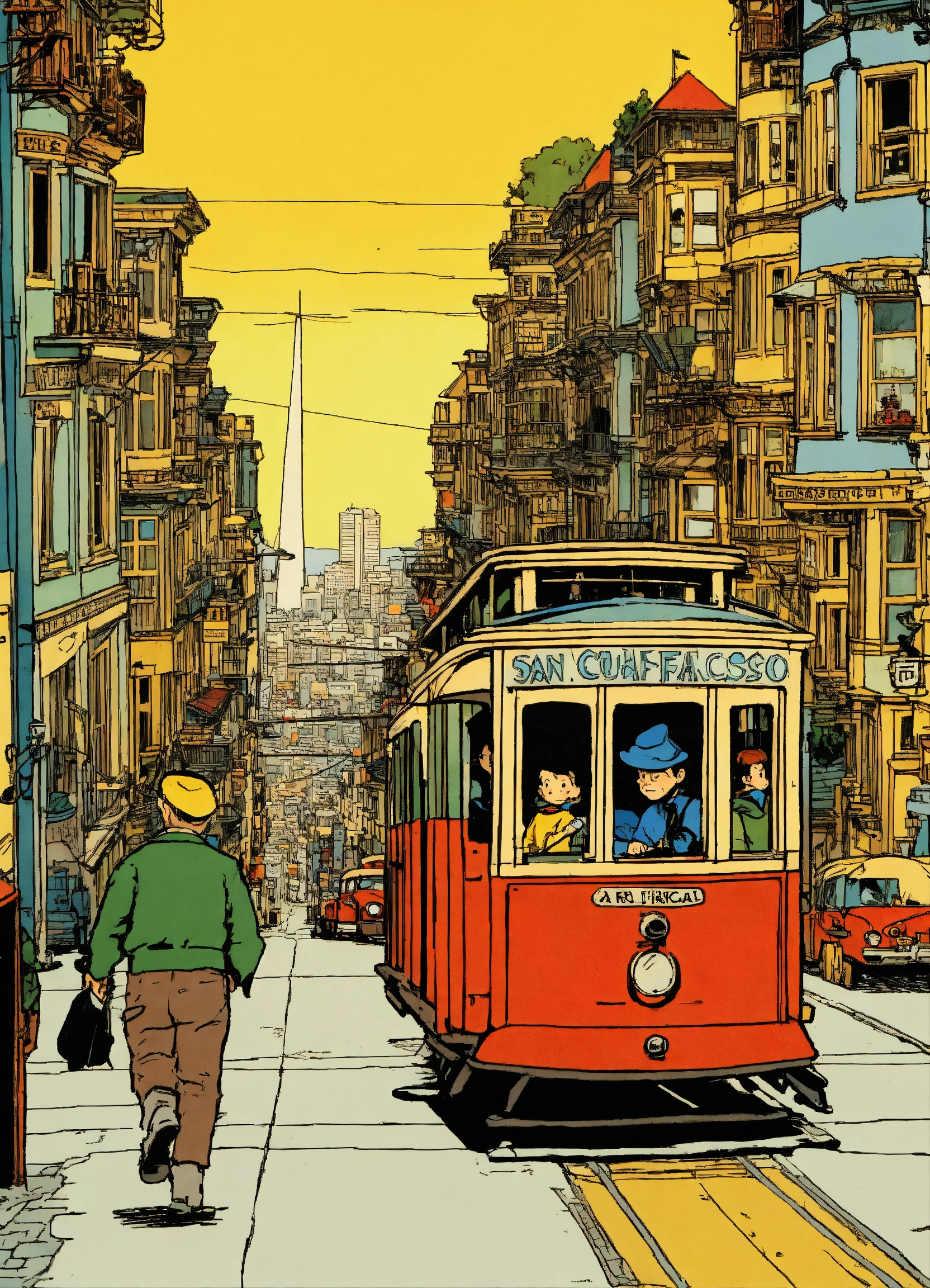 Beautiful san francisco, illustrated by hergé, style of tin tin comics, pen and ink., beautiful colors, attention to detail