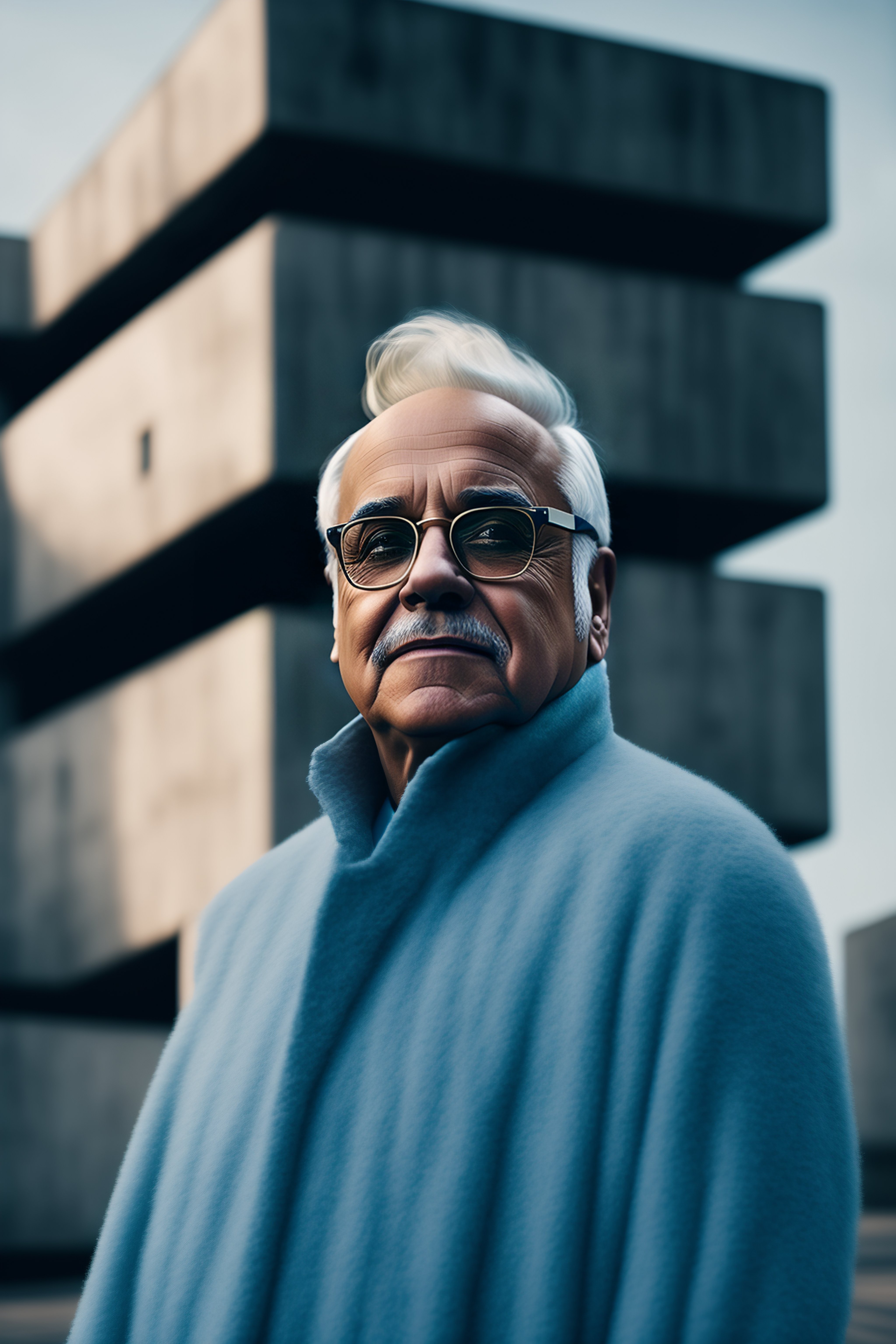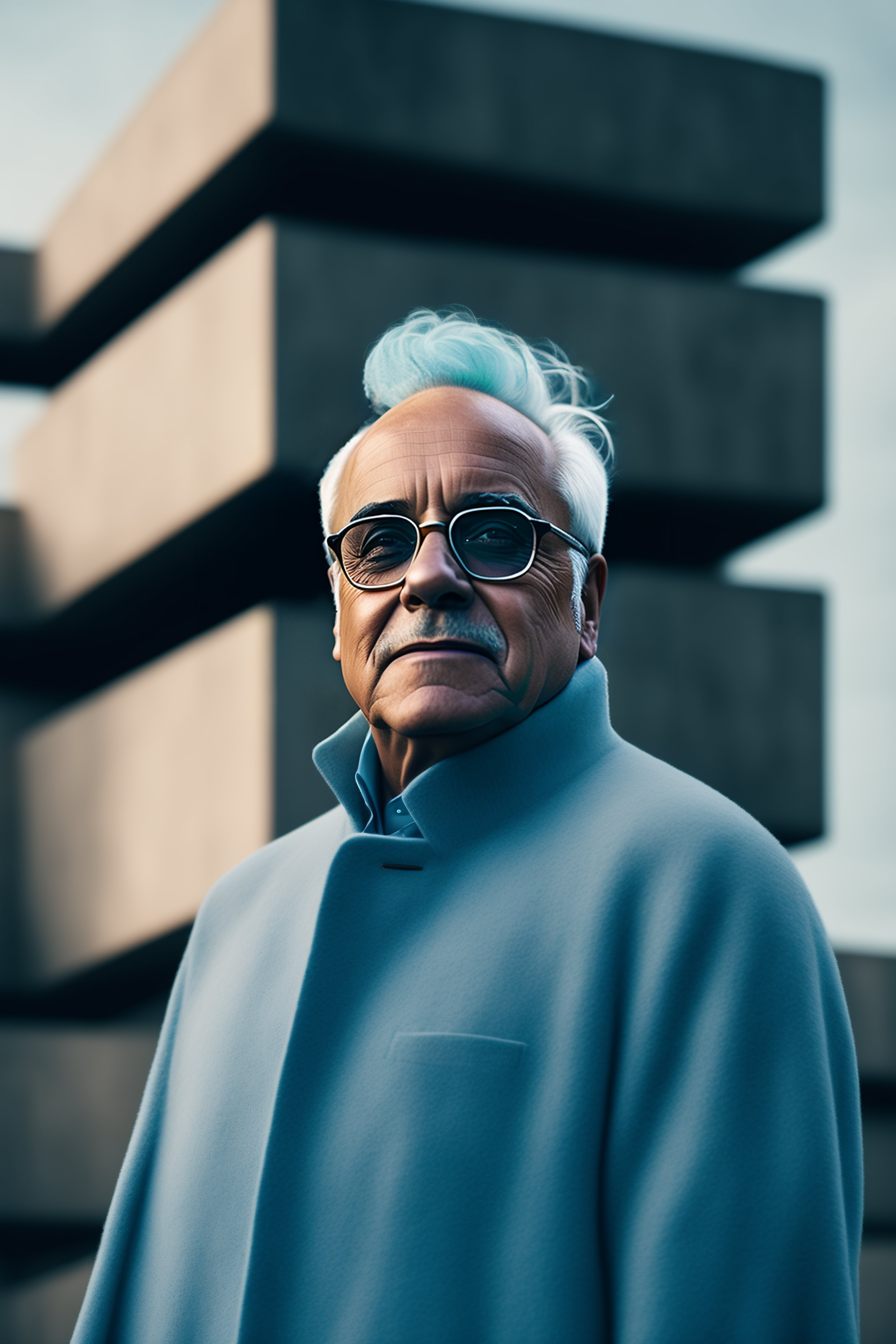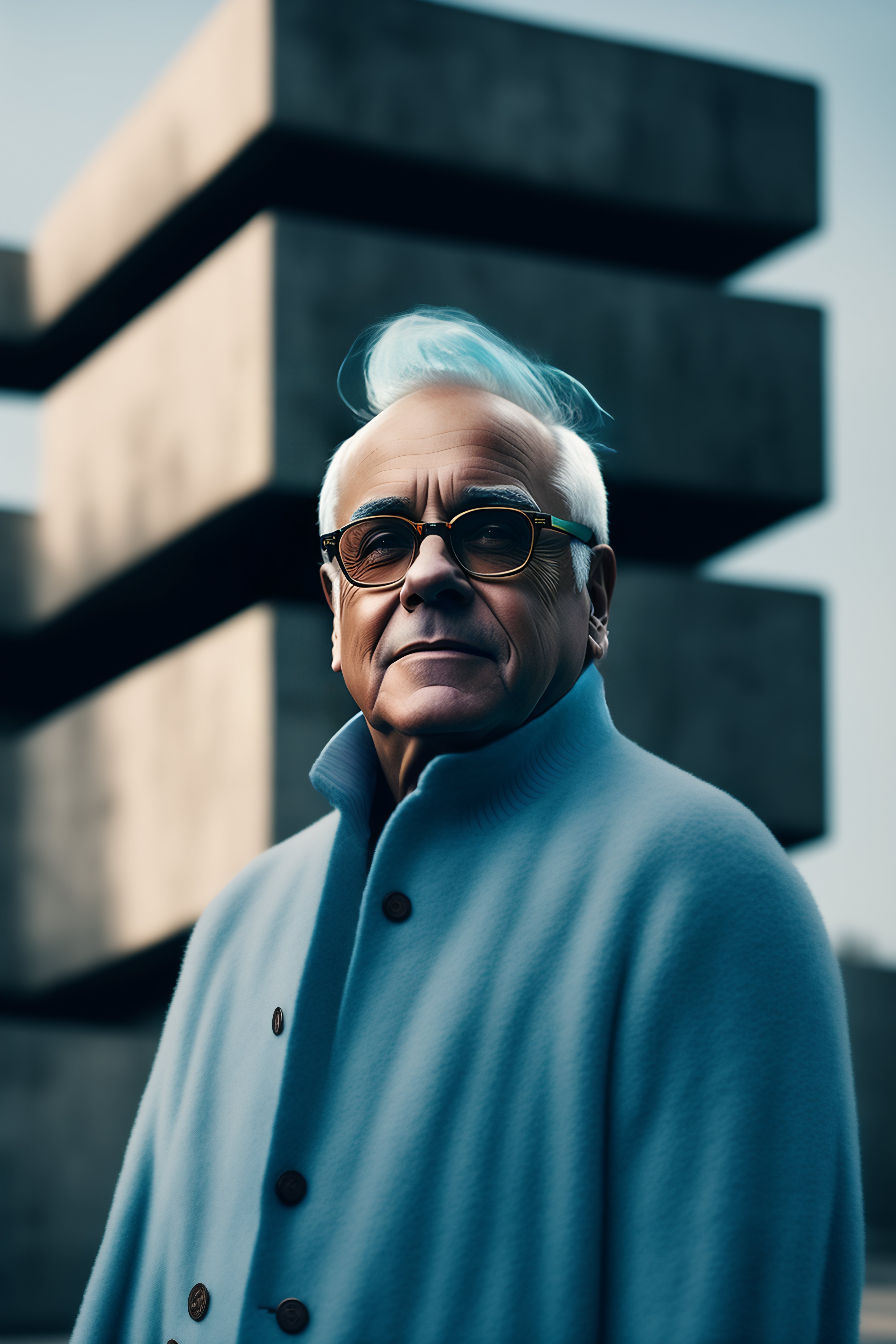Portrait of danny devito with pale blue hair, ethereal dreamy foggy, photoshoot by alessio albi, editorial fashion magazine photoshoot, fashion poses, in front of brutalist building architecture. kinfolk magazine. film grain.