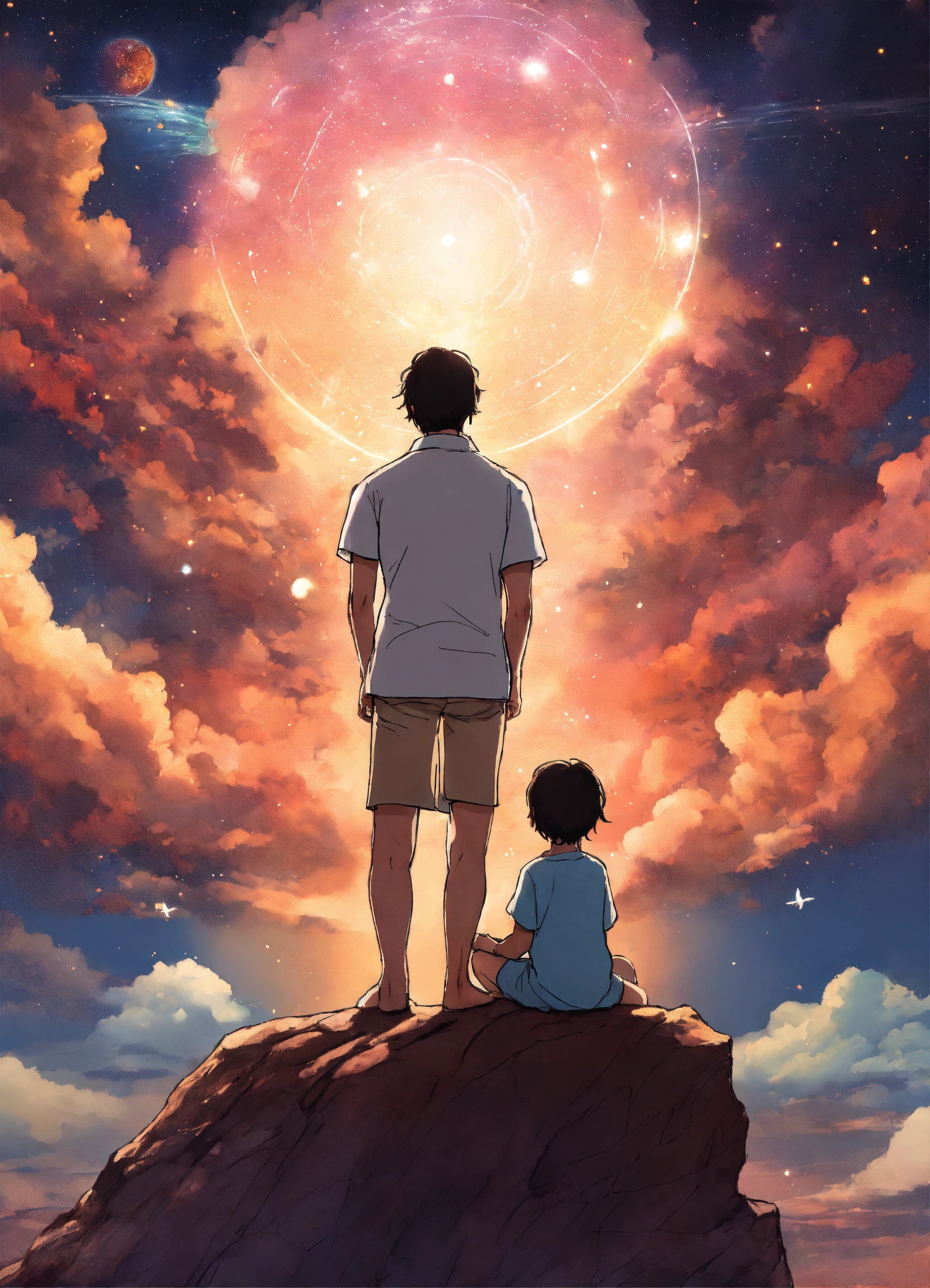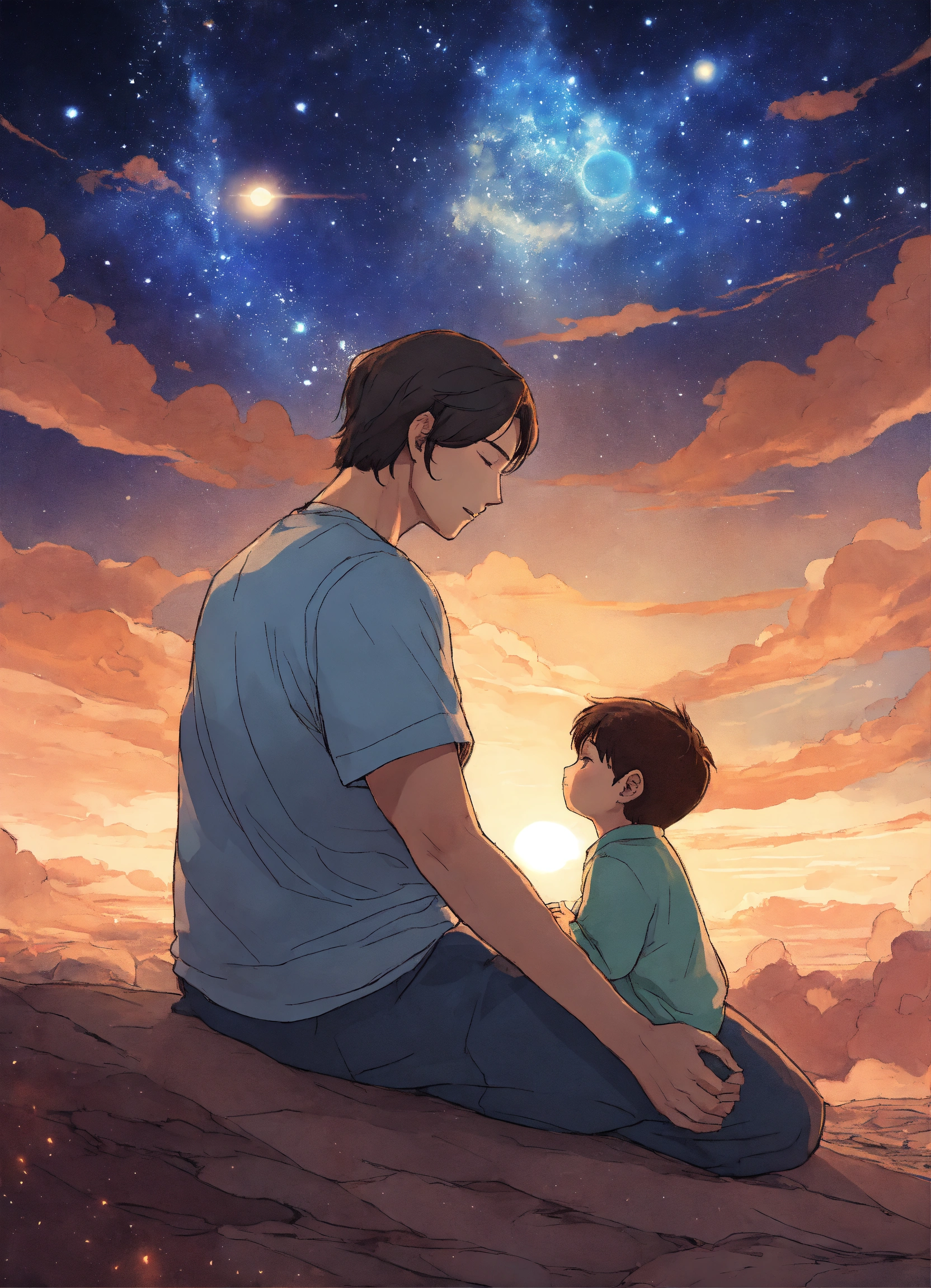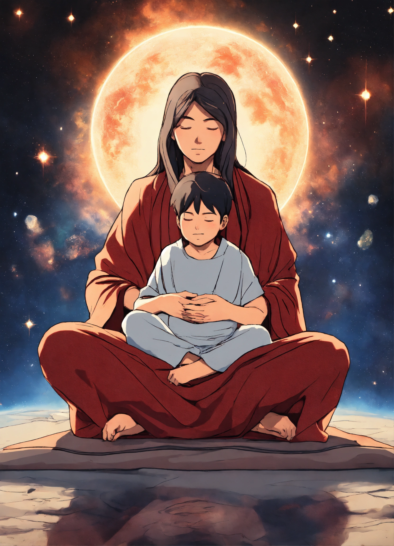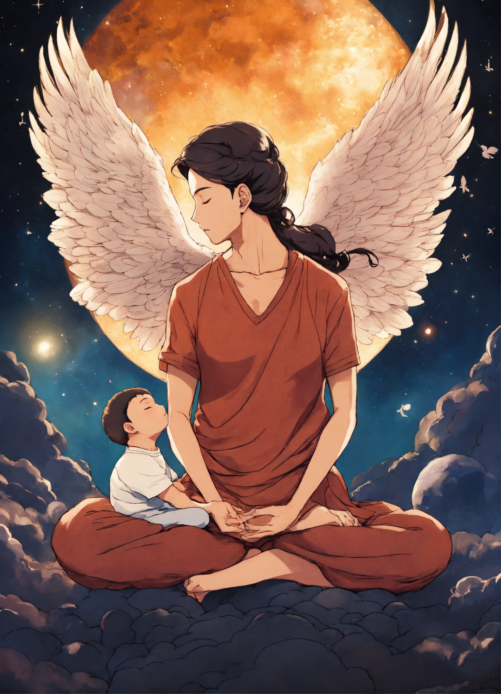 Madre padre e hijo latino meditando, ángeles protegido, medium shot, alzando vuelo, fuerza del amor, fondo del universo, manga anime style.