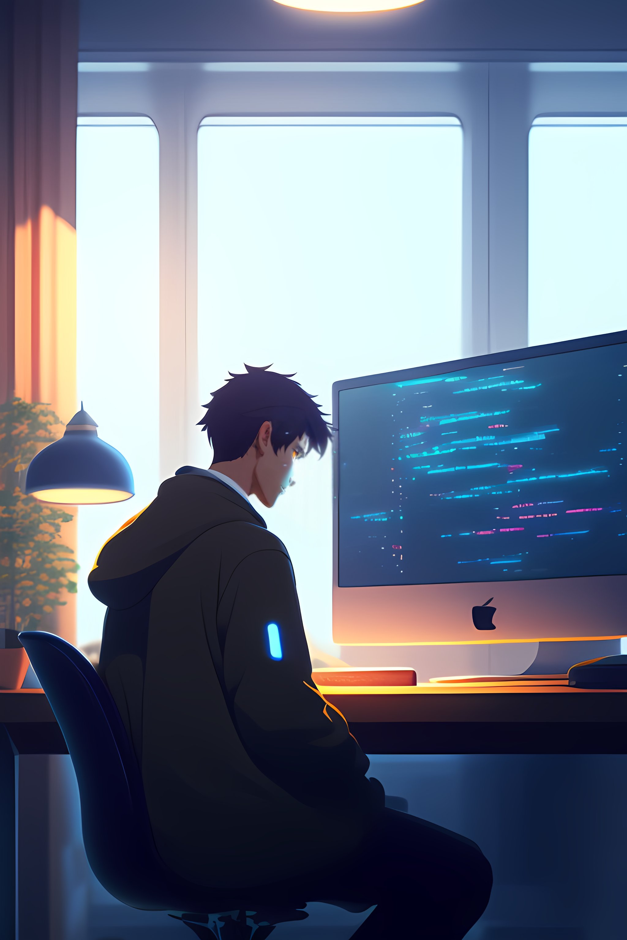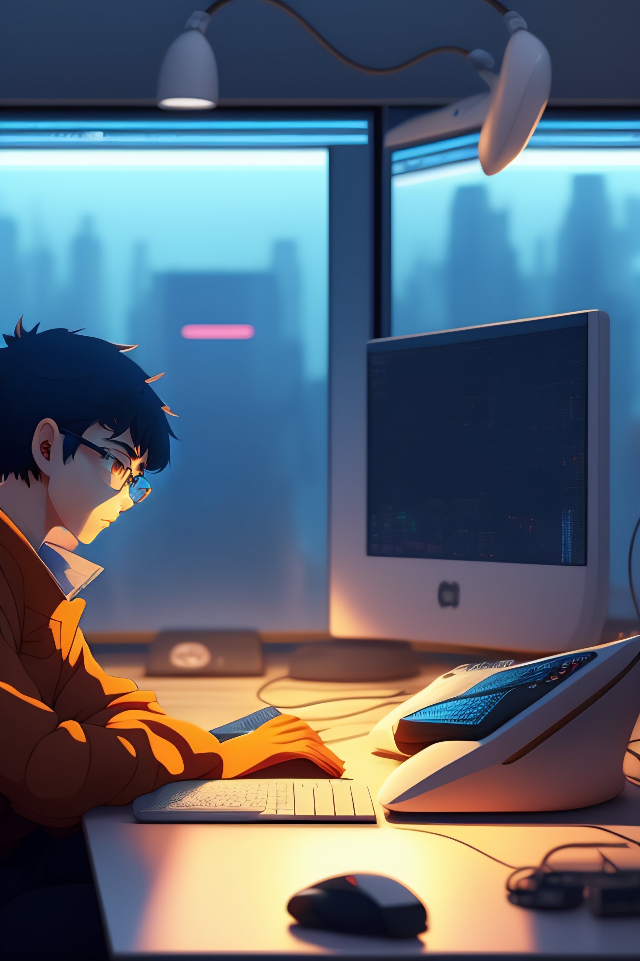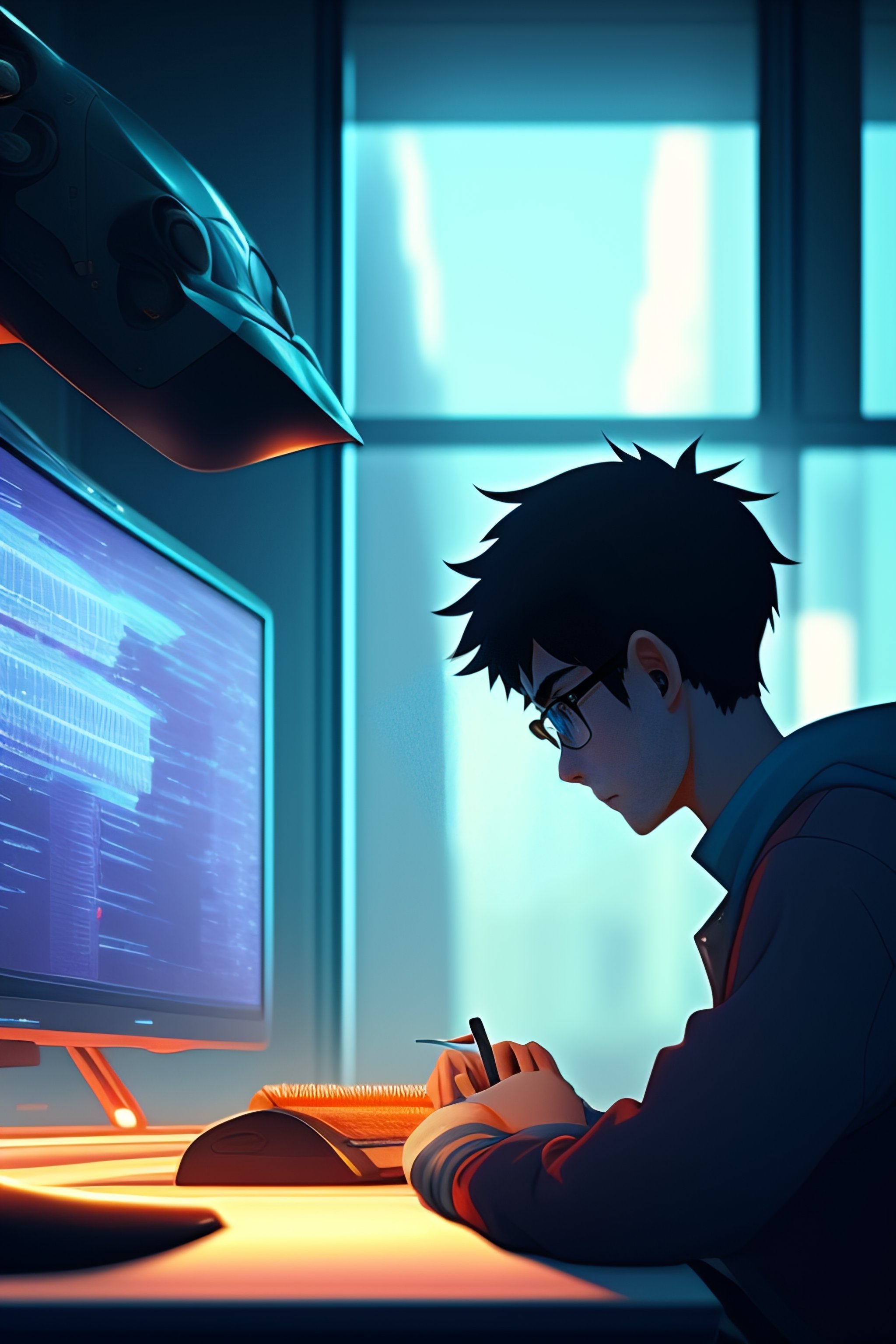 A nerdy boy is programming at a computer in a room full of gadgets, by makoto shinkai and ghibli studio, outlined silhouettes, dramatic lighting, highly detailed, incredible quality, trending on artstation