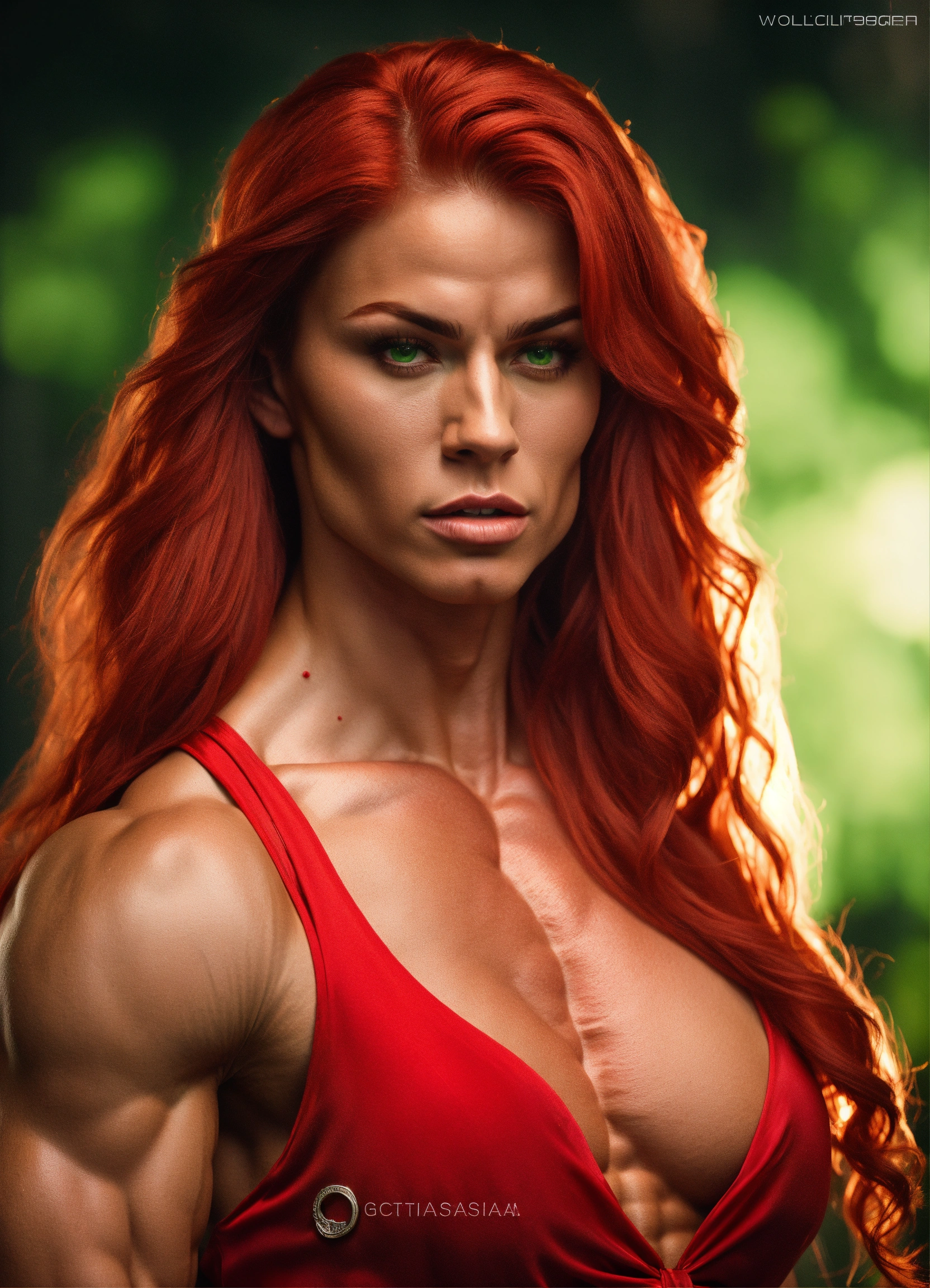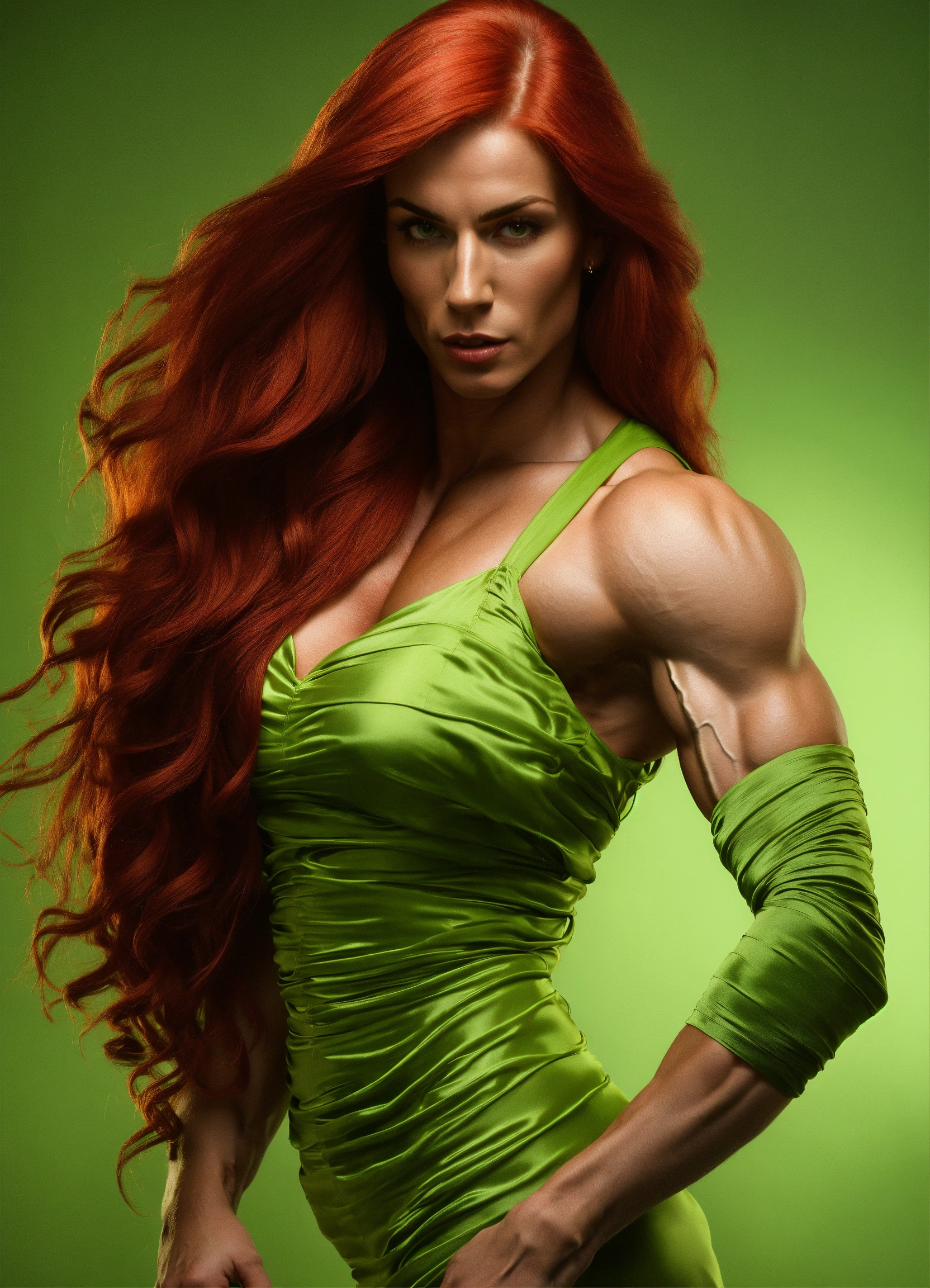 Anastasia2, woman, long red plaited hair, (((muscular))), hypermuscle, (((bodybuilder))), (((tall))), handsome, feminine, intricate, elegant, highly detailed, full figure, large biceps, long light green silk dressfull face