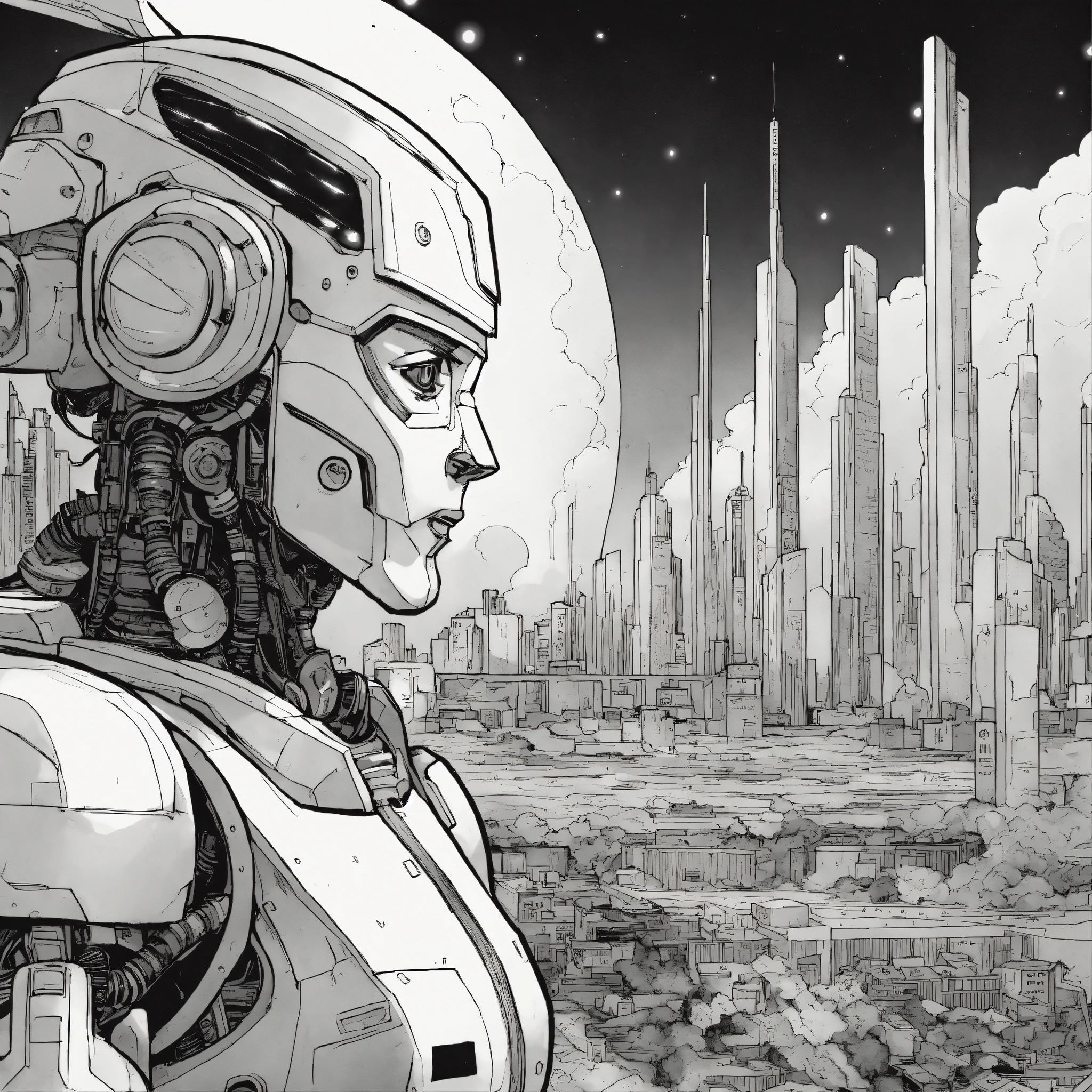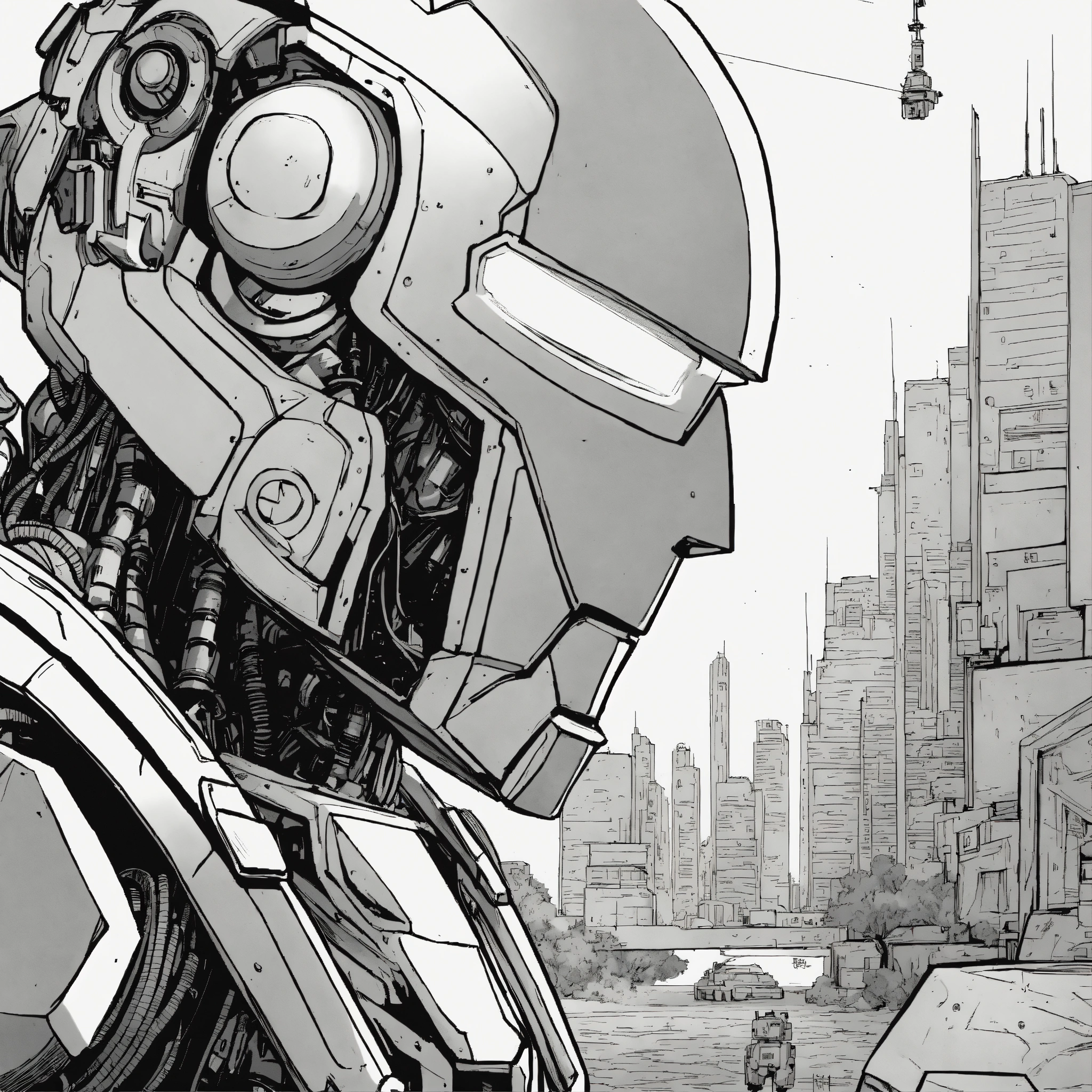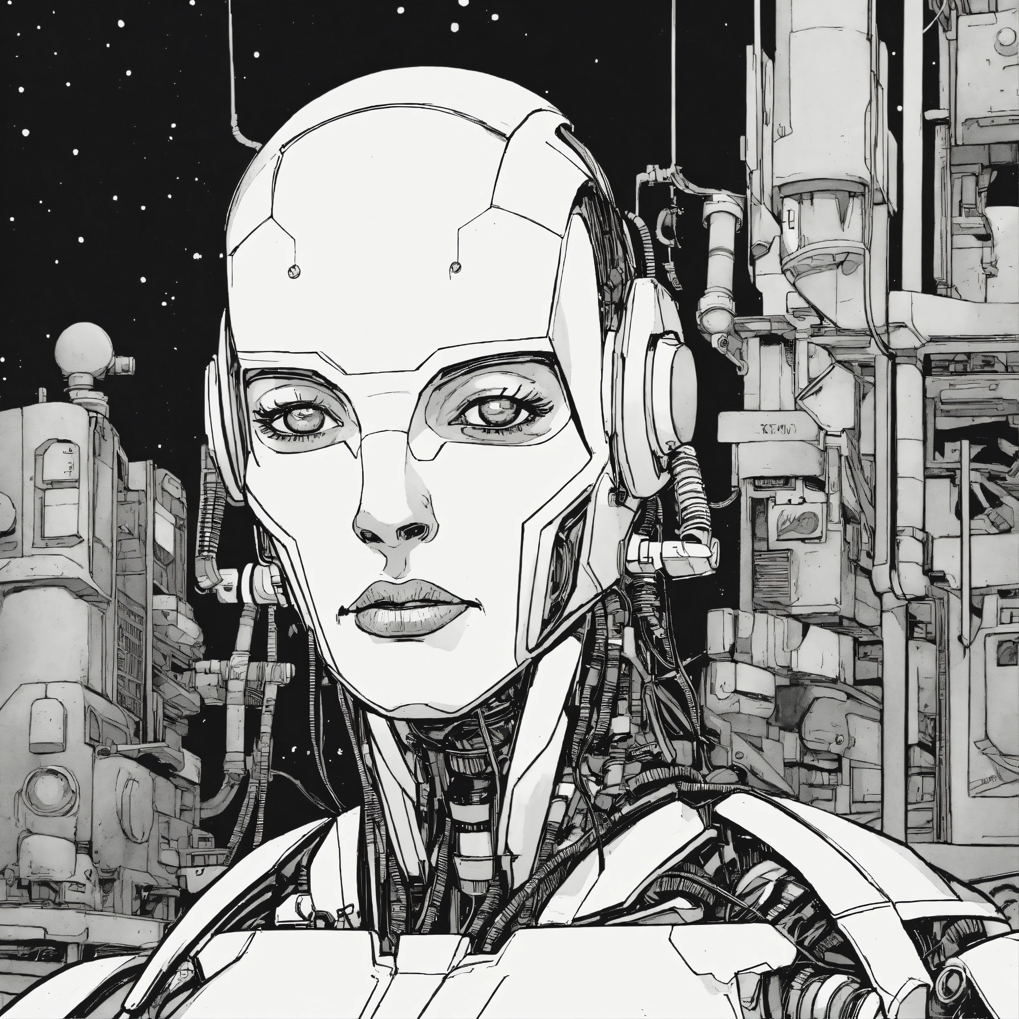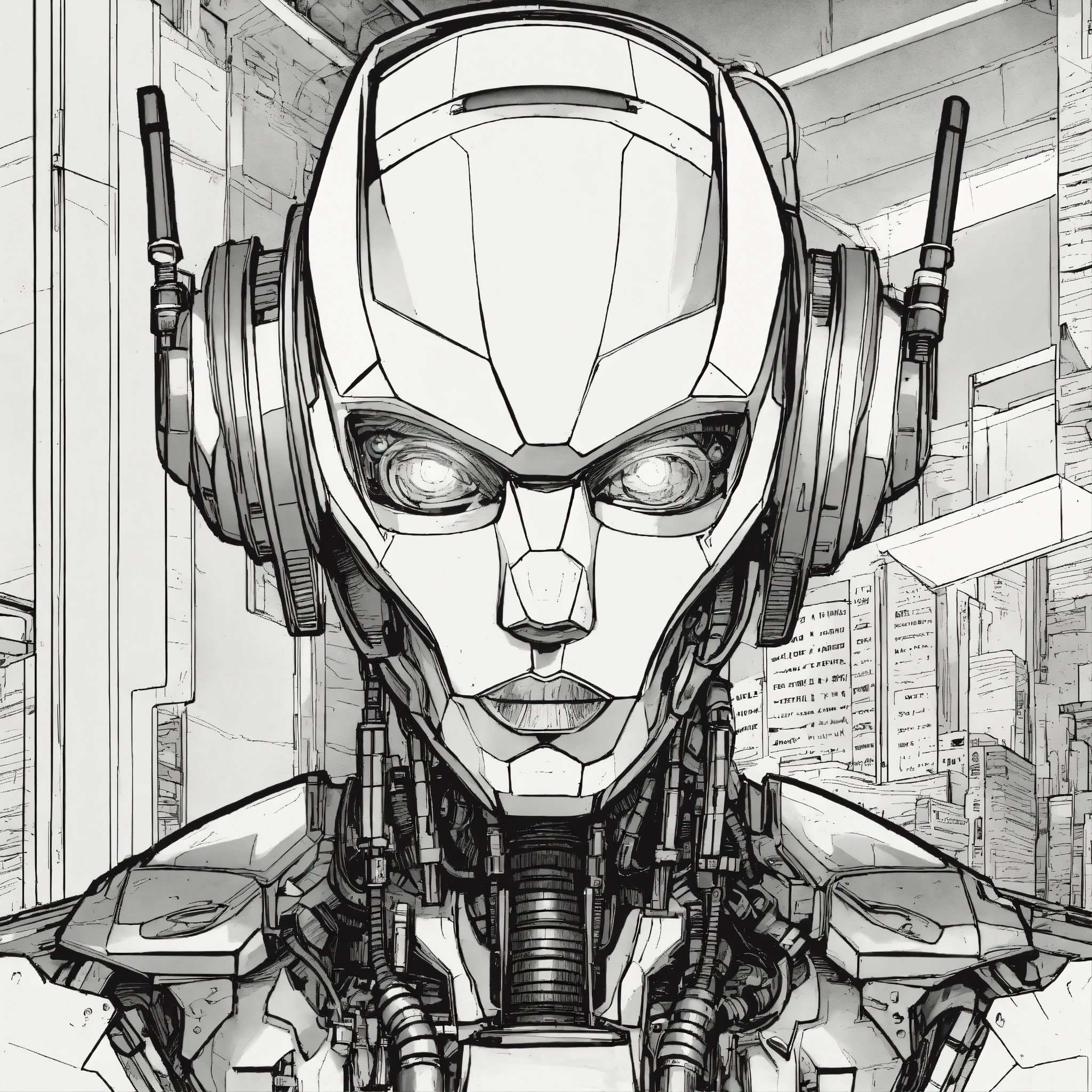 A comic book panel about robots taking over the world, simple comic art. comic book cover art. ink art. mnimal, close up androids face, black & white drawing.