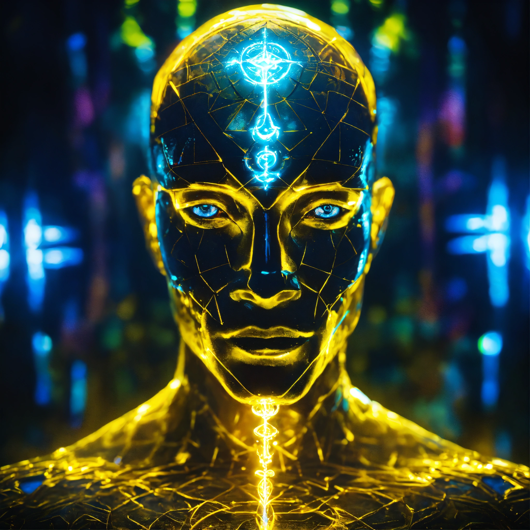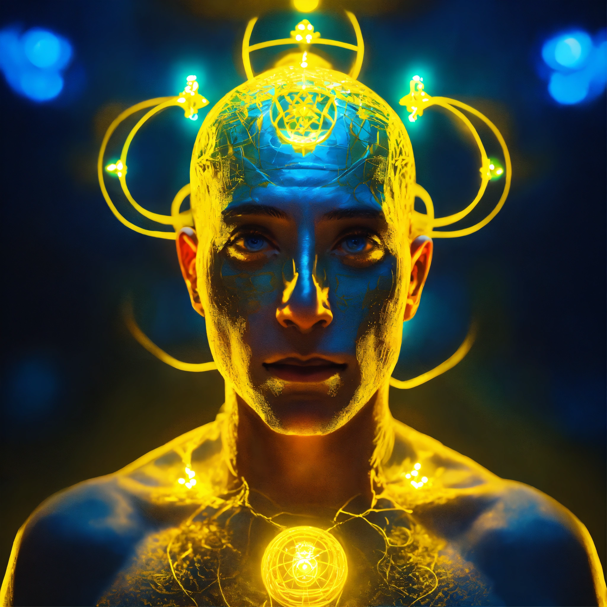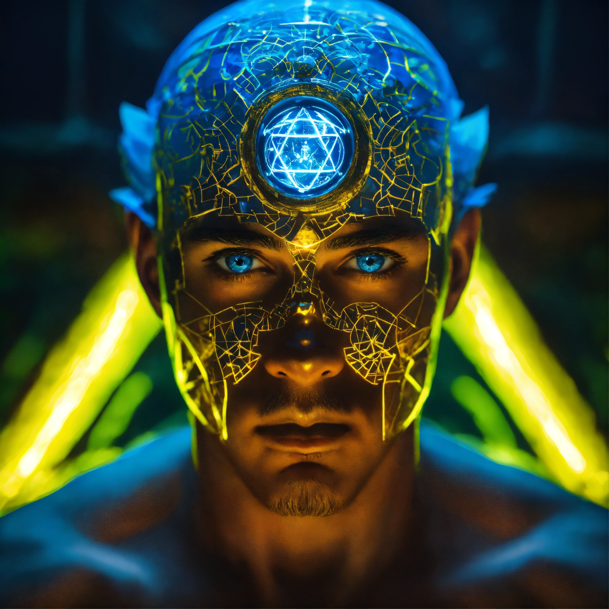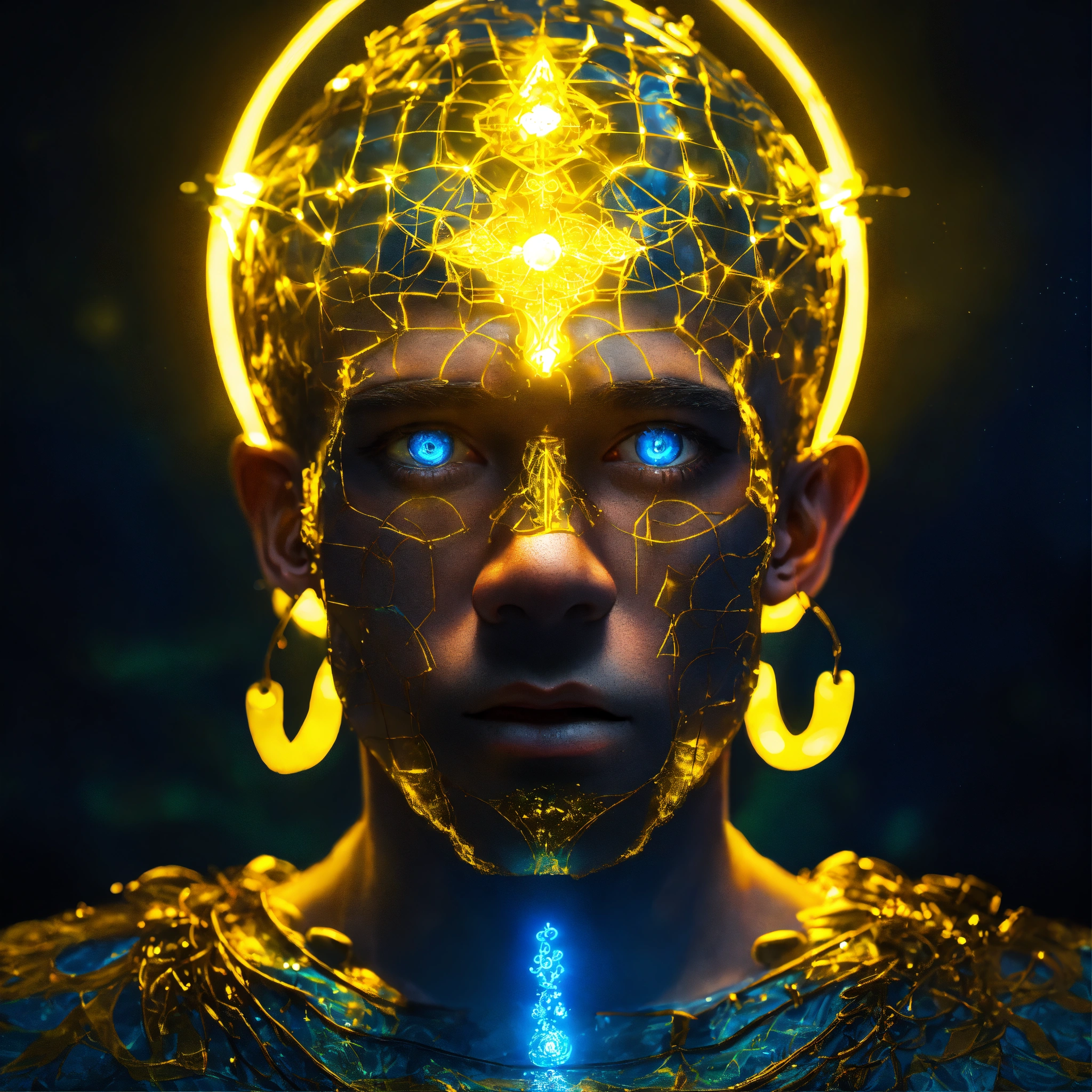 Underwater portrait photography, long exposure, powerful mystic man face portrait facing front, blue eyes. front view. front portrait, no angle. backlit. yellow neon glow. angelic transformer face. sacred geometry patterns on the face, in the style of disney, pixar, tim burton, chronicles of narnia, beauty and the beast, and peter pan. enchanting glowing orb aura. fractal, volumetric lighting, backlit. the power of the god. god-like, spirit-like.