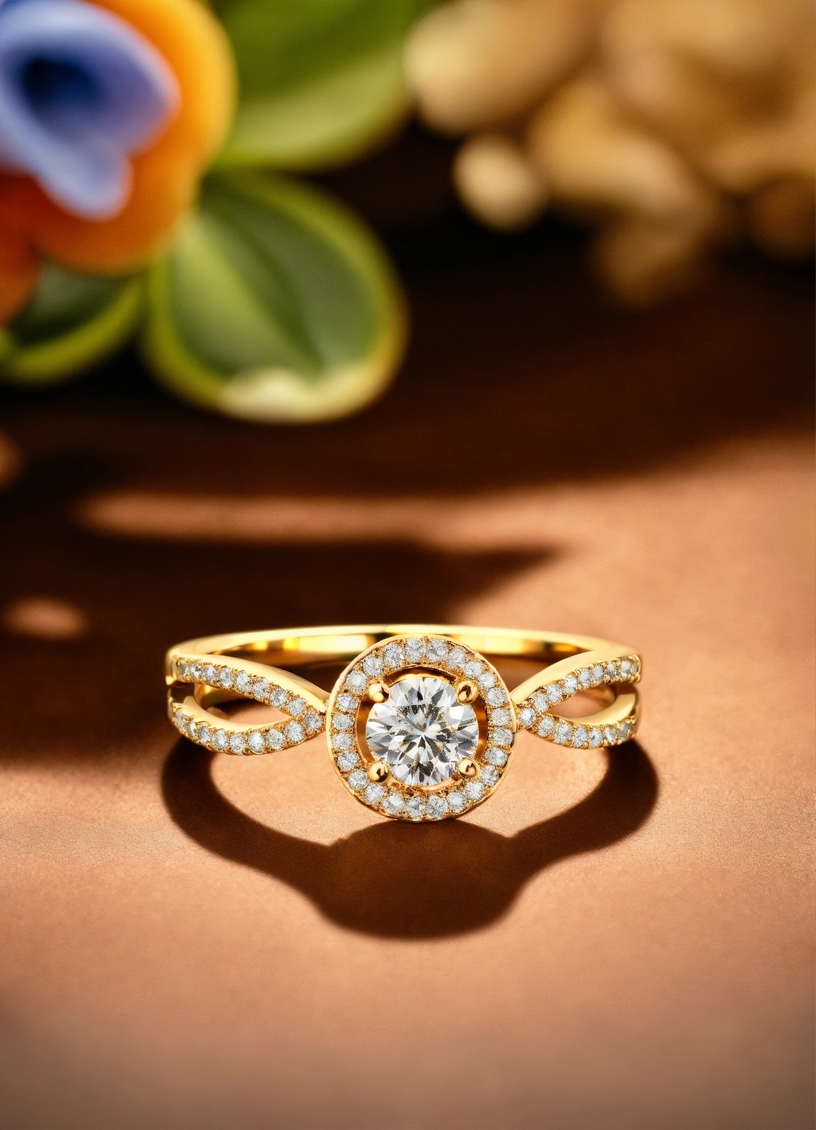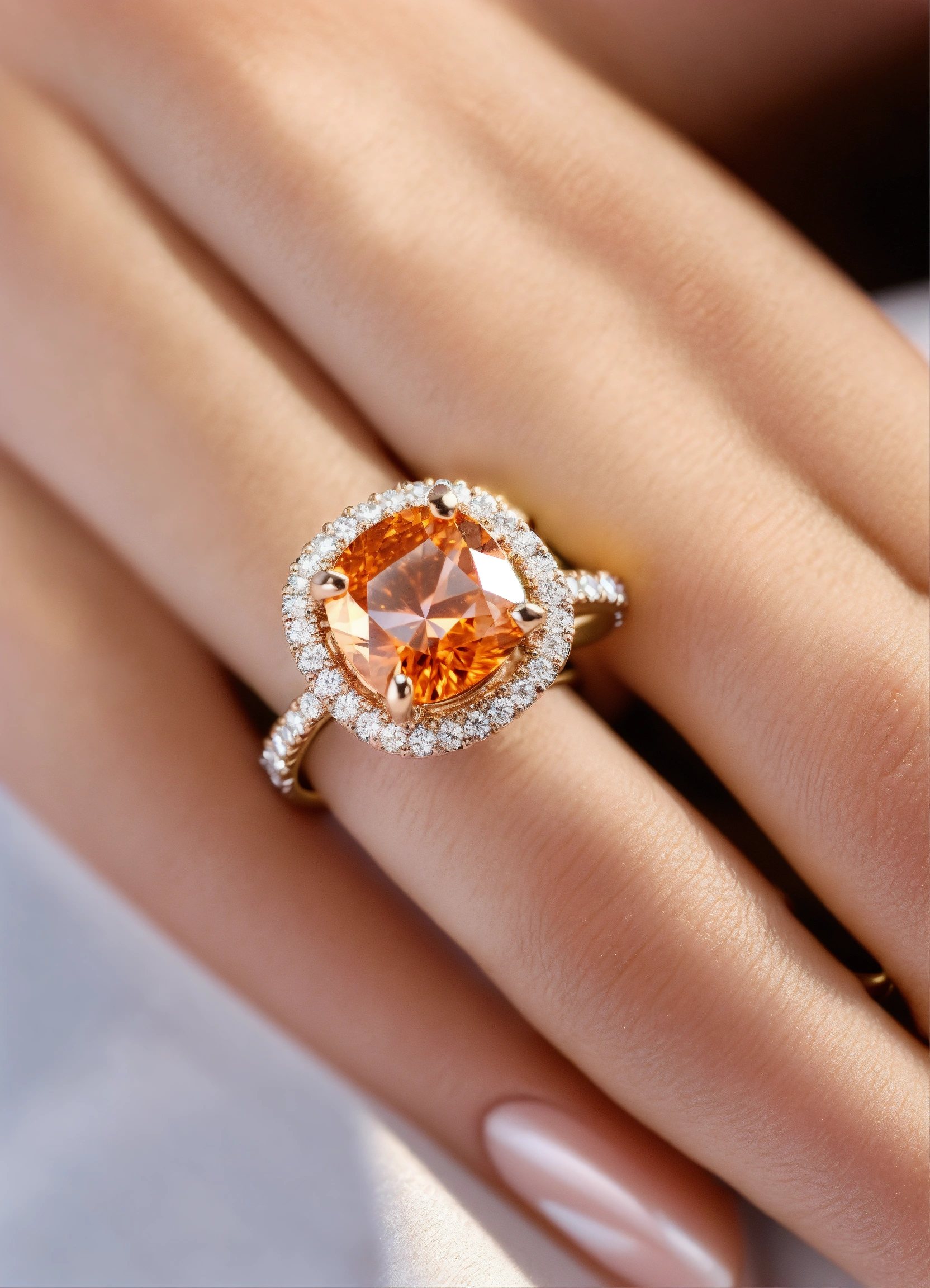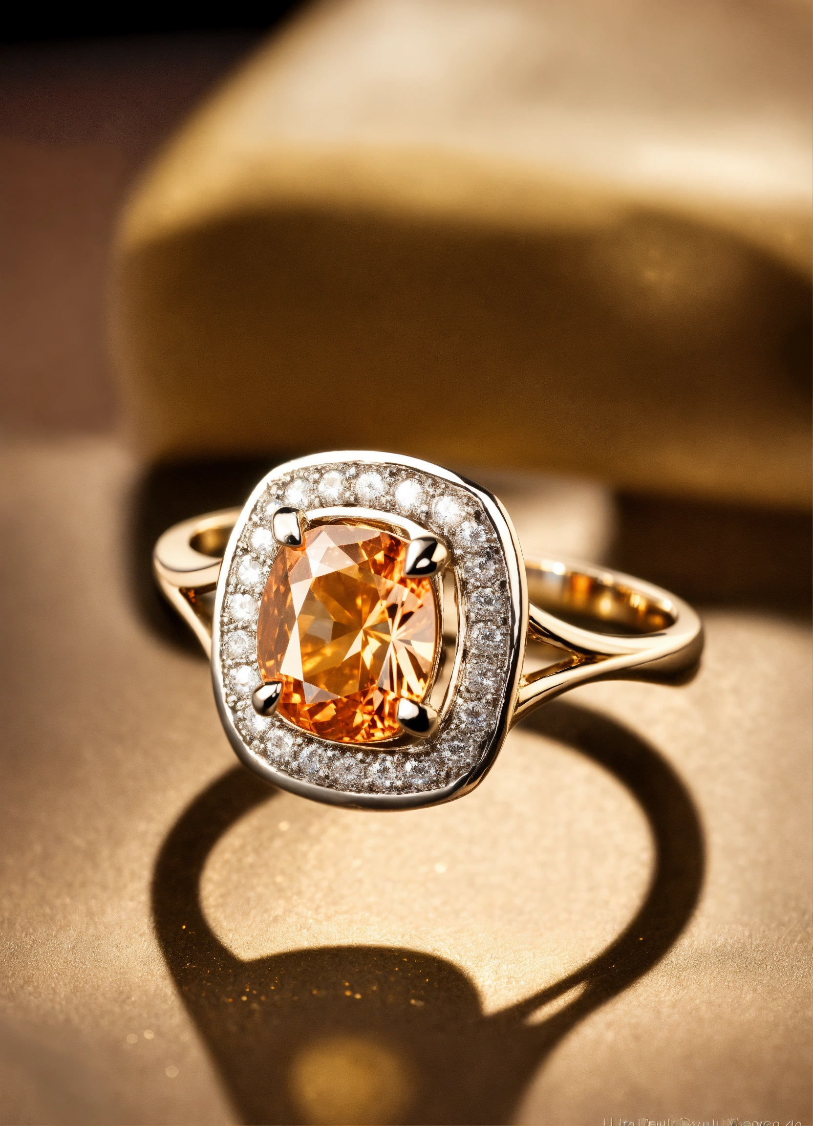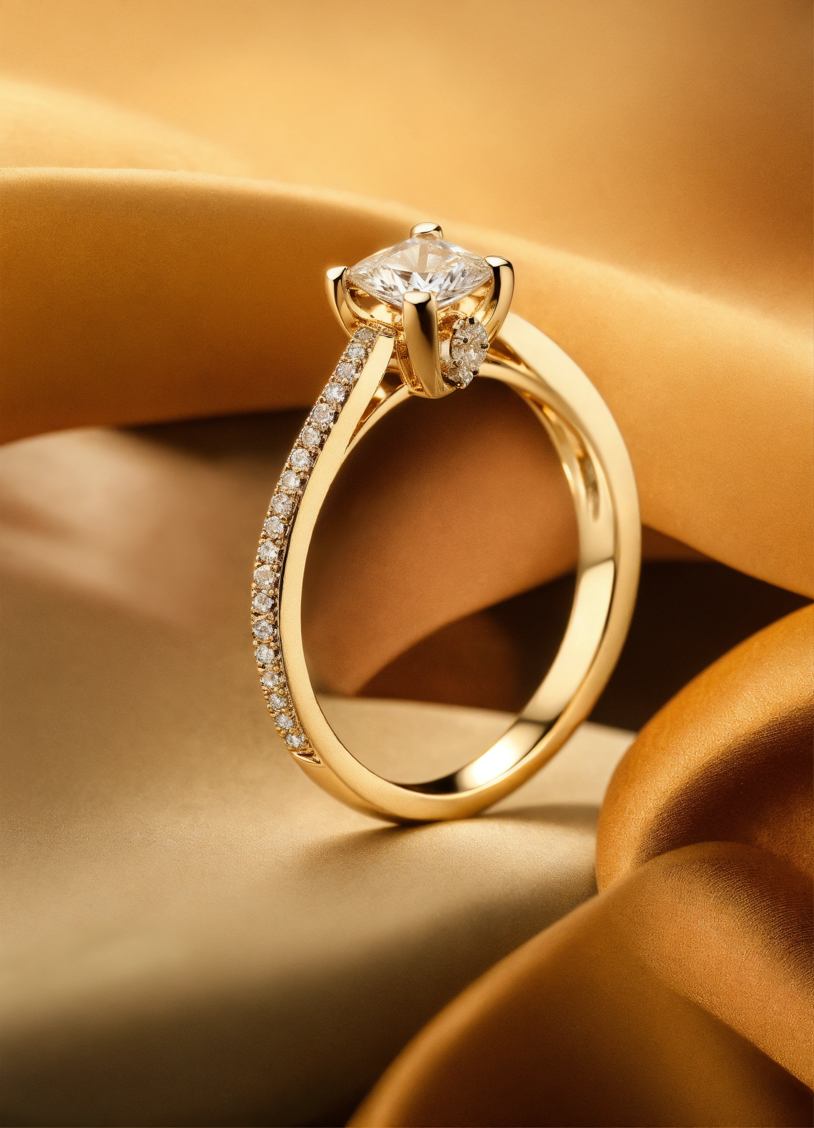 Jewellery design, romantic style, create diamond gold ring with matte finish in pave setting, thin band, vietnamese yellow apricot, default-theme, --product-view --ultra-quality