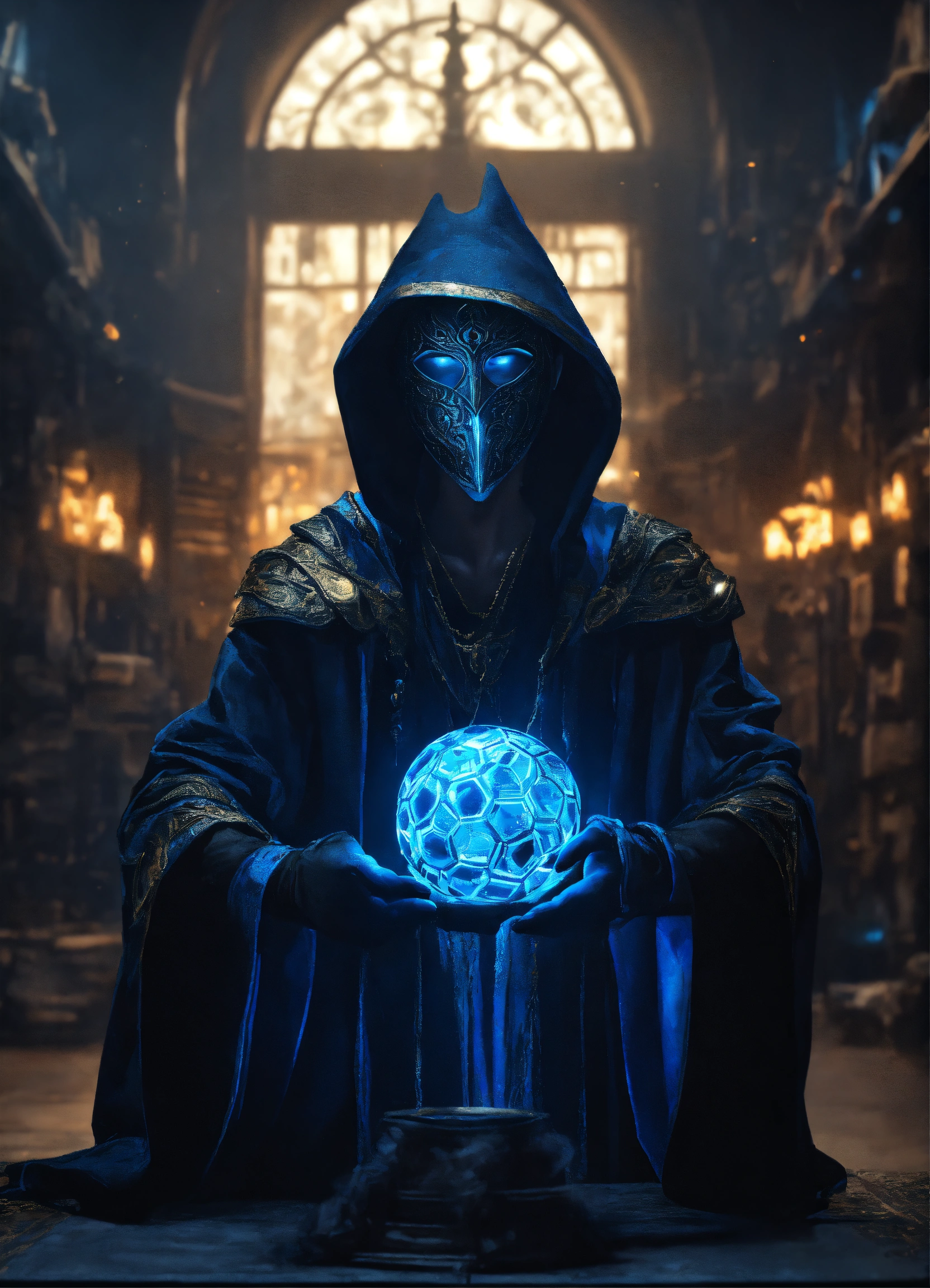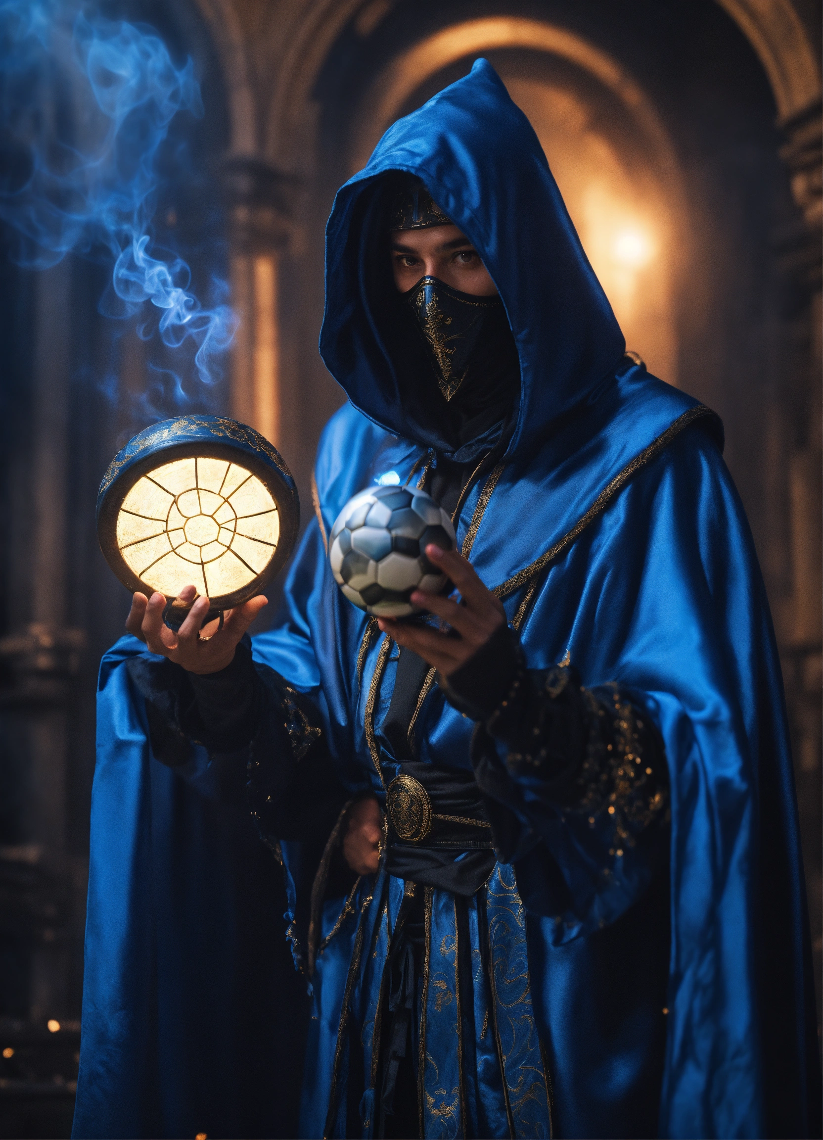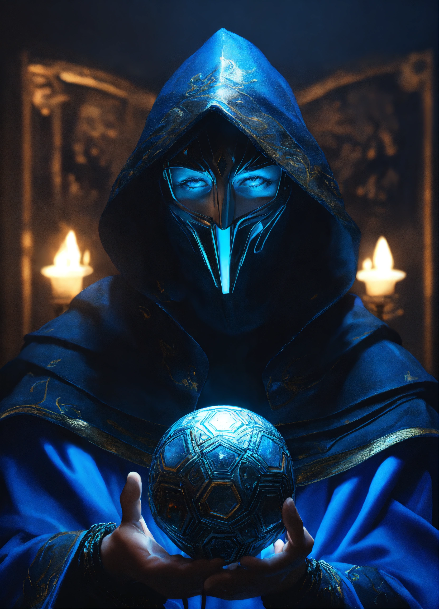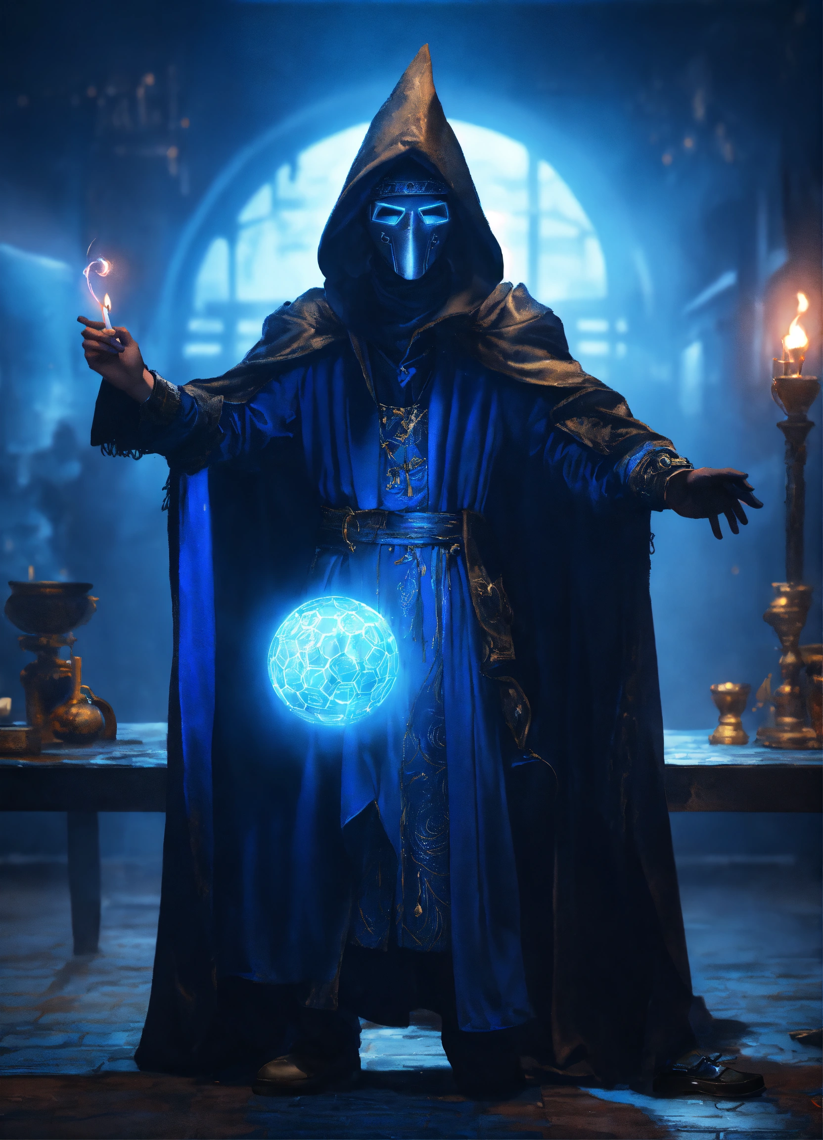 A black and blue cloaked masked wizard casting a spell, soccer betting, fortune teller, cyberpunk style, 8k, hyper realistic