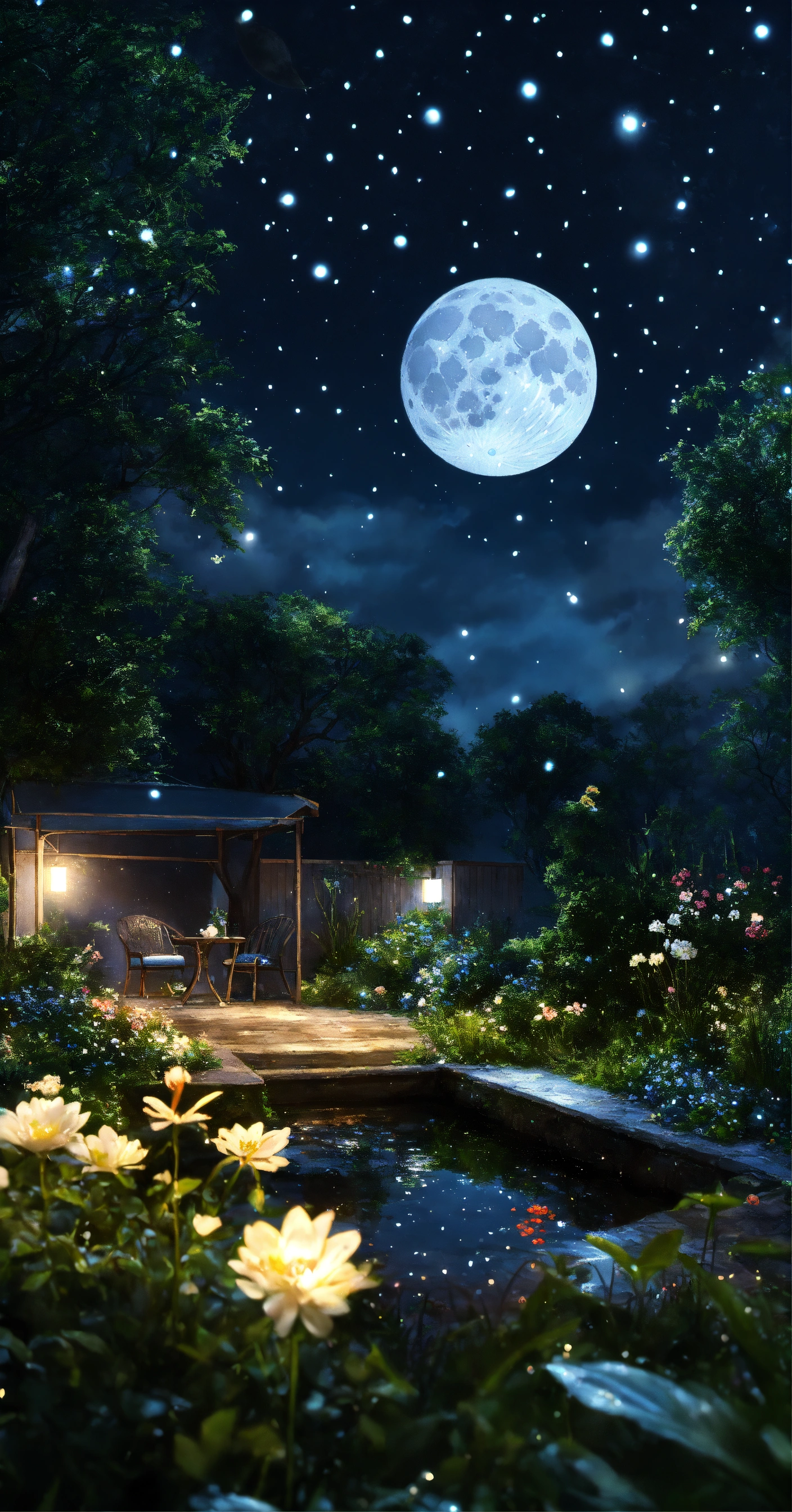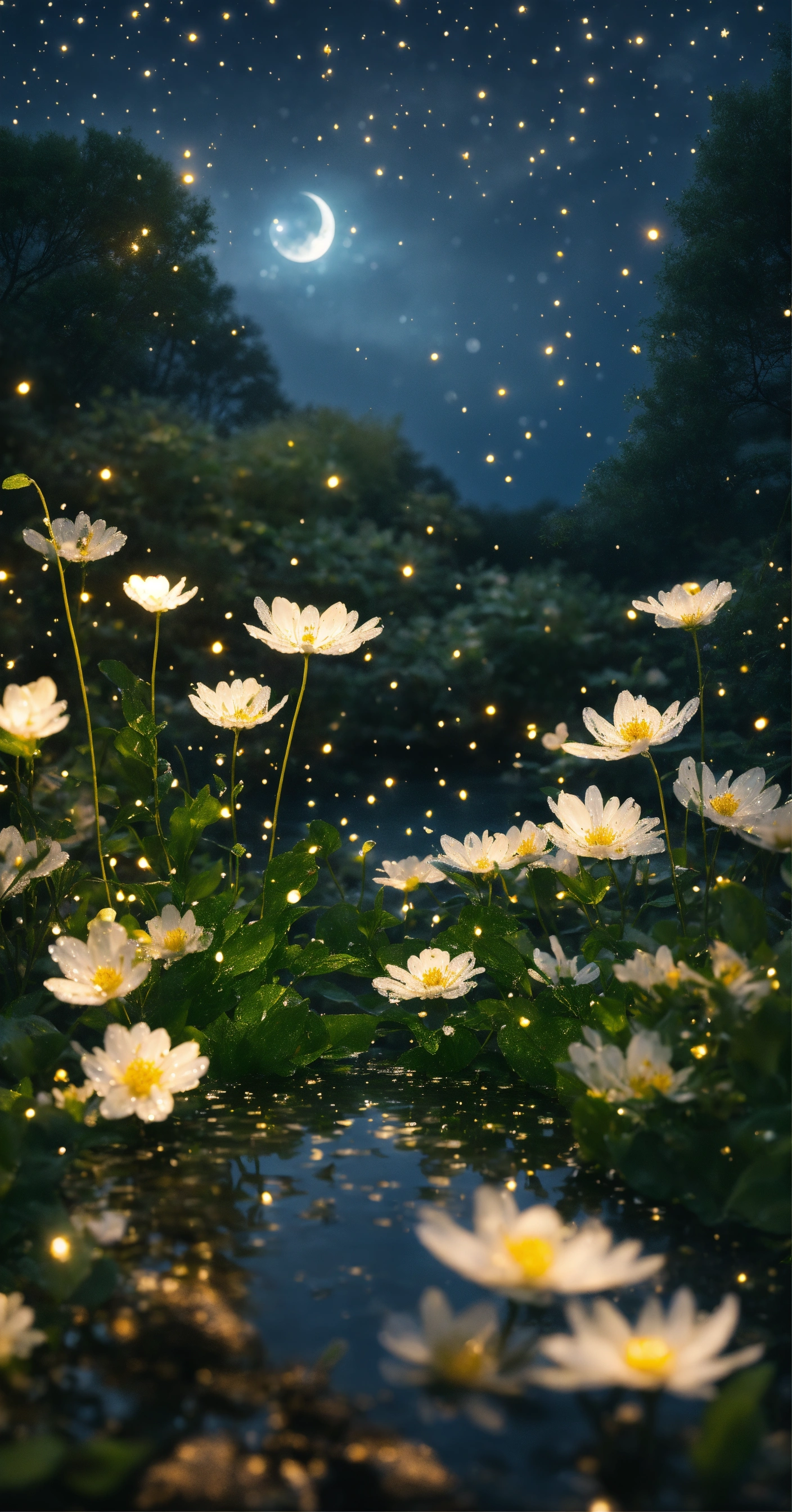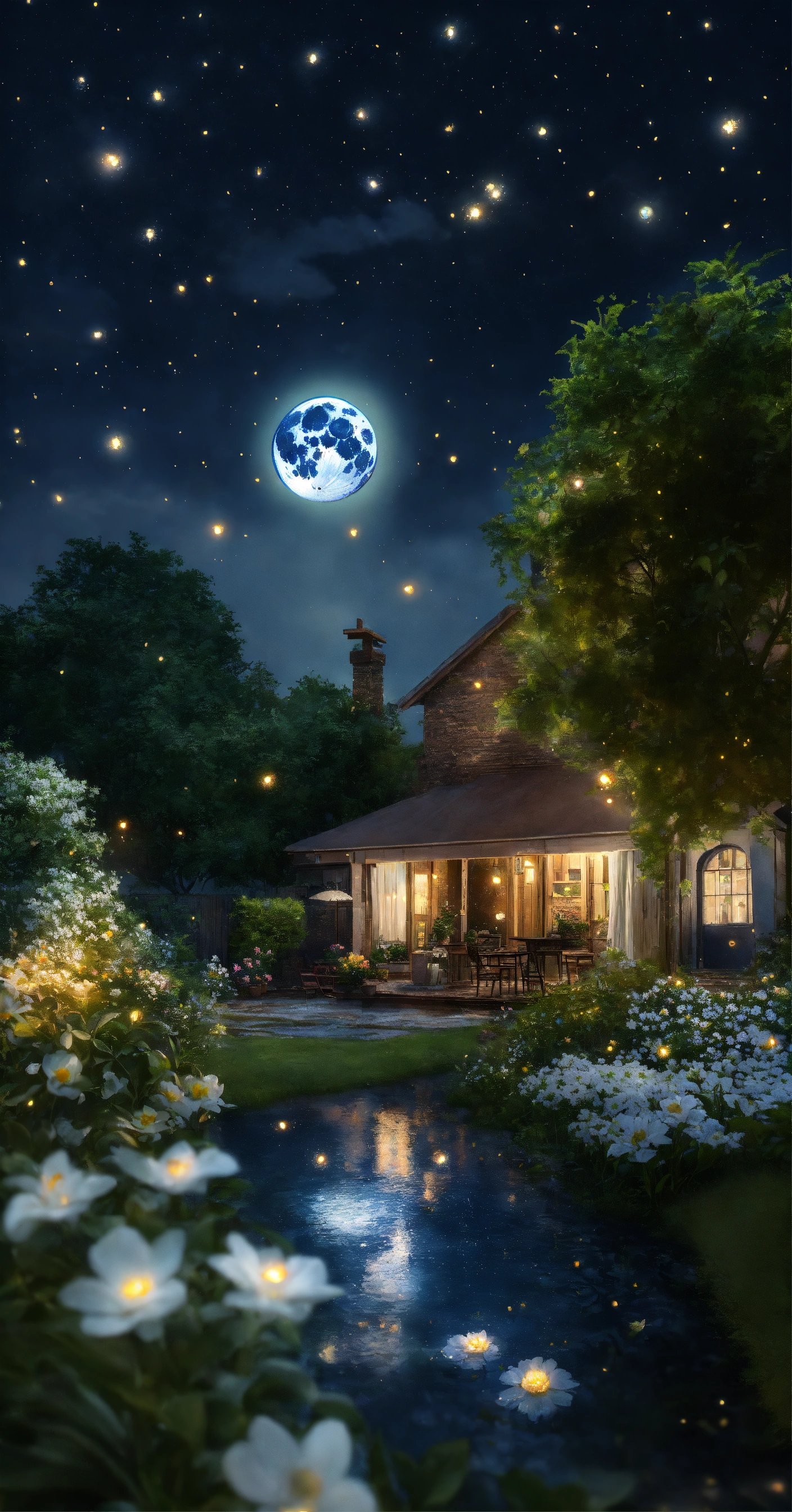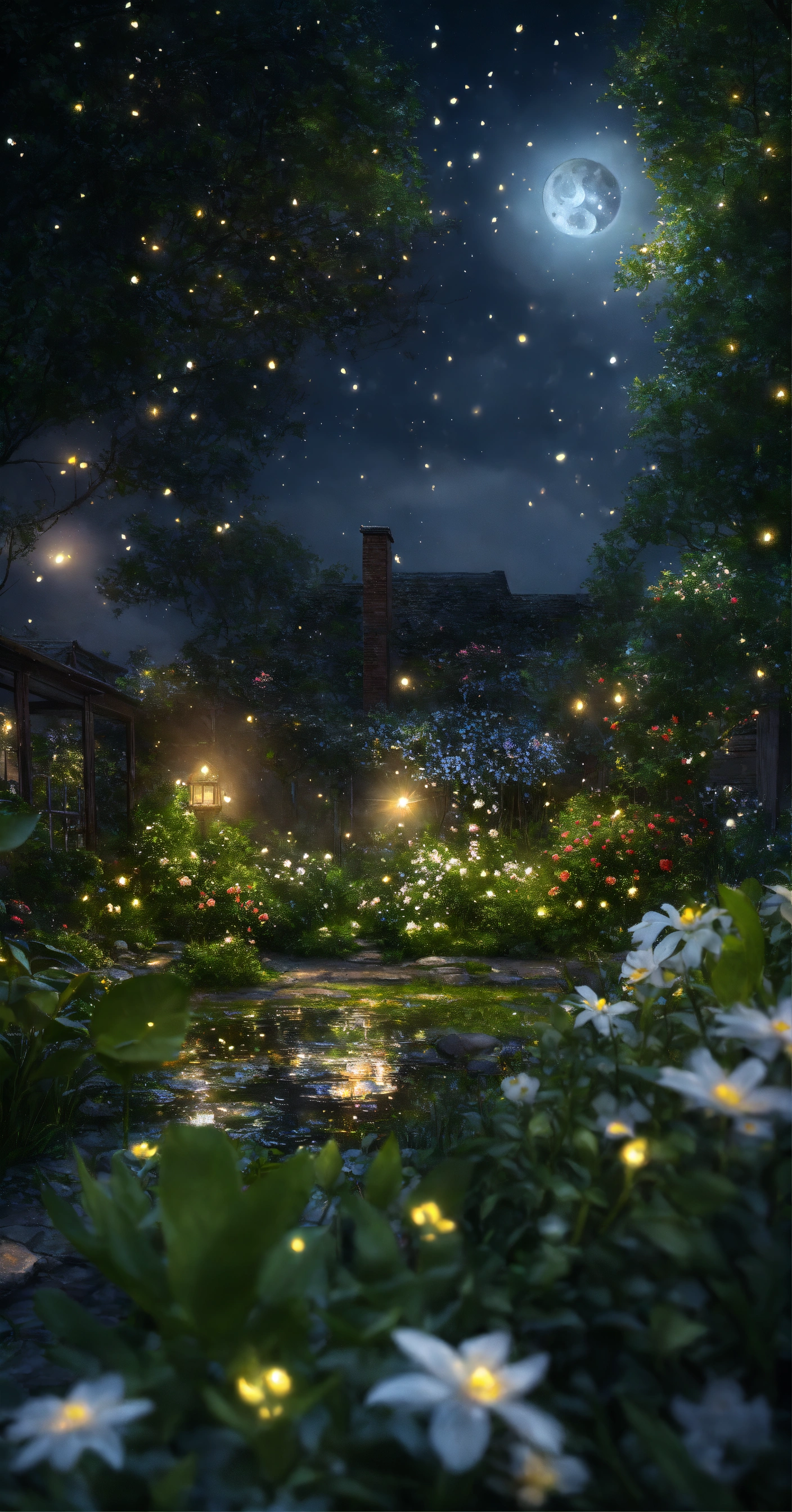 A starry night in the garden after the rain, wet, full of fireflies. in the middle but far away there are some white wolws. in the foreground some flowers and leaves with a large drop of water that reflects the moon. hyperrealistic photo.