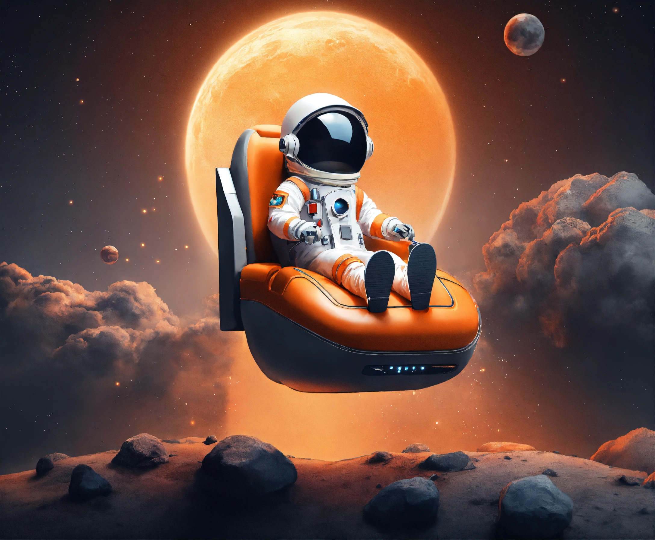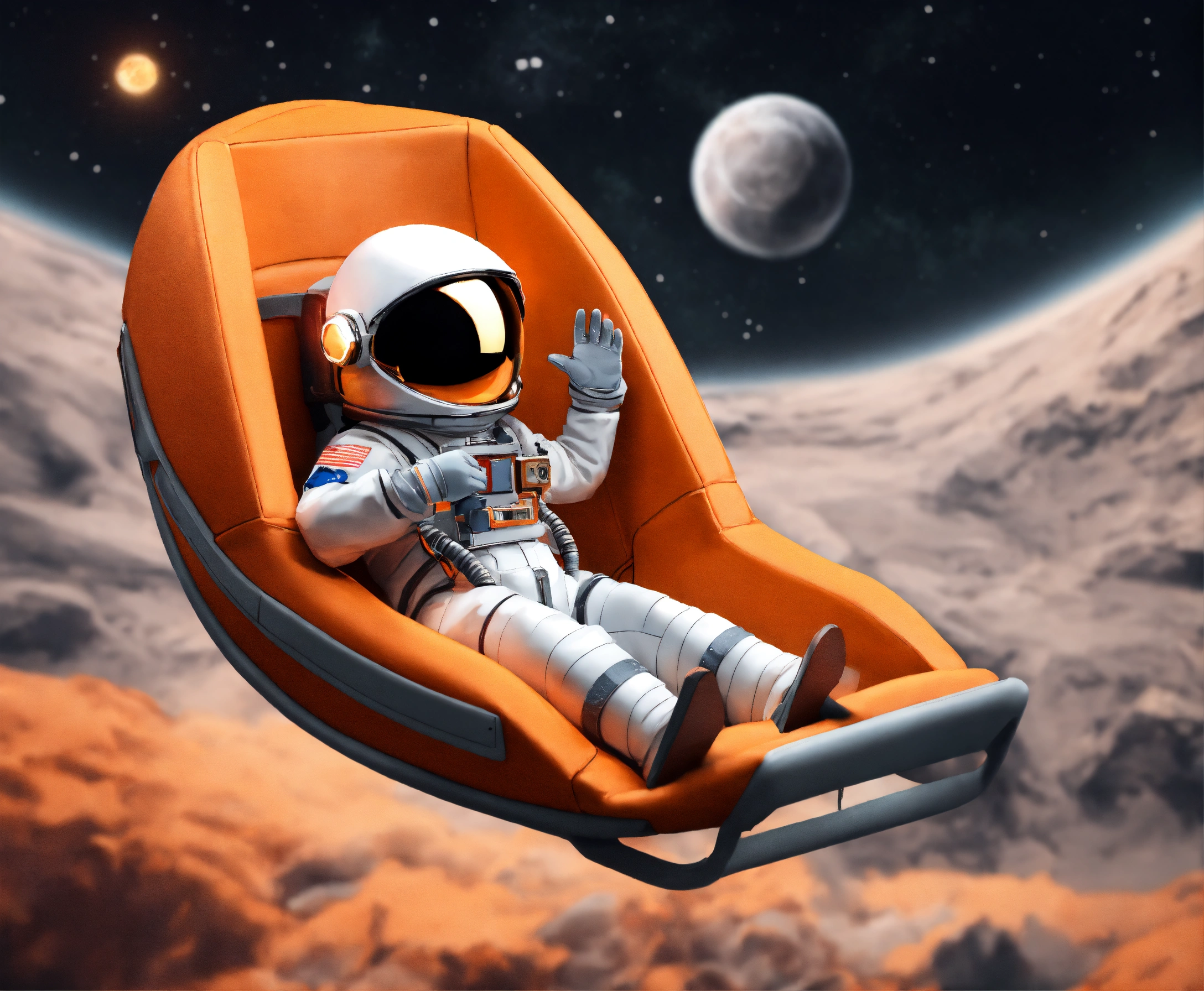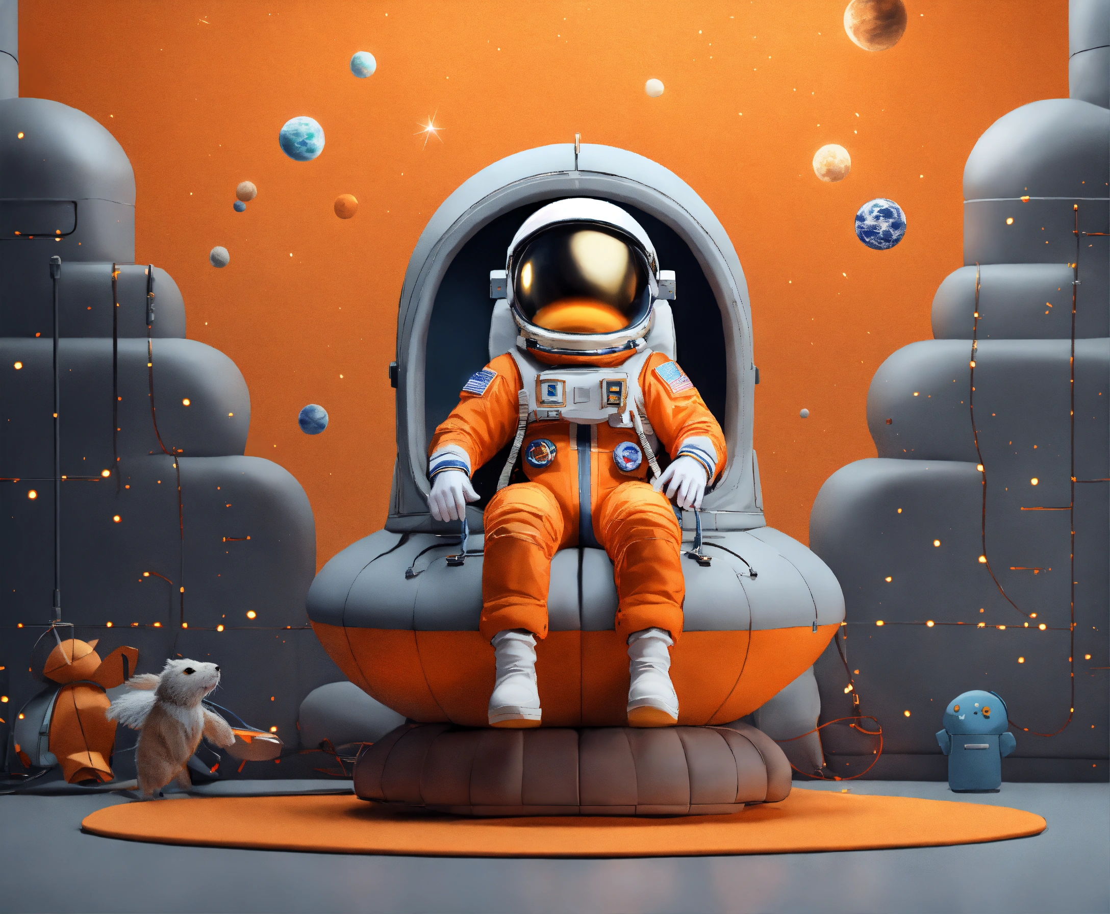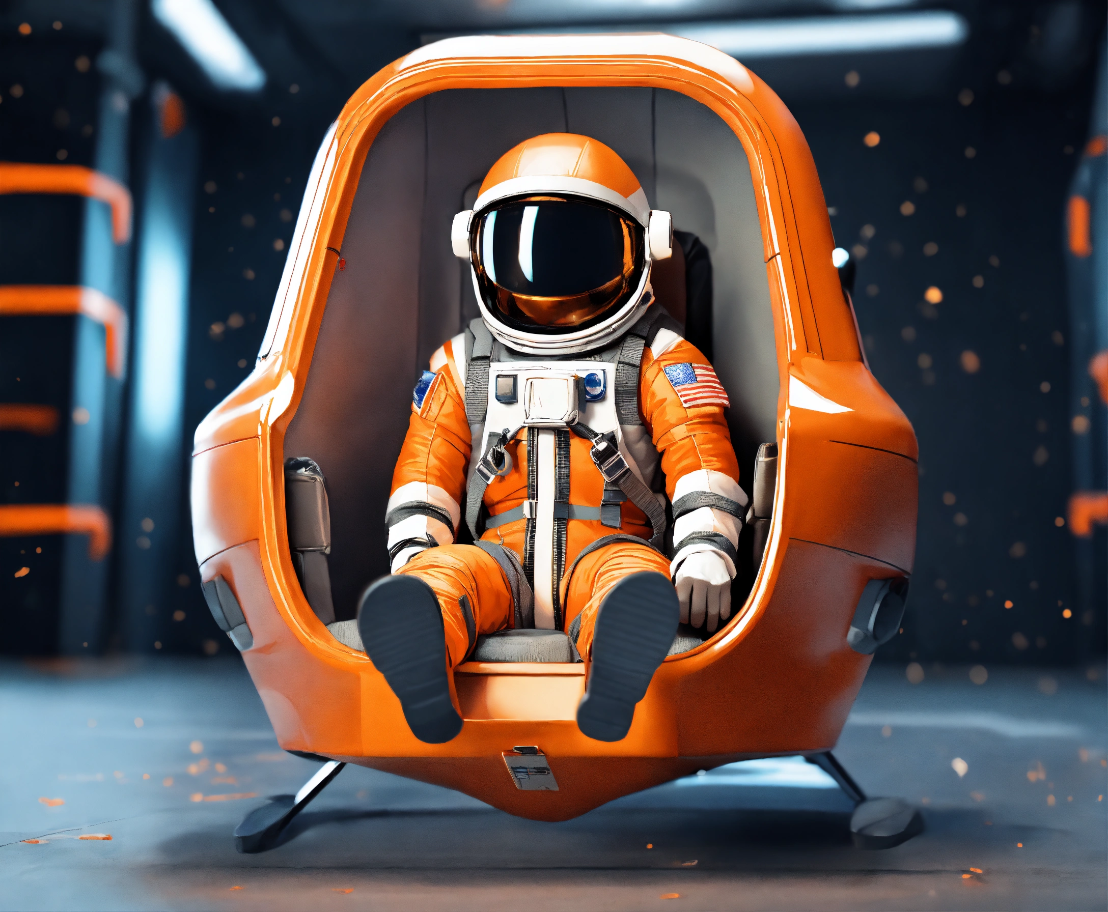 Cute astronaut flying seat on the rocket orange and gray 8k