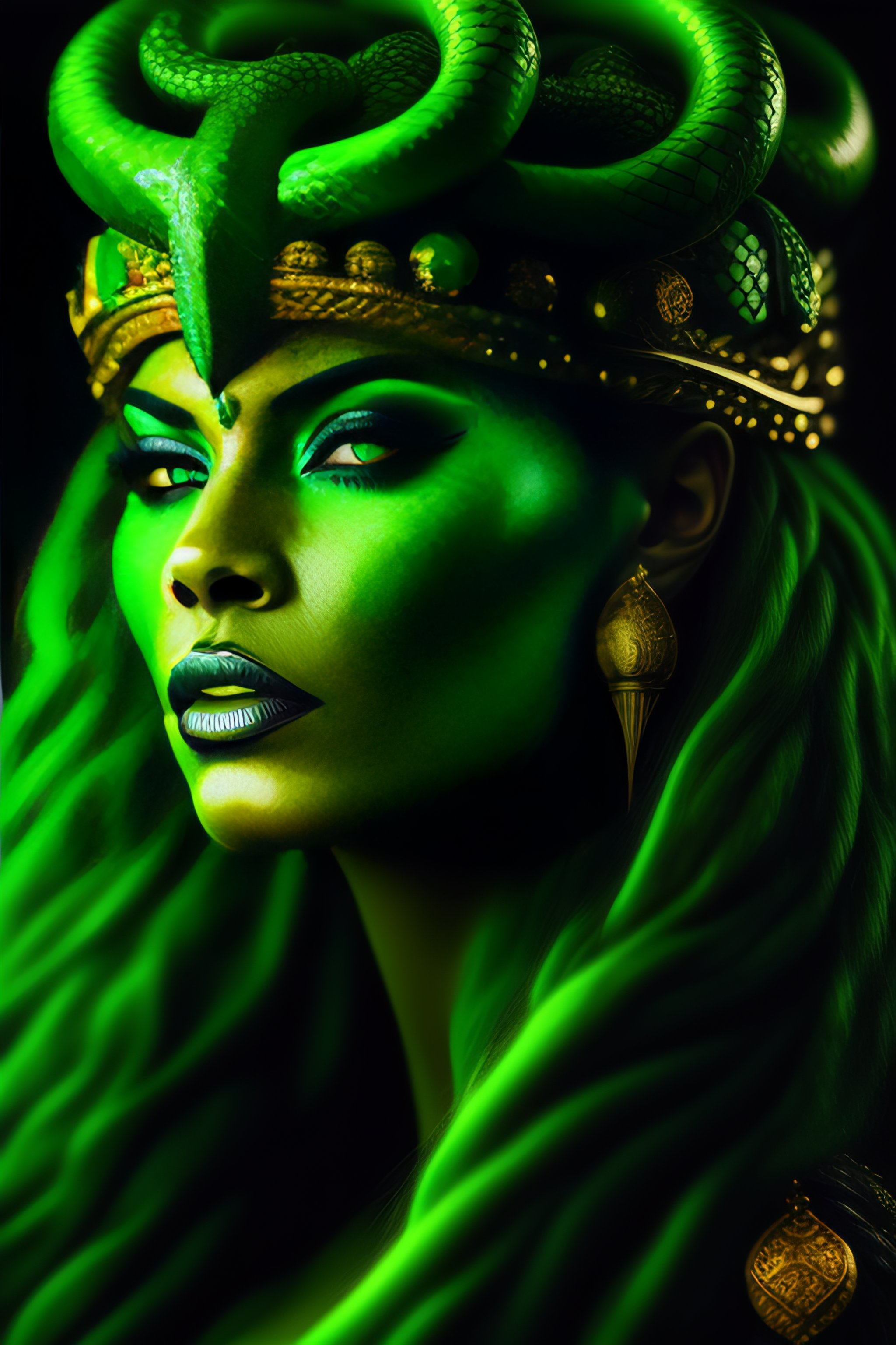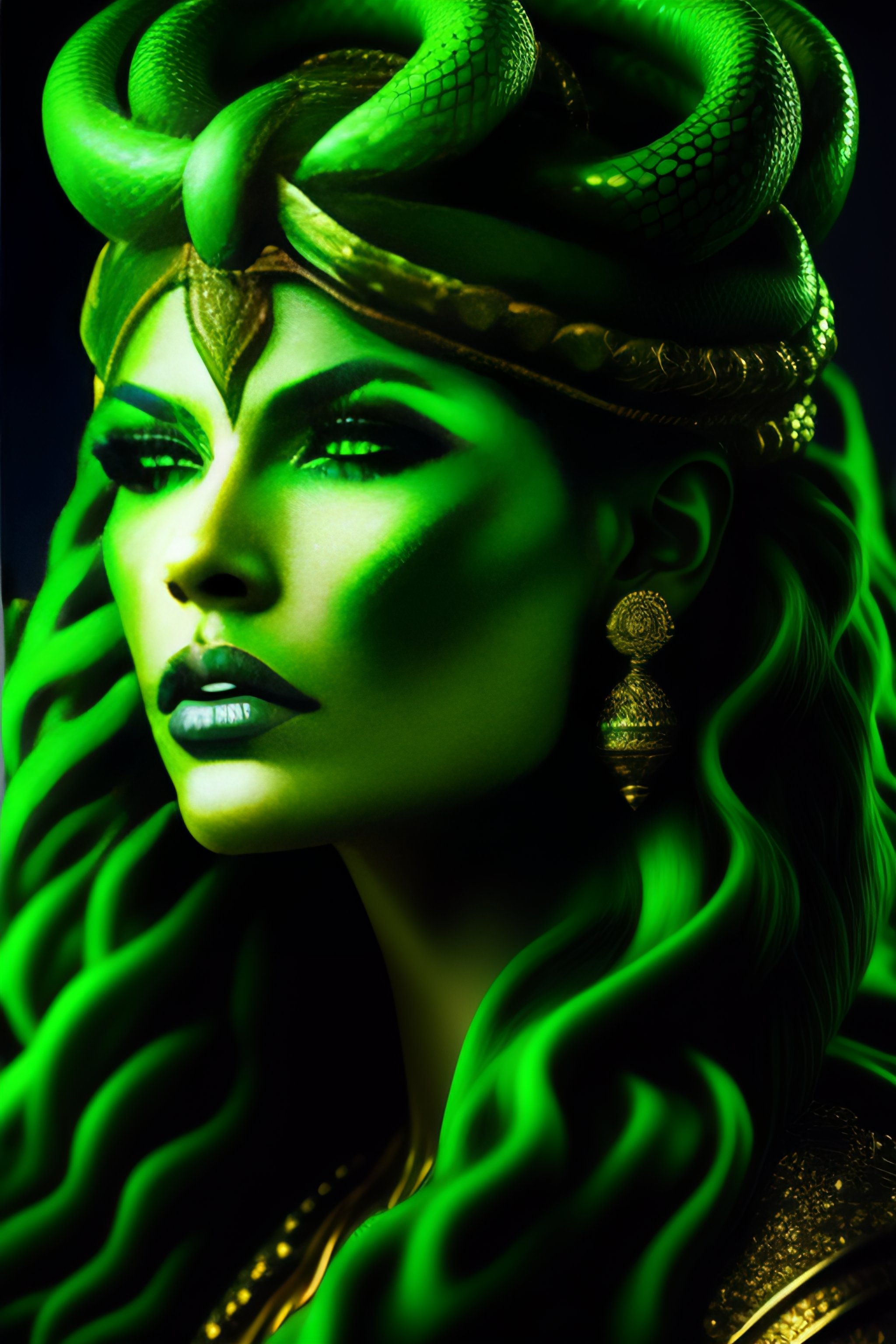 Very upclose portrait of medusa gorgon with a very aggressive and evil face, many green snakes instead of hair, foggy eyes, fantasy style, evil, aesthetically pleasing color scheme, sharper curvatures
