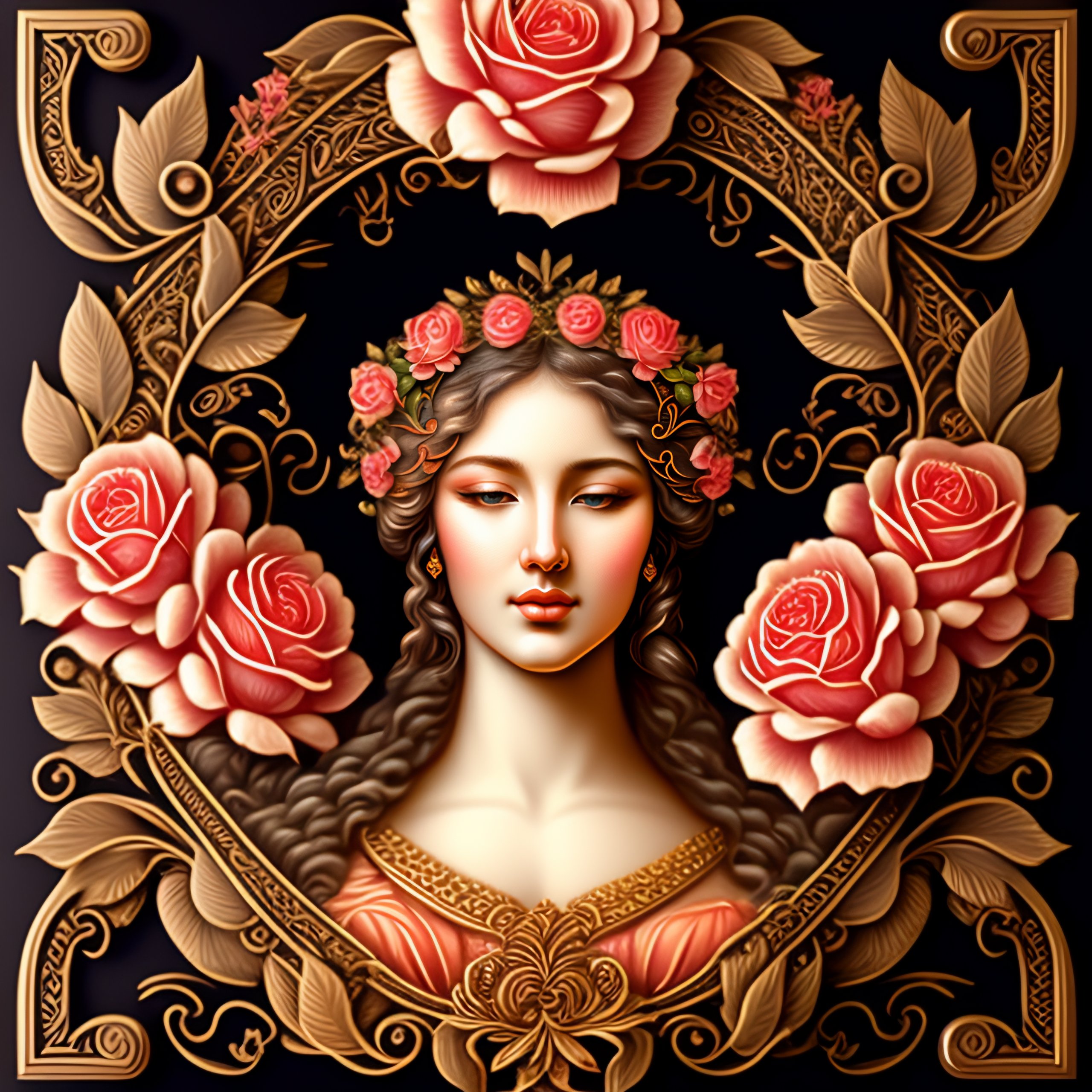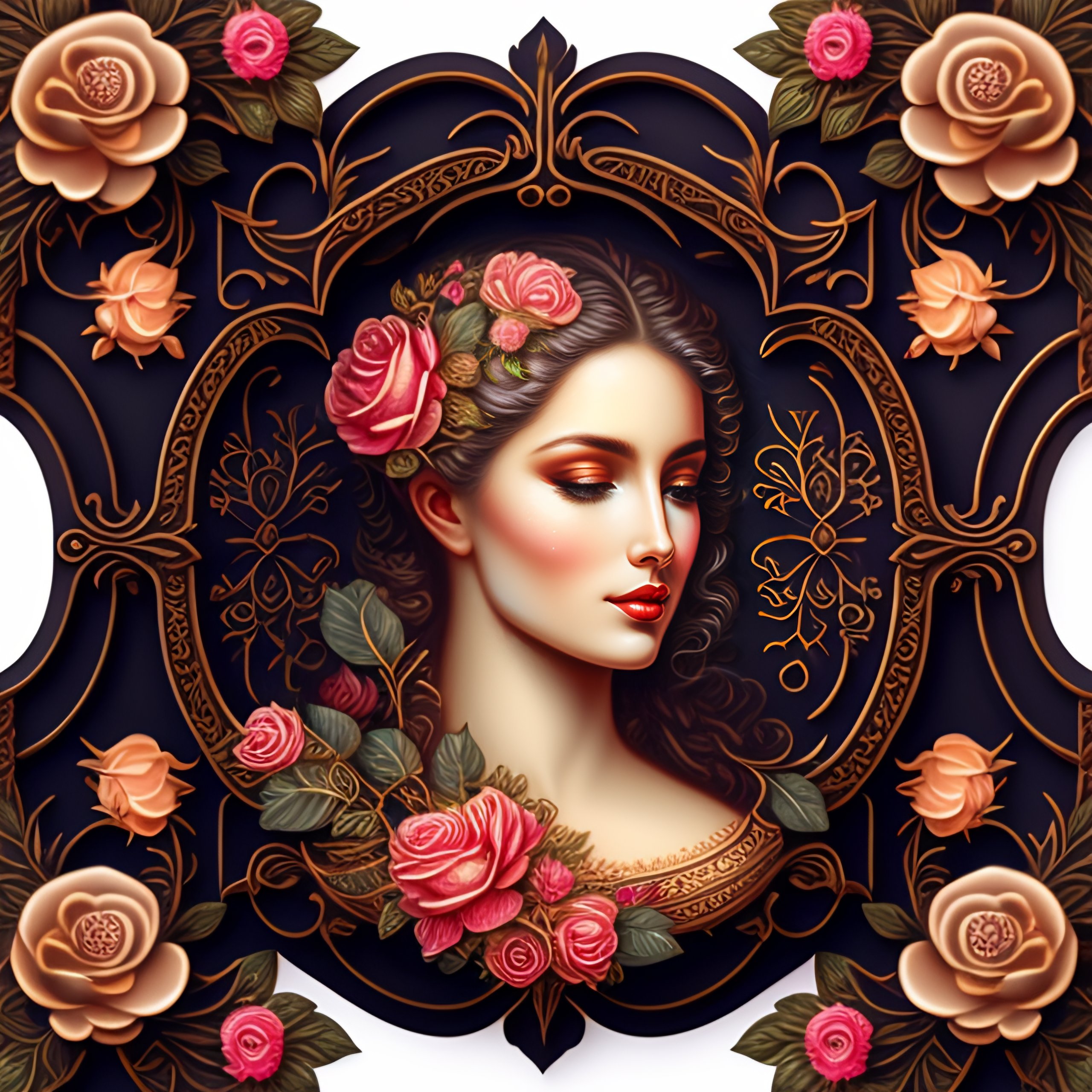 Intricate design of a detailed beautifull woman with classical floral elements frame border, woodcutting template, decorative design, classical ornament, motif, bilateral symmetry, roses, leaves, flowers, buds, flowering buds, feathers, negative space, highly detailed etching