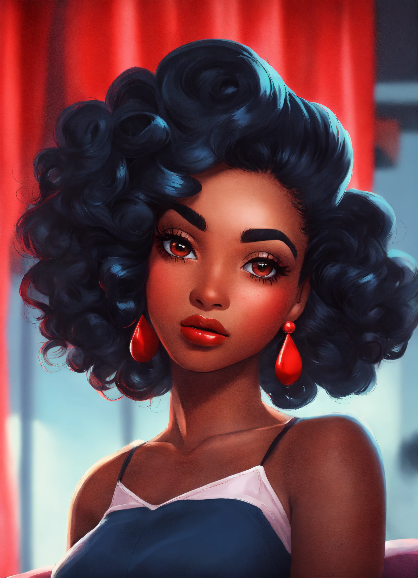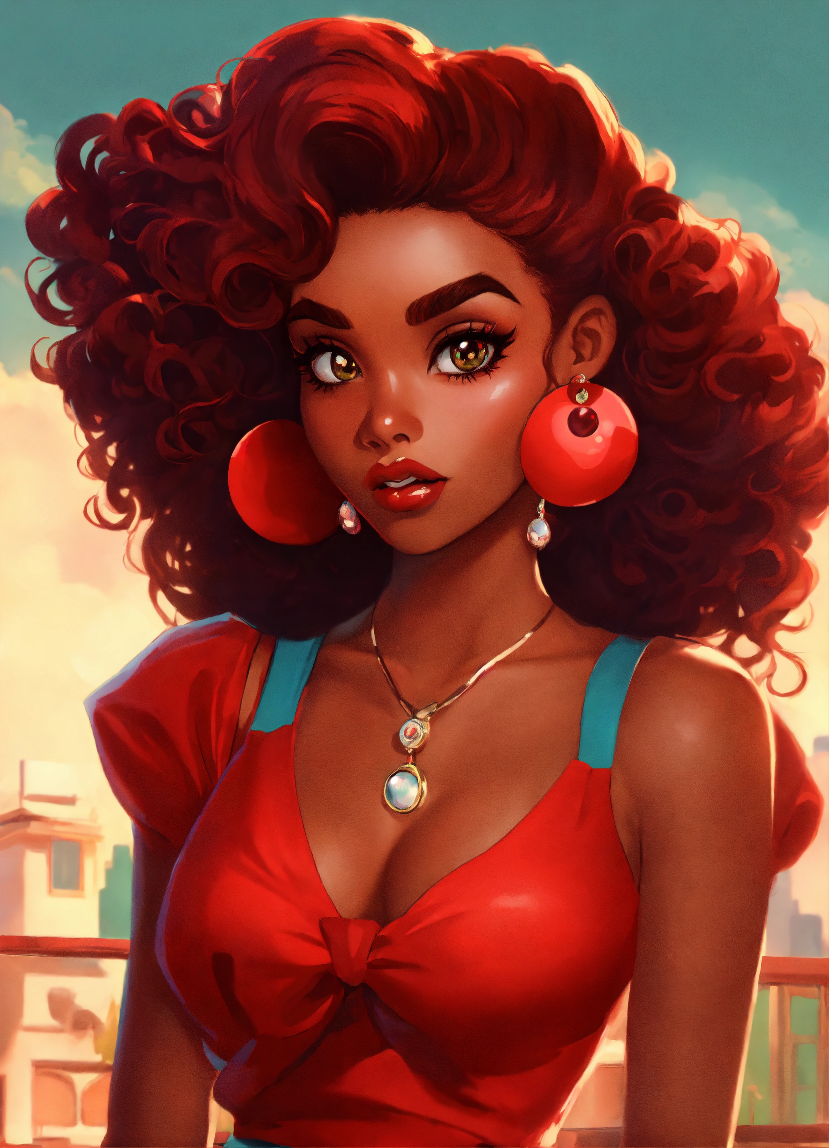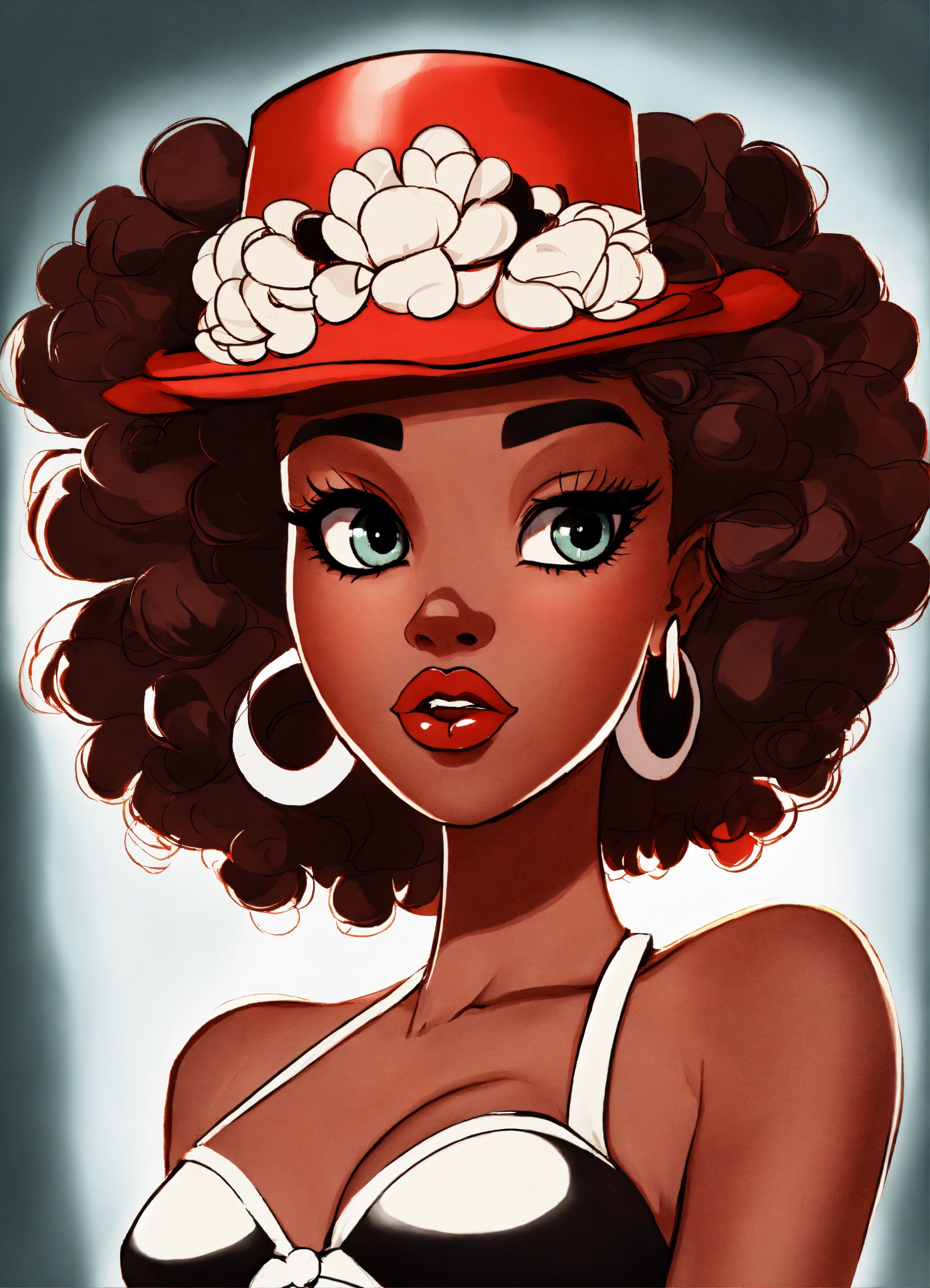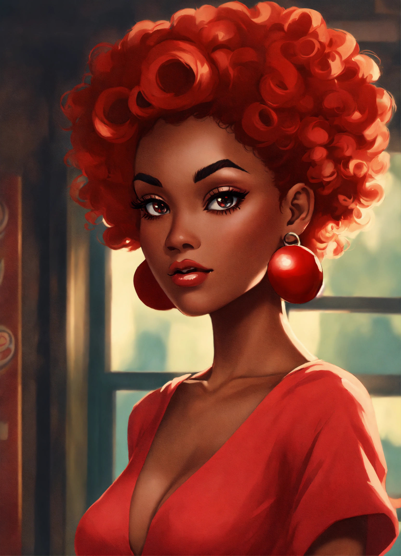 Create a stern powerpuff girl meets betty boop inspired black female character in white with oversized red flowing hair and big gorgeous eyes, retro 1940’s anime