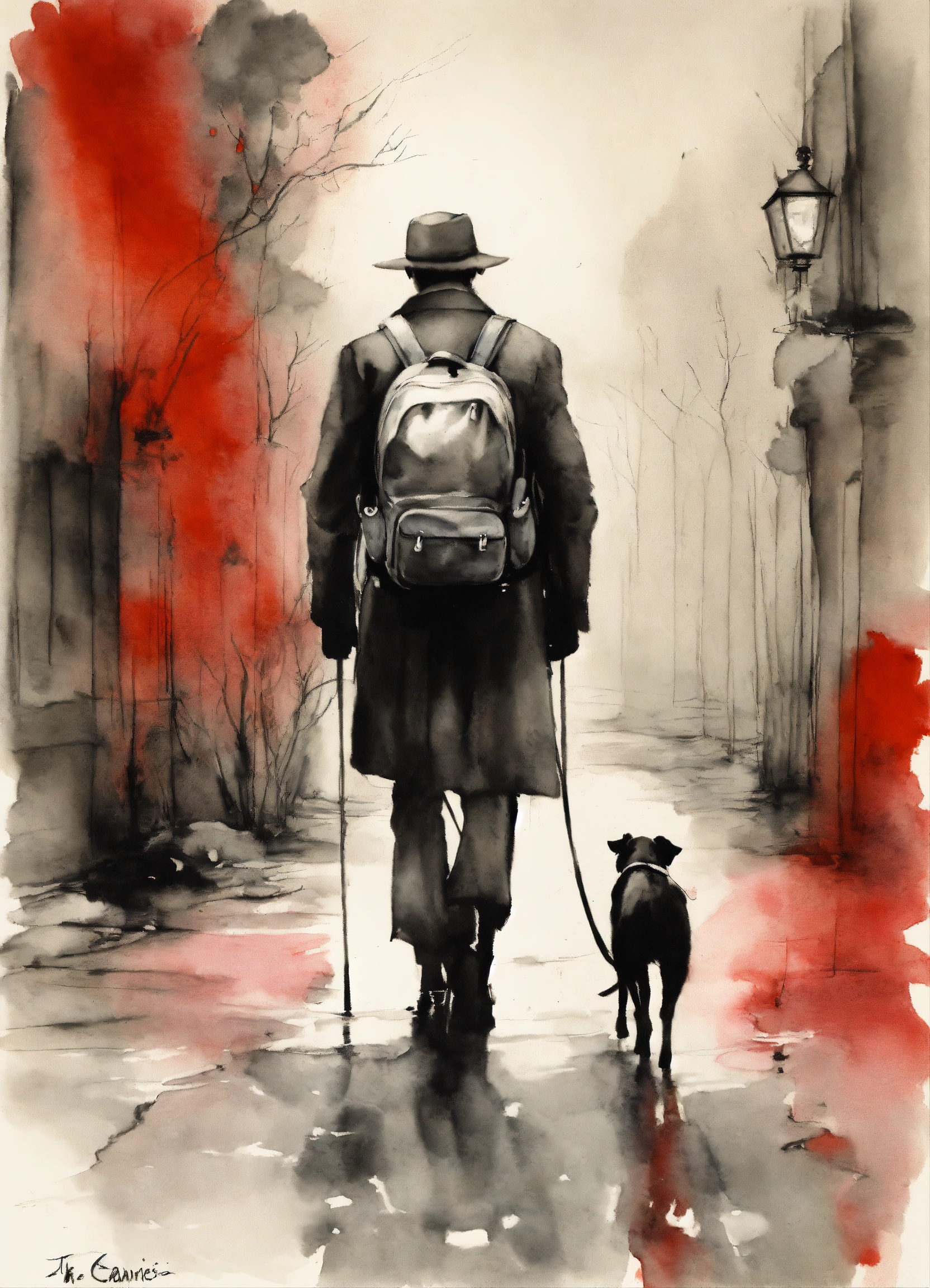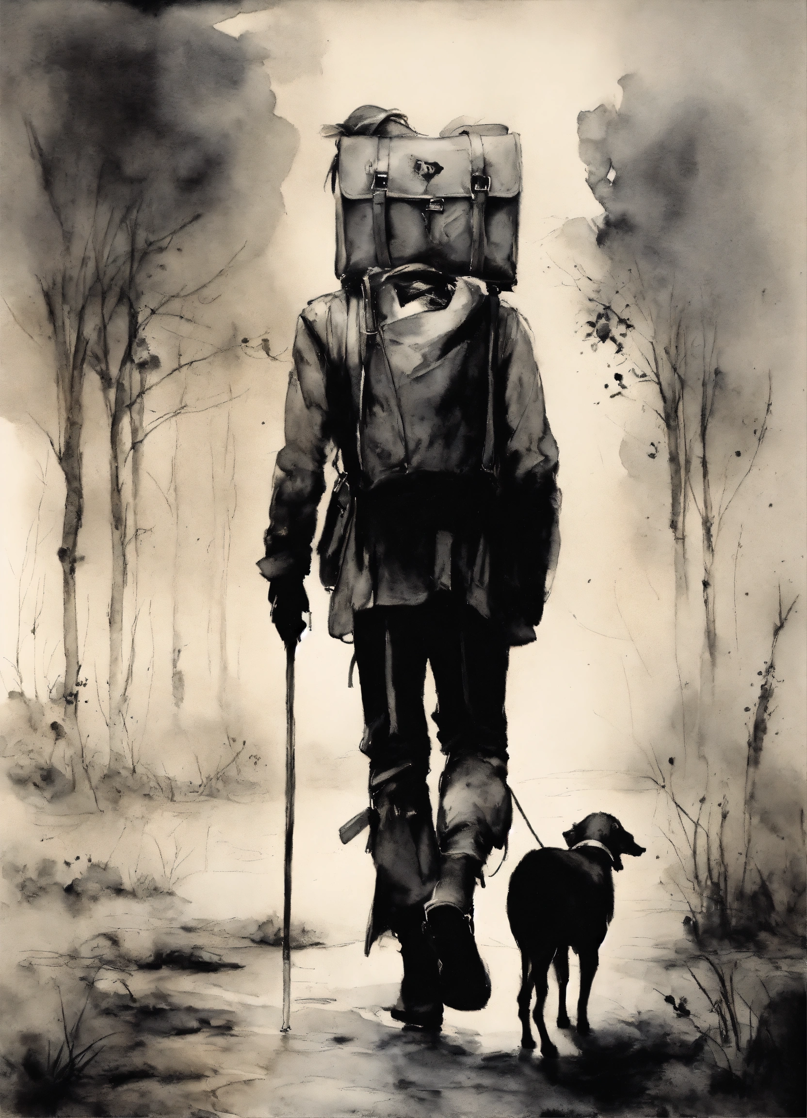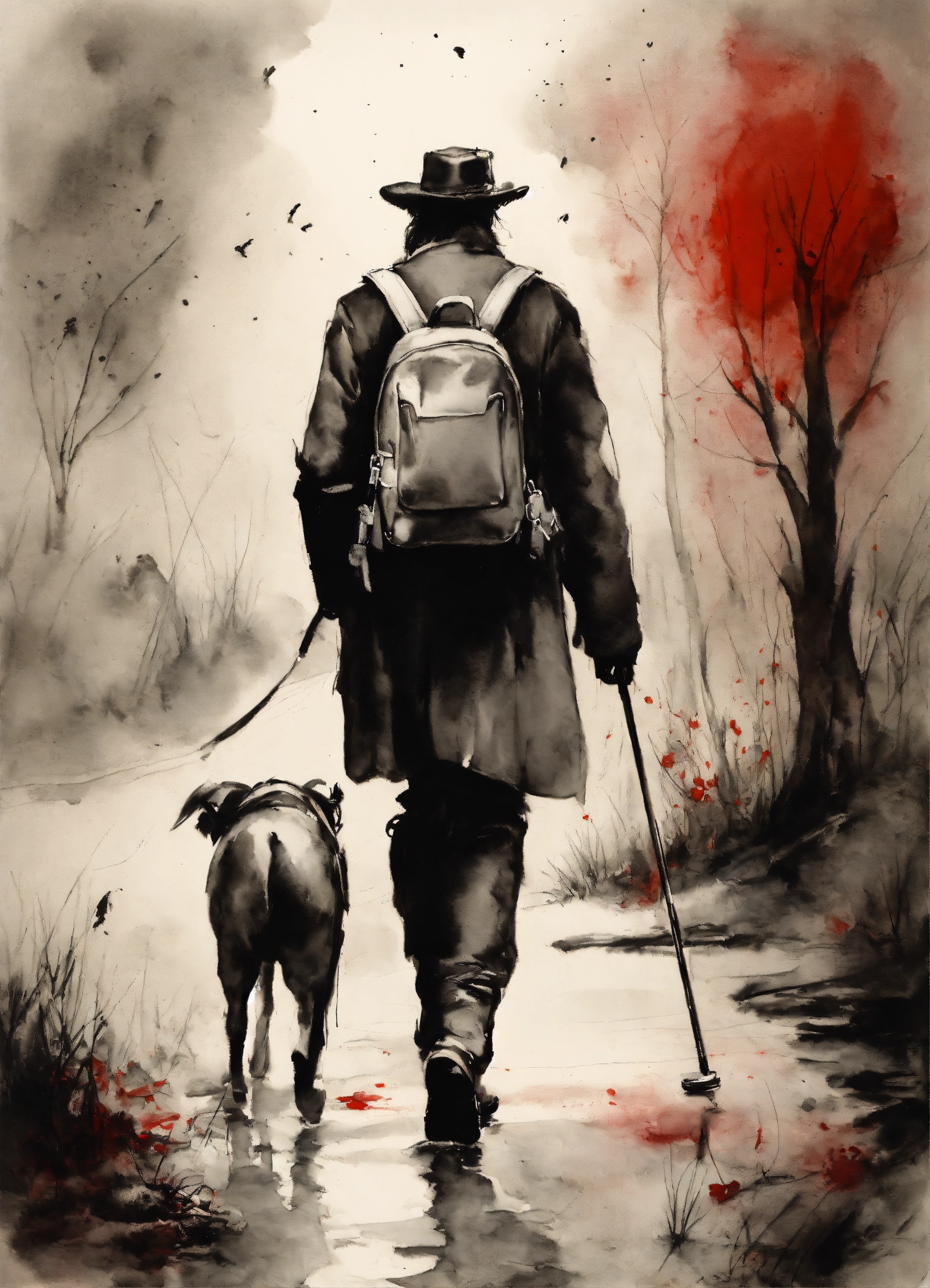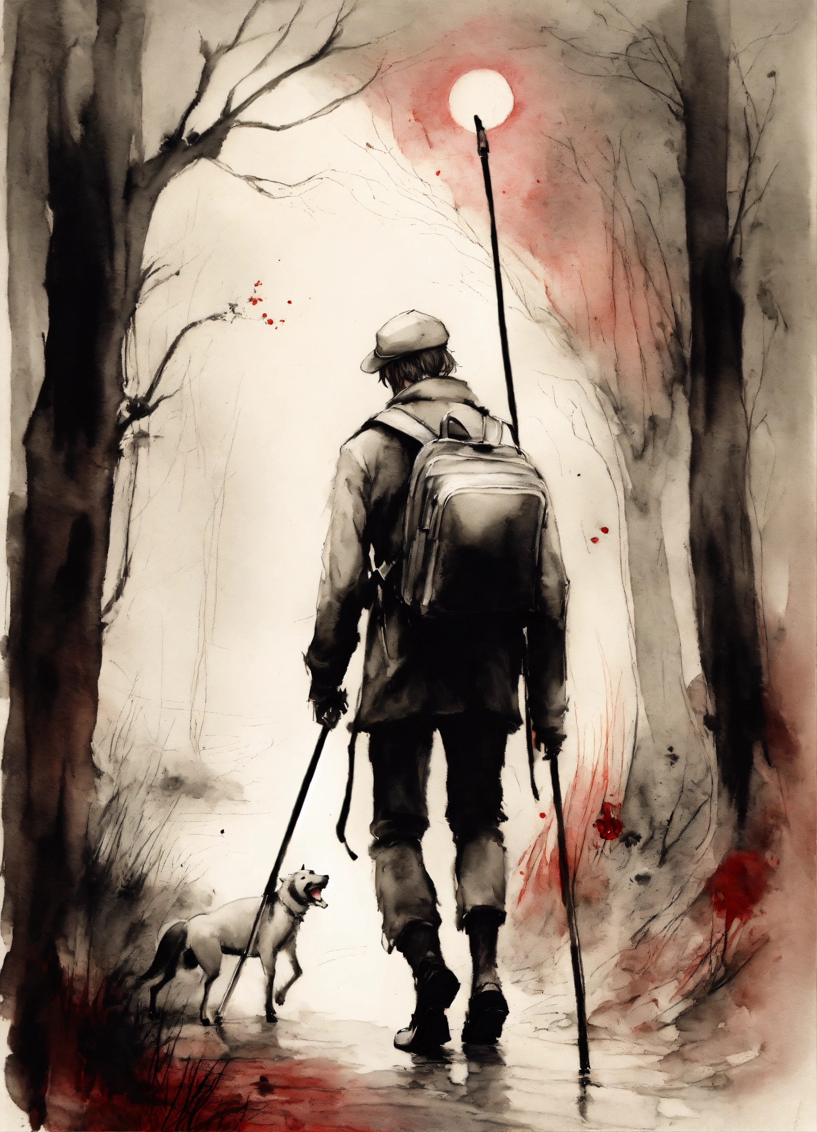 Stephen gammell style, dessin, aquarelle, aquarelles, noir et blanc et rouge, de marais, de sombres créatures, dégoulinant, the fool's card in the tarot deck. a man walking with his backpack and a dog killing his calf