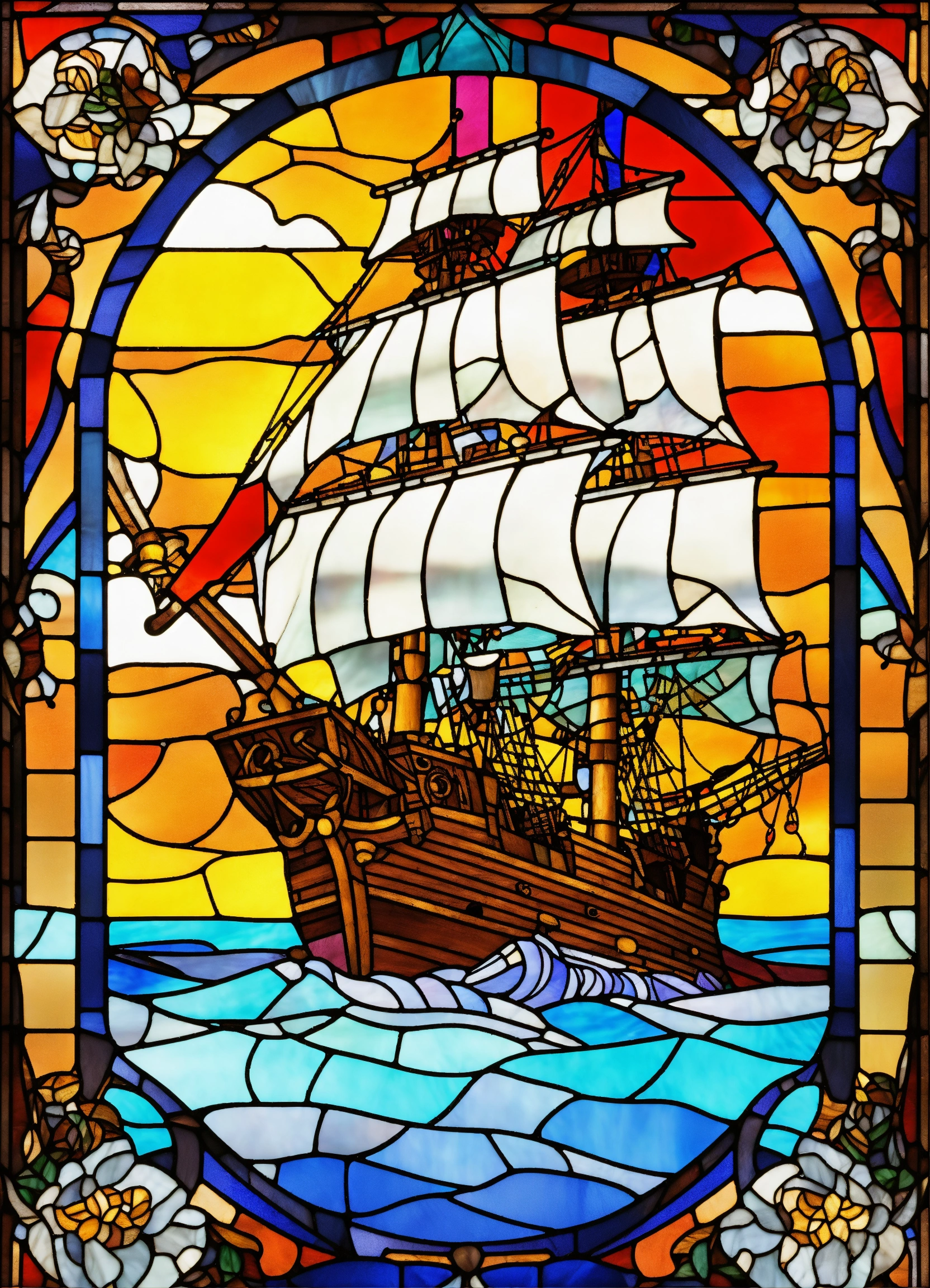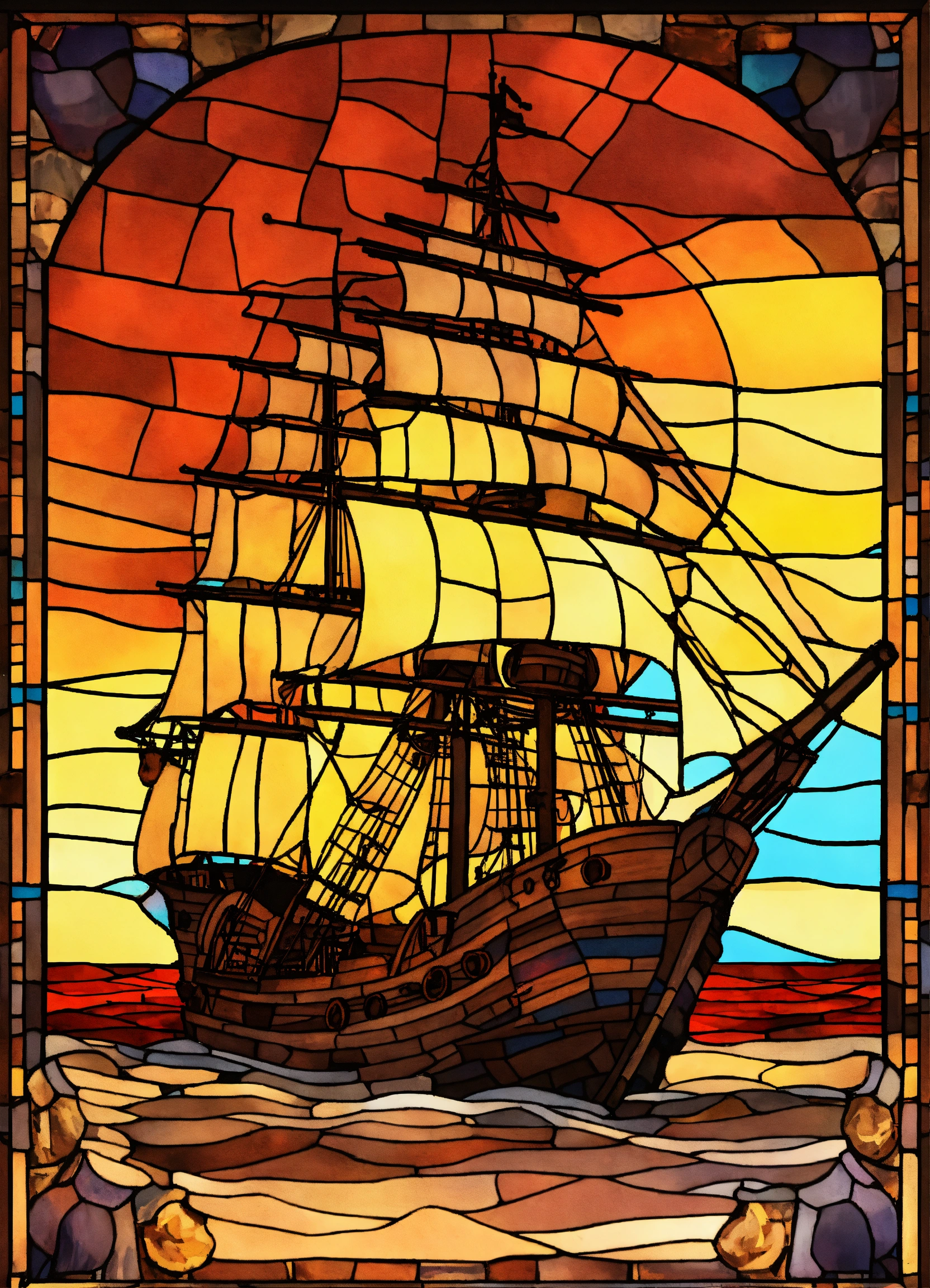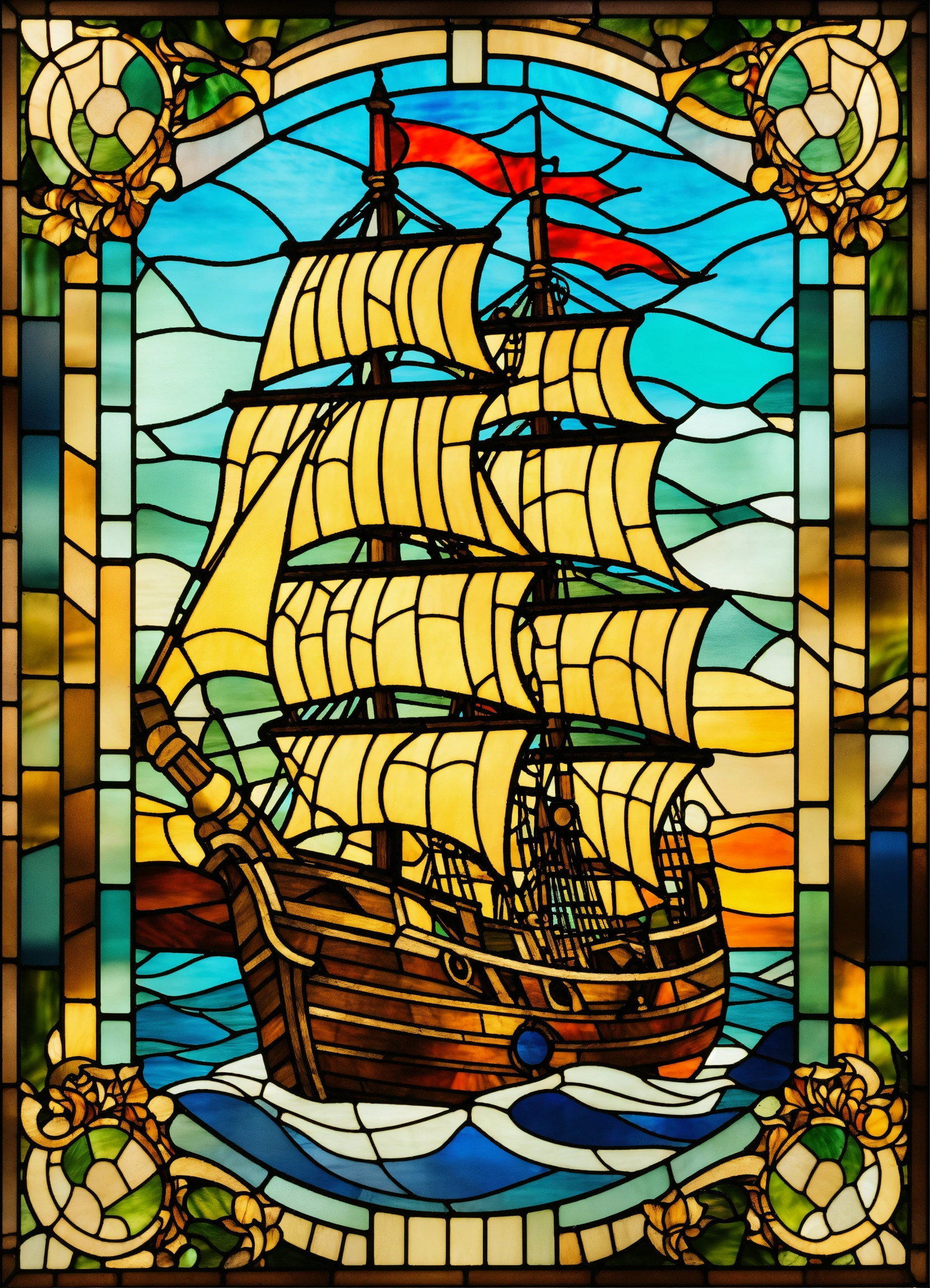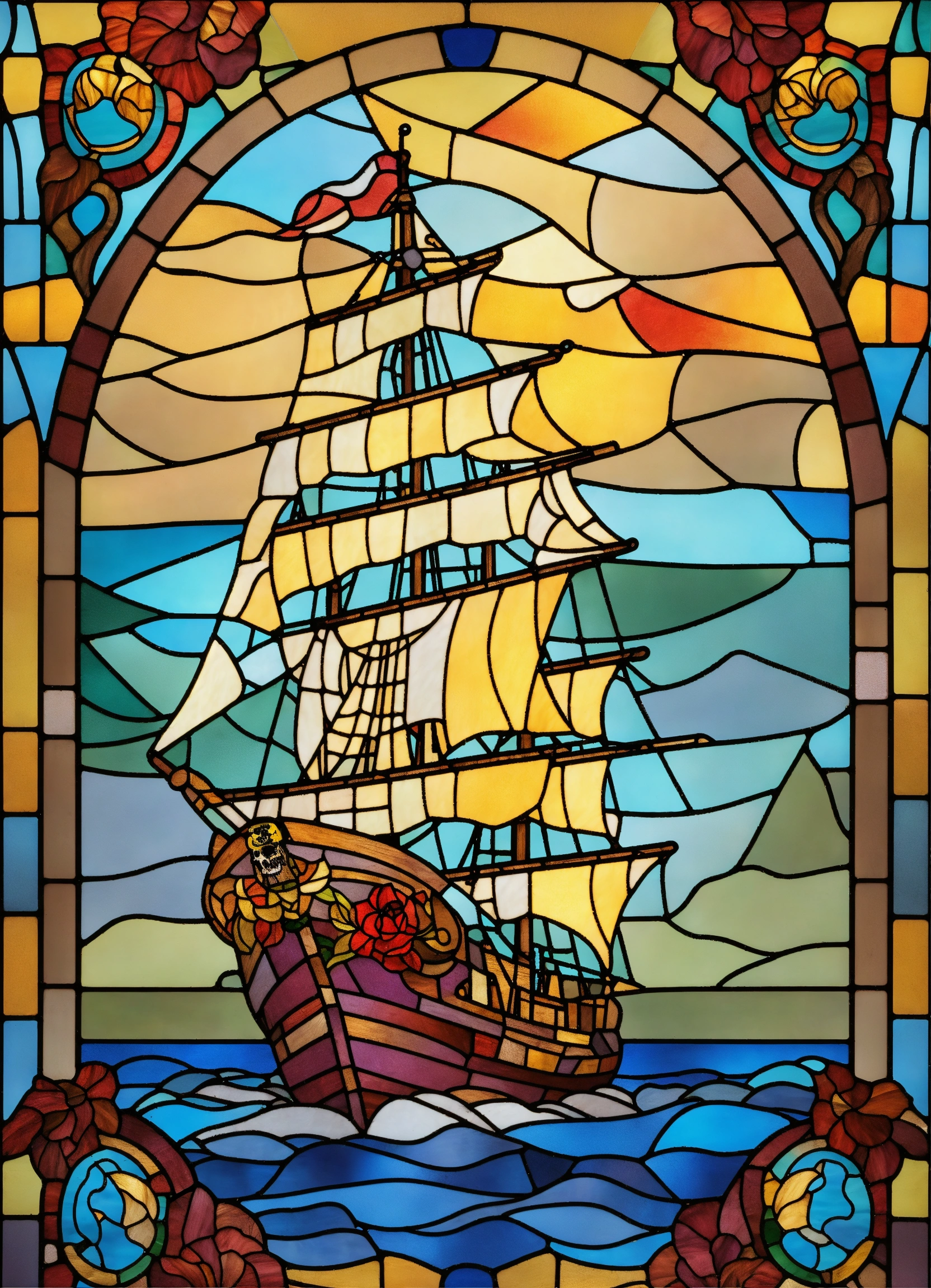 Stained glass image of pirate ship