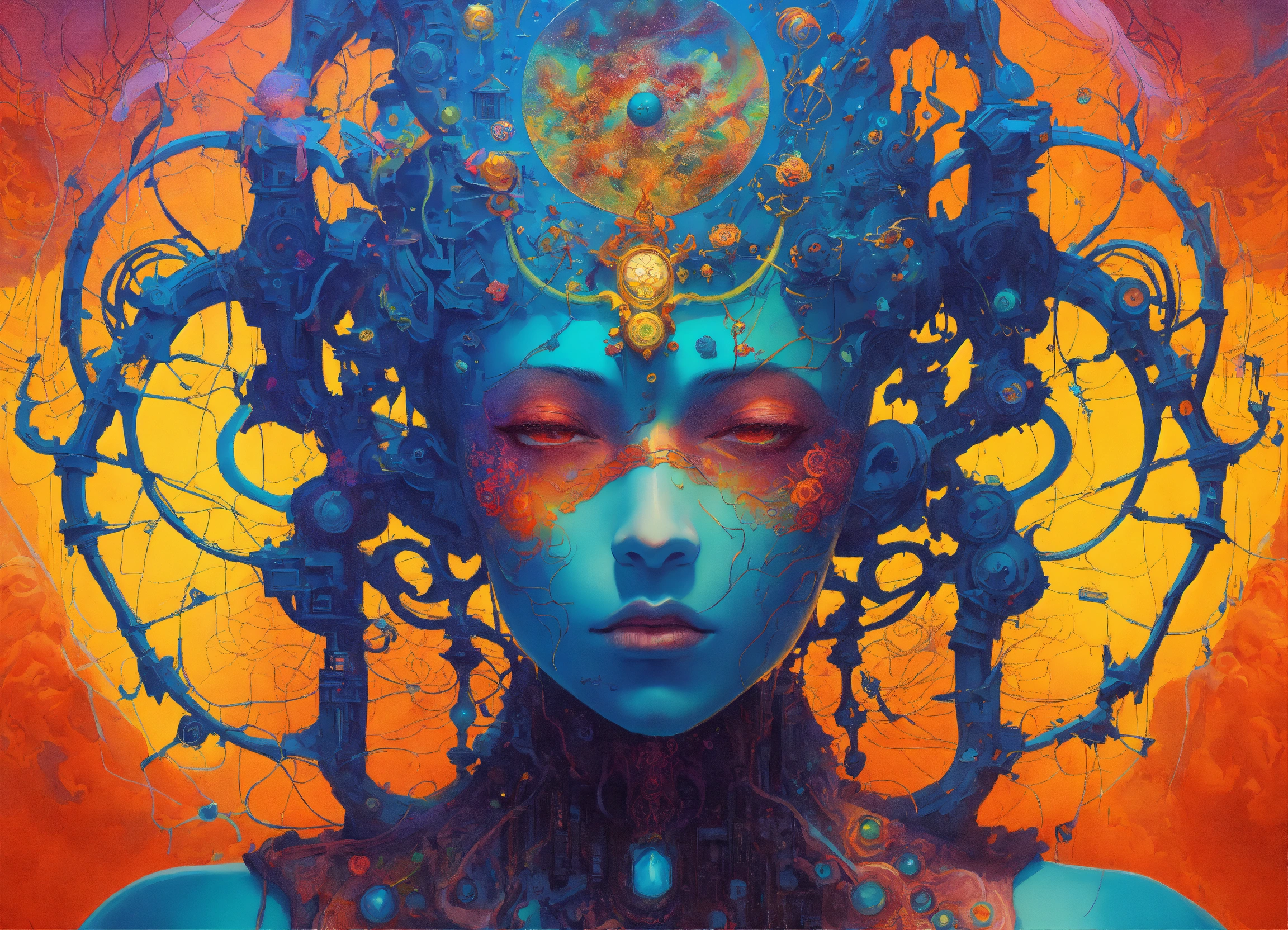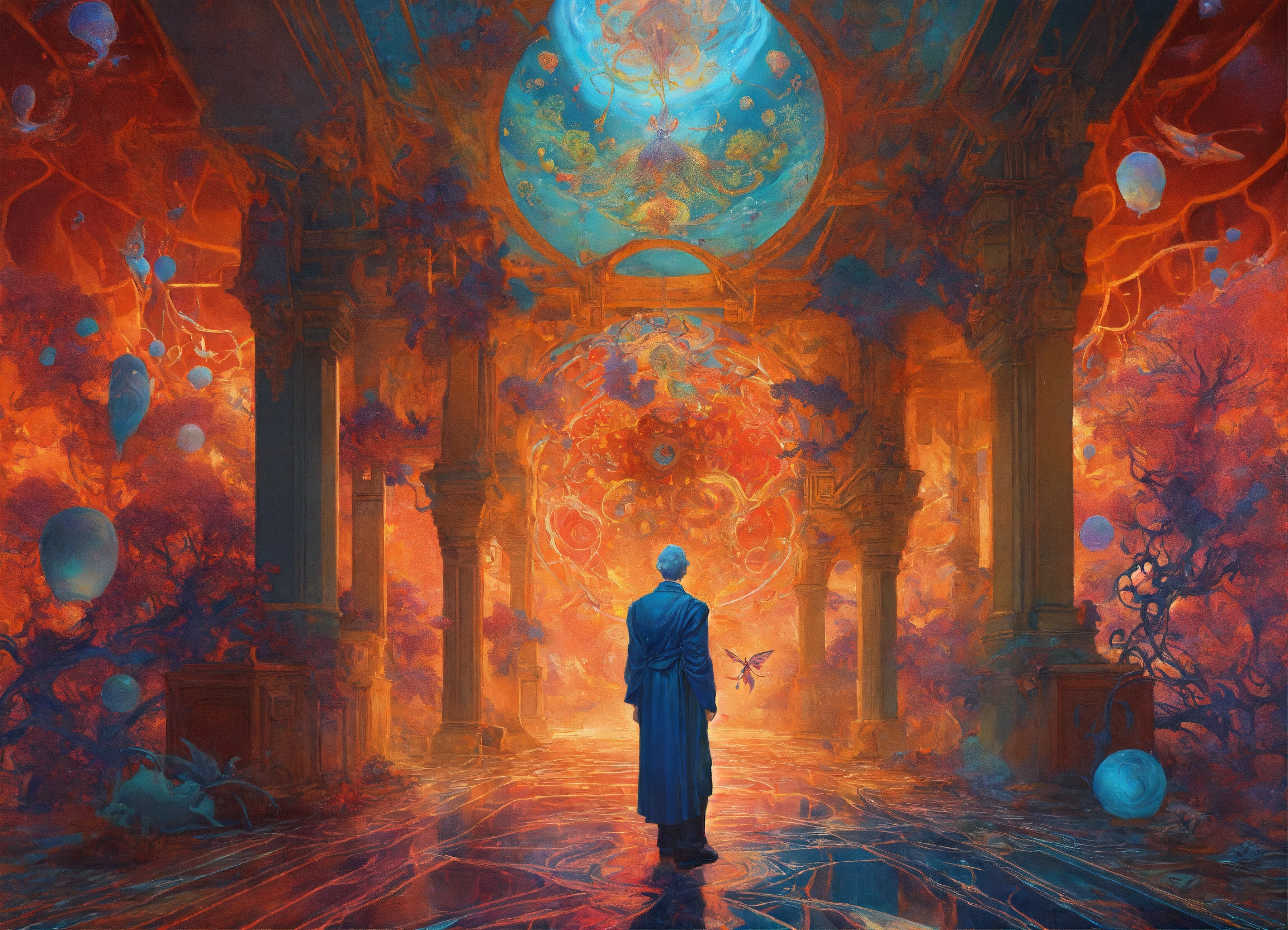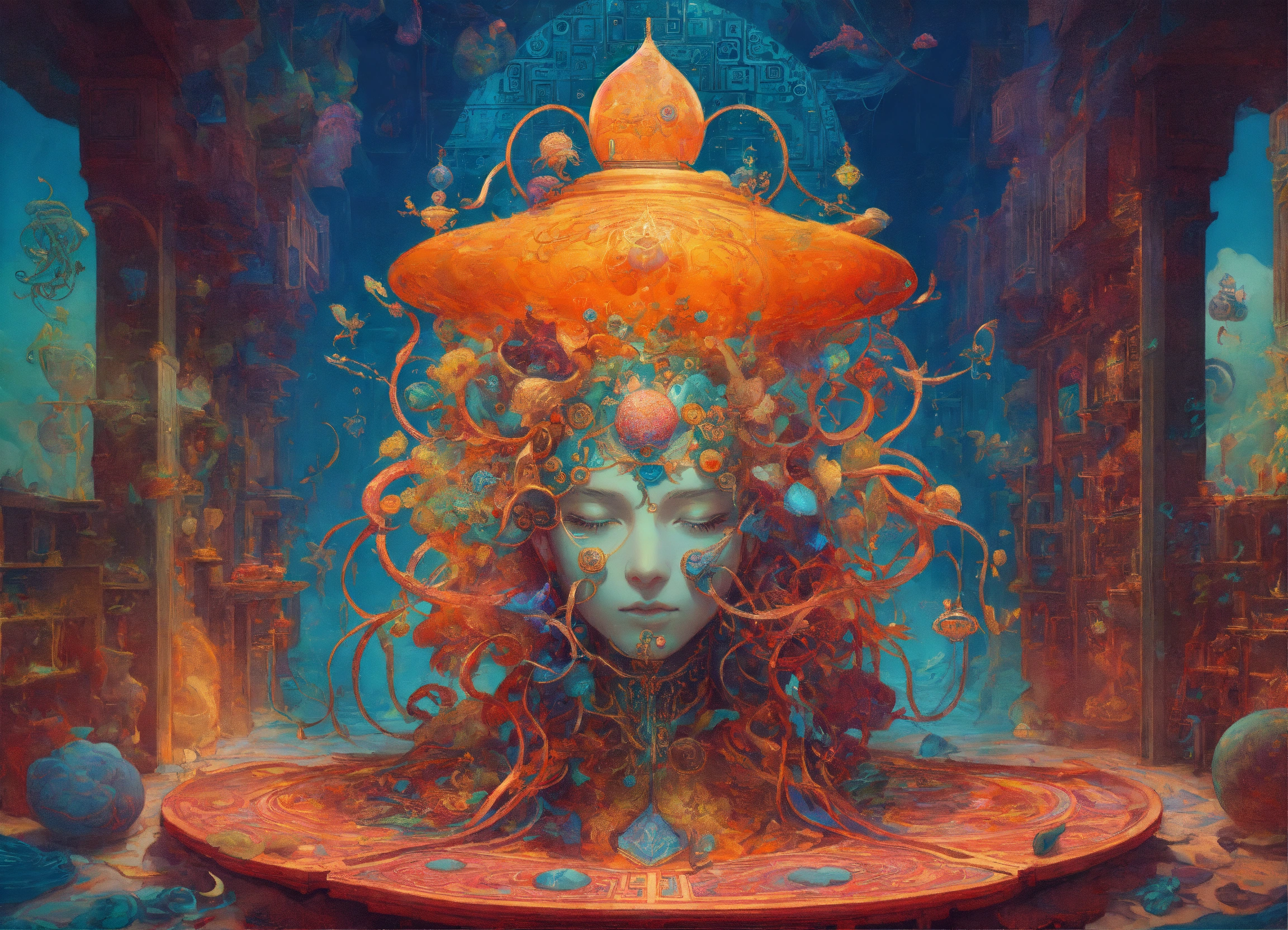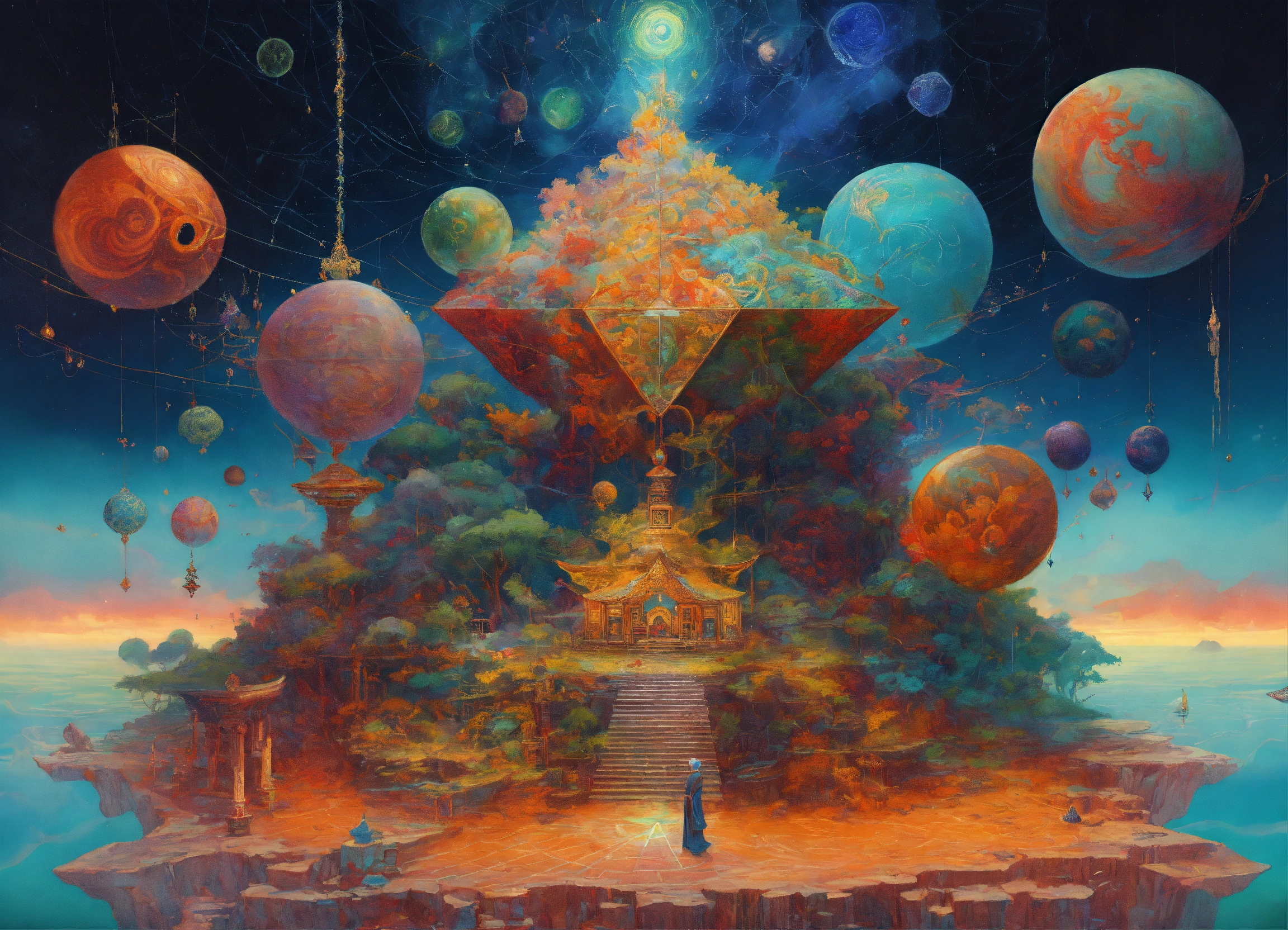 Bright colors, fractalism as a metaphor referring to the constantly changing creative processes of the universe that constitute whatever exists, both mind and body, ideal and material, taoist male manly monk tesseract body fractal three point perspective hypercube mirror zen face brain man mayan mantis jellyfish face, synapses and circuits, fractalism, an ultrafine detailed painting by james jean, octopath traveler, behance contest winner, vanitas, angular, alter modern, surreal