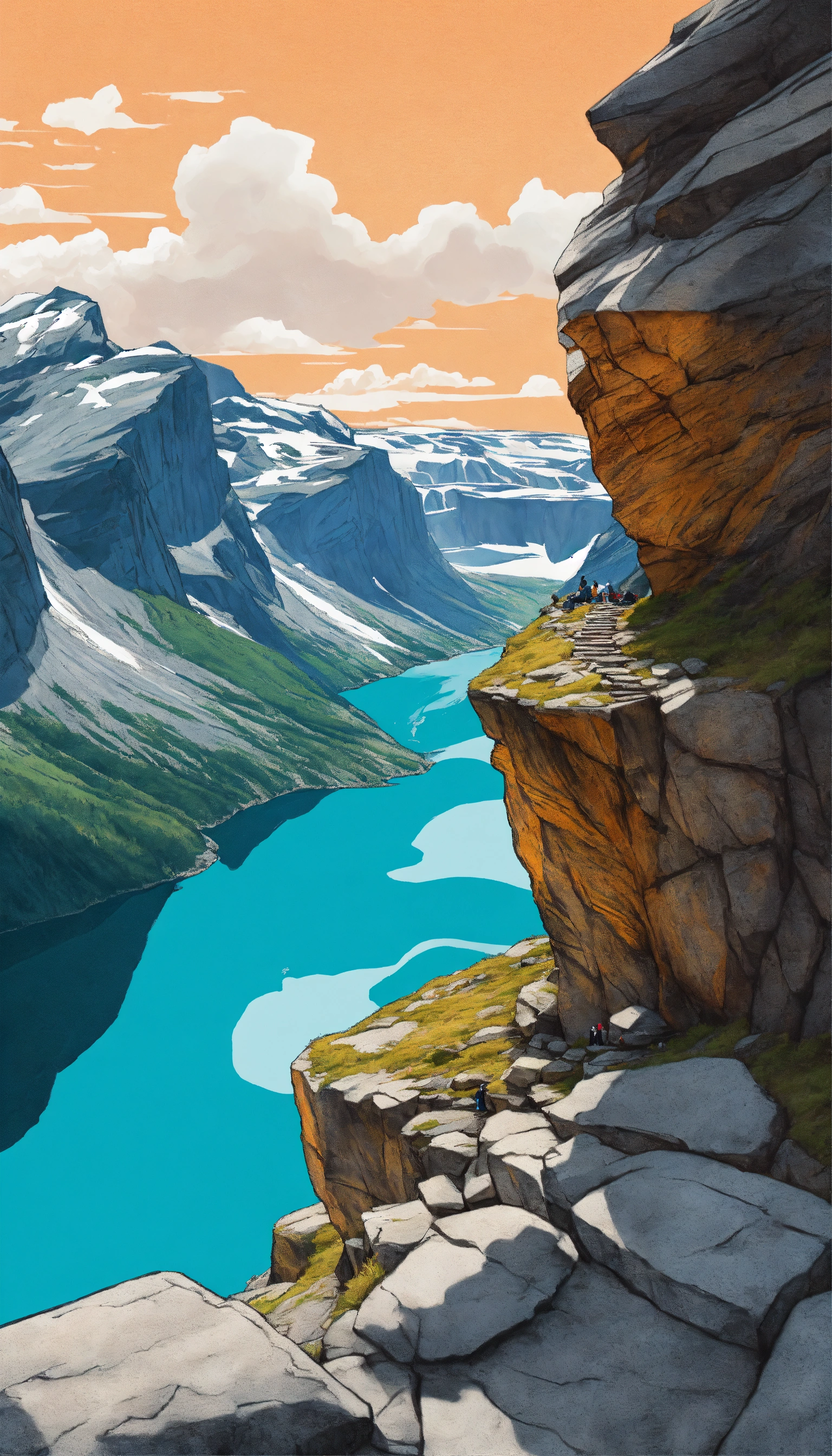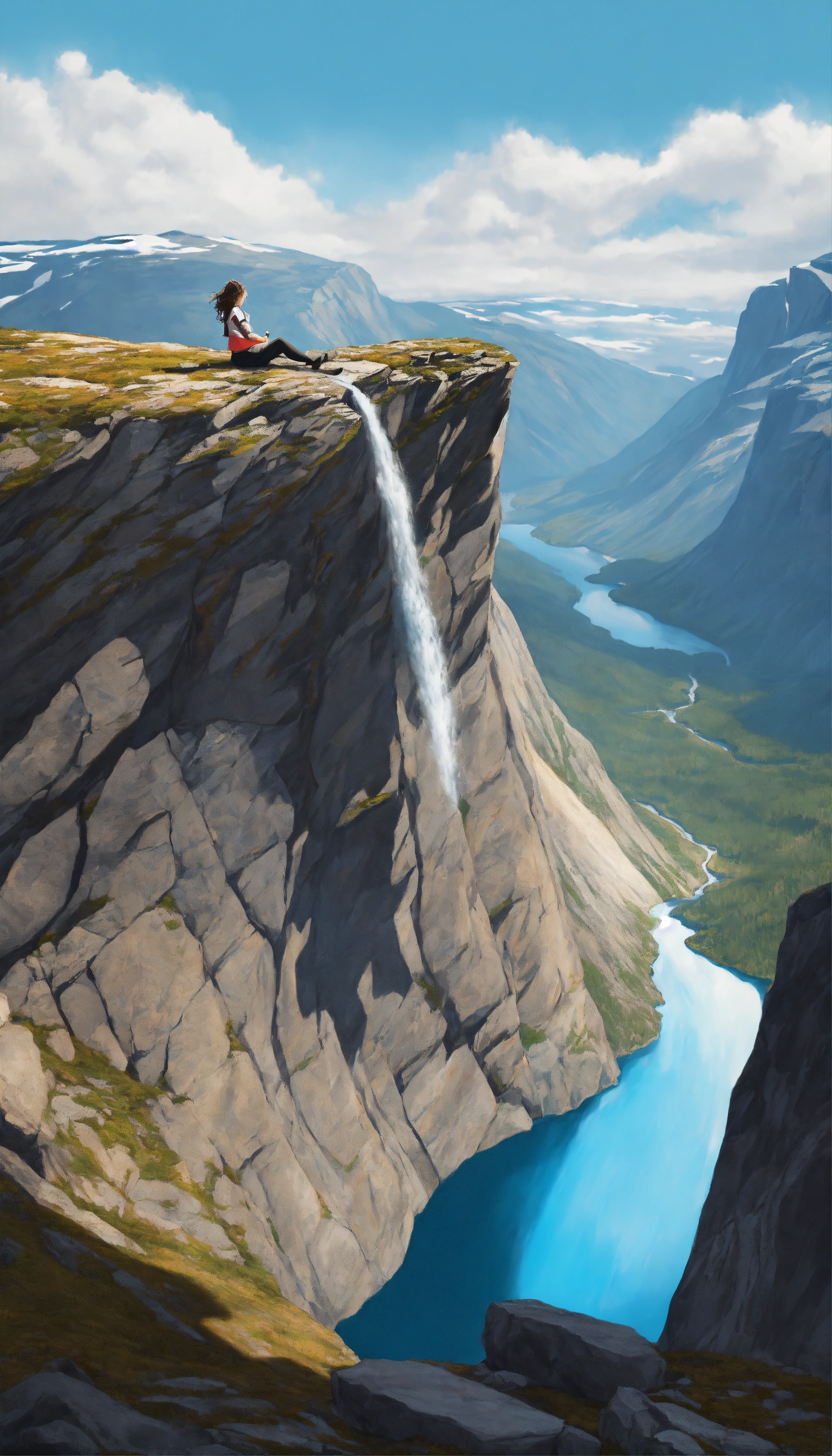 Please draw me a picture of trolltunga in norway, making sure to emphasize the distinctive shape of the rock. on top of the rock, there is a girl sitting with very long hair flowing in the wind. the environment is a bright midday with a clear blue sky and white clouds. use a pencil sketch style for sharpness and detail, with contrast and shading to make it more vivid.
