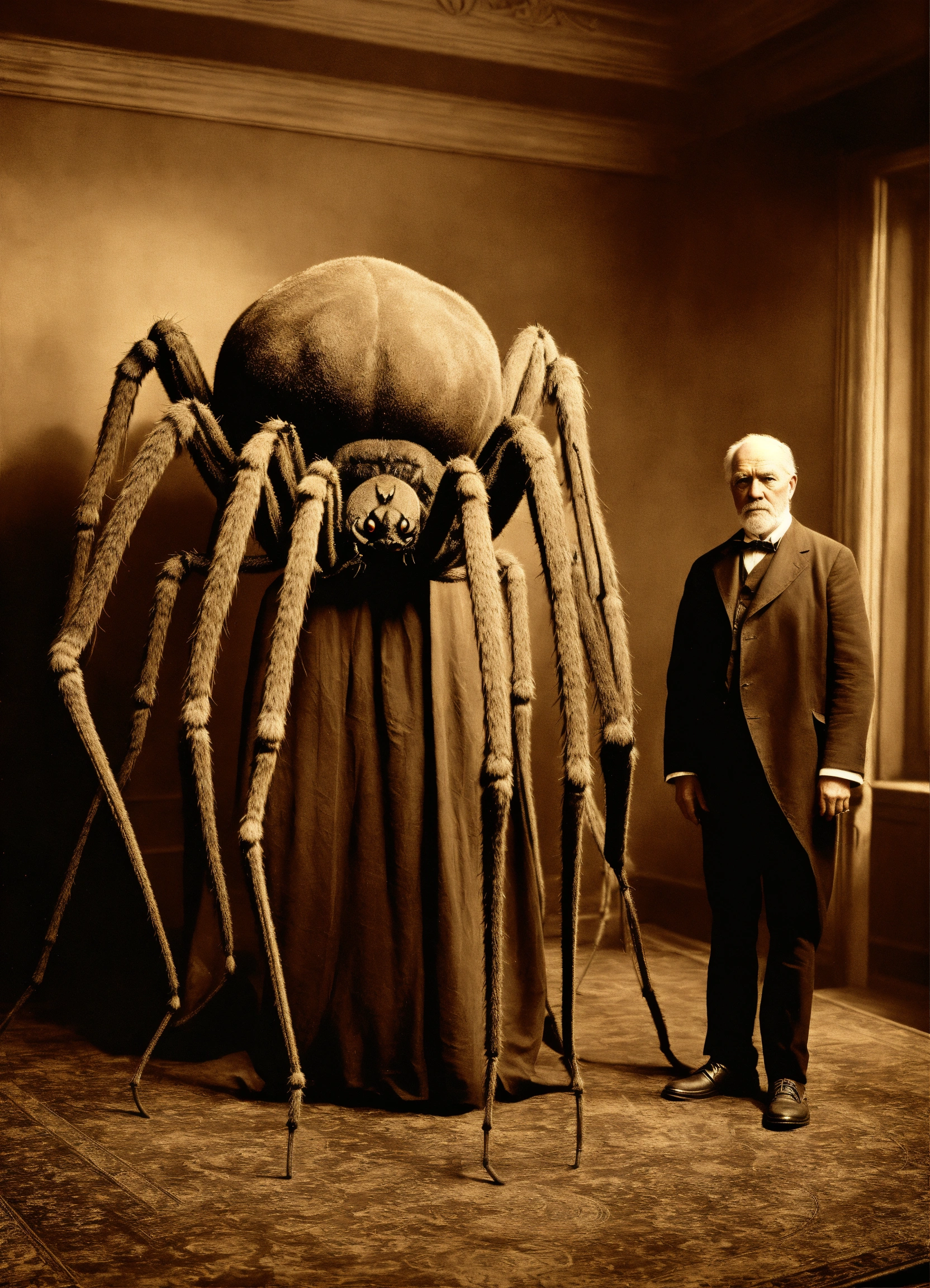 Old man standing next to a giant spider monster, in the style of contemporary vintage photography, necronomicon illustrations, tabletop photography, 1890, hyperrealistic animal portraits, ghostly presence, whirring contrivances