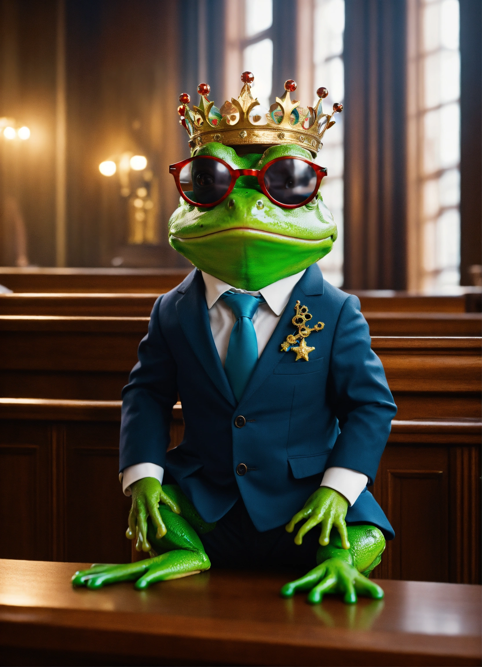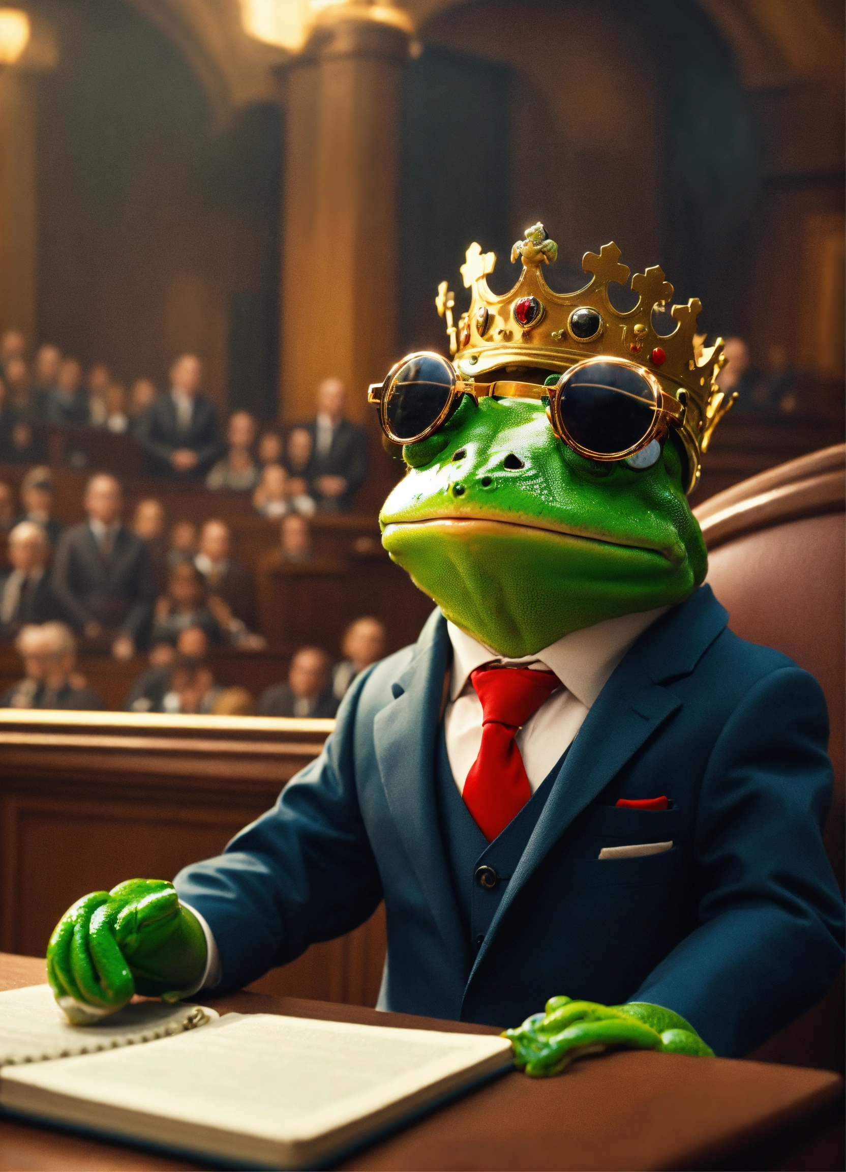 Cute frog in suit and glasses in crown court defending warm in in front of judge in cinematic environment