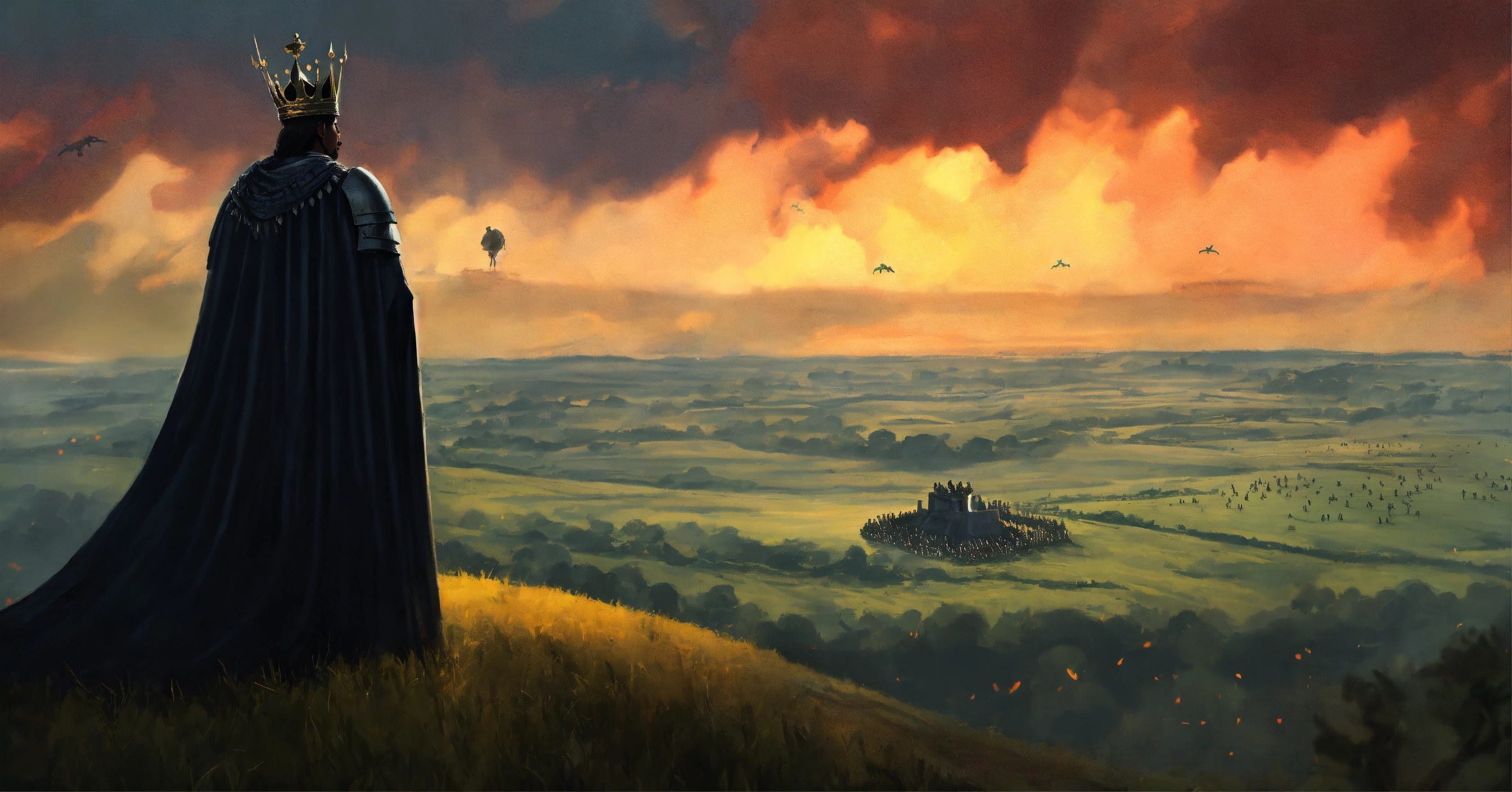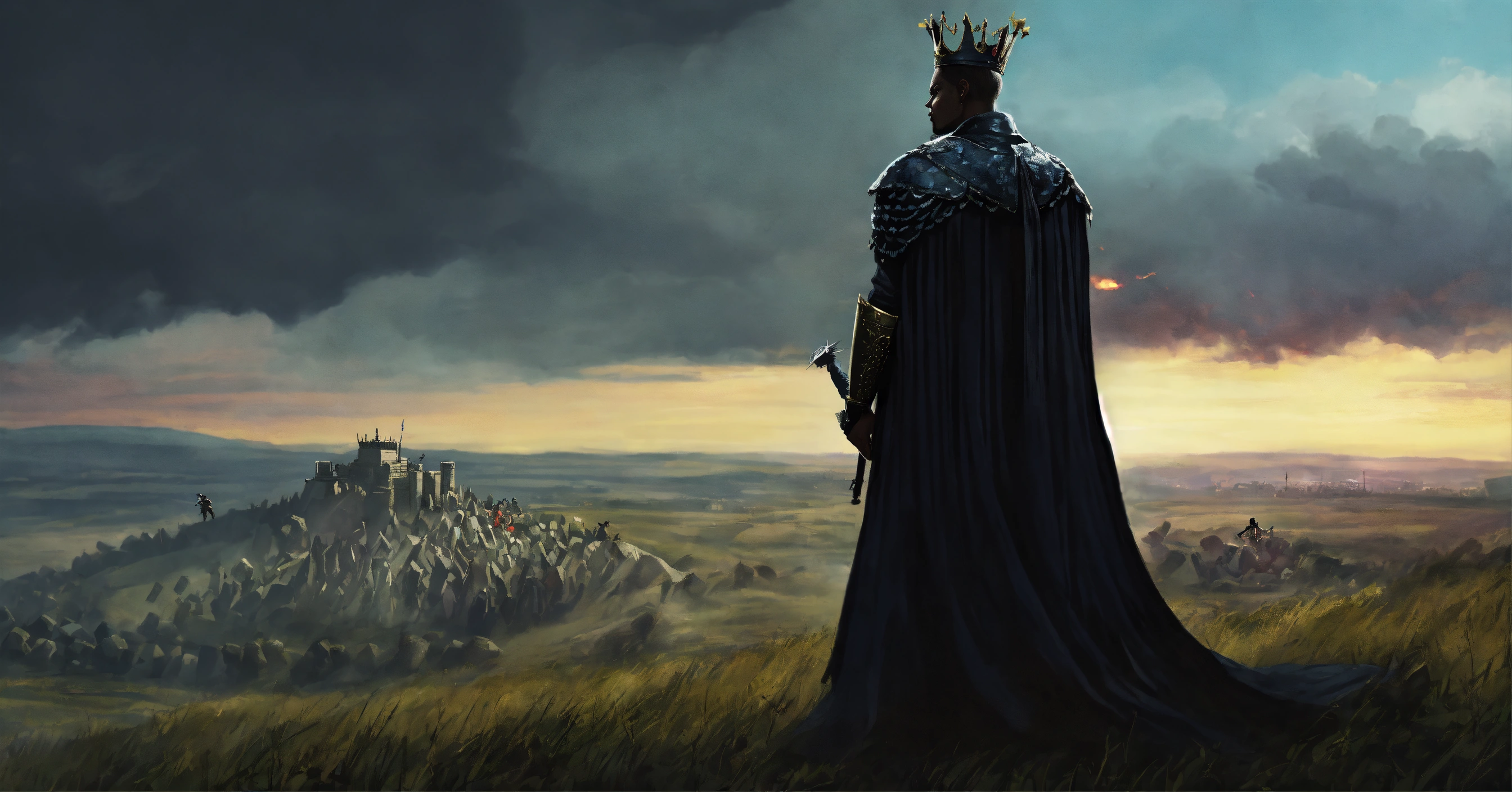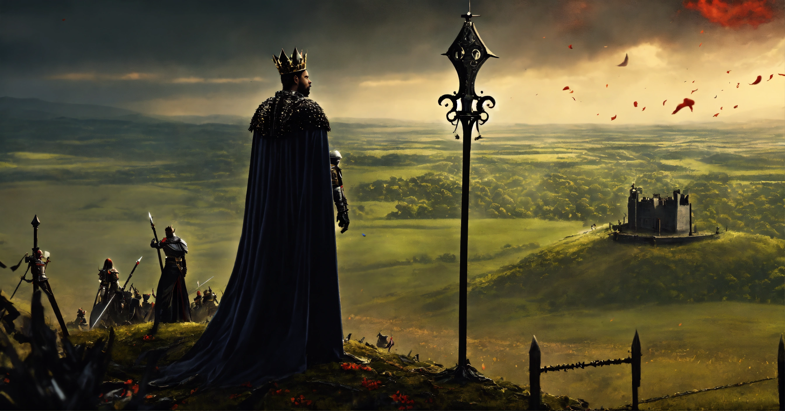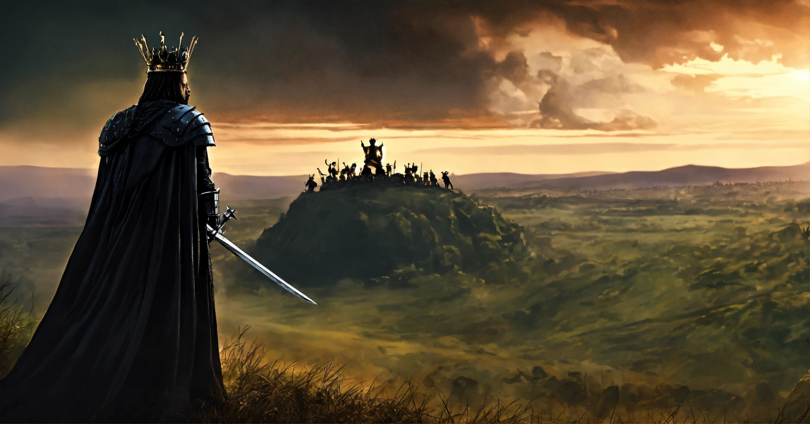 A black king on a hill overlooks a battle field where a ferocious battle is being fought, tim burton style