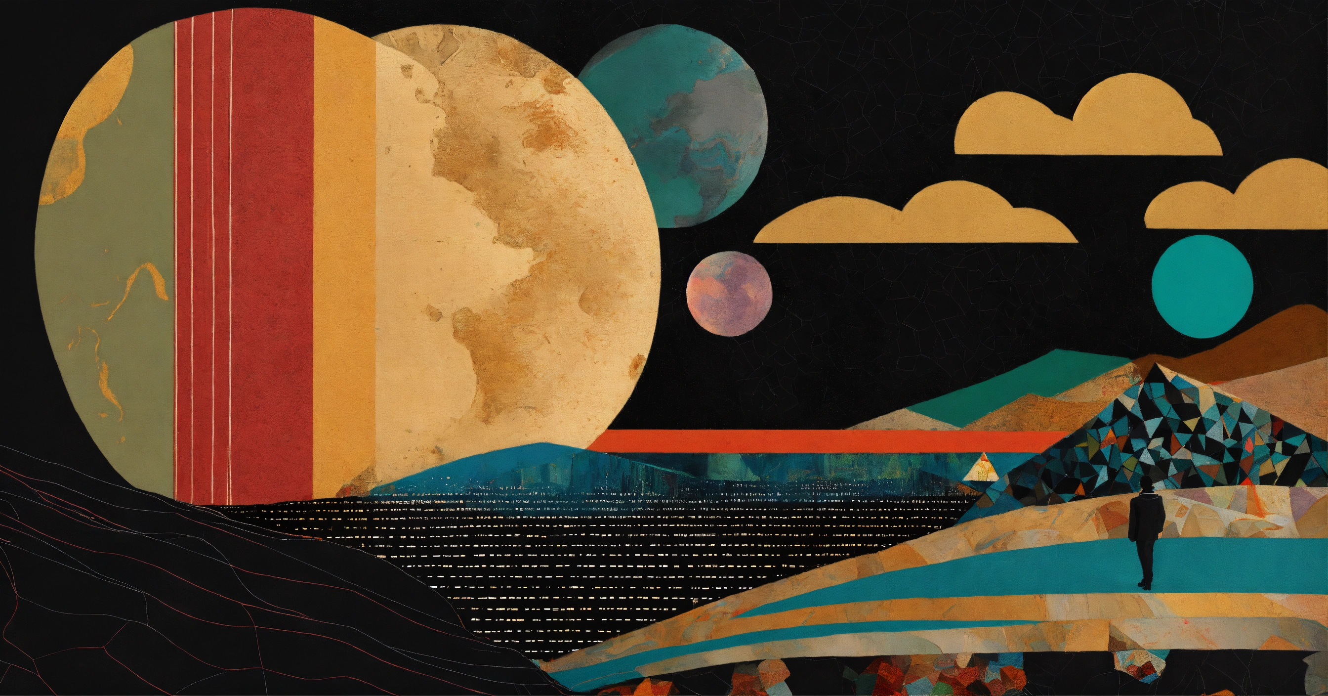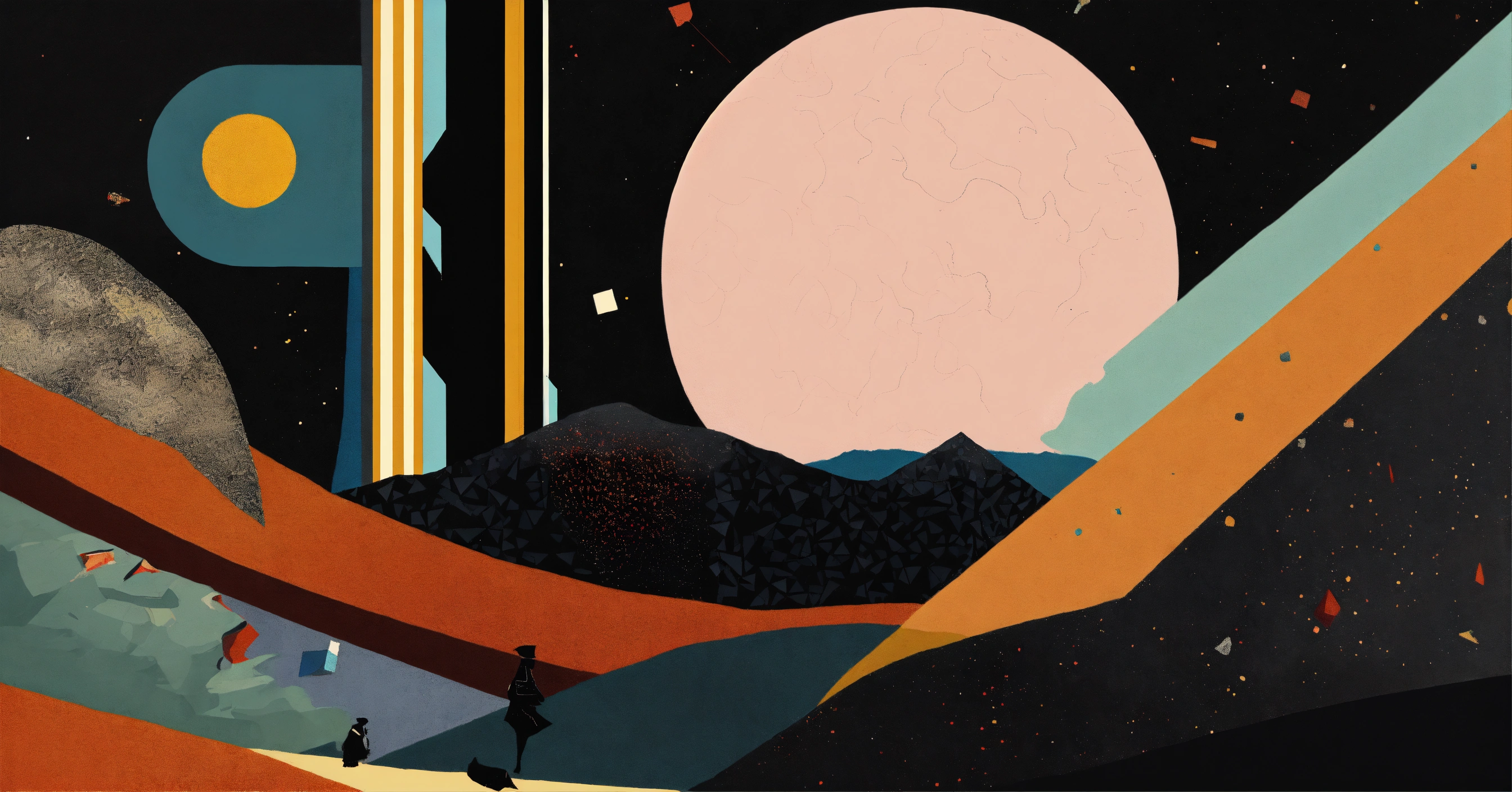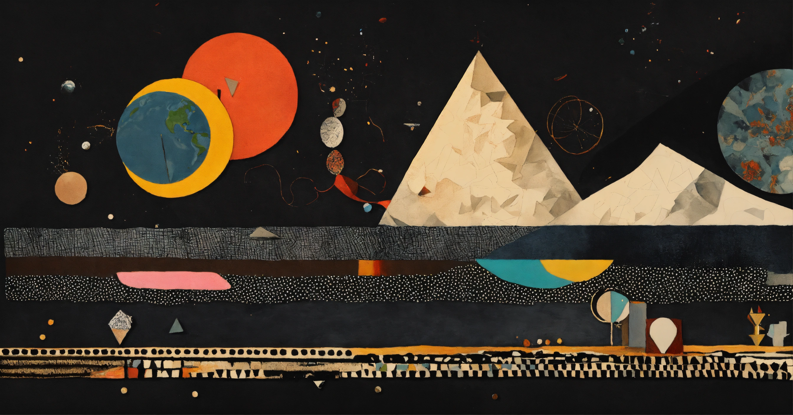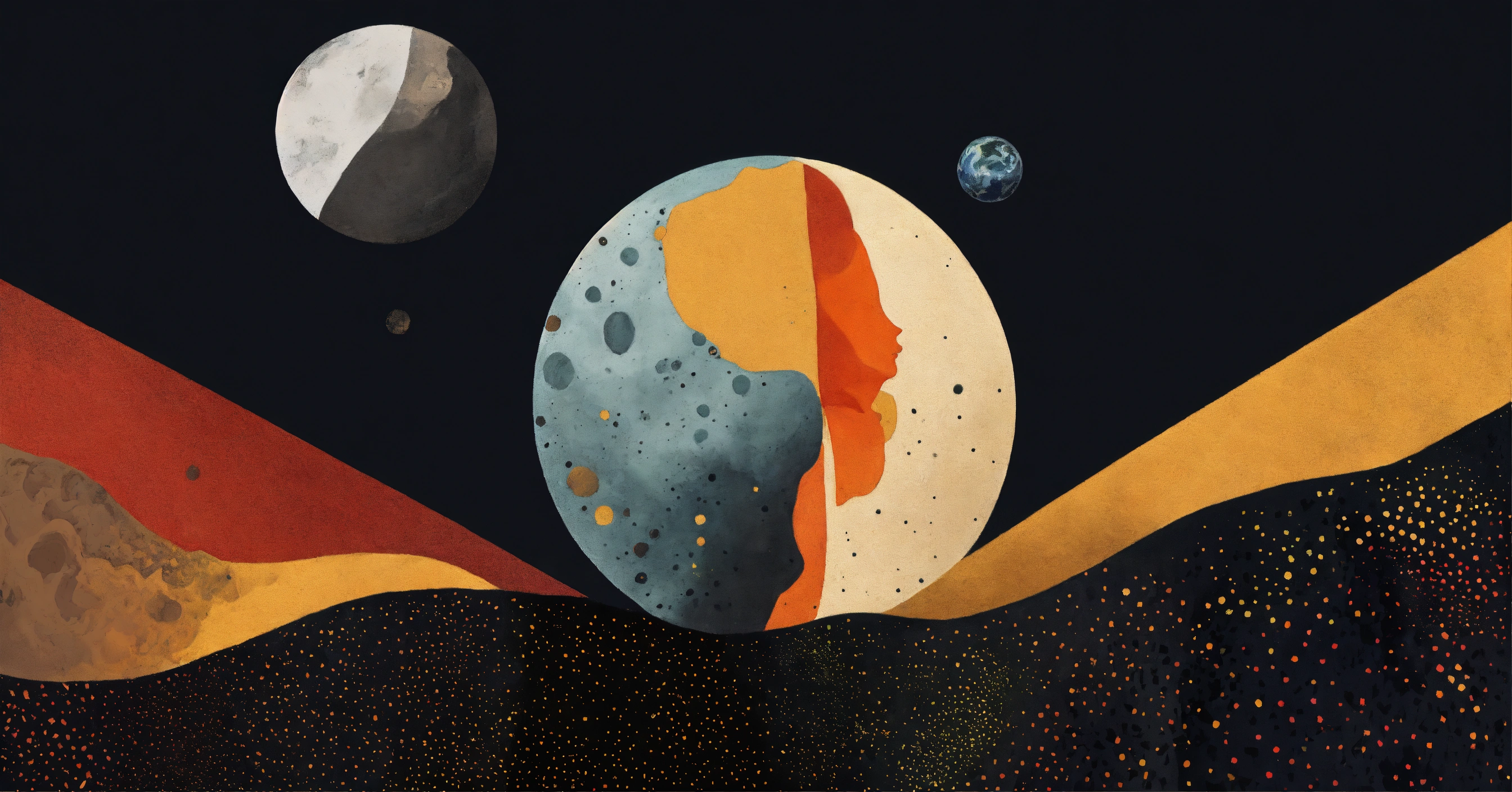 Earth profile + editorial illustration of the memento morti + highly textured, genre defining mixed media collage painting + surrealism + award winning halftone pattern illustration + simple flowing shapes + minimalist color scheme + inspired by pablo picasso + geometric shapes. black background