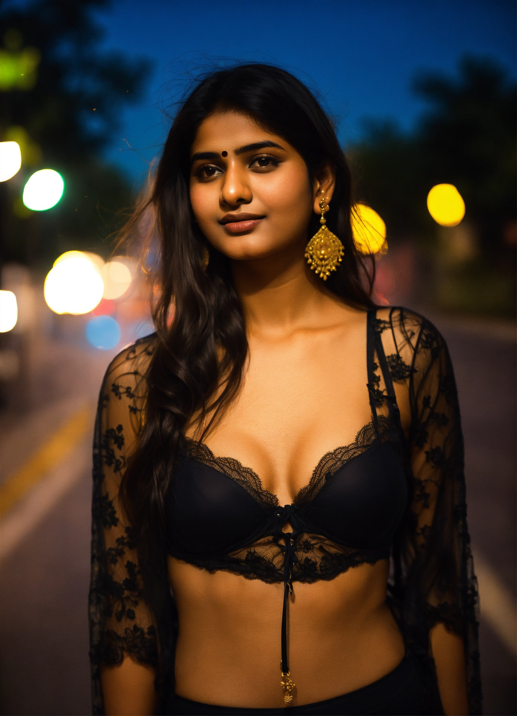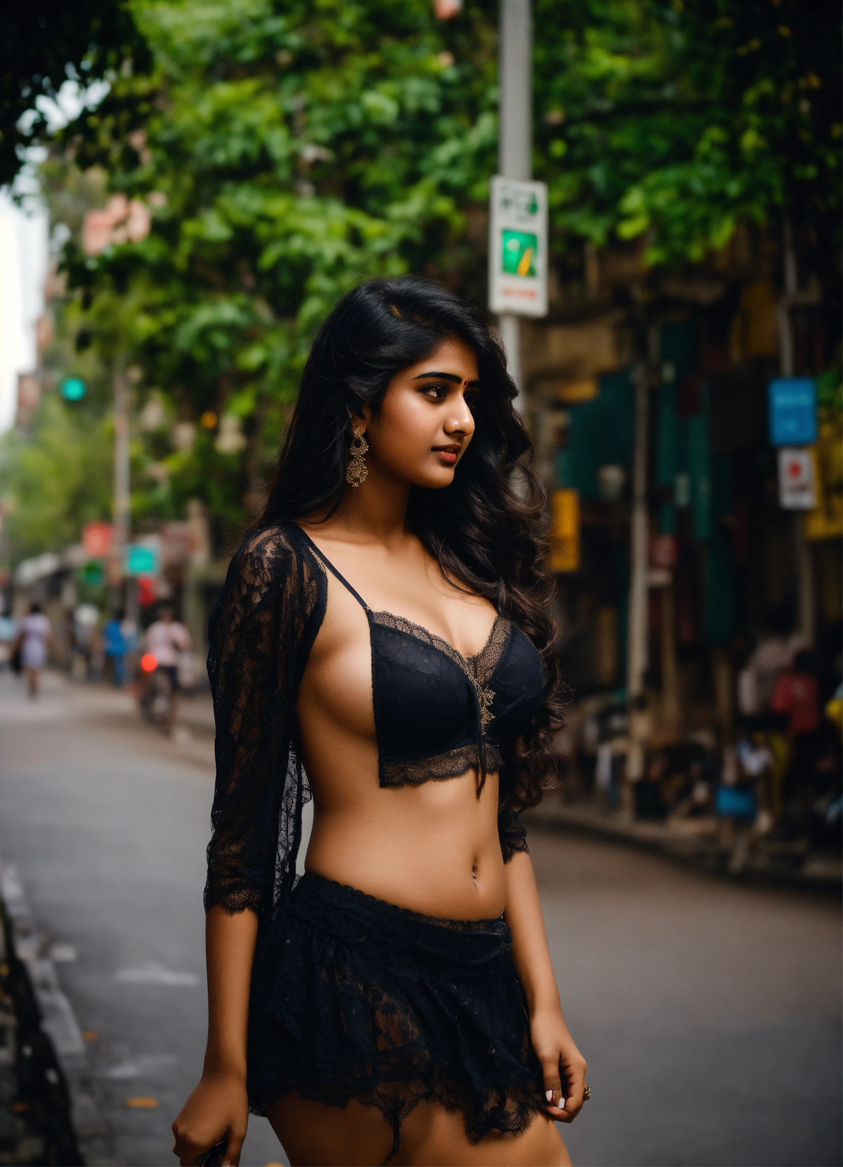 20 years old indian girl in less lacy black bra and stringy chaadi standing in street signal in romantic mood barely dressed