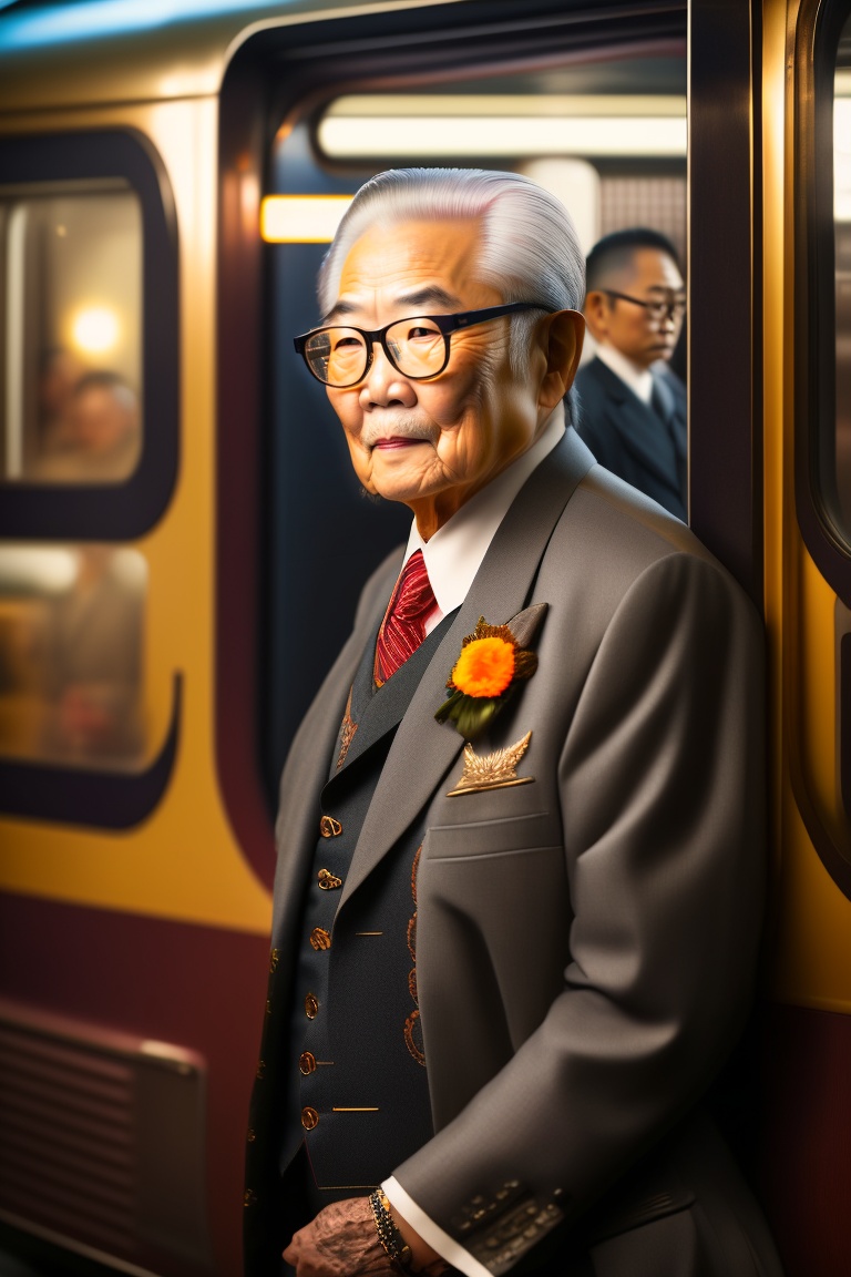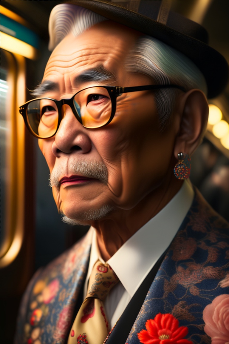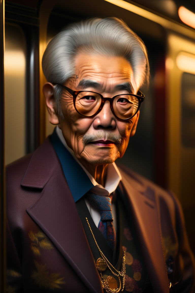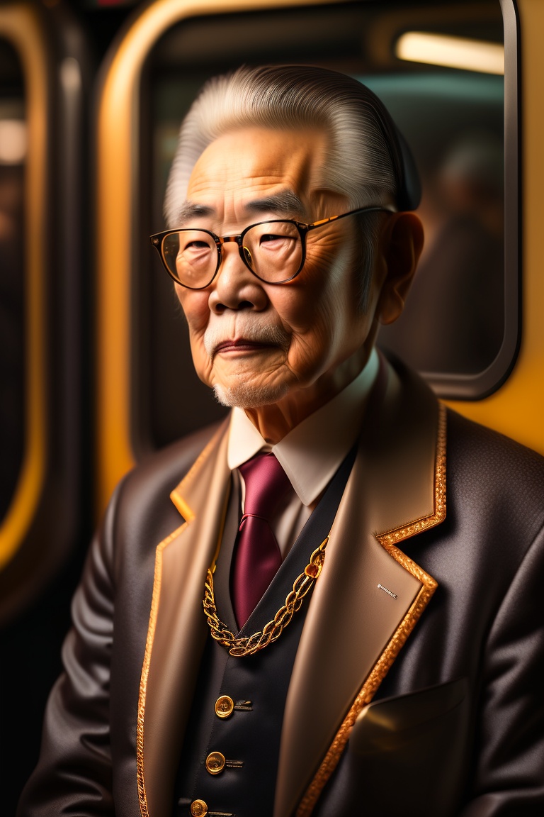 Japanese elderly man all tattooed, gold chain, eyeglasses, yakuza style, elegant, inside a train, in tokyo, 8k, ultra hd, realistic, hyperrealistic, photorealistic, rembrandt lighting, hyperrealism, complex, highly detailed, night, octane rendering, canon ef 100 -400mm f/4.5-5.6 l is ii usm