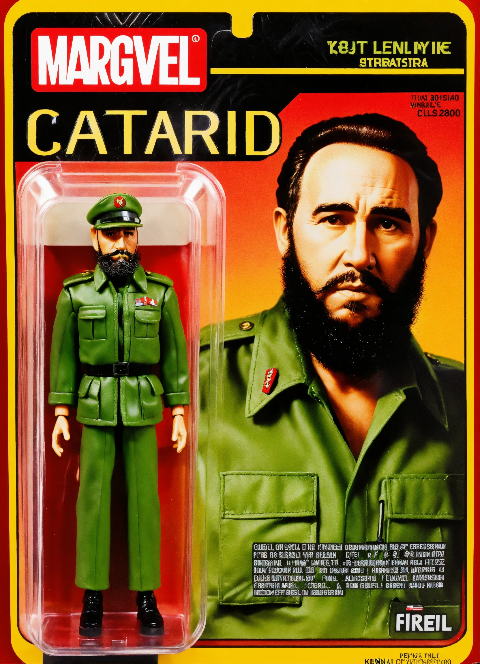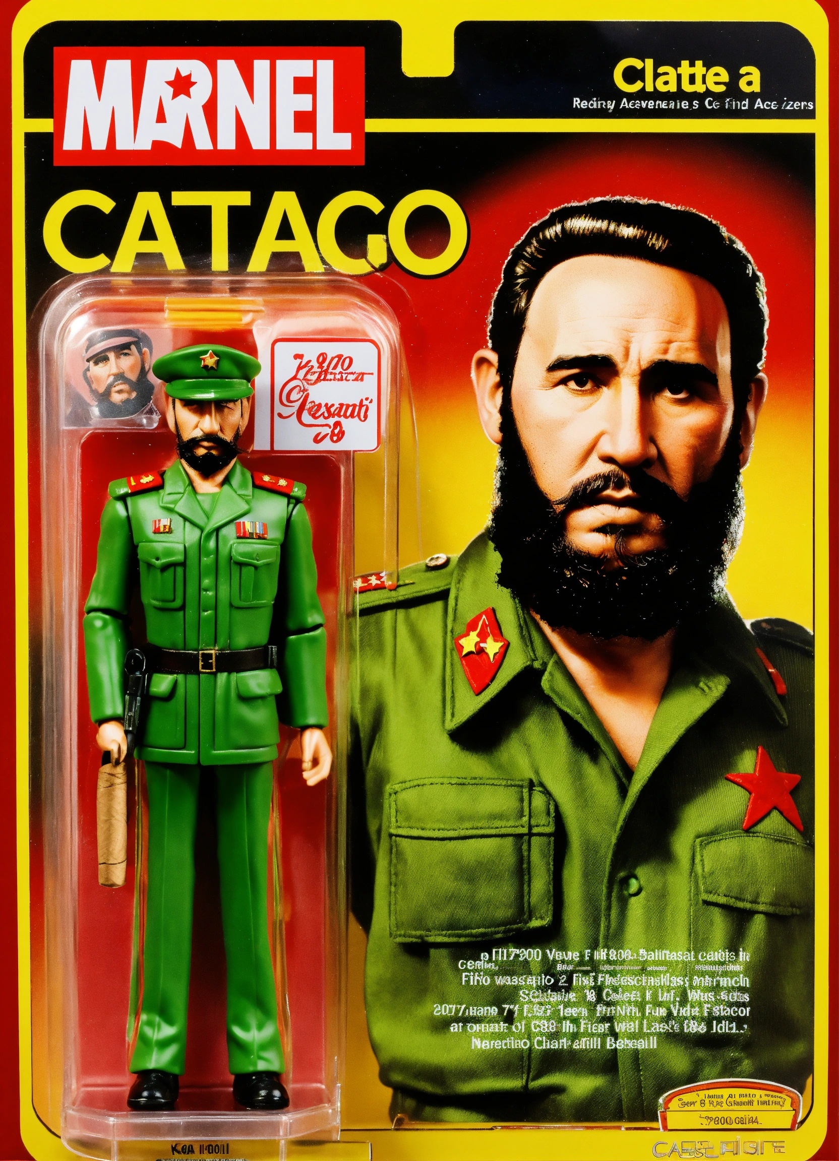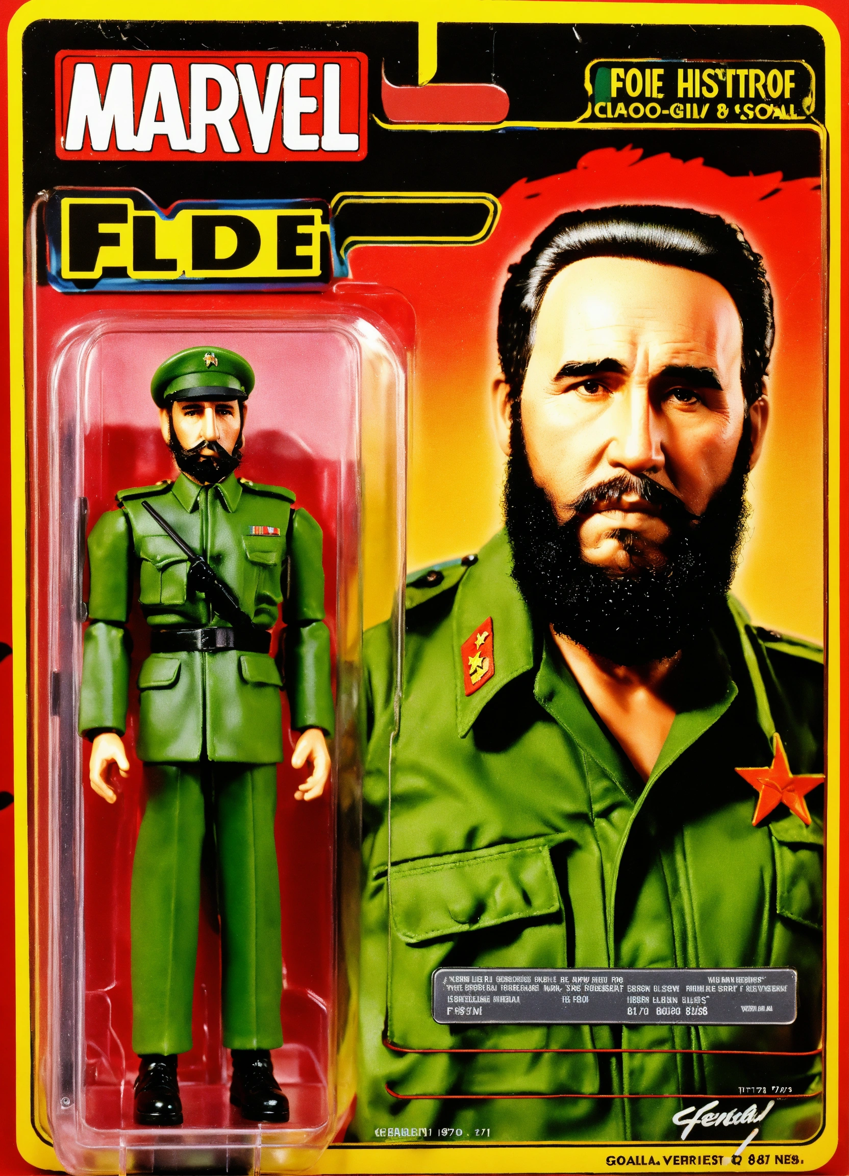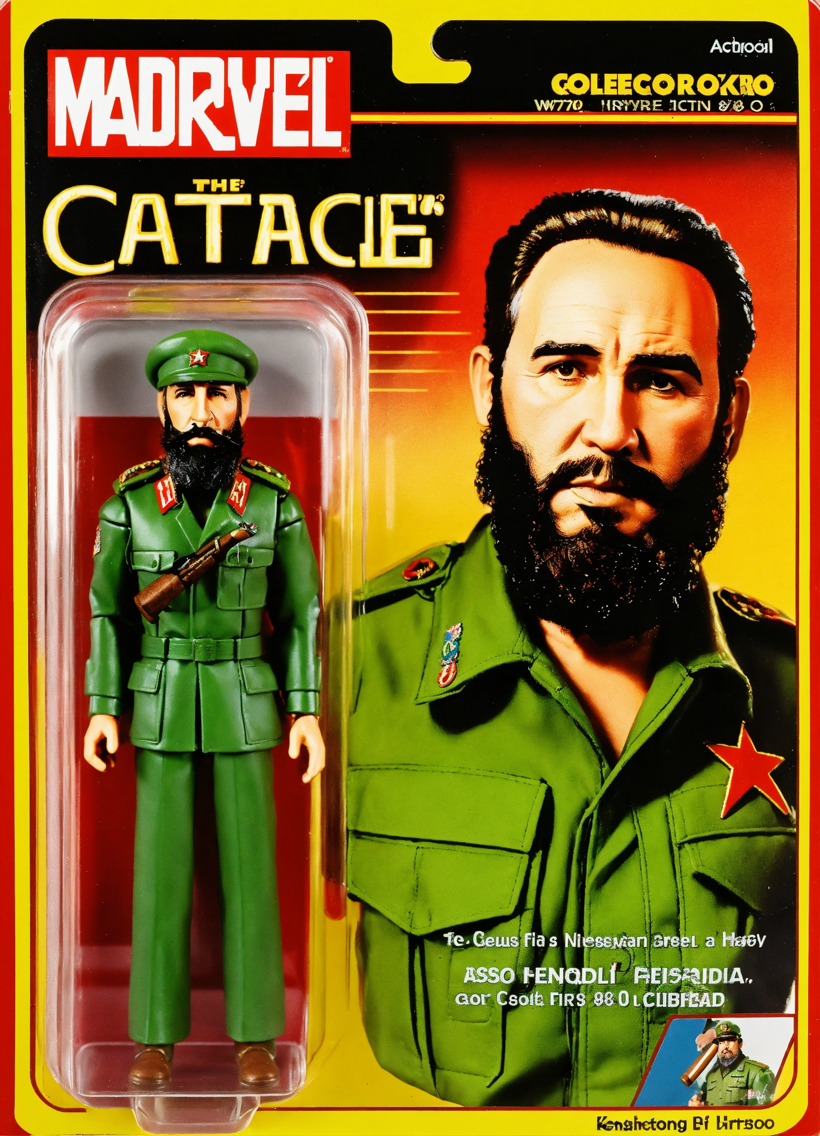 Design a kenner-style action figure of fidel castro, capturing the '70s/'80s retro aesthetic. incorporate fine details, including his iconic beard, cigar and green olive military suit, while staying true to kenner's quality craftsmanship. create classic kenner-style packaging for the figure. the goal is to create a historically accurate, visually striking collector's item that pays tribute to fidel castro's legacy and evokes nostalgia for classic action figures made by kenner.