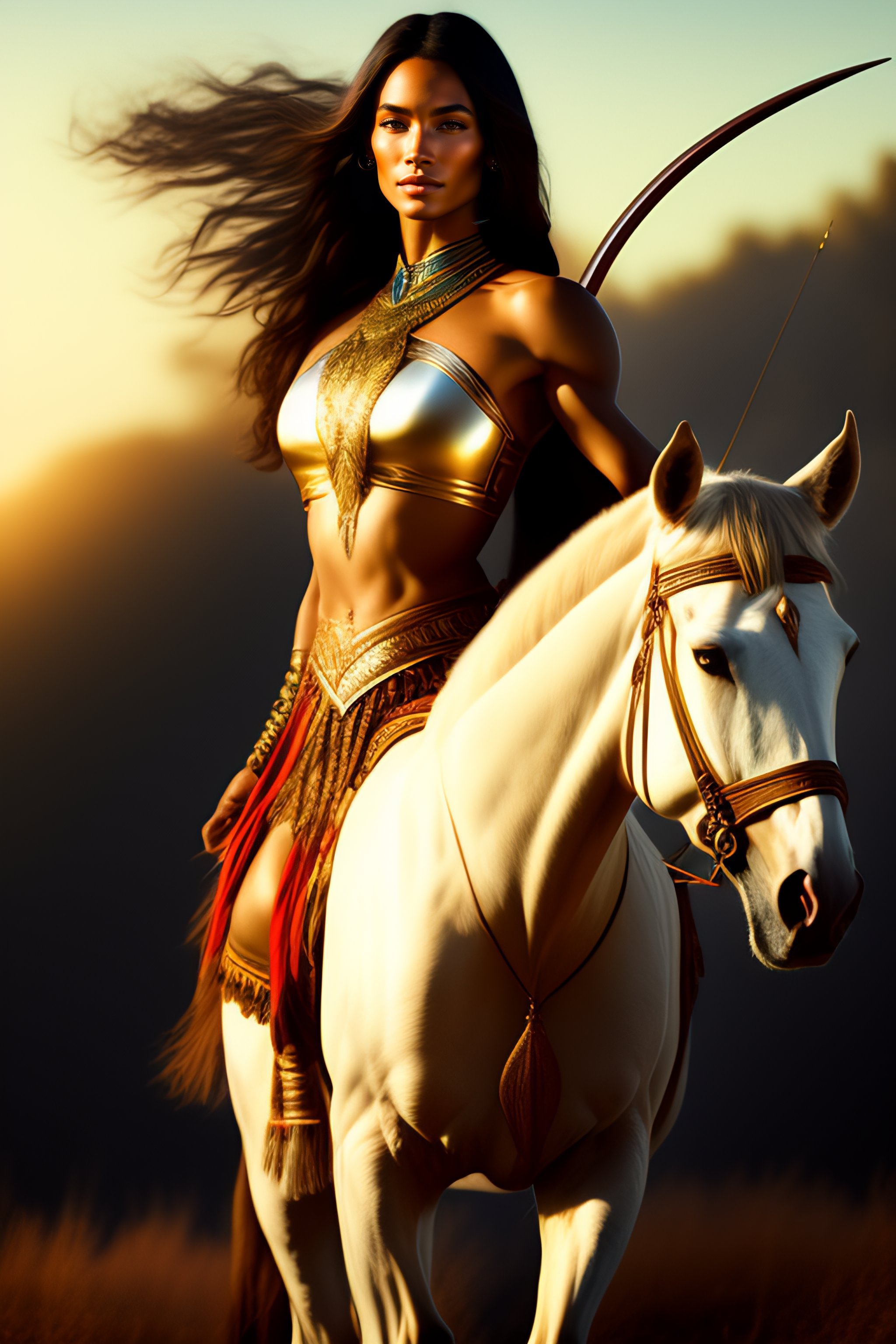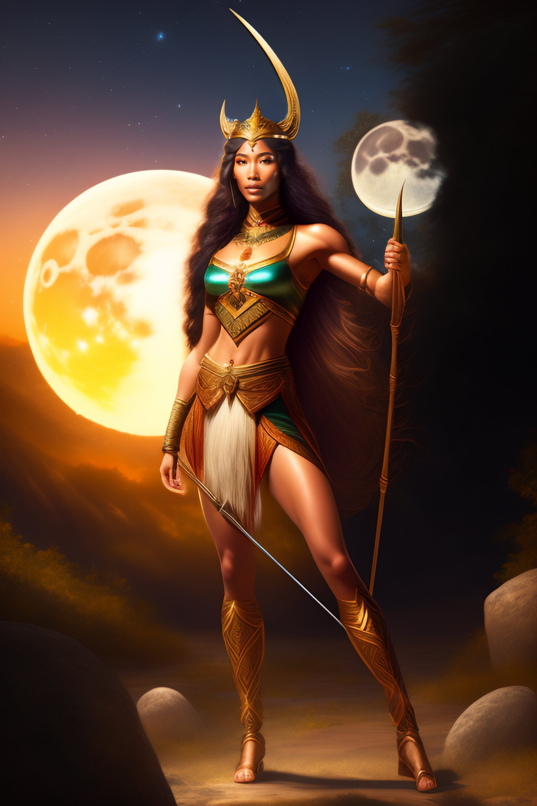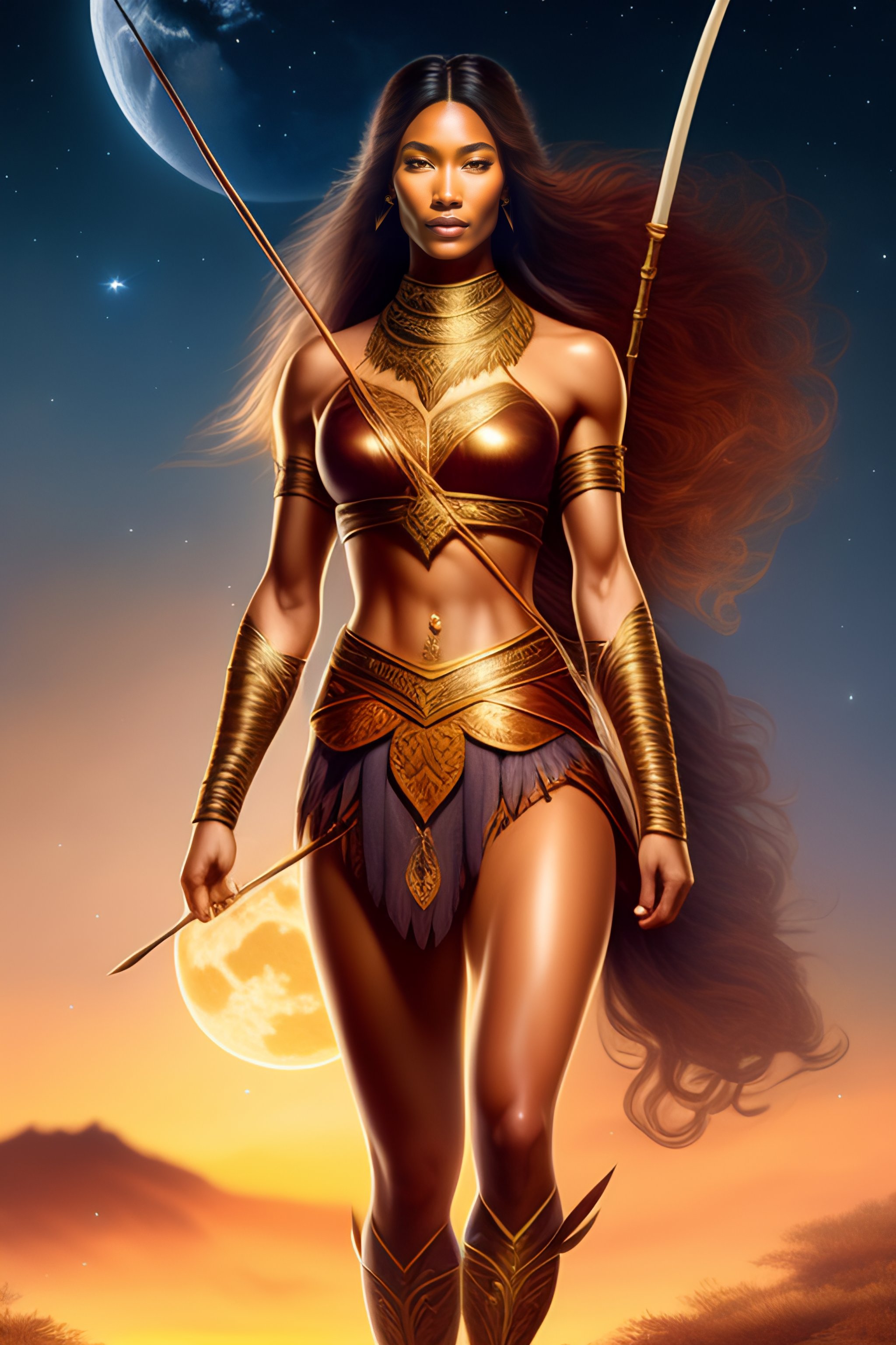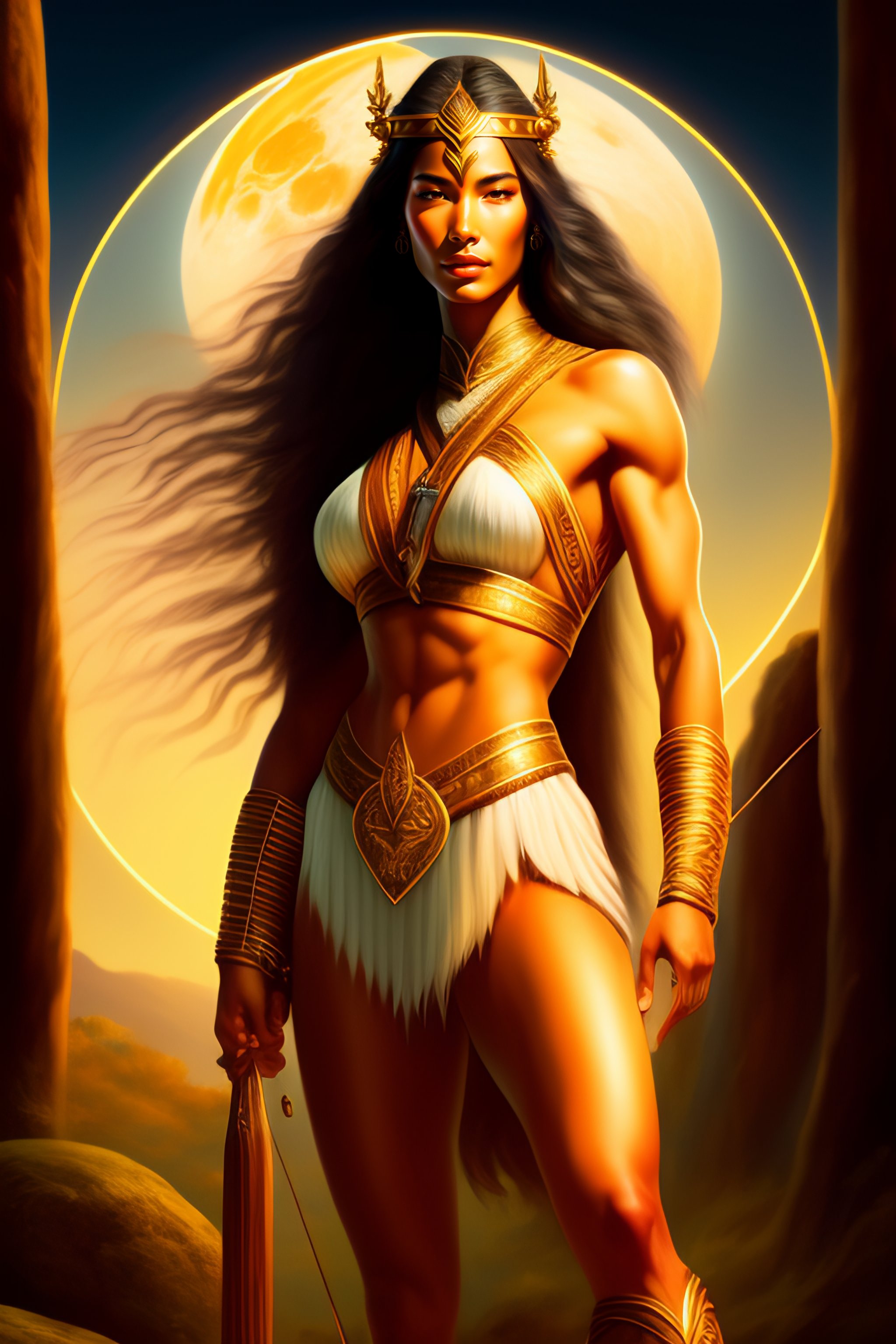 Full body potrait of thin muscular artemis goddess of the hunt, the moon, and the wilderness being tall, slender, and beautiful, with long, youthful and athletic figure, strong and agile, long flowing hair and a youthful appearance, wearing a short tunic and carrying bow and arrow, huntress, crescent moon above her head, symbolizing her association with the moon, tanned or sun-kissed complexion