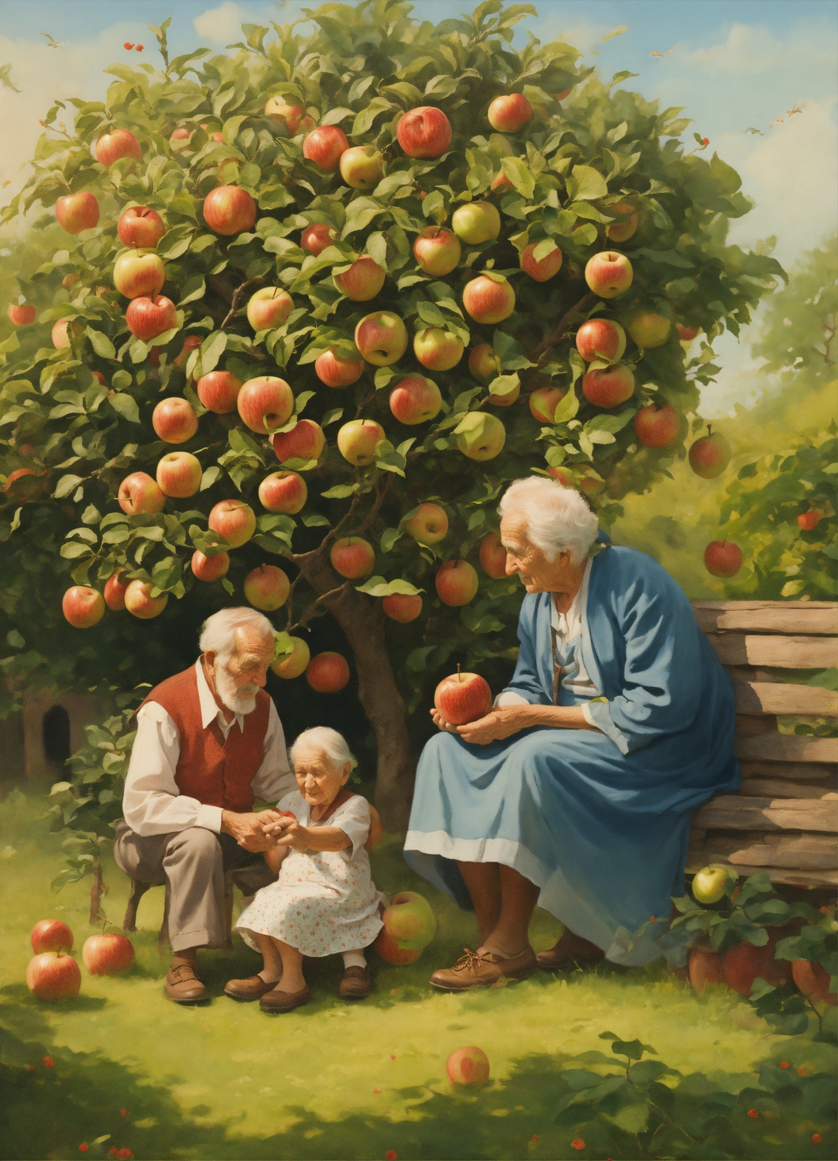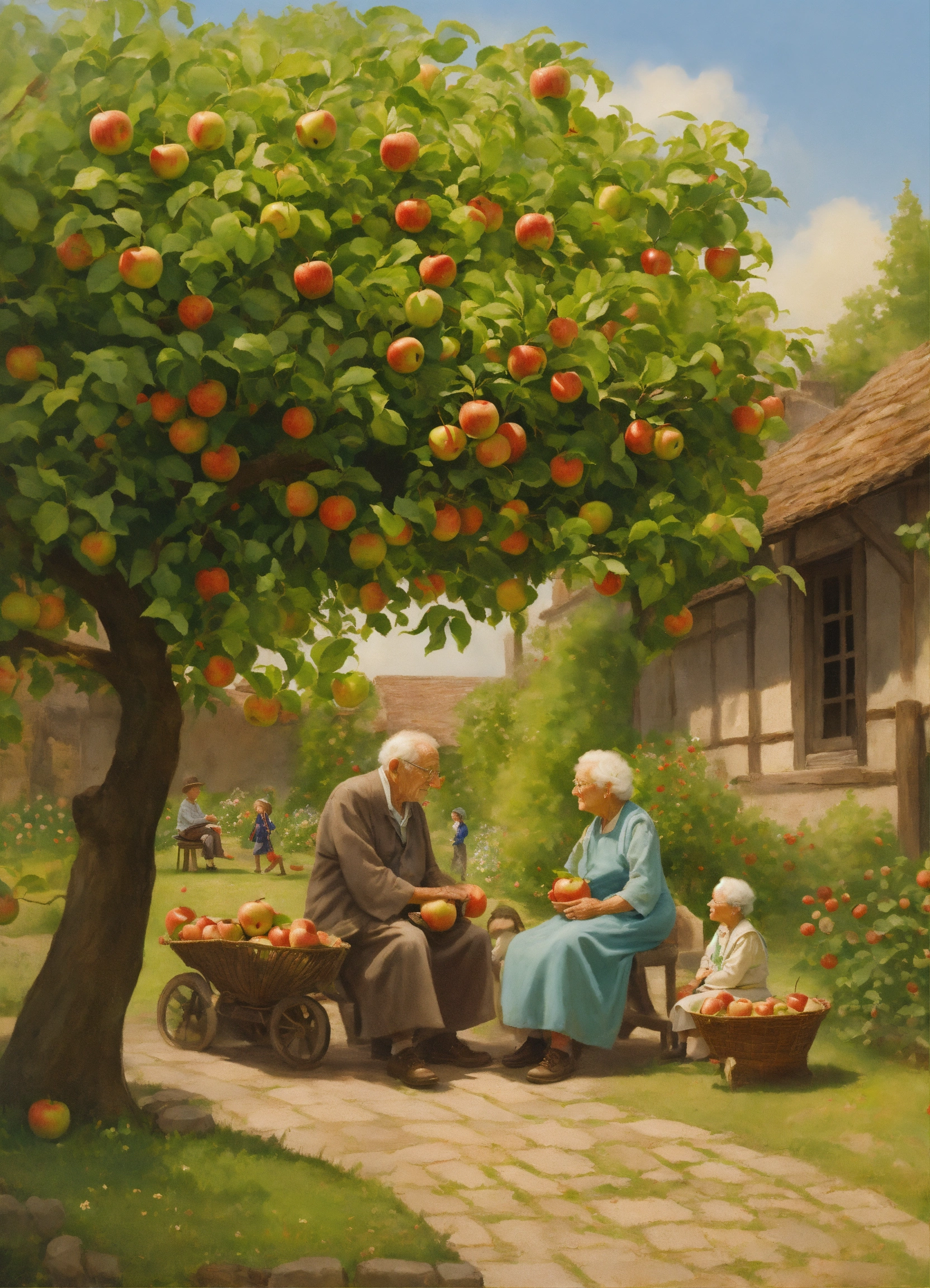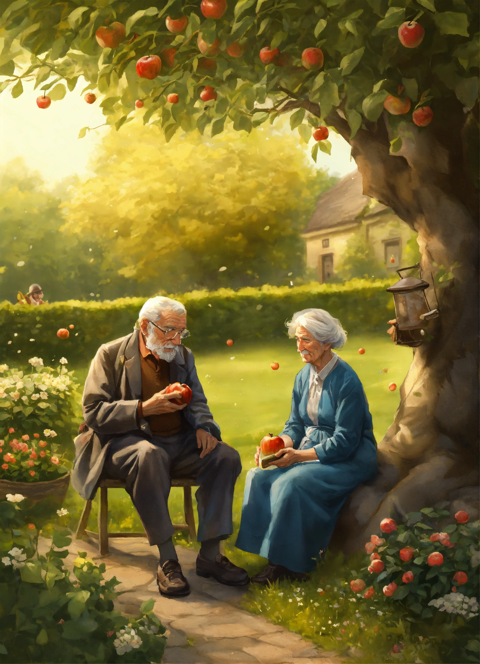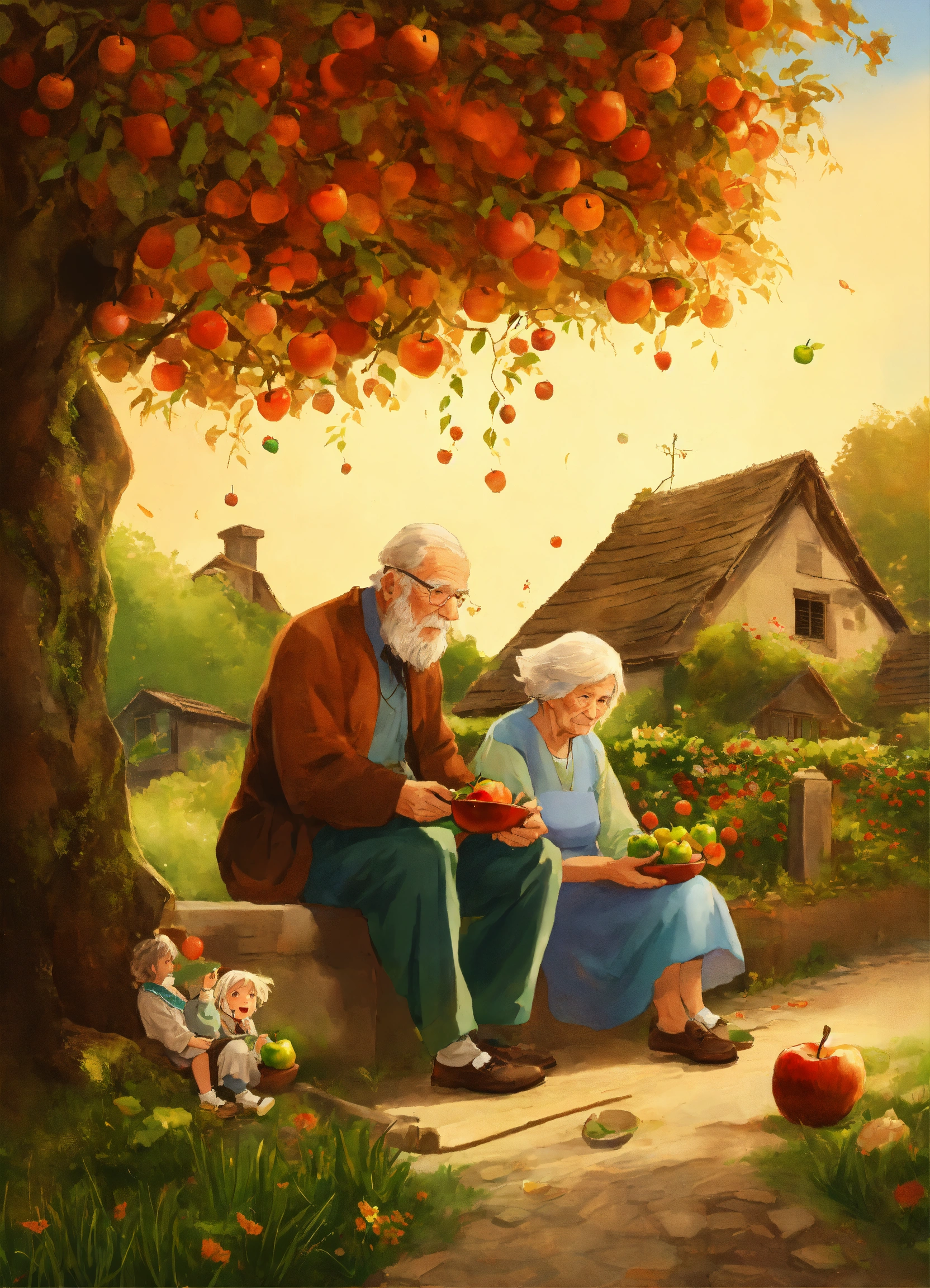An old man and an old woman sitting in a garden many children running around them background a blowing apple tree