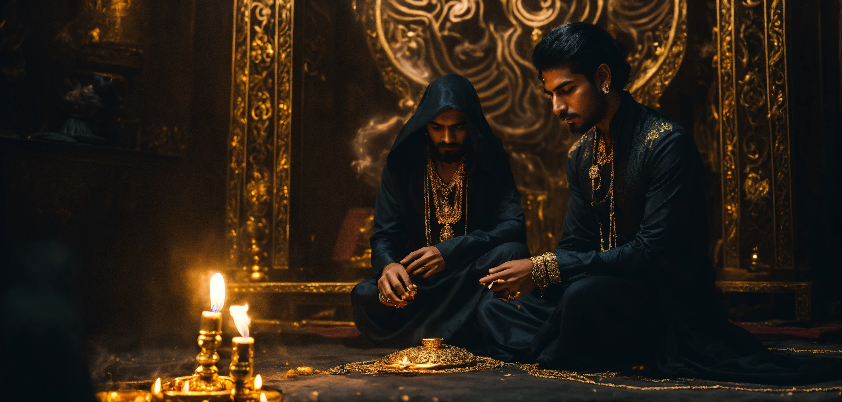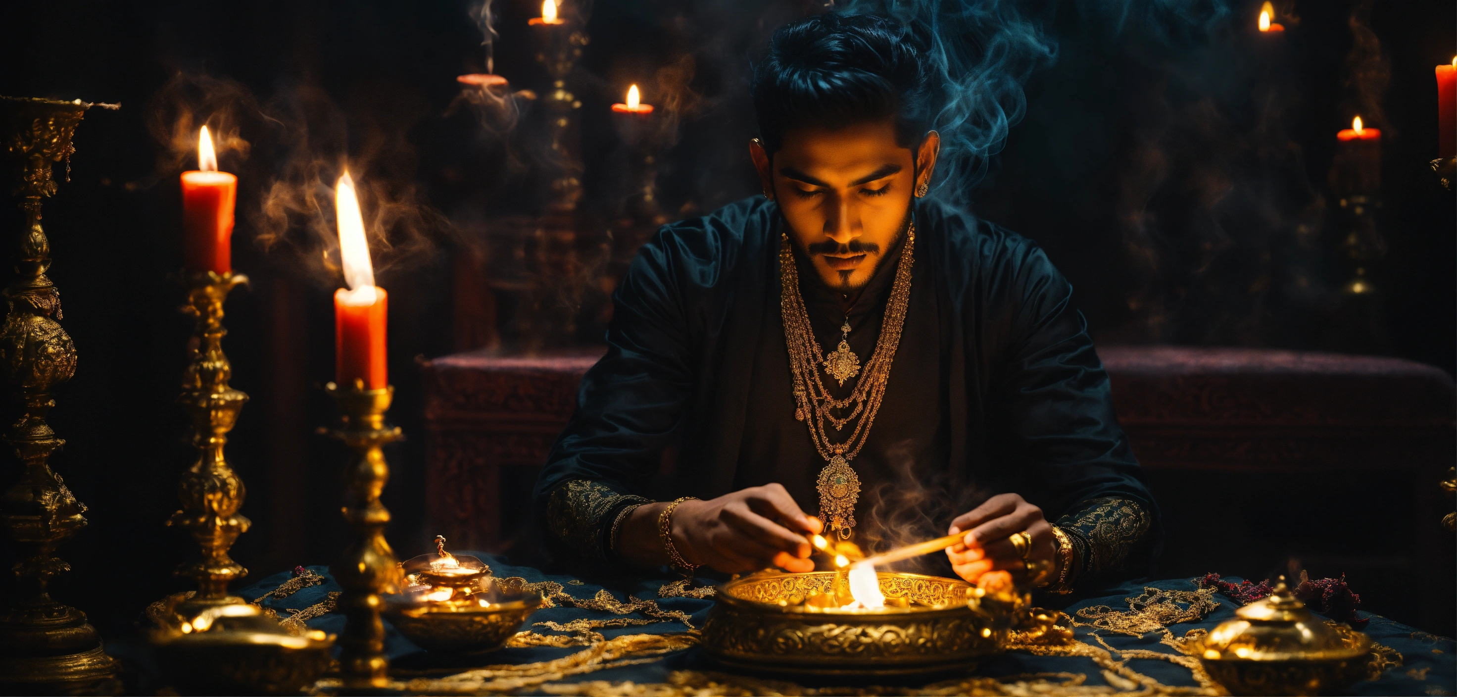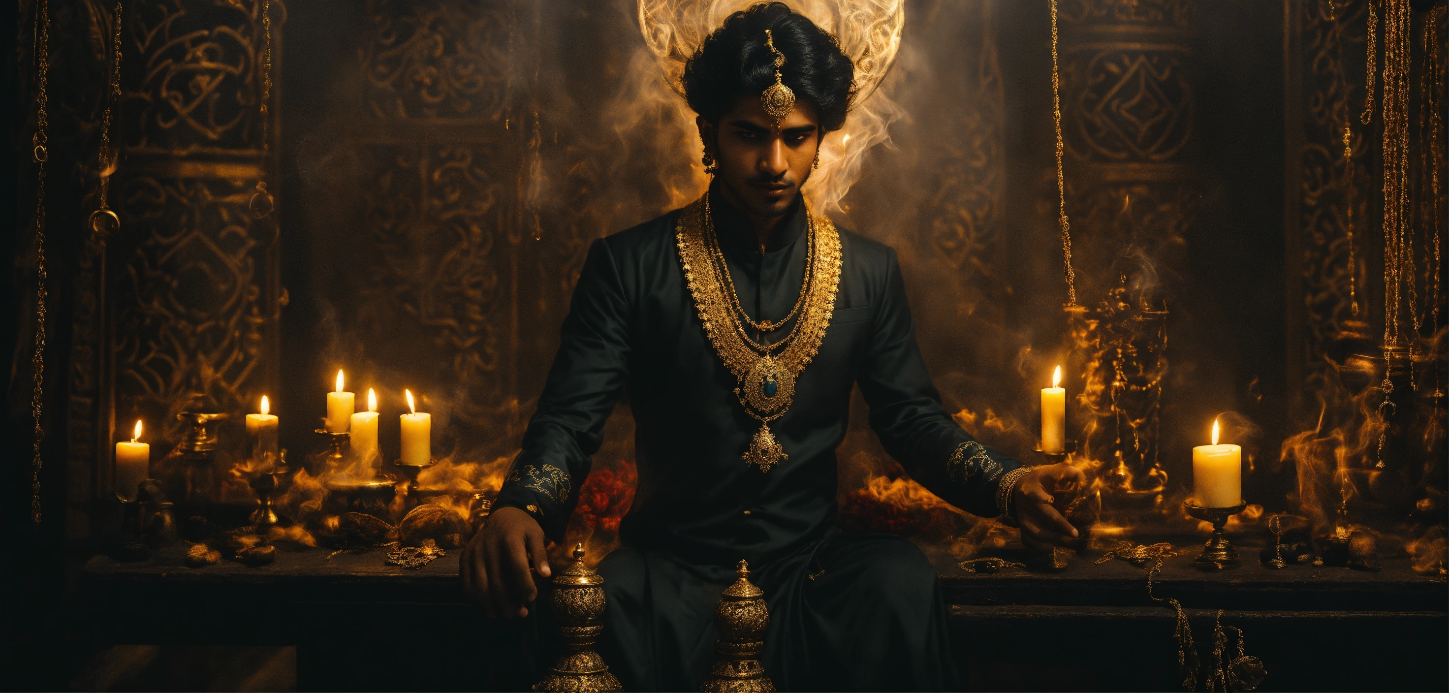 Dark, mysterious and dramatic picture of a young handsome south asian diabolical sorcerer wearing dark mystical clothes and gold ornate jewellery, performing a ritual in an incense smoke filled secret occult chamber