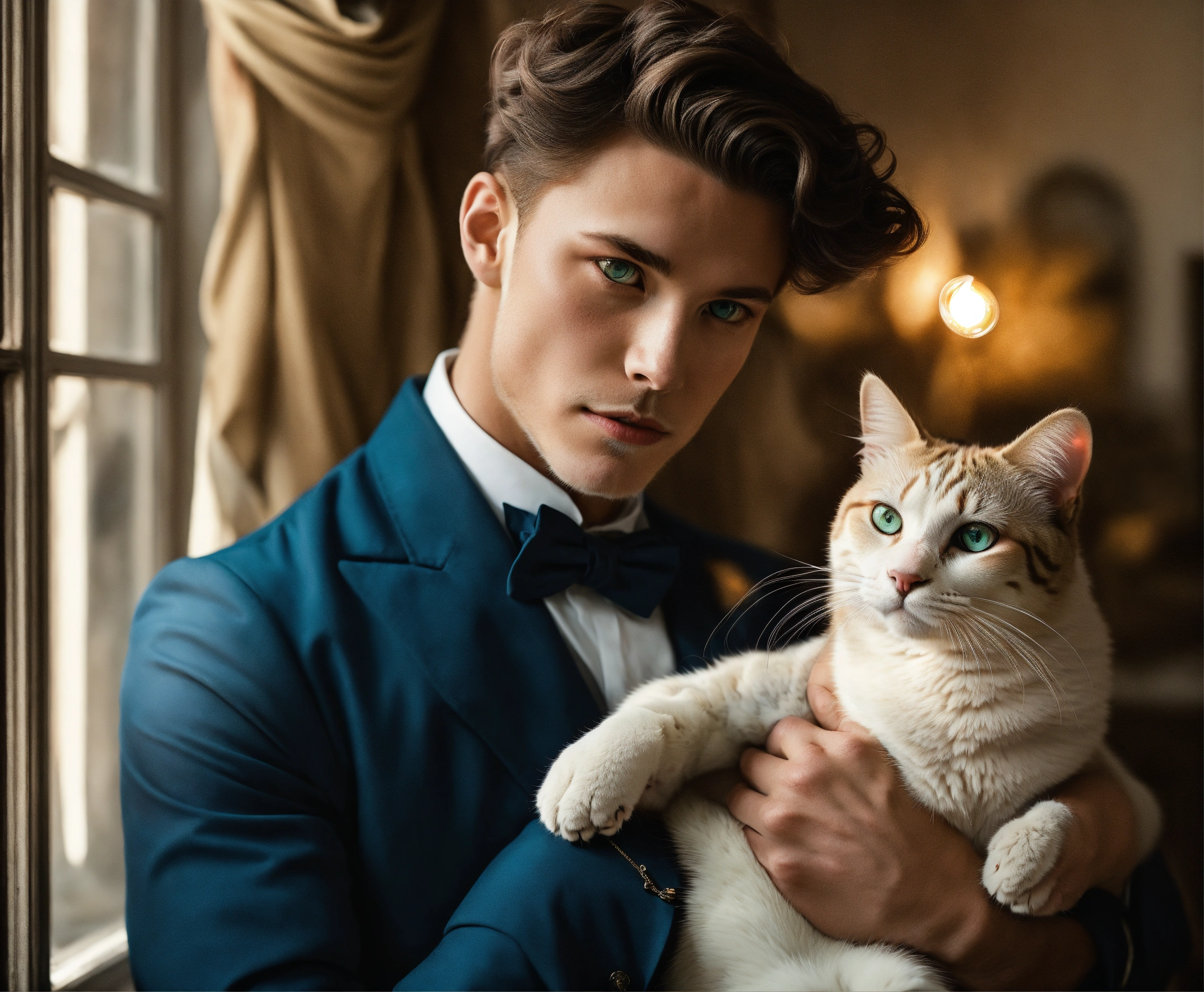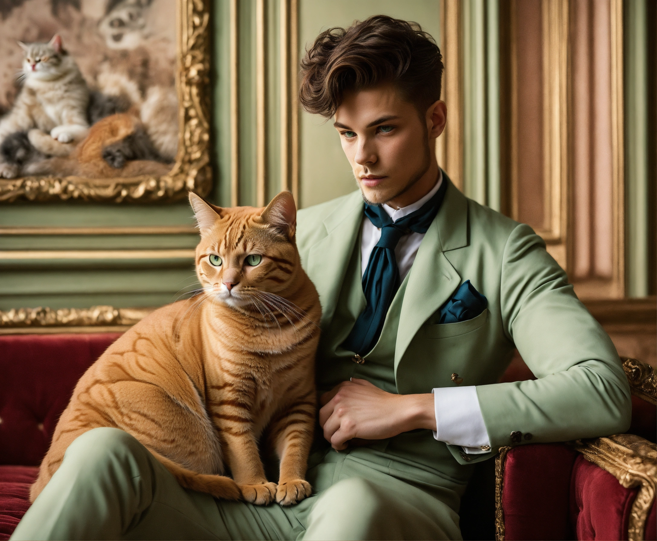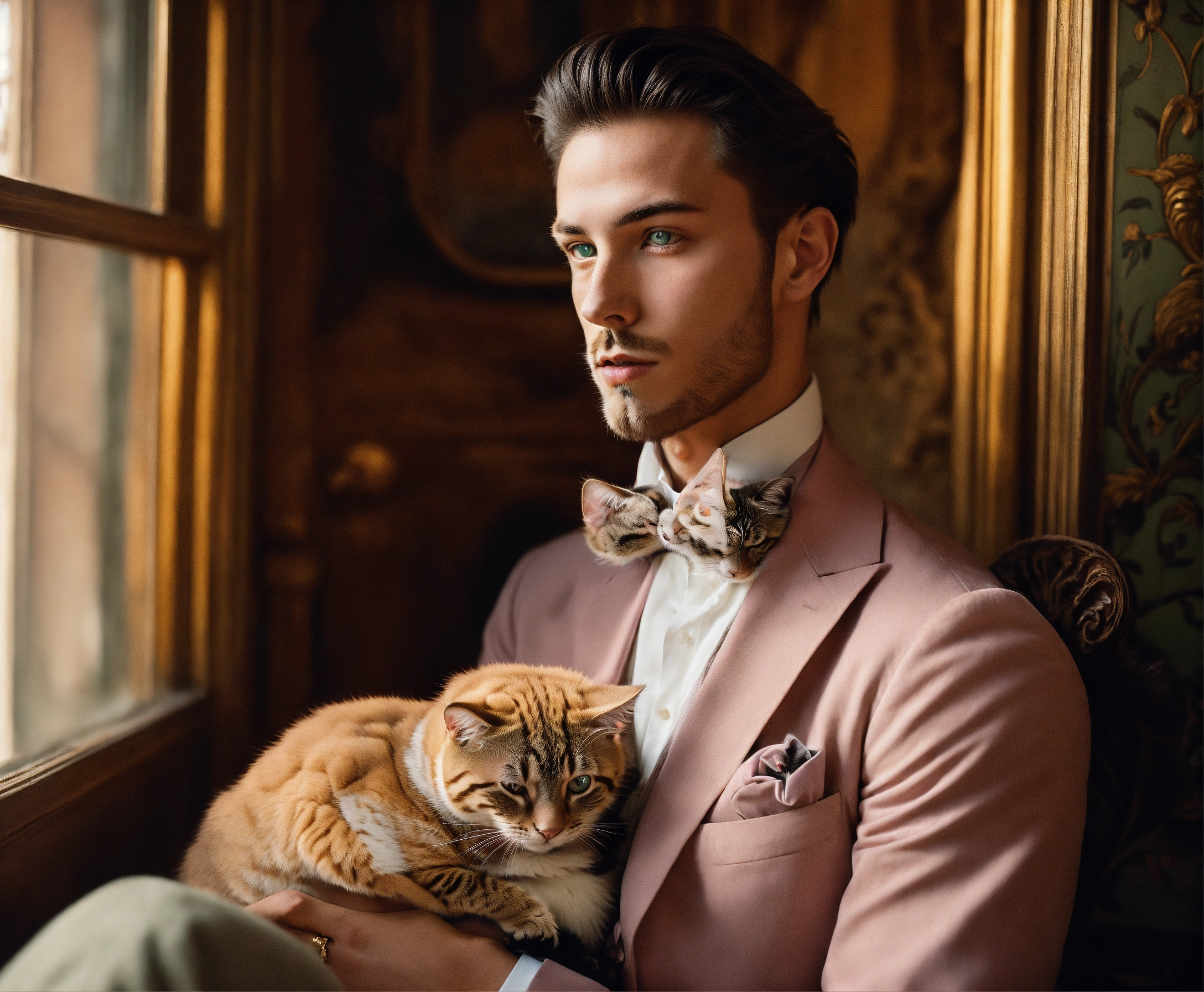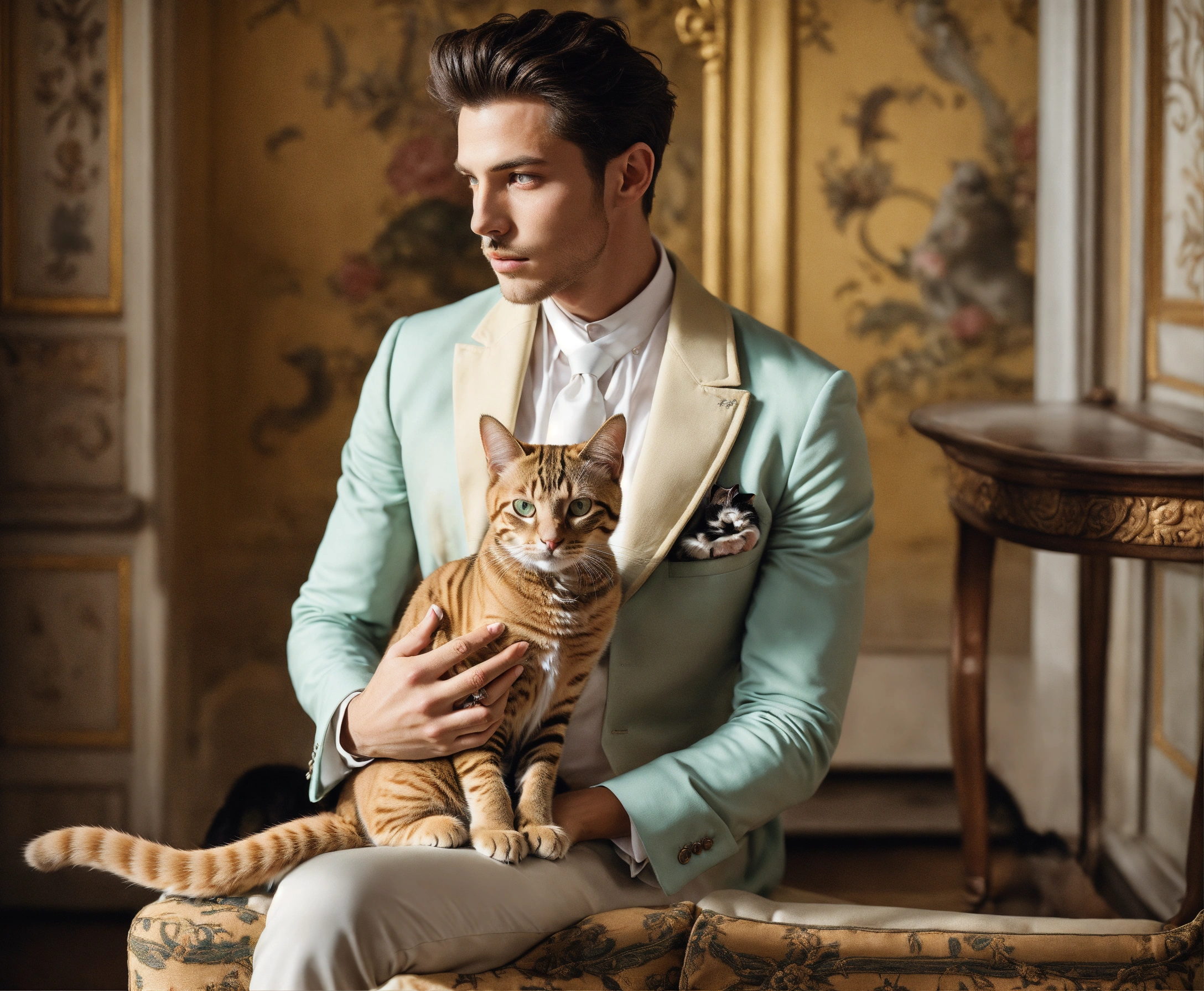 Handsome man with a cat, light eyes, belle époque interior, editorial fashion, pastel colors, perfect anatomical hands and bodies