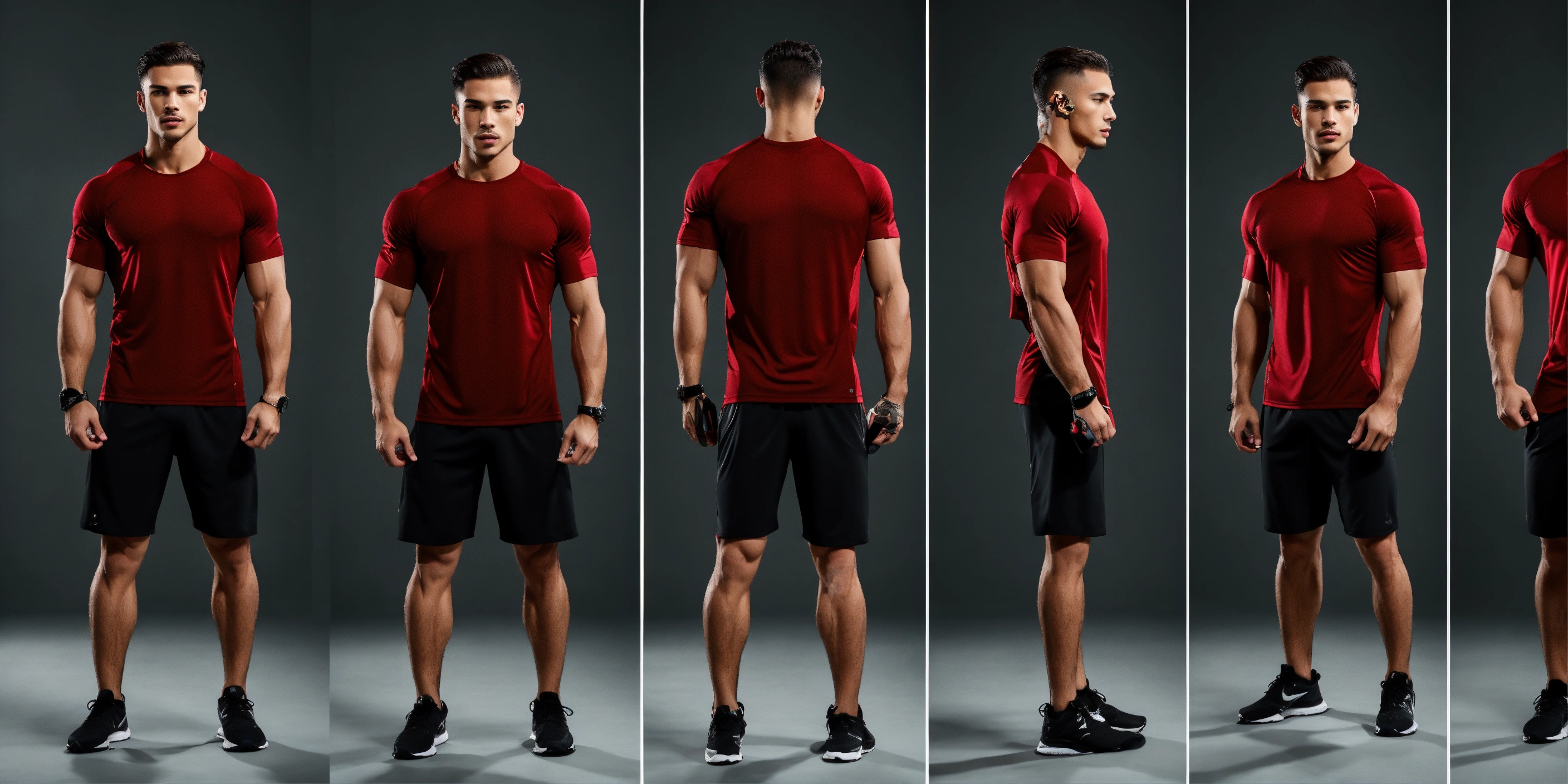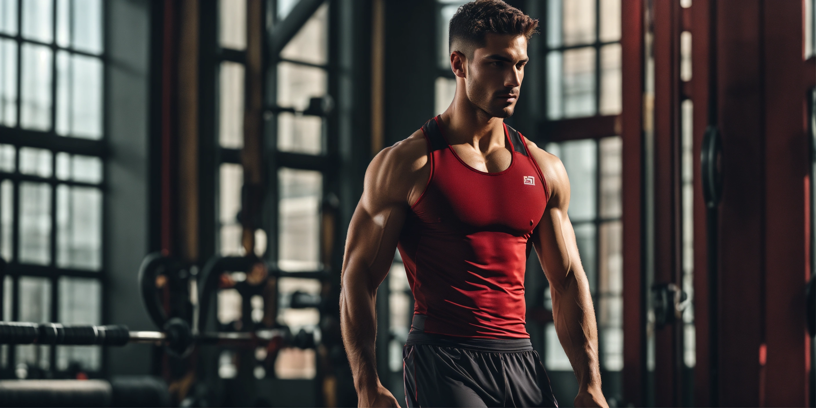 Man in athletic attire, showcasing a slim and toned body. he should exude a sense of athleticism and health with a balanced physique, suitable for a versatile fitness lifestyle, exquisitely attired for a workout, set against a minimalistic backdrop infused with warm tones that harmonize beautifully with deep, rich shades of dark red and grays.