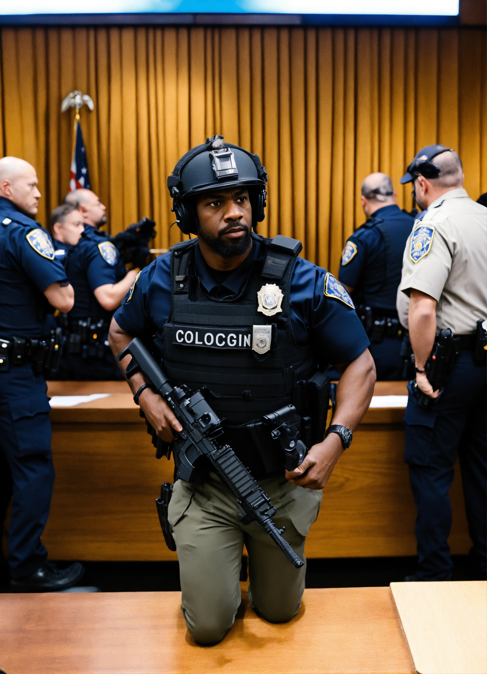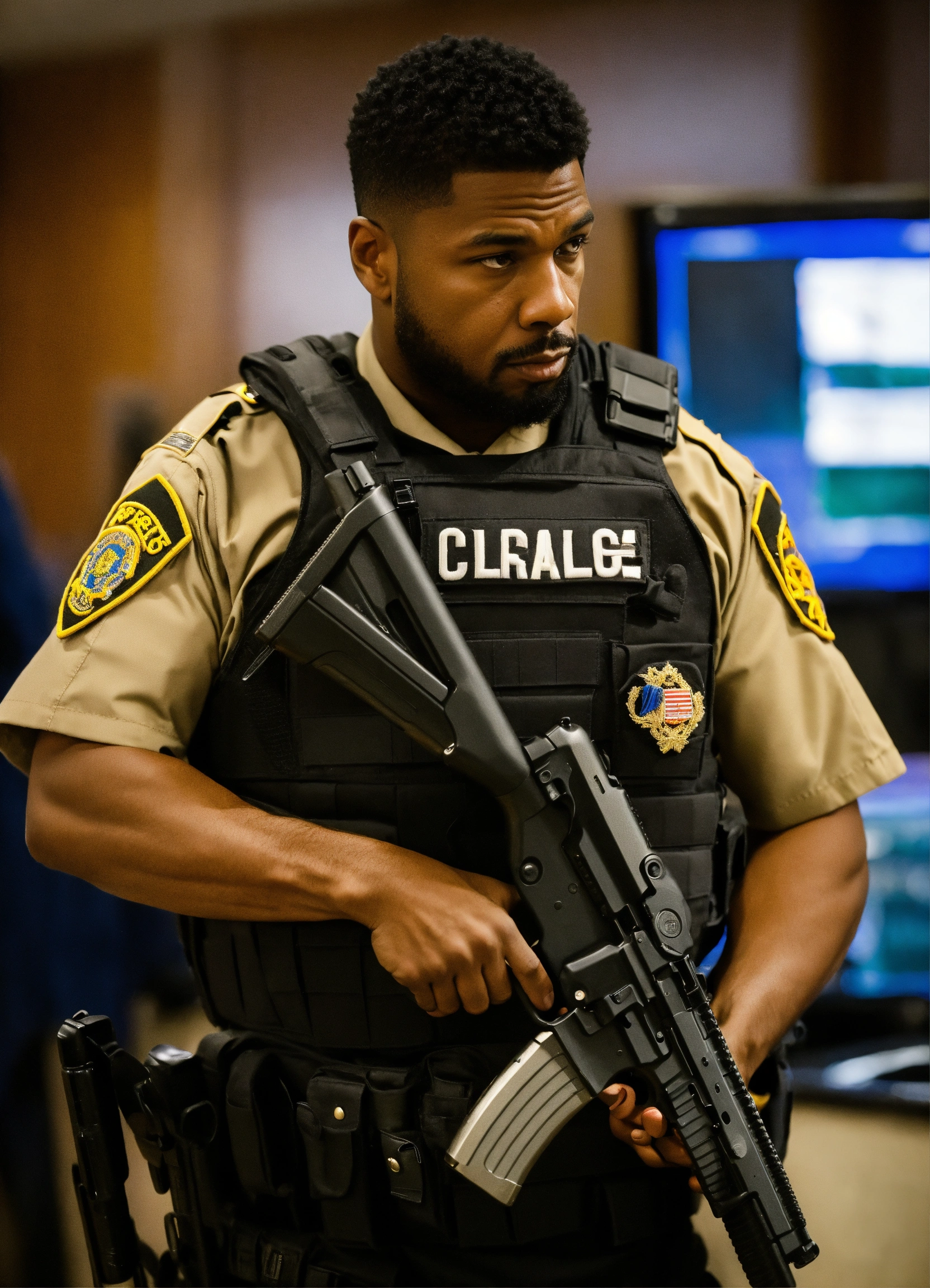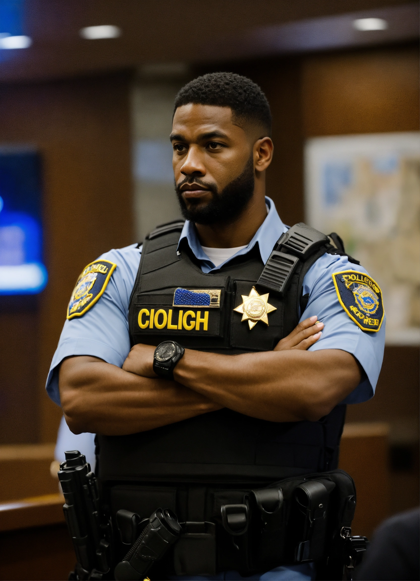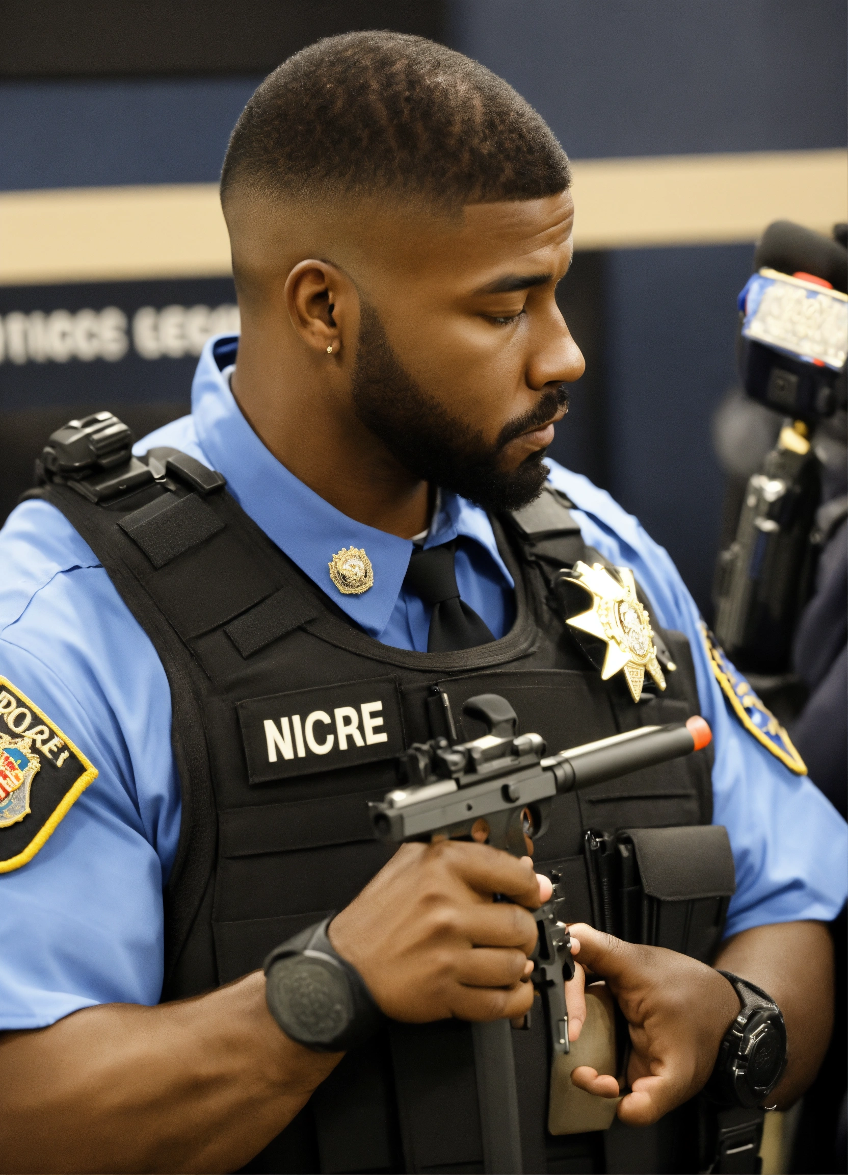 Homem negro forte e policial, de colete e distintivo, encara reporter e oferece sua pistola em coletiva em chicago