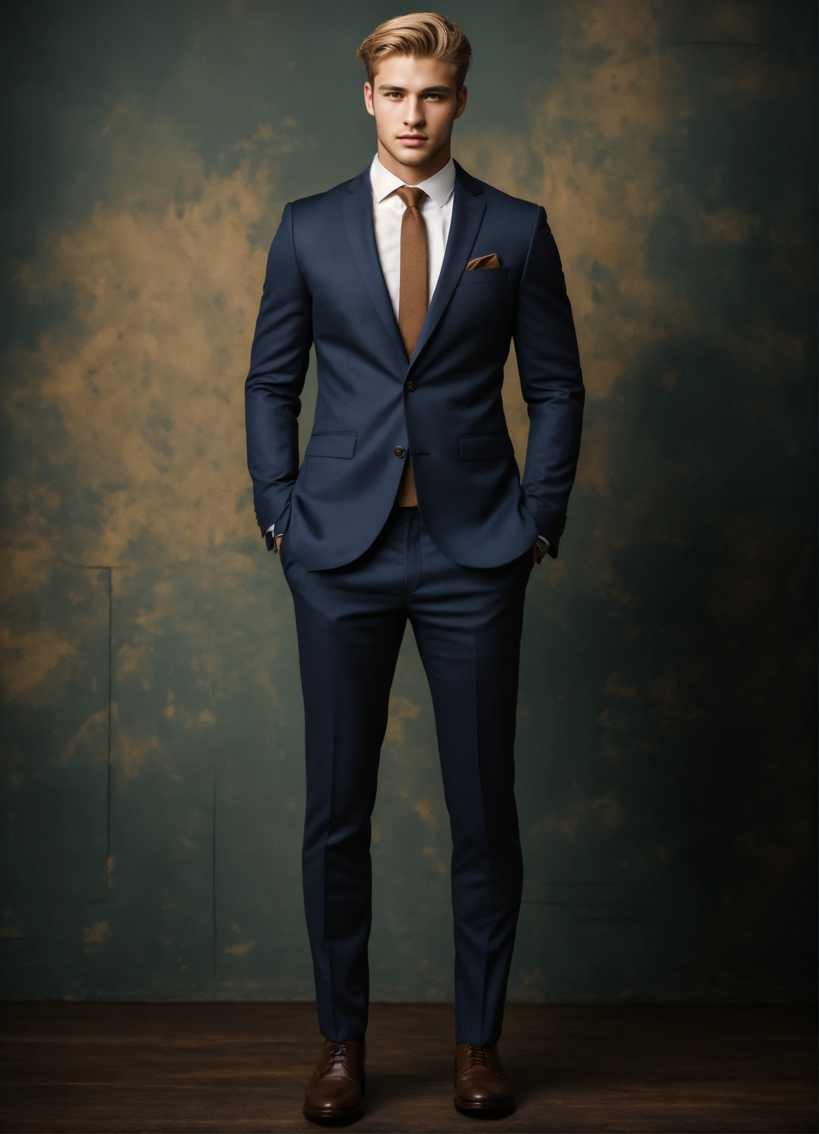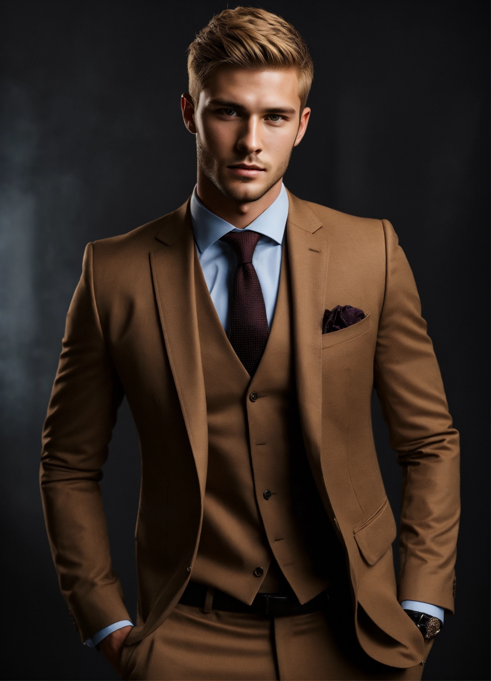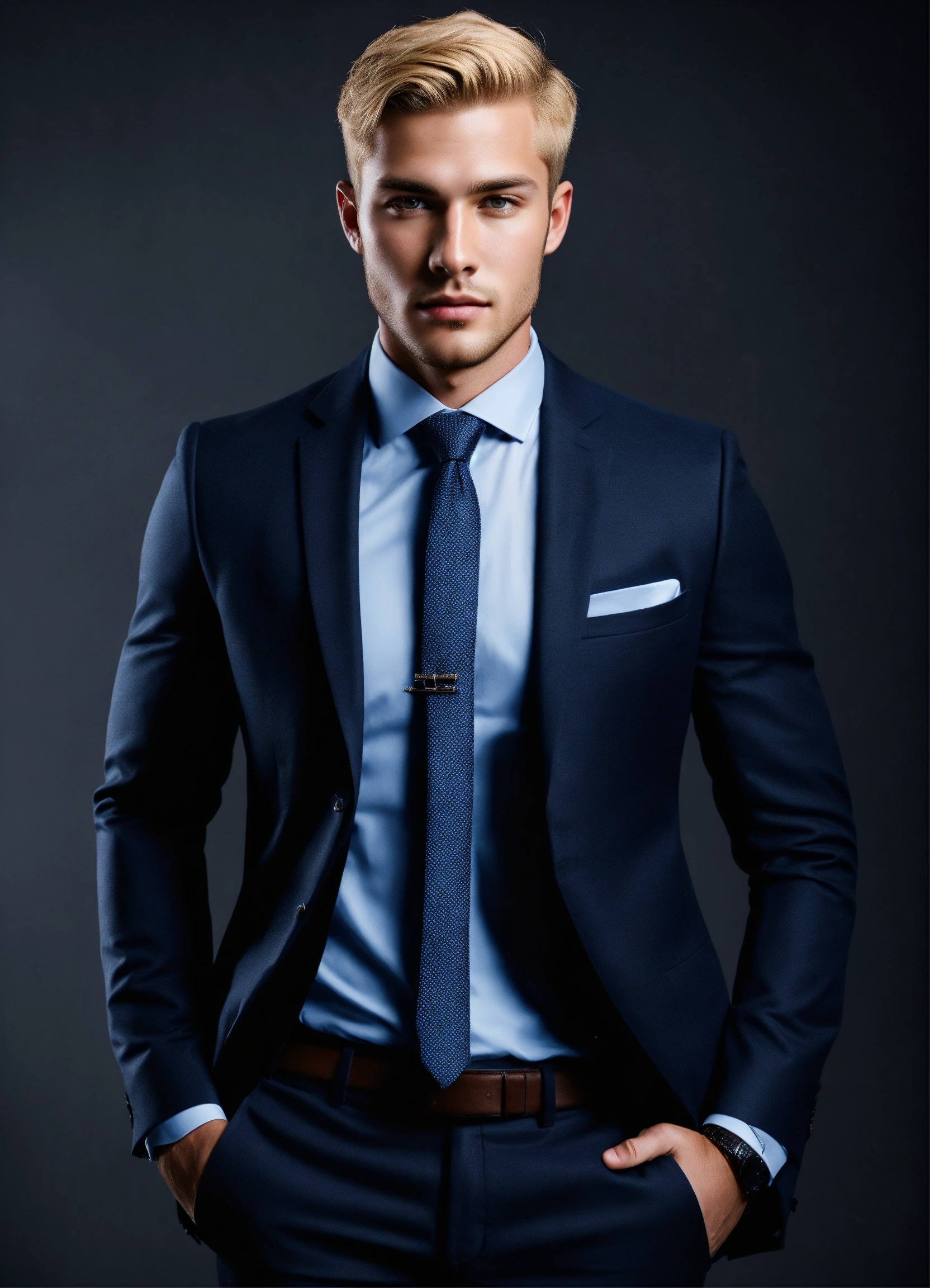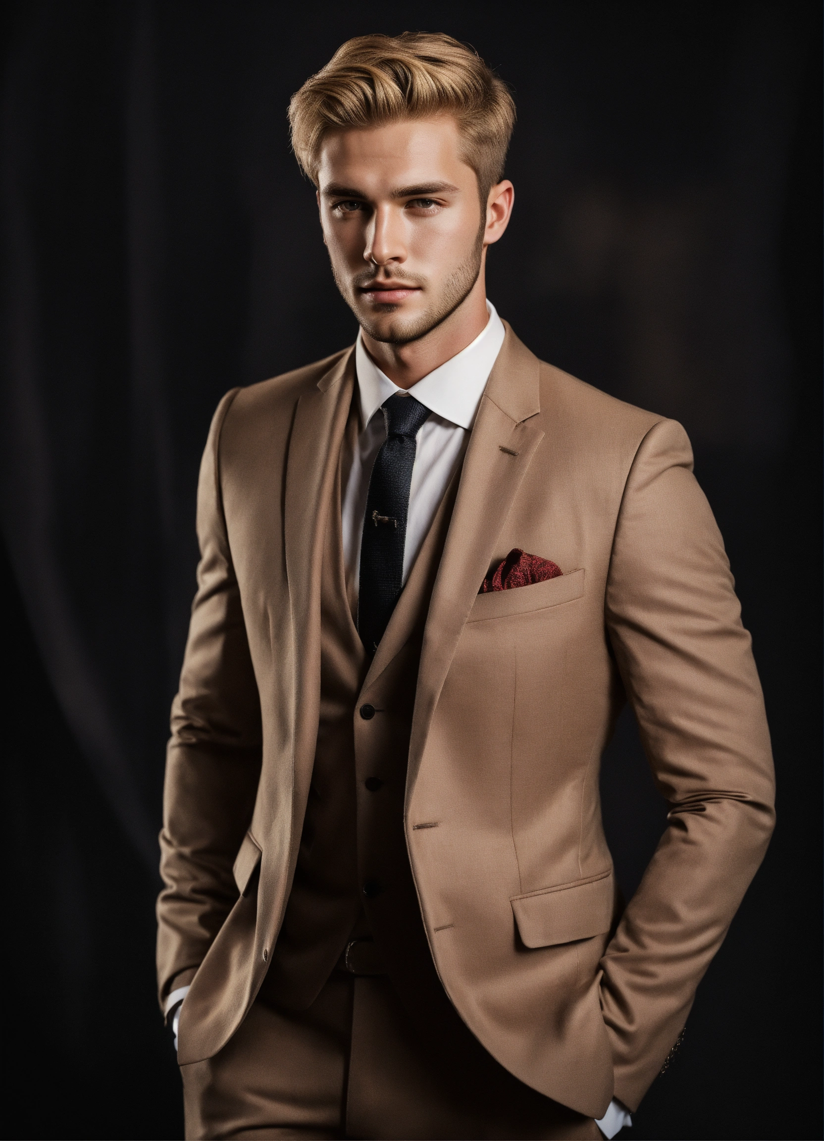 Brutal handsome young man 30 years old in a formal suit, full growth, blond with light brown eyes, dark background, photorealistic, studio lighting
