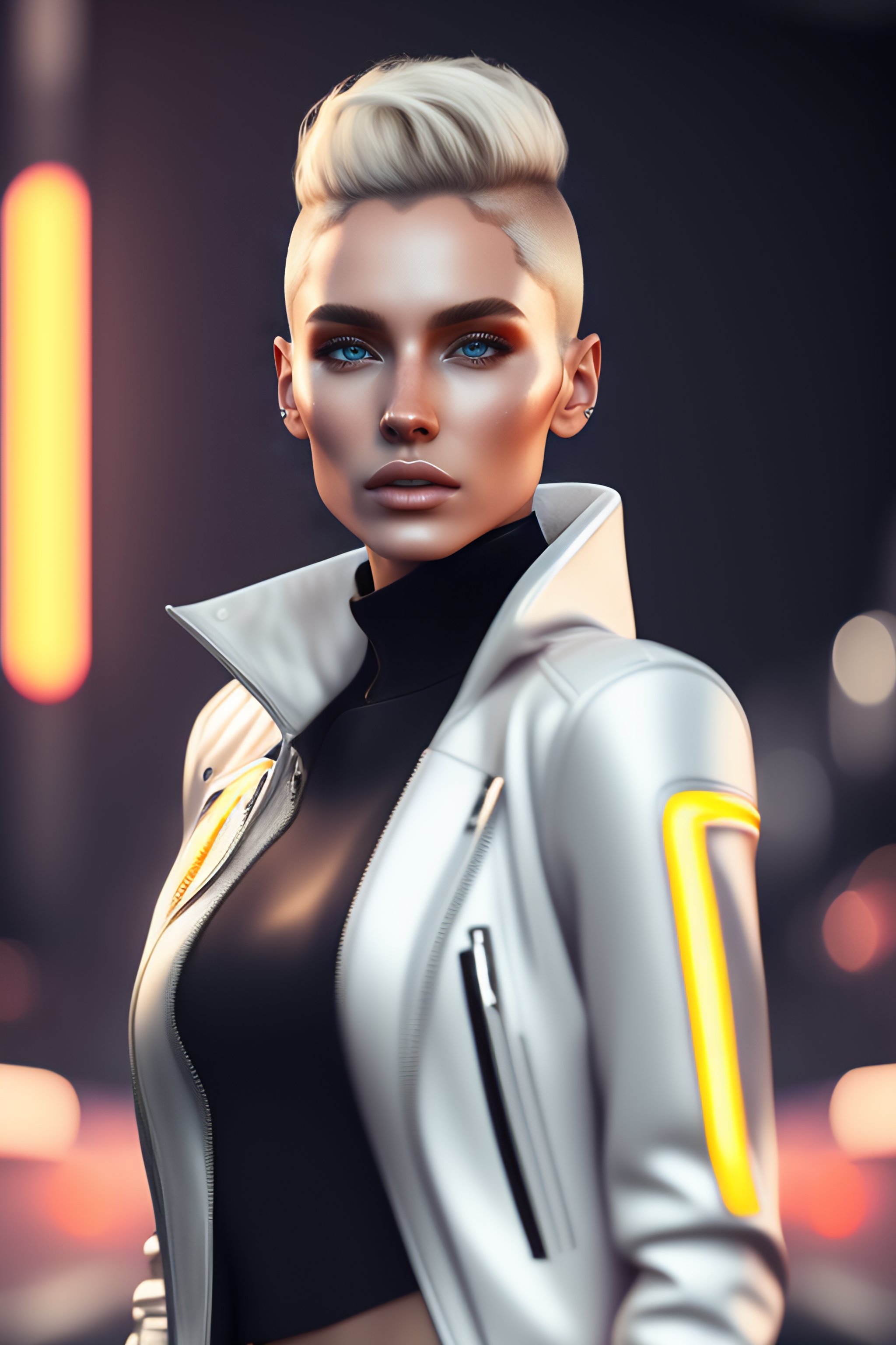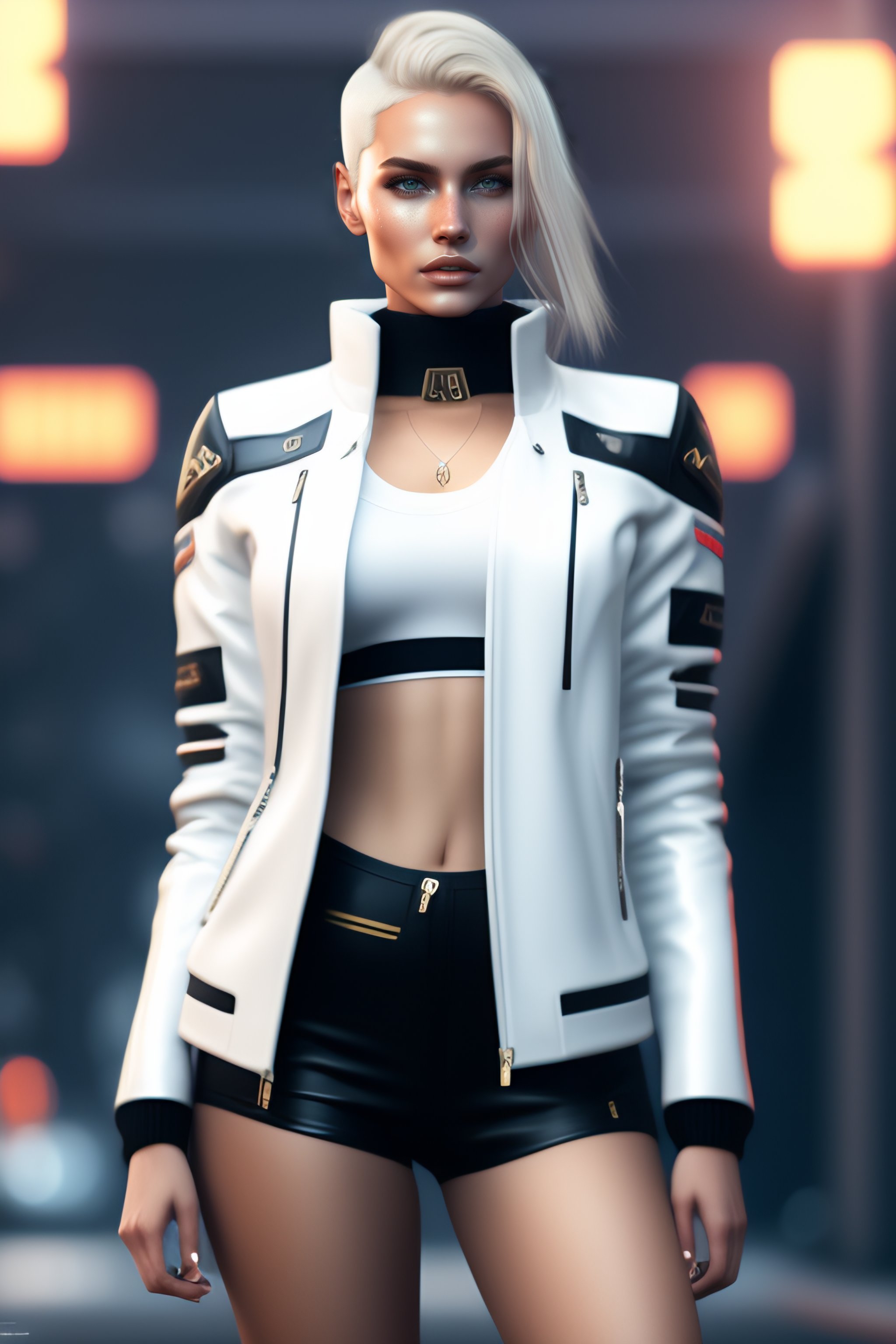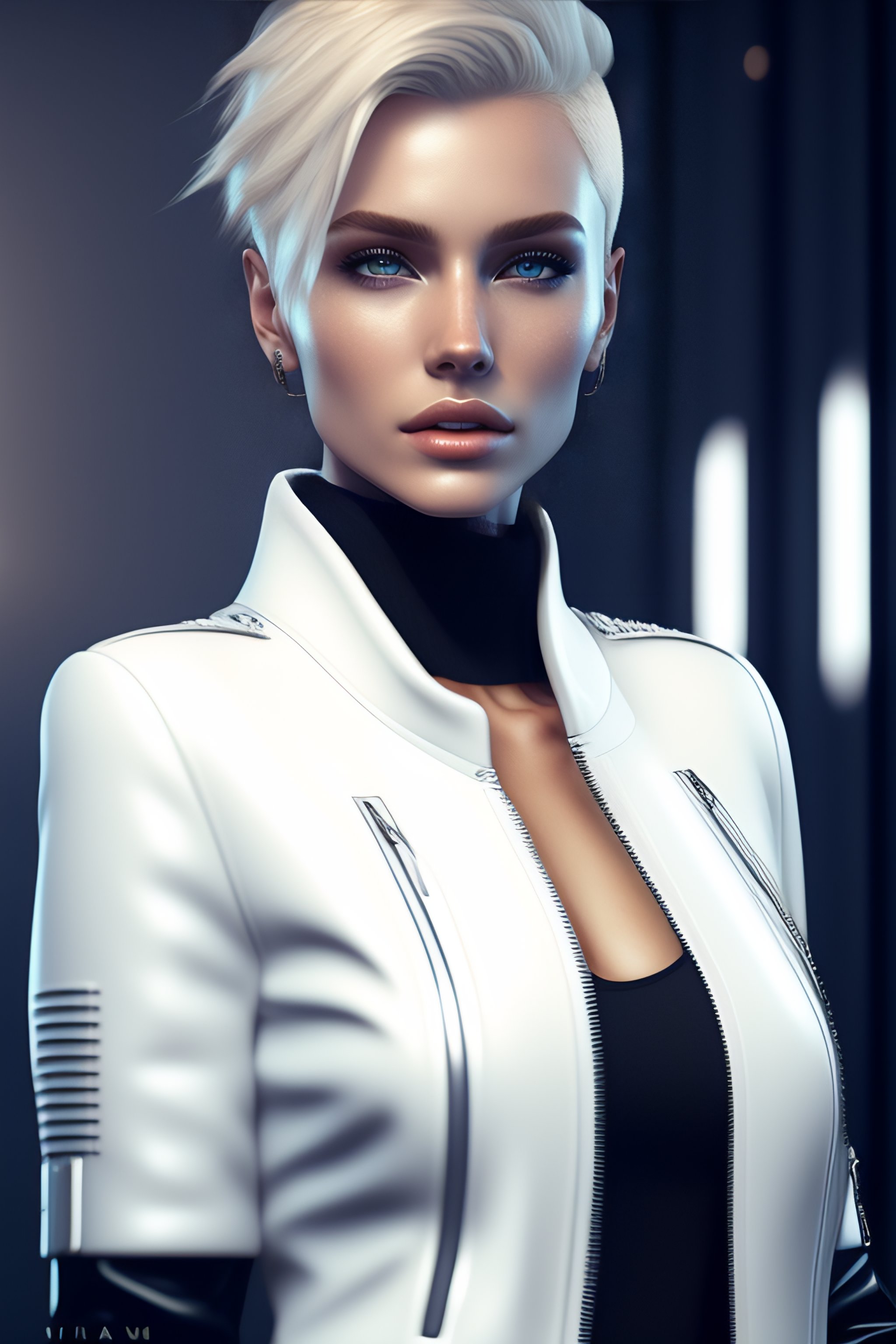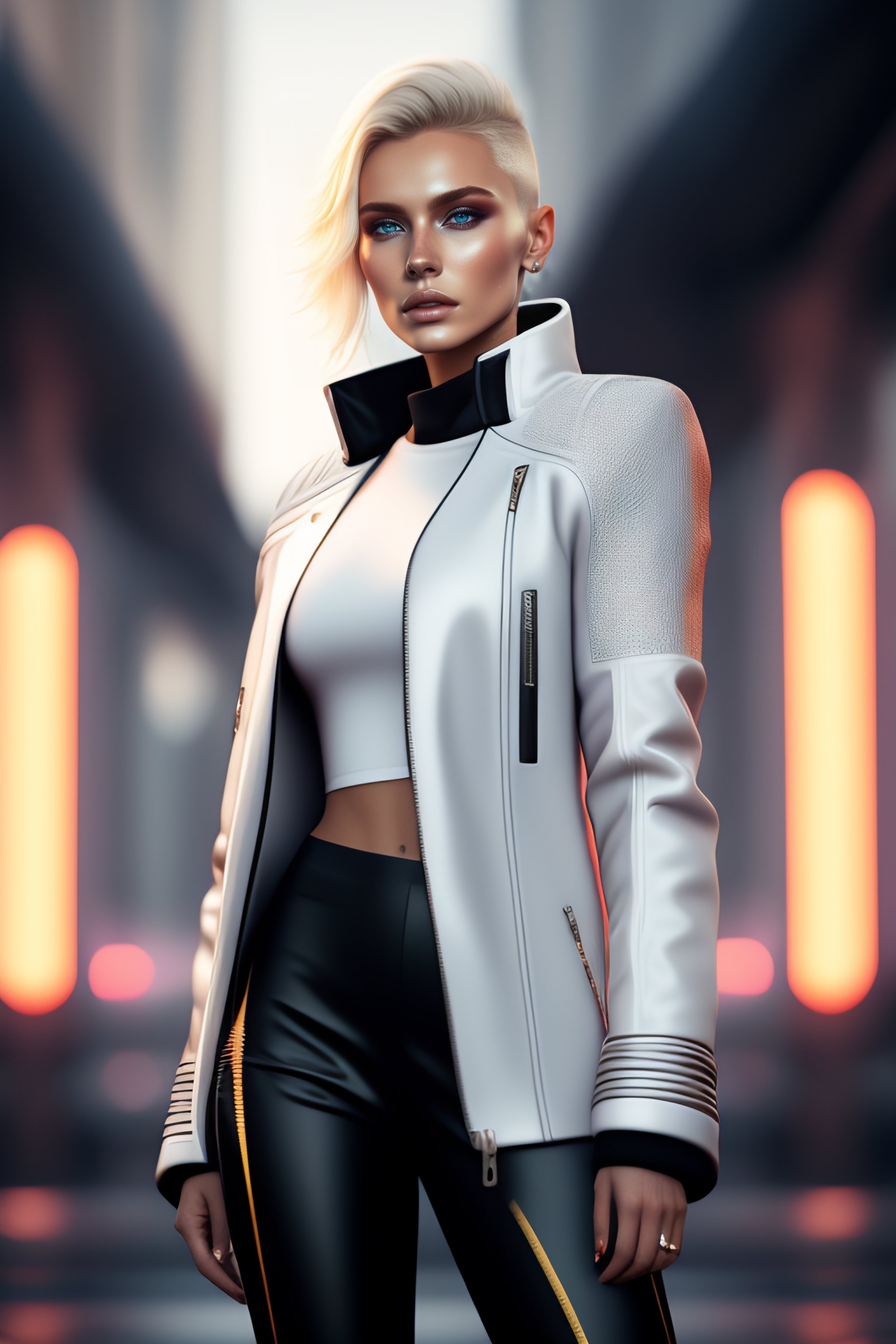 Minimal style clothes with short blonde hair russian girl, minimal white leather jacket, carbonfiber, battle status, hyper detailed, digital art, cyberpunk style, cybercinematic lighting, studio quality, smooth render, unreal engine 5 rendered, octane rendered, art style by klimt and nixeu and ian sprigger and wlop and krenz cushark