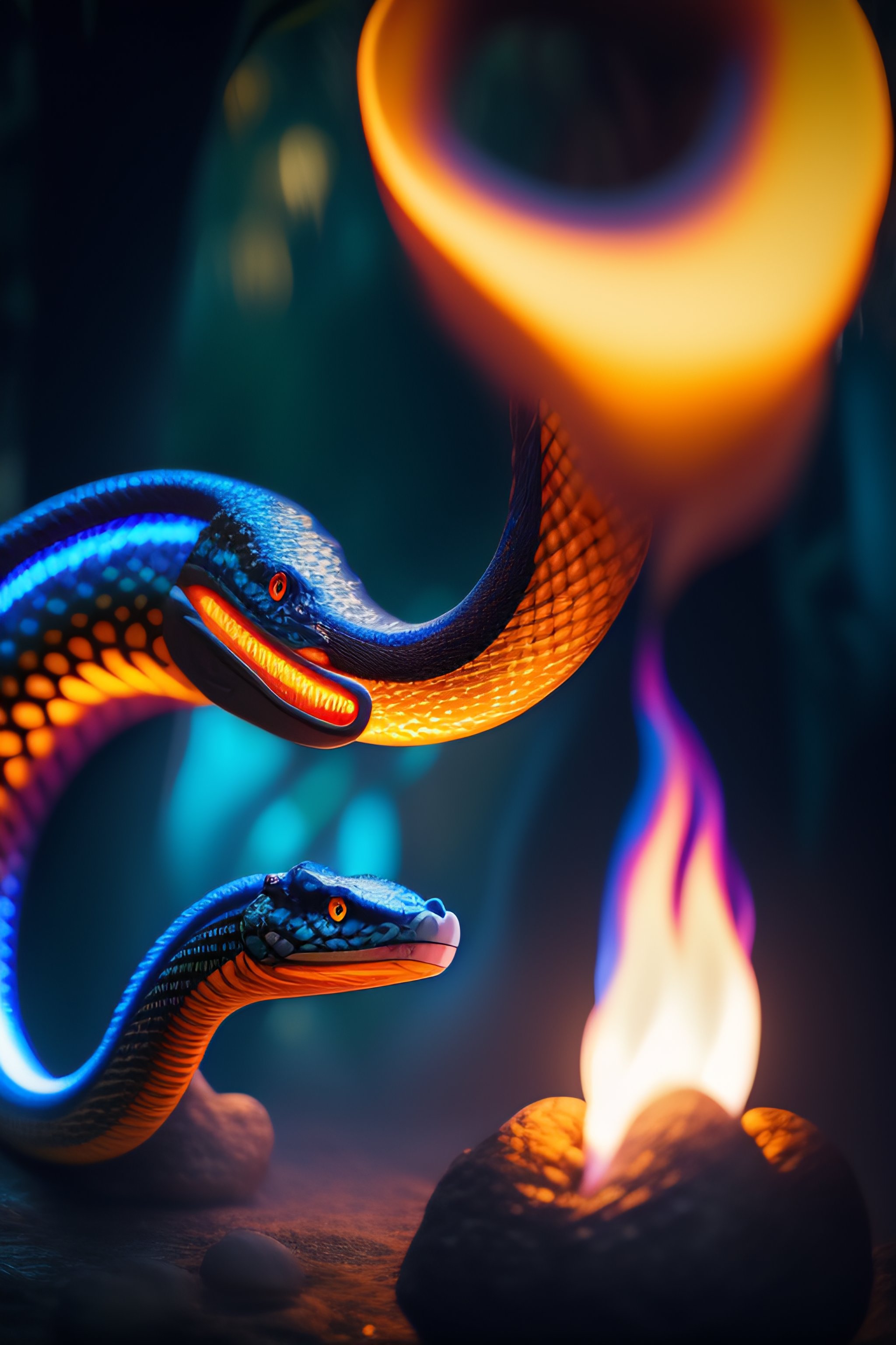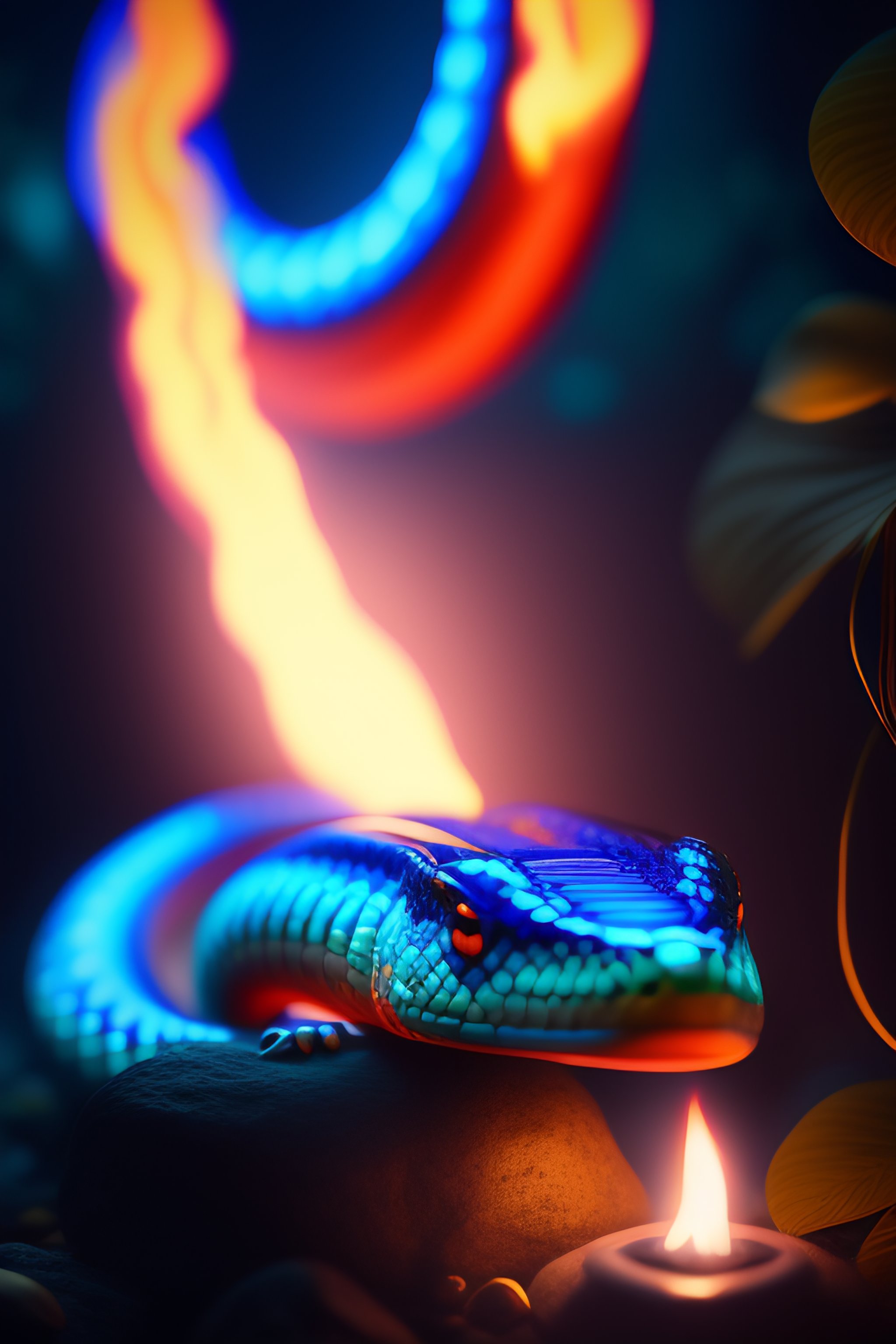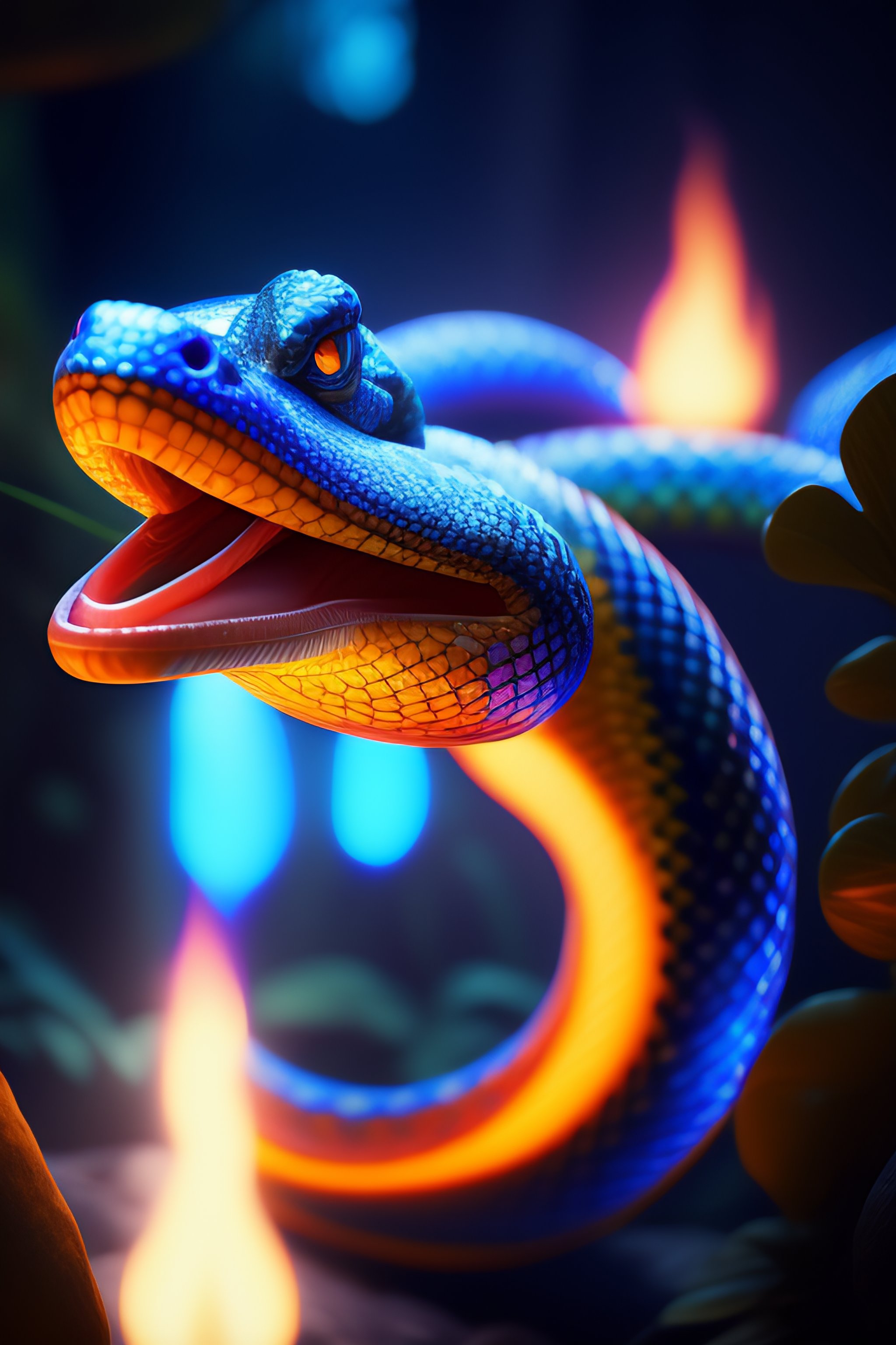 Flaming giant snake with blue flames at tropical forest by pixar, fantasy, dreamlike, unreal engine, cozy indoor lighting, artstation, detailed, digital painting, cinematic, character design by mark ryden and pixar and hayao miyazaki, unreal 5, daz, hyperrealistic, octane render
