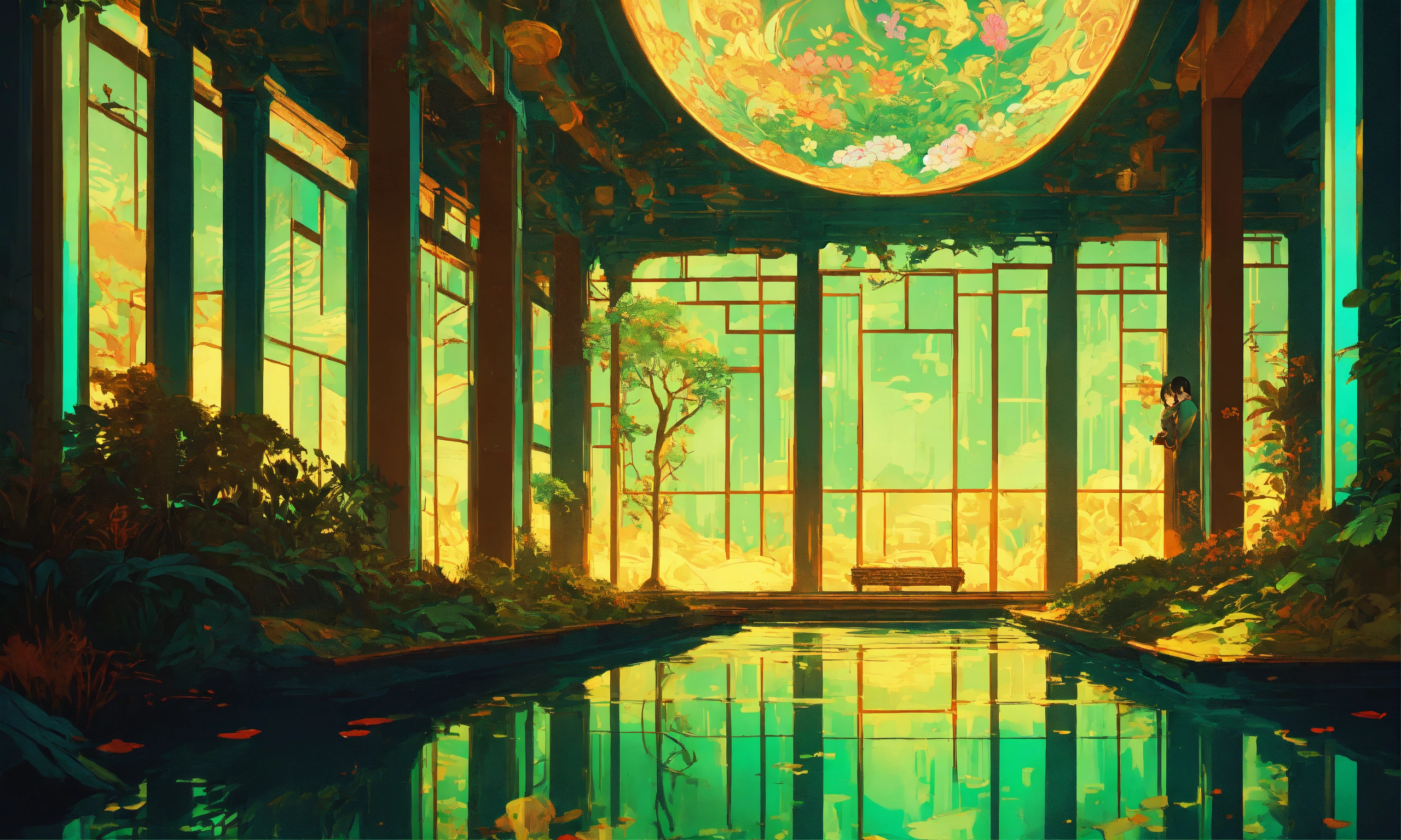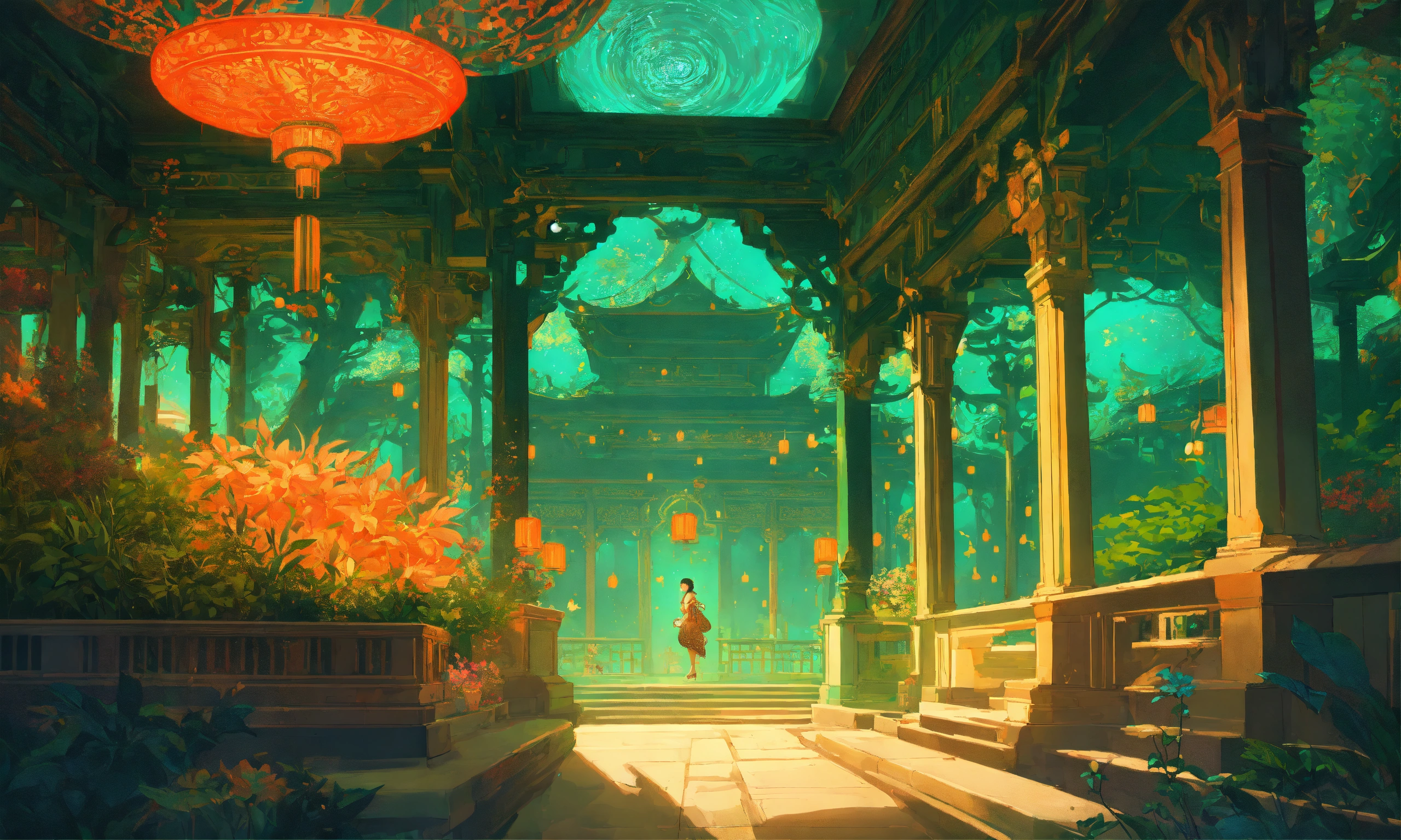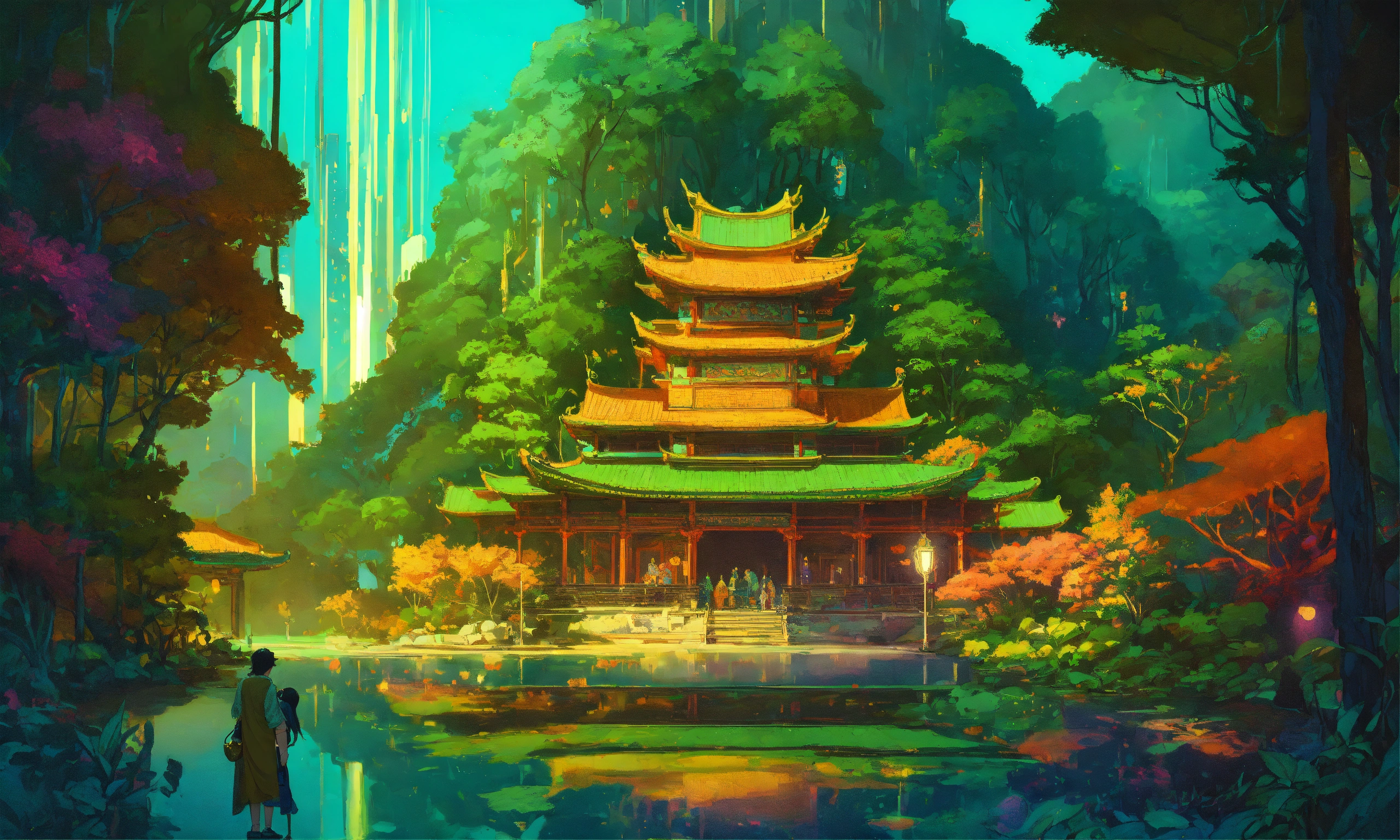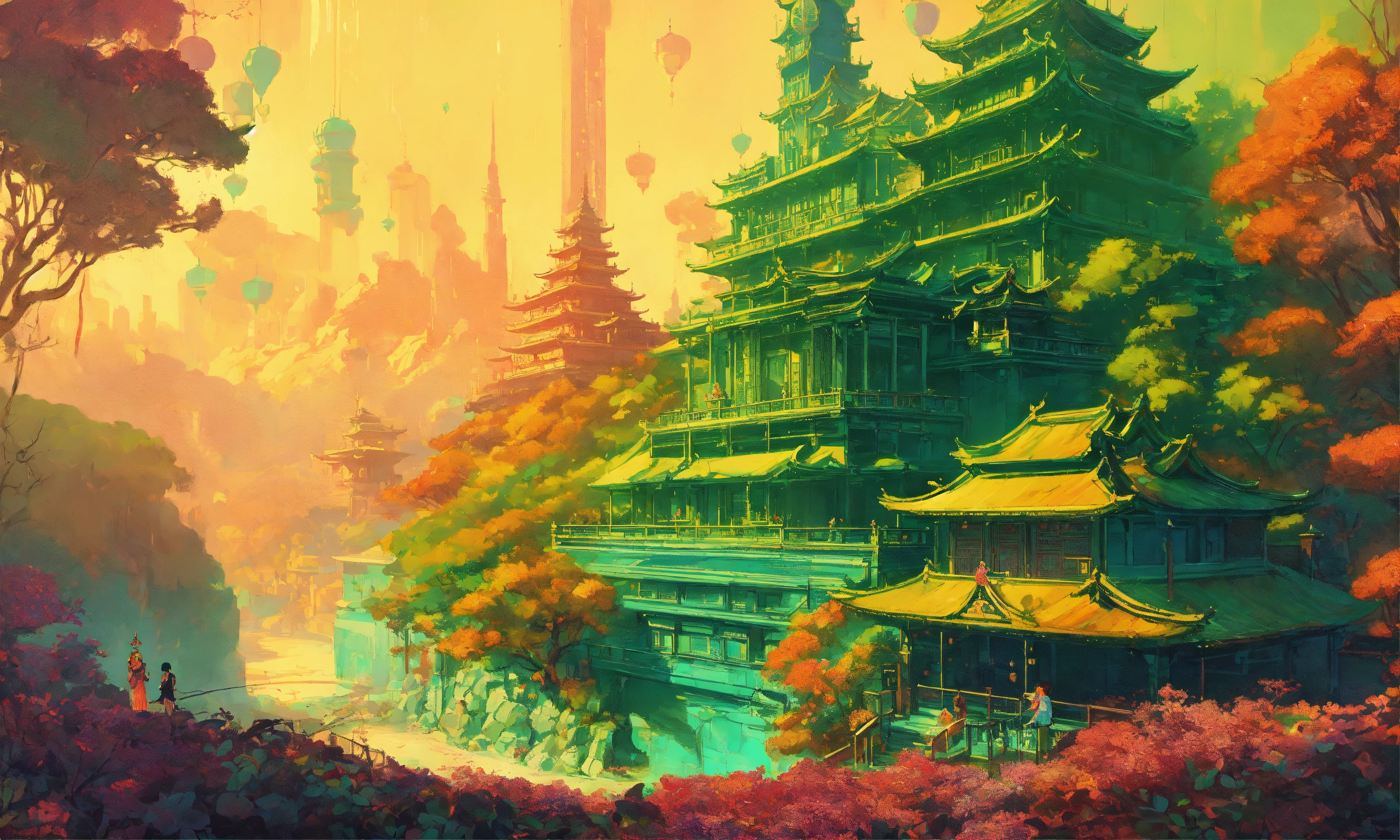 Fantasy forest palace, asian architecture, green and gold, ernst haeckel maria sibylla merian. tristan eaton, victo ngai, artgerm, rhads, ross draws, kaethe butcher, hajime sorayama, greg tocchini, virgil finlay, fantasy, colors, neon lights, digital painting, pixiv, by ilya kuvshinov, neon lights, 3d, perspective