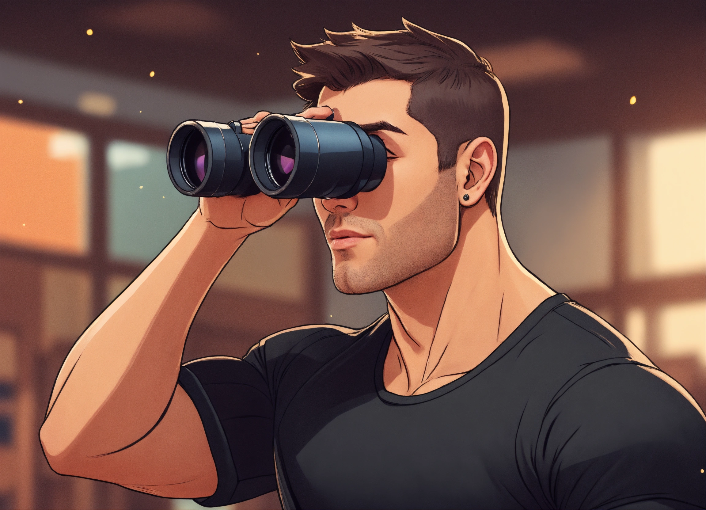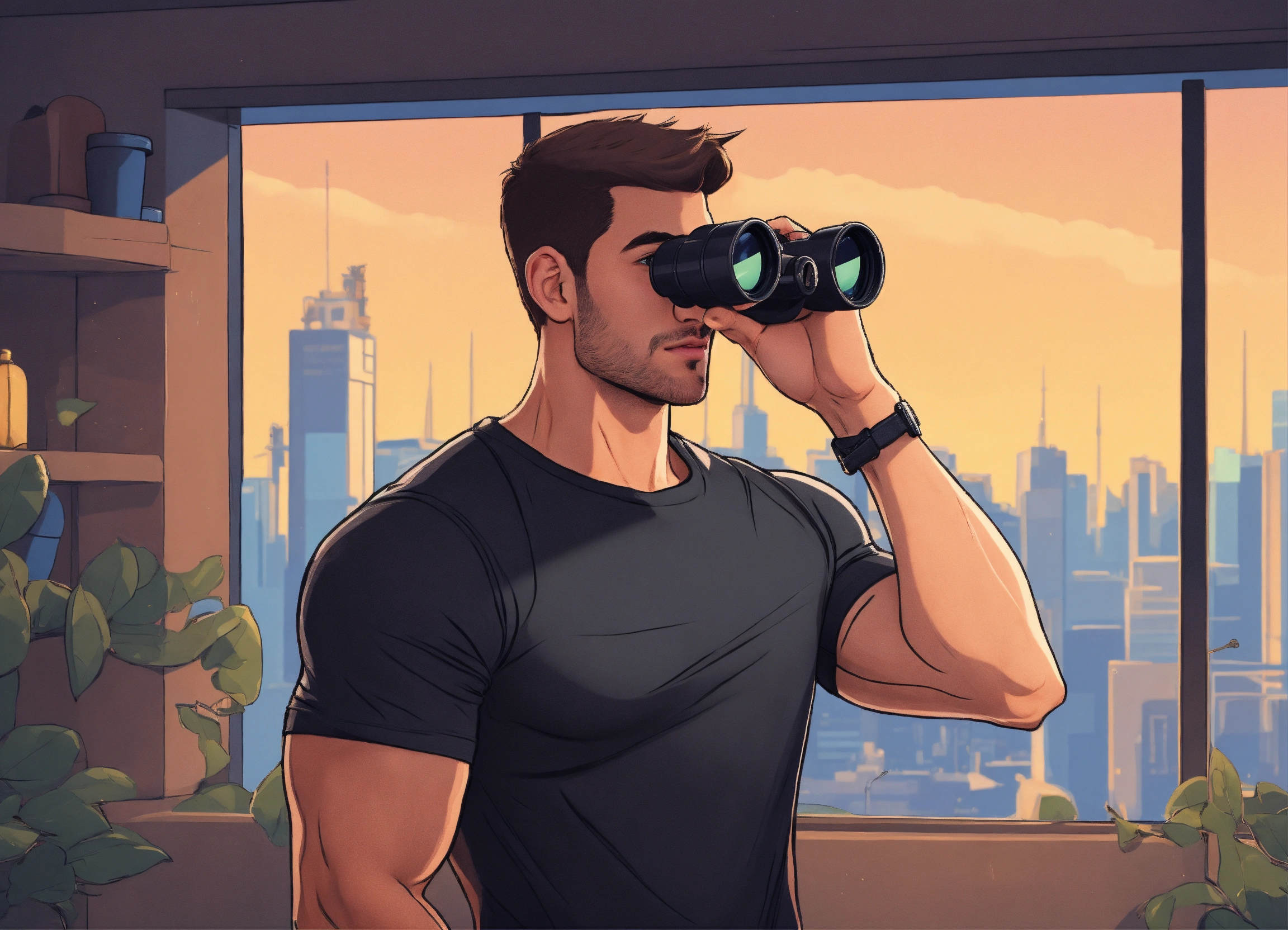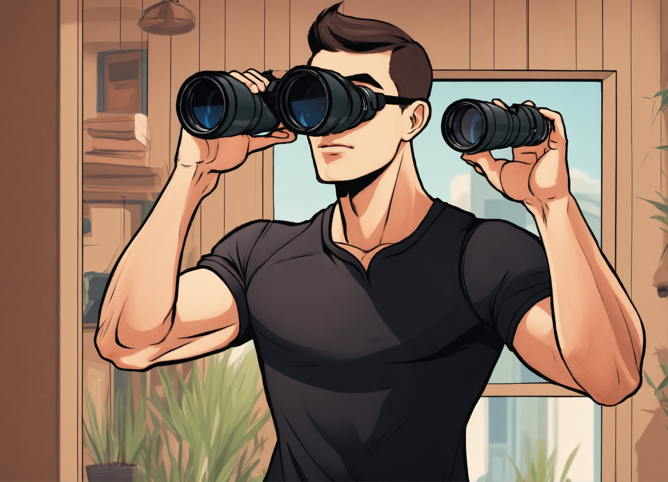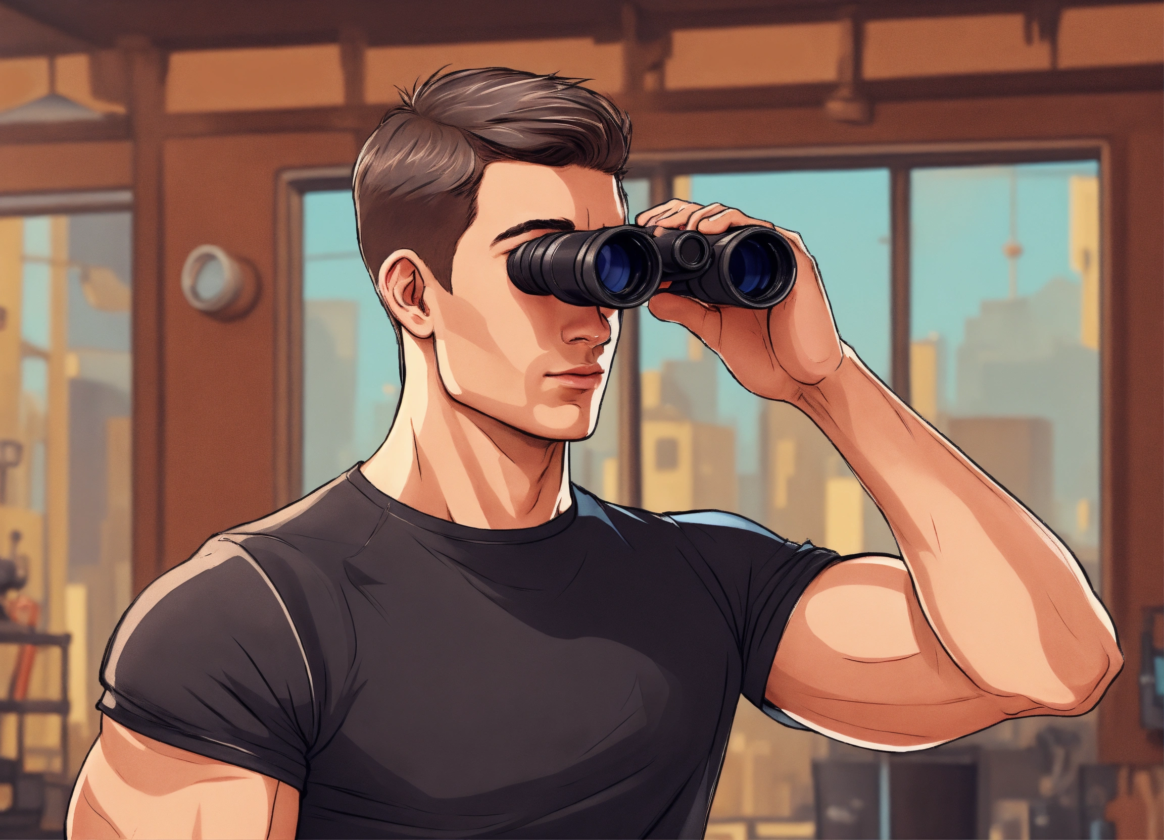Muscular guy in black t-shirt with short hair looking into binoculars