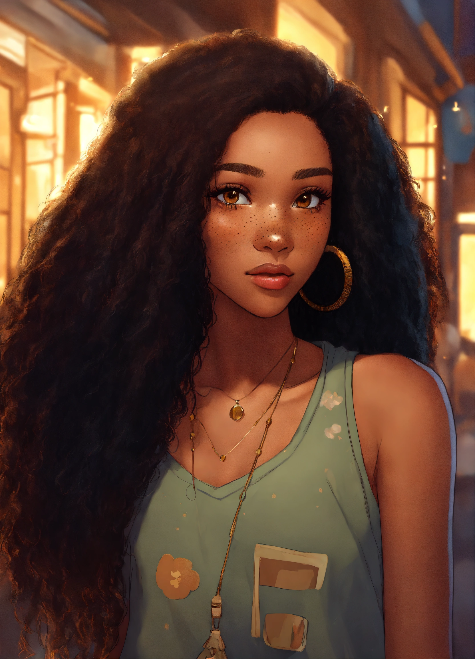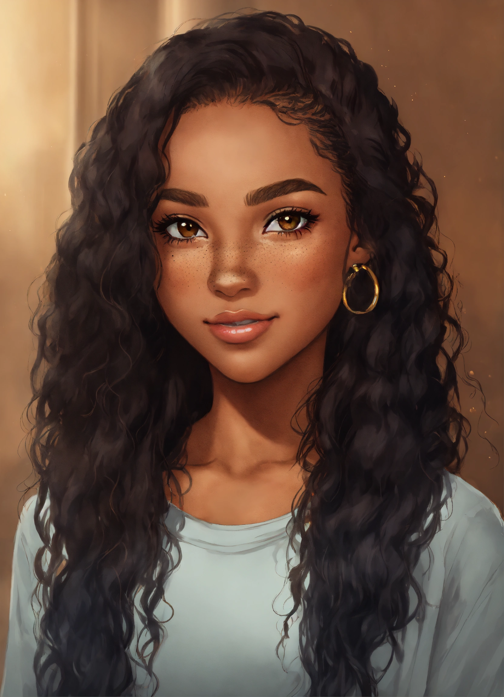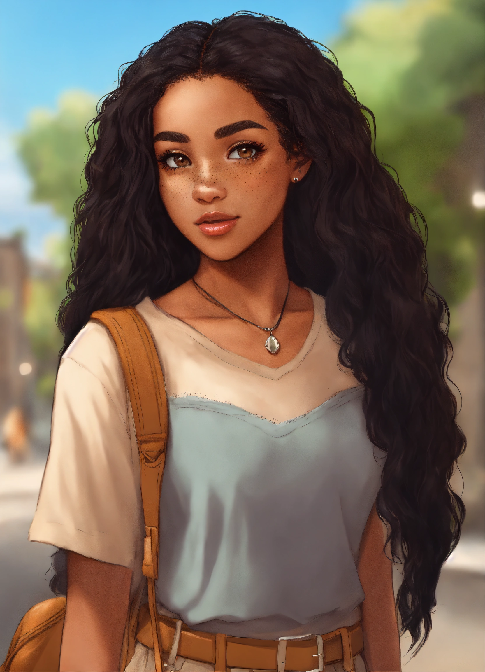 Light skinned black female, long straight & fluffy black hair, freckles, brown eyes, no imperfections, cartoon