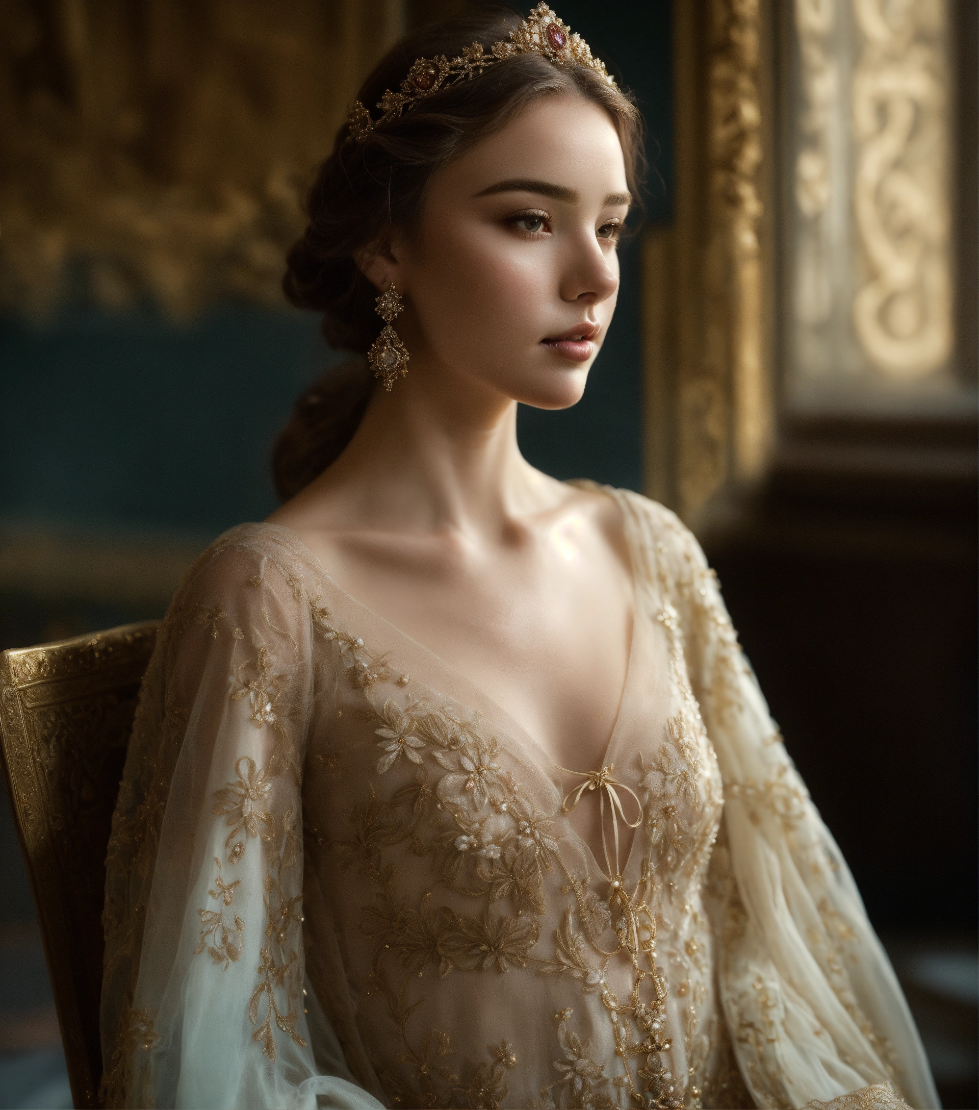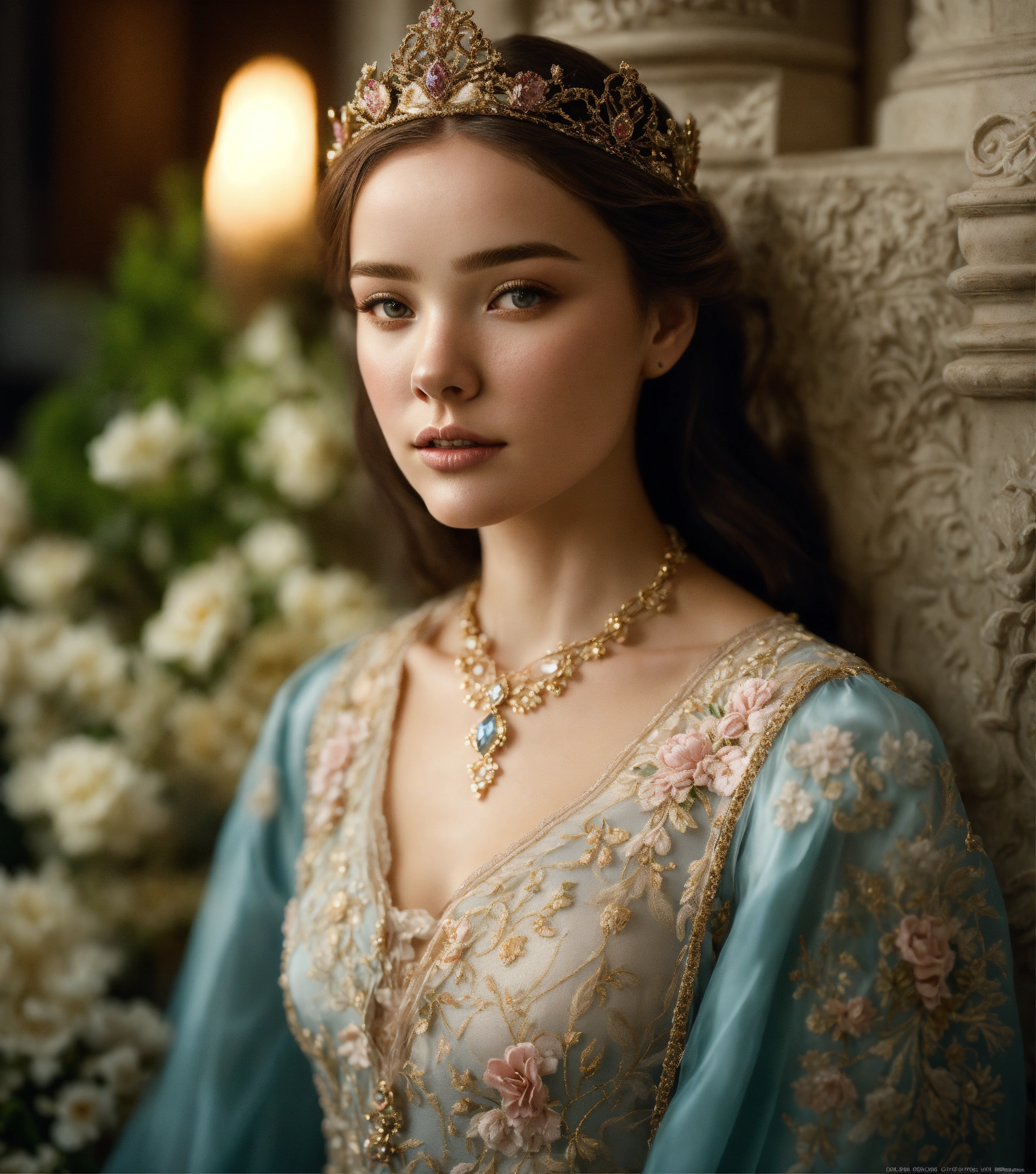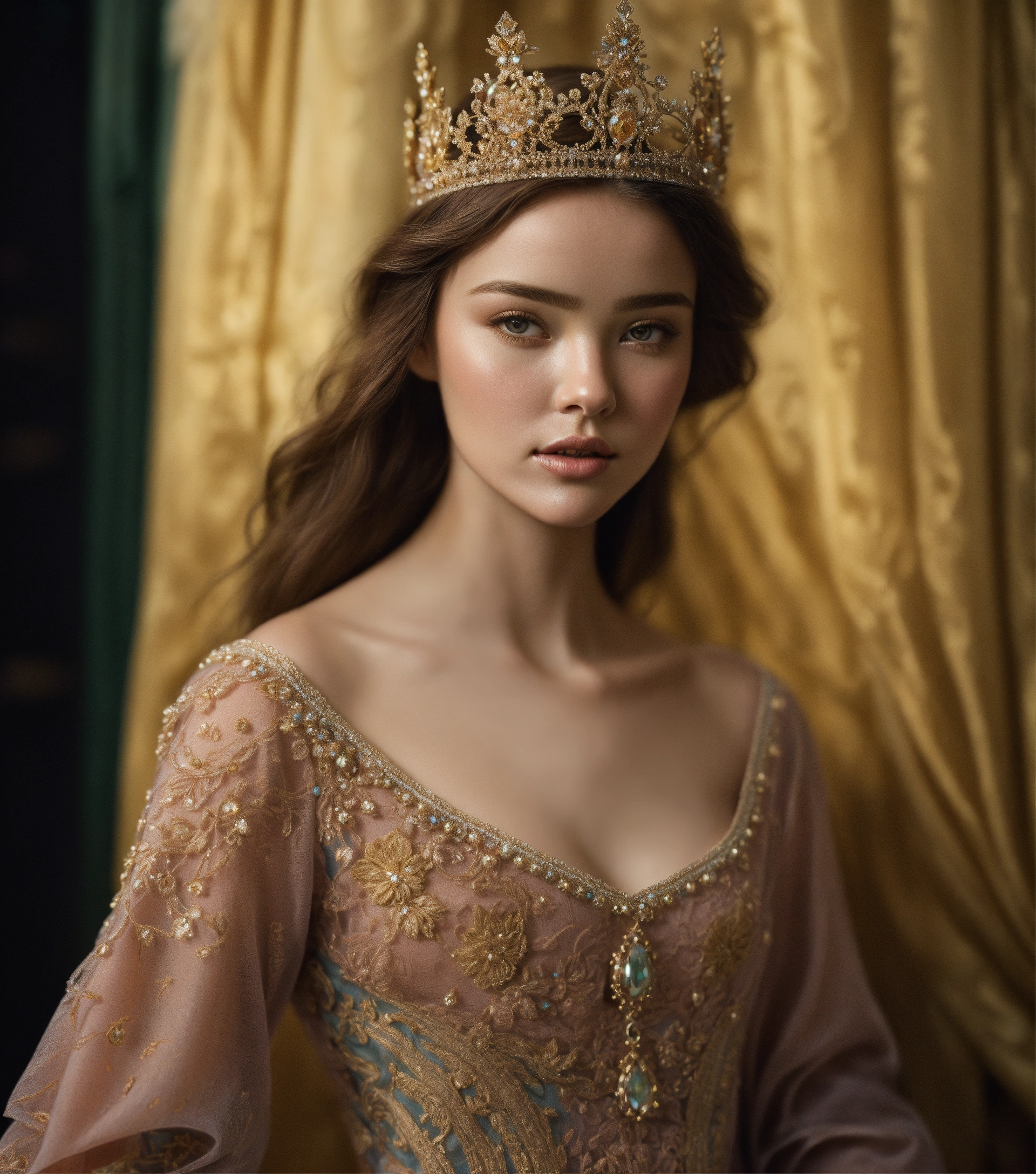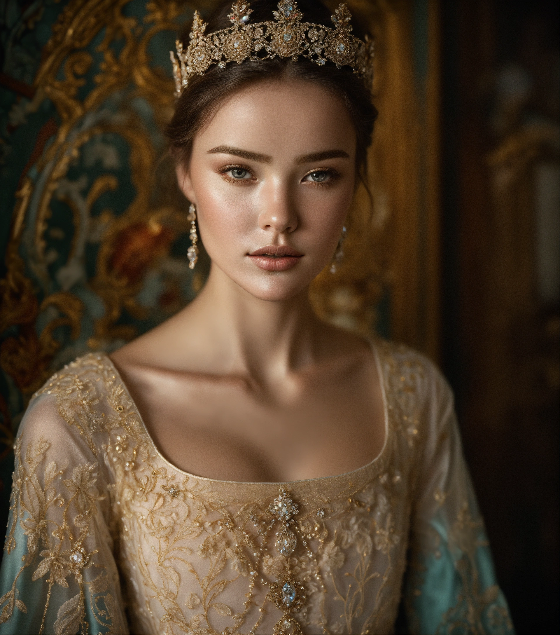 Kodak portra 400, 8k, soft light, volumetric lighting, highly detailed, fine art portrait photography, medieval setting, 15 years old, stunningly beautiful, beauty in perfection, narrow cheeks, very slim and fragile build, she seems very fragile, flawless skin, leichtes lächeln, feminine virtues, narrow face, pale, mouth closed, elegant narrow lace silk dress, finely chased baroness-crown richly set with diamonds, in the style of a pale und slim miranda kerr, intimate, intim, verführerisch, front view, full body portrait, complex 3d render, 150 mm lens, intricate details, elegant, hyper realistic, ultra detailed, octane render, etheric, outworldly colours, emotionally evoking, fantasy, ornamental, intricate, elegant, 8k, soft light, volumetric lighting, highly detailed, refined, highly detailed, soft lighting colors scheme, fine art photography, hyper realistic, photo realistic