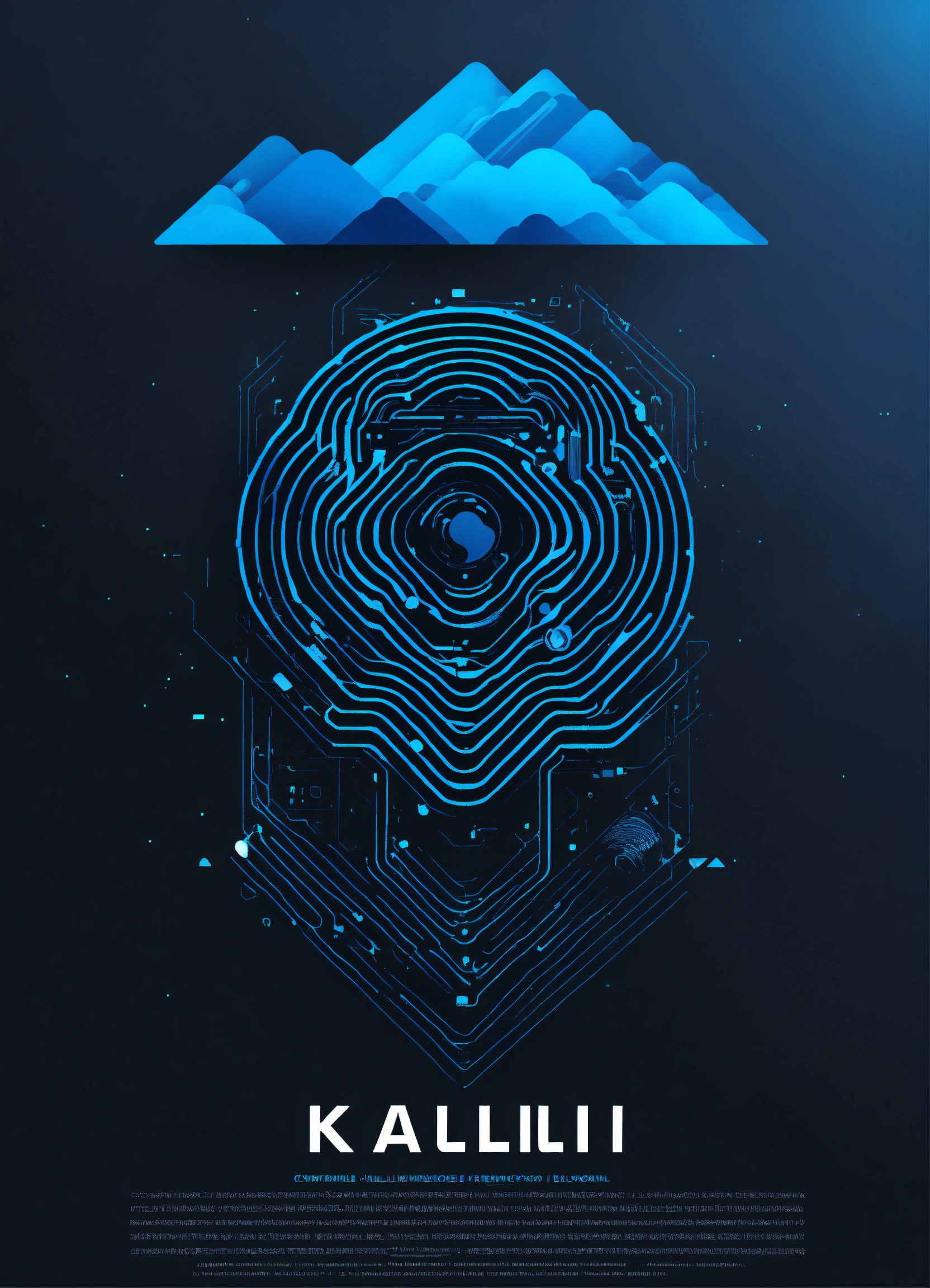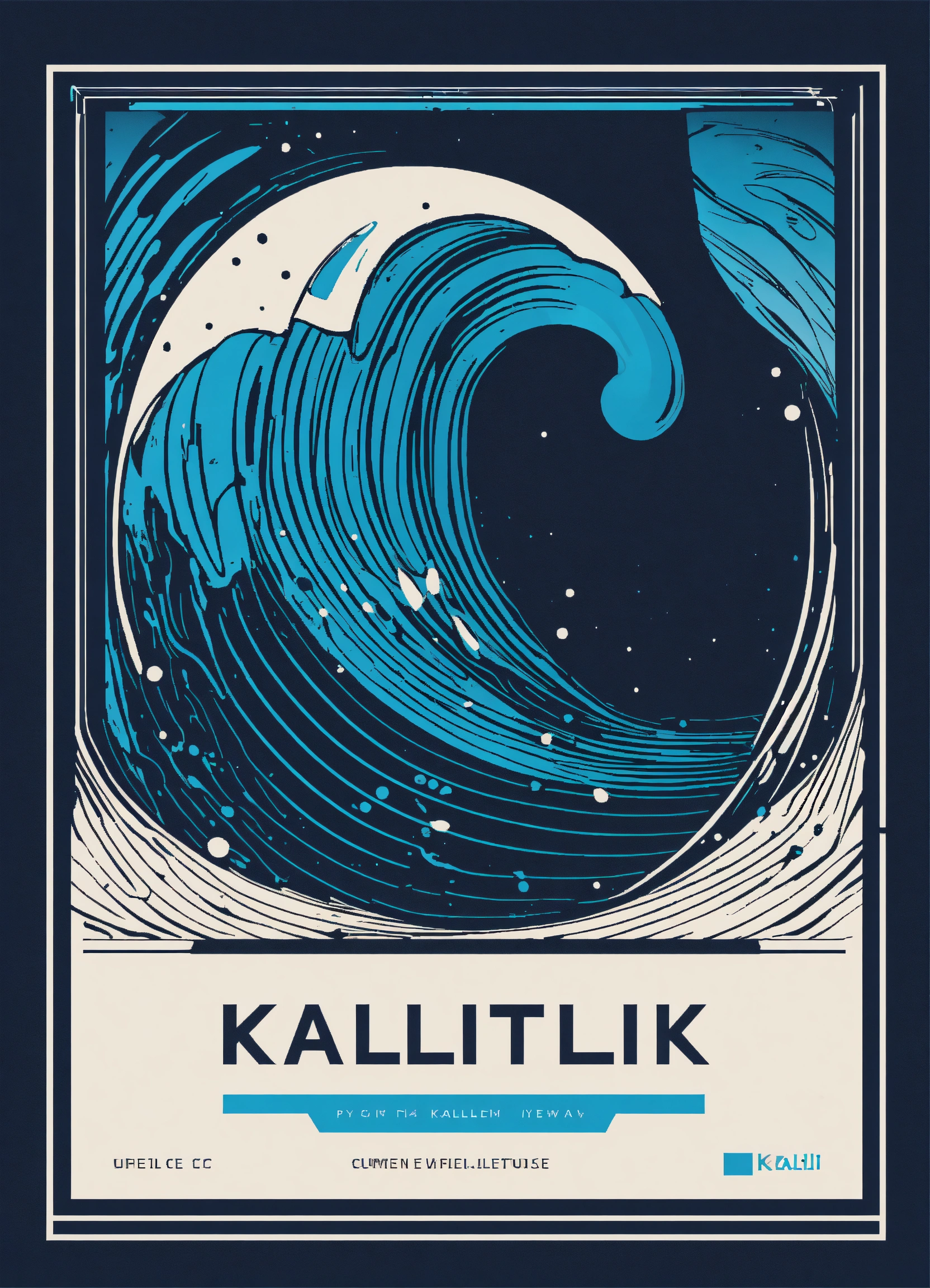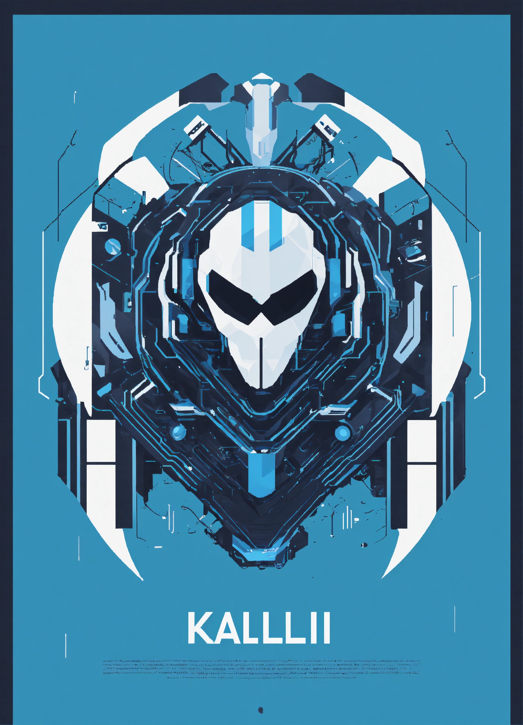 Flat vector design, minimal, simple bold logo in blue, black, white colors, cybernetic wave, use the text kallii.