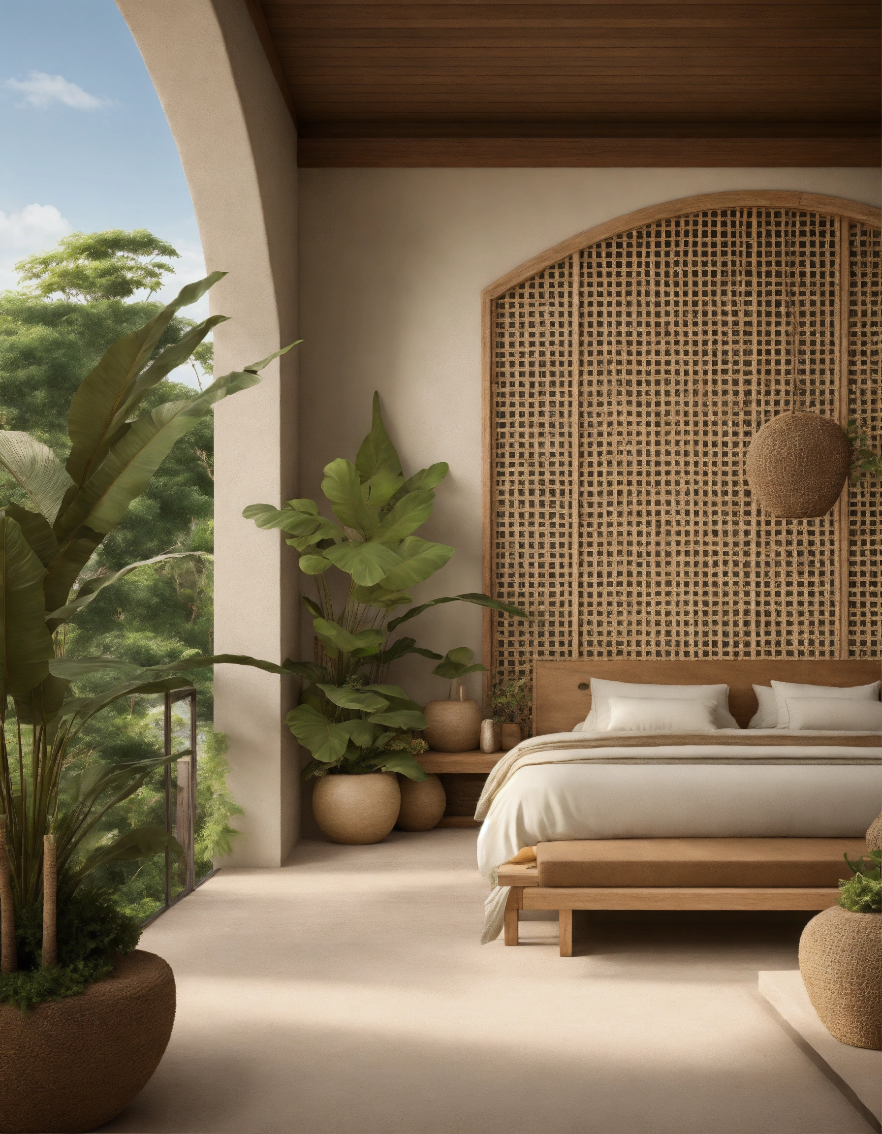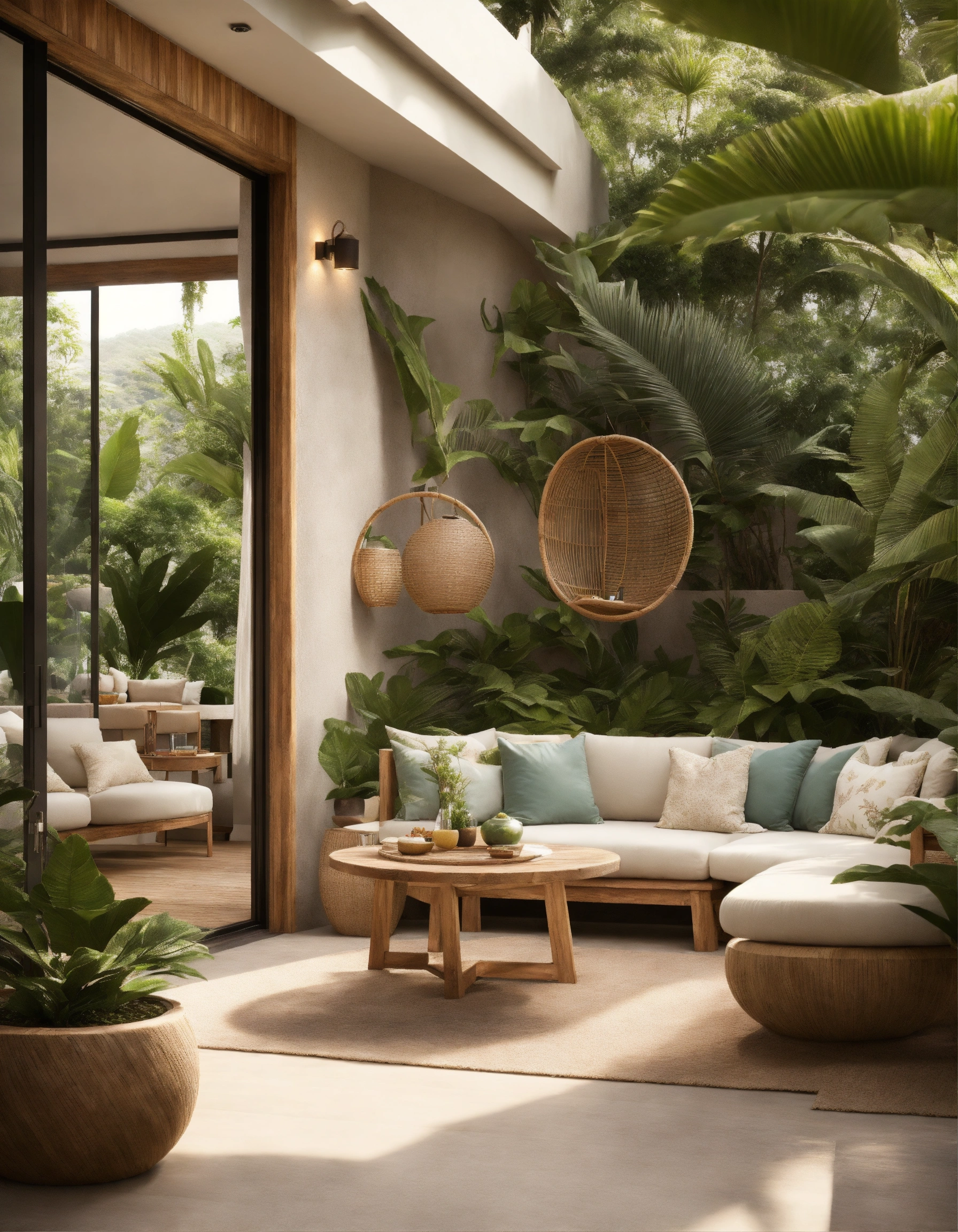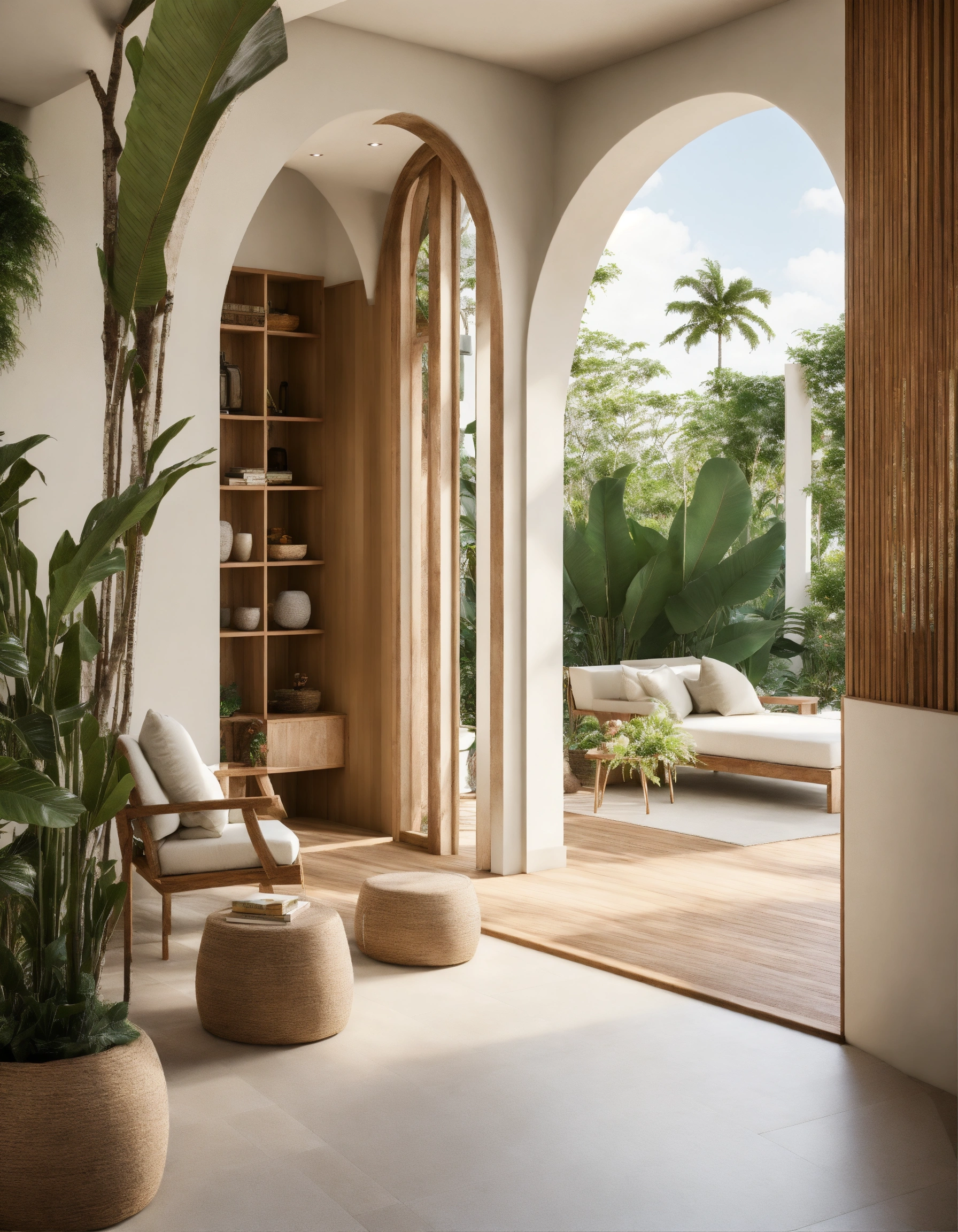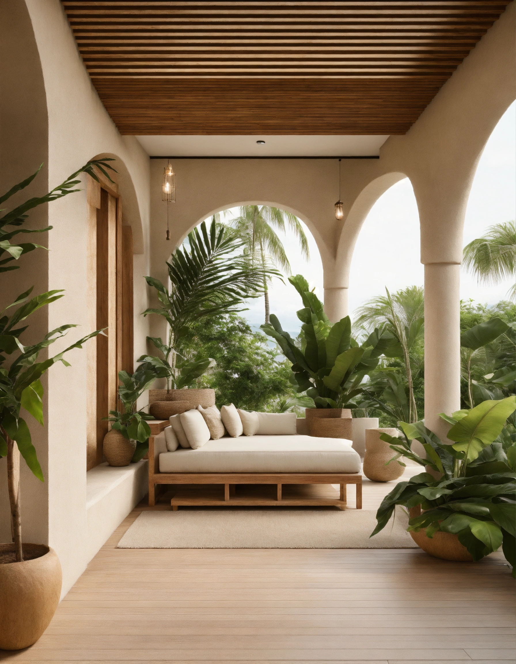 Ultra realistic photo of modern take on upscale bali inspired small condo white cream stone, light wood round arches interor view of deck with tropical foliage
