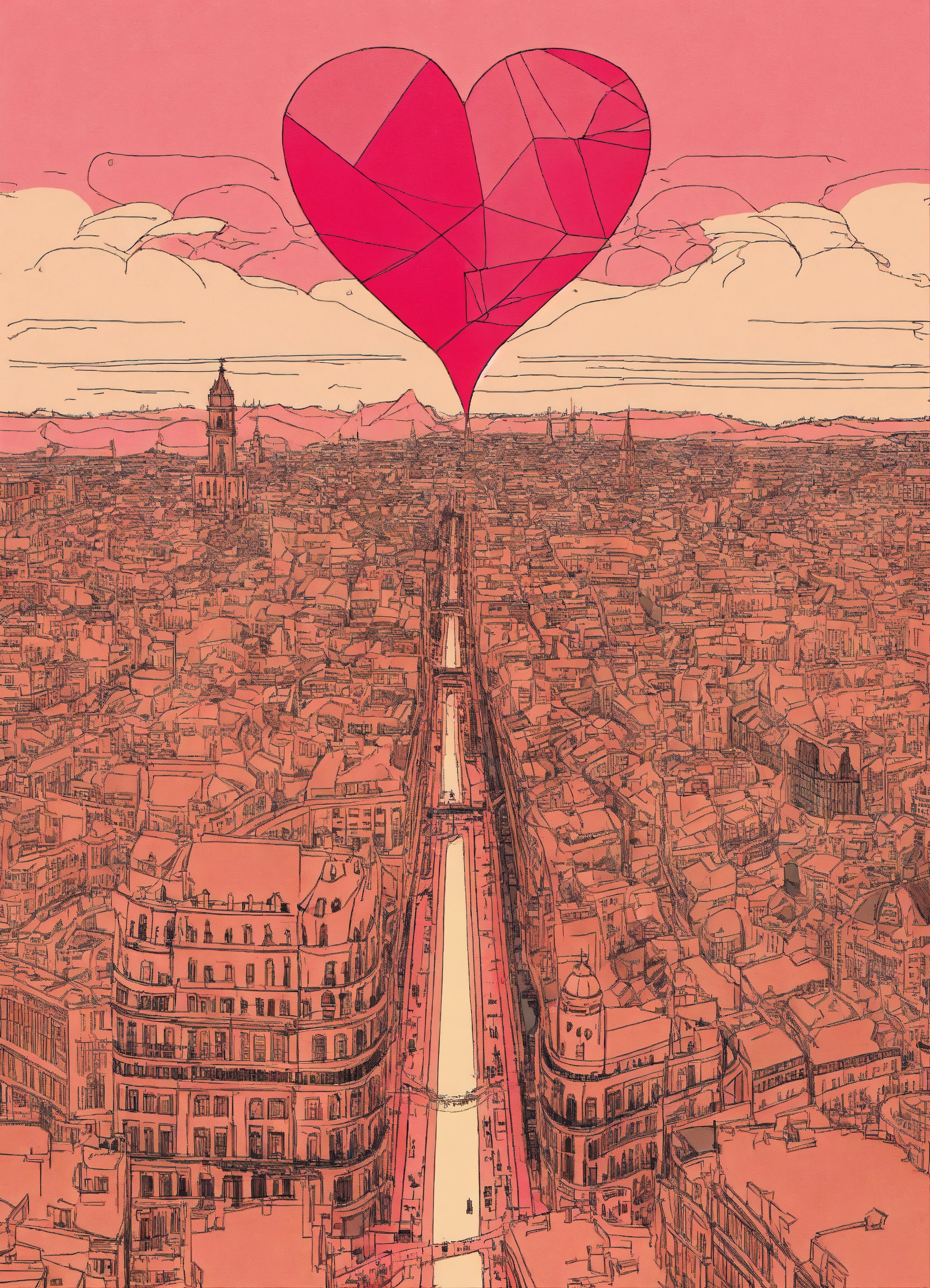 un corazón roto gigante y una rosa estilo dibujo lapiz