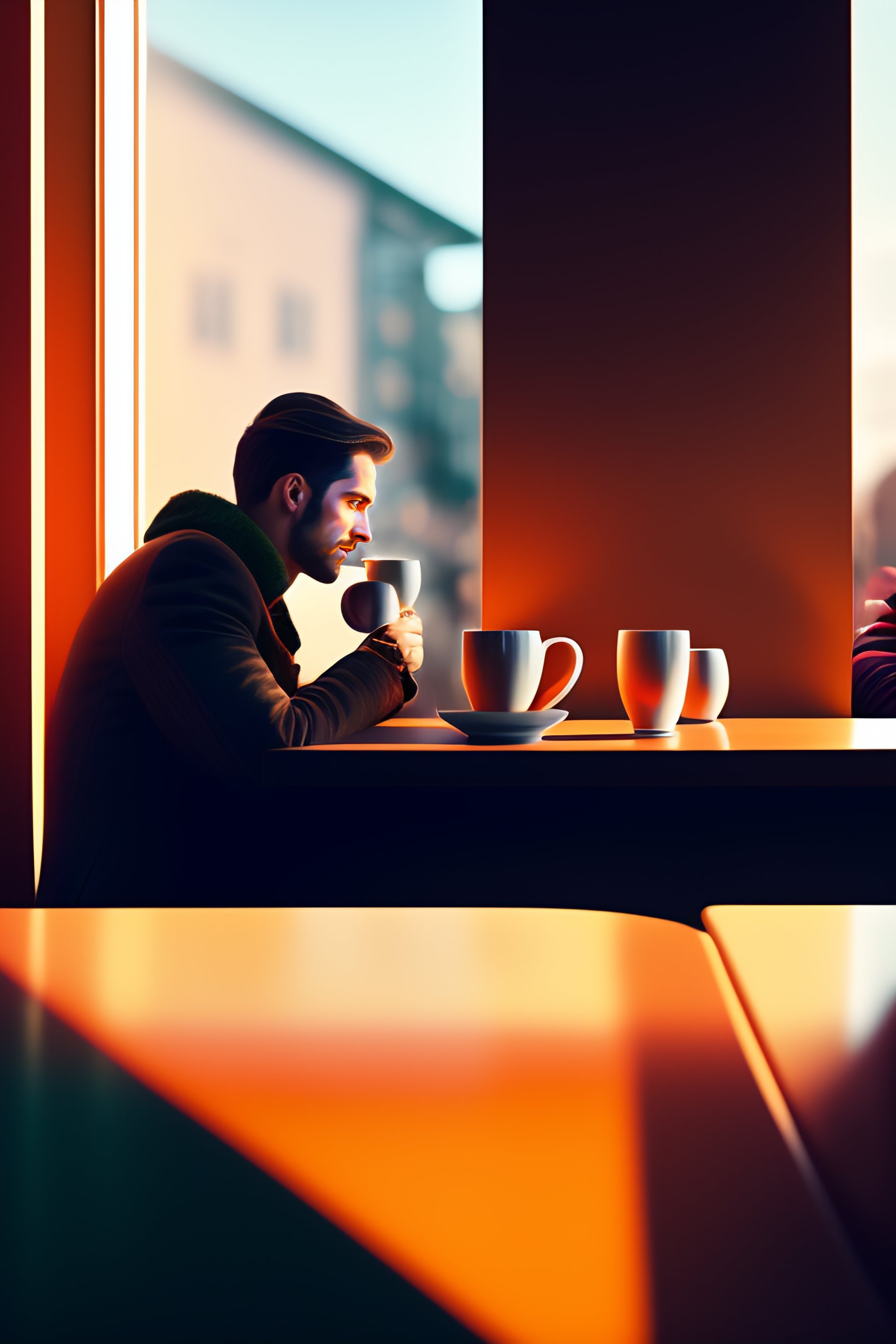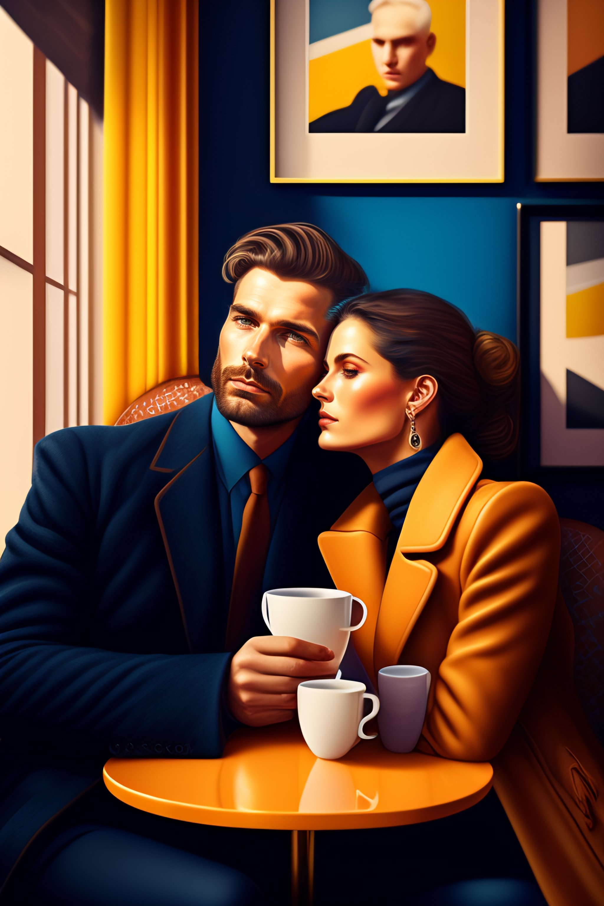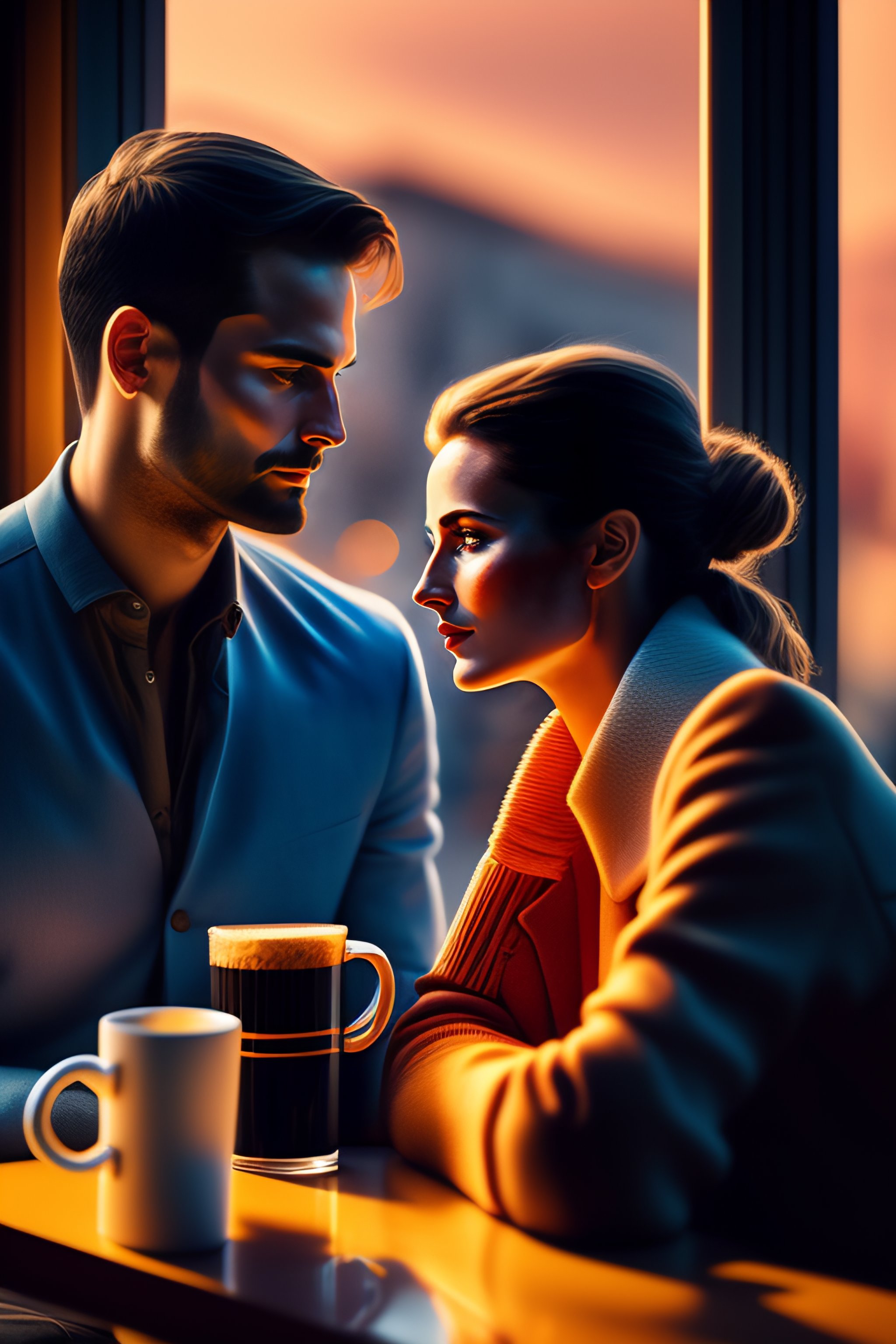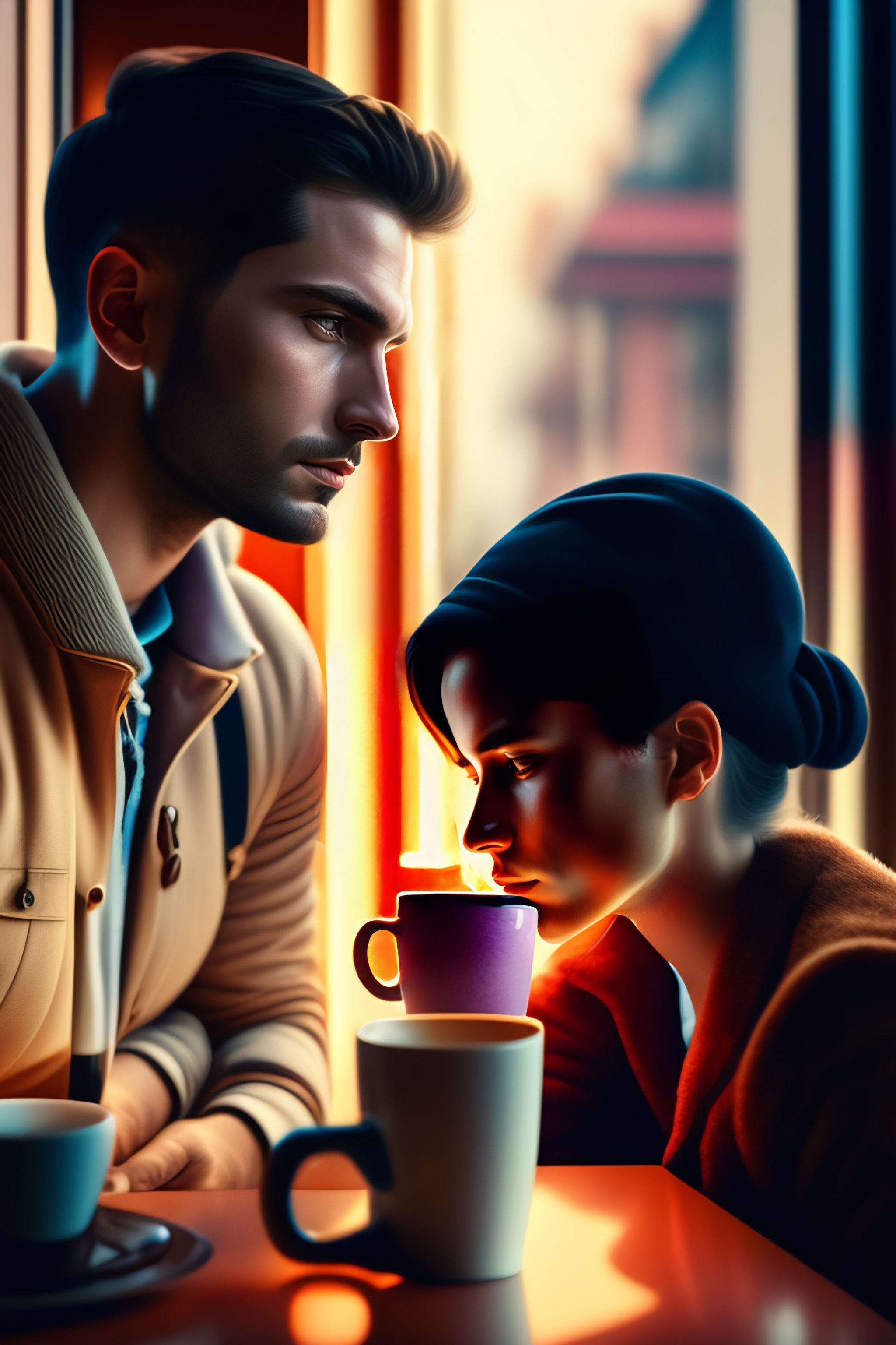 Editorial illustration by karolis strautniekas and mads berg, portrait of a brother and sister drinking coffee sitting across from each other in a cafe, colorful, fine texture, detailed, muted colors, film noir, dramatic lighting, dynamic composition, vivid, matte print, wide angle, ((sunbeams)), moody, extreme perspective, futuristic