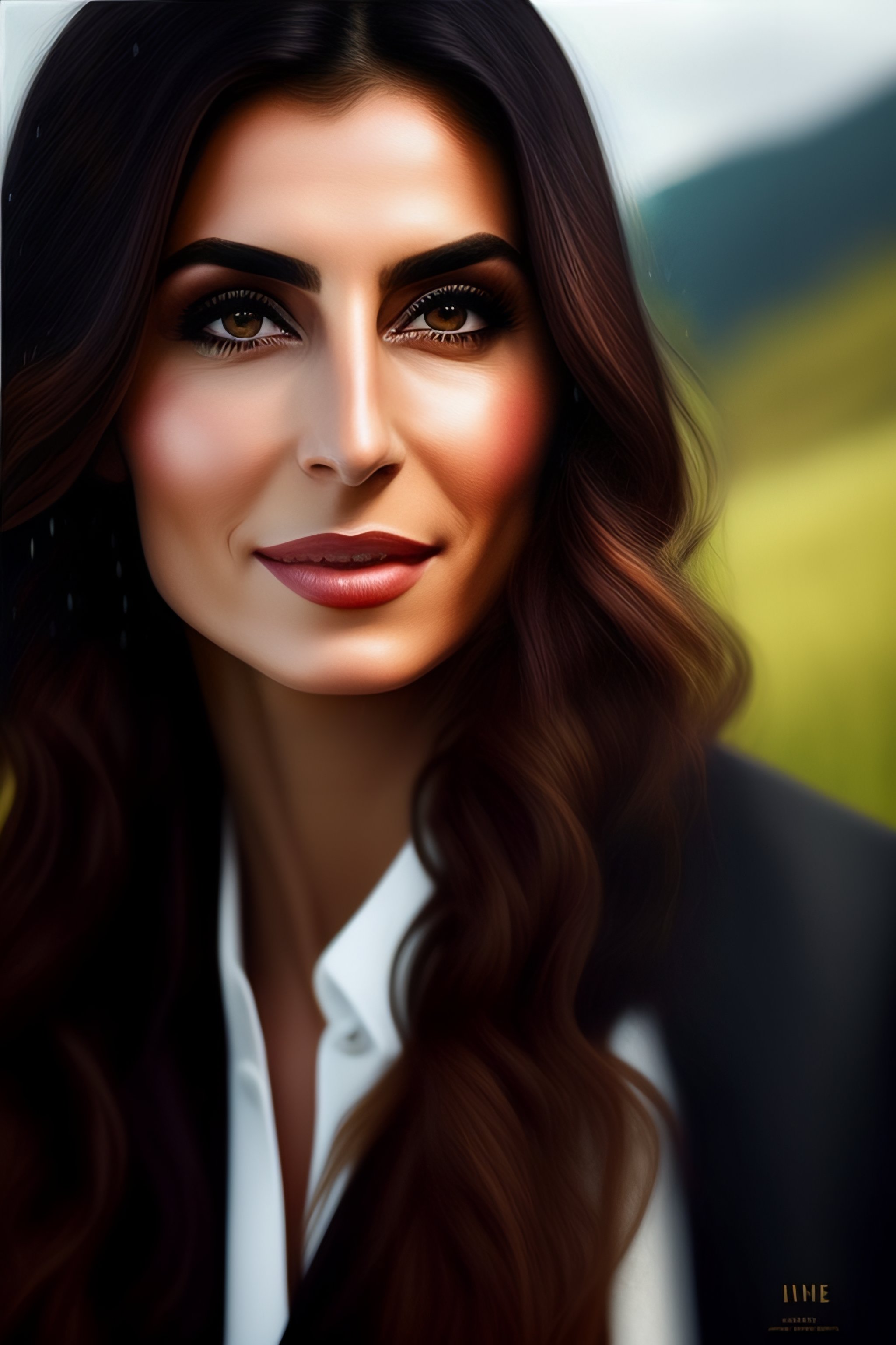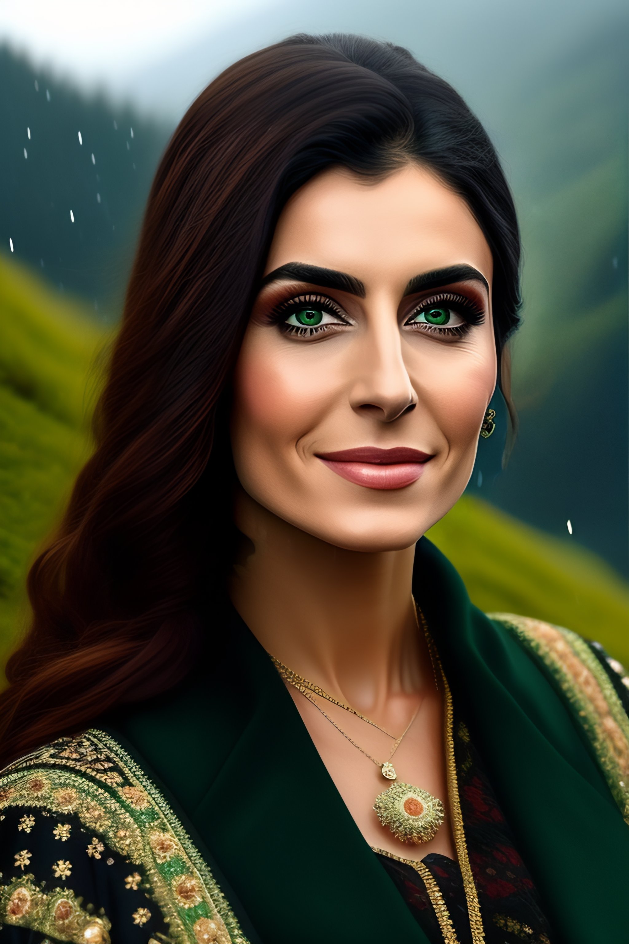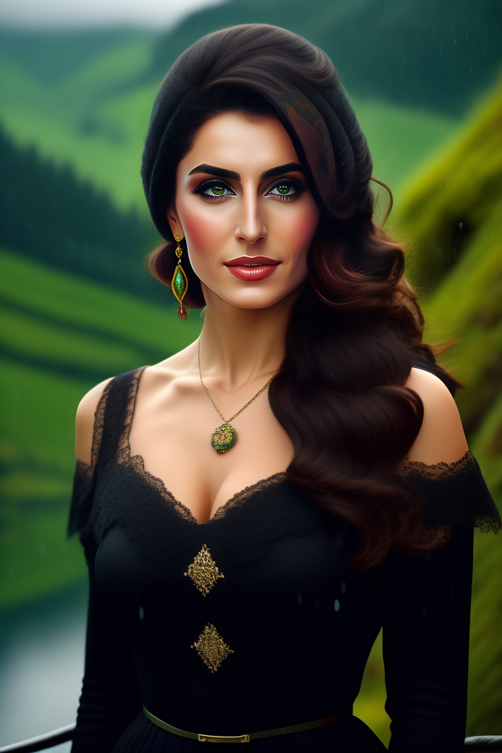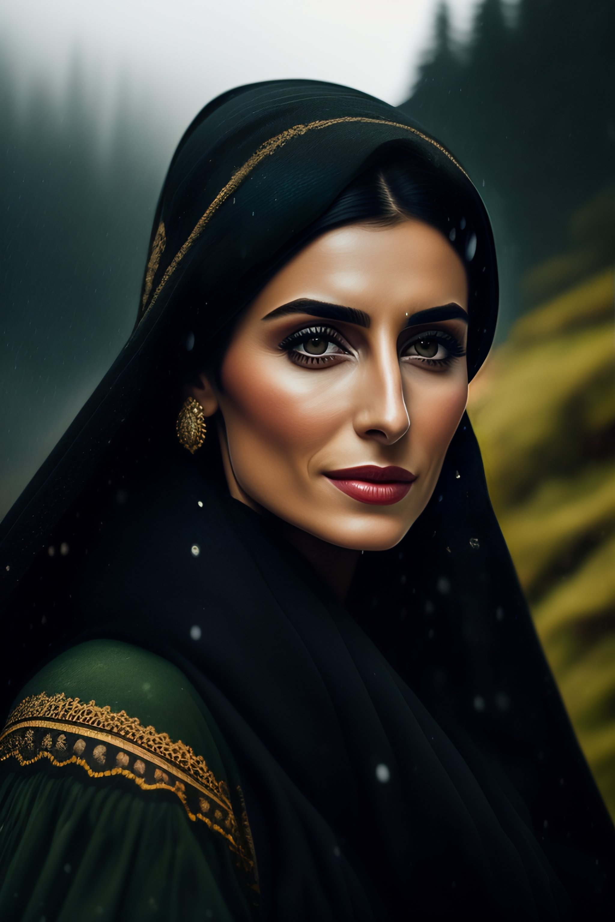 Hande erçel in black traditional female turkish dress, green eyes, in karadeniz mountains, rainy weather, very dark details
