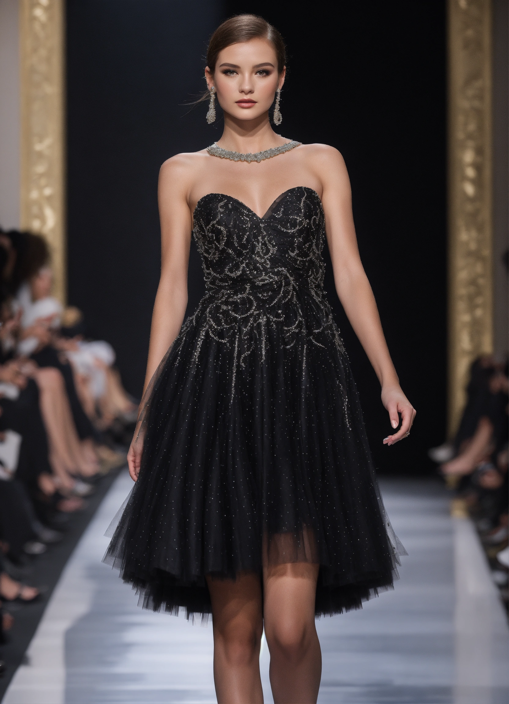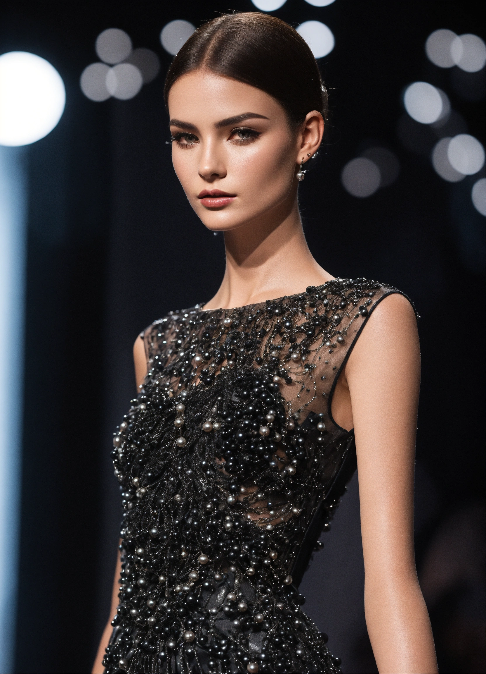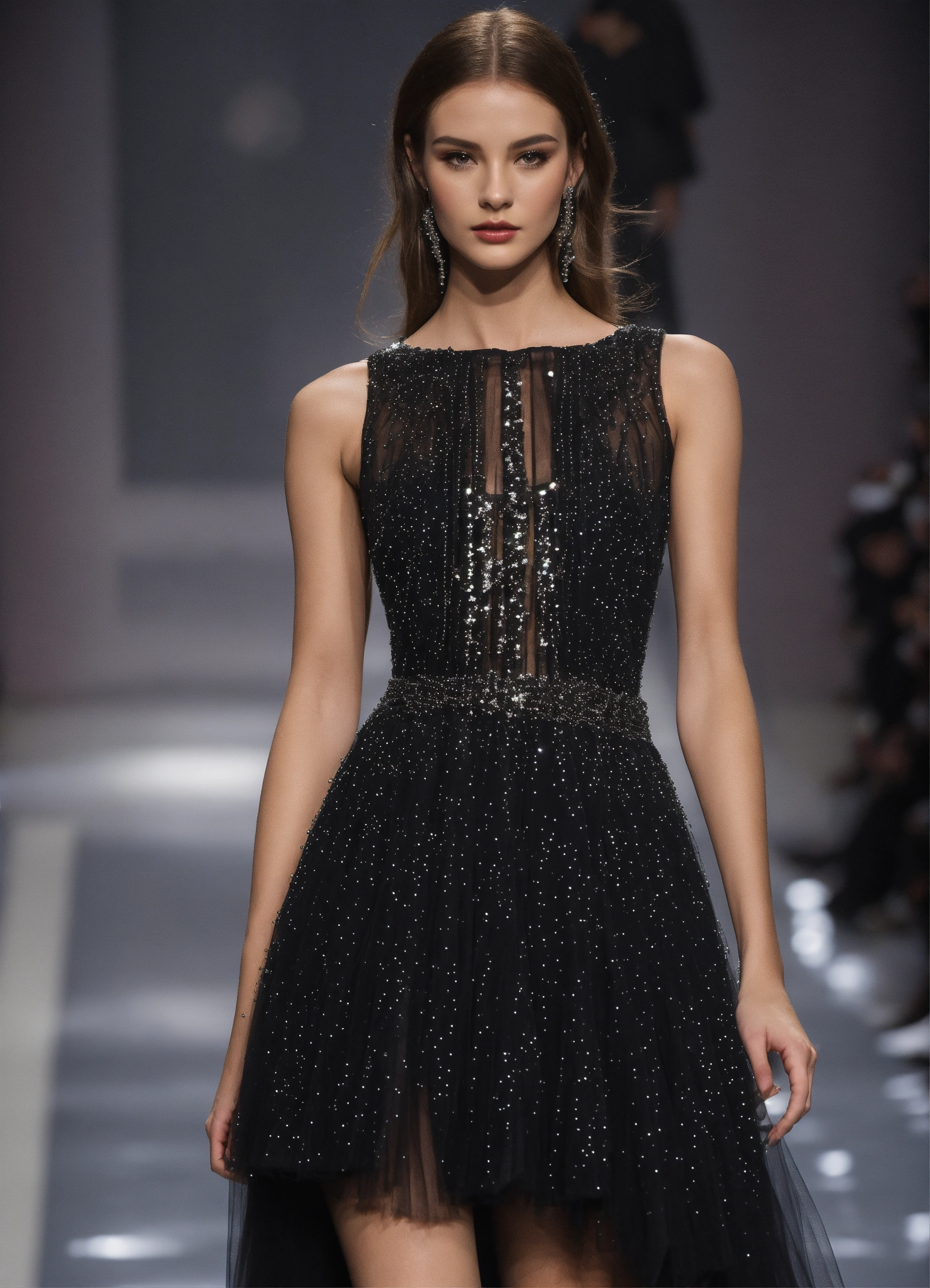 Of the model representing a new brand of the highest class of modern design of the 21st century. the dress should be semi - short dominated by the right black and silver color adorned with glittering pearls of the same color, the details will be black we saw the perfect combination of the mannequin. the dress from the upper waist should be equally dominated by handwork with two - tone black beads and decorated with fine black beads, the lower part of the dress should be a deep pleat on the right side of the silhouette, perfect lines of the model to give a perfect representation of the dress on the catwalk of paris for the autumn - winter season