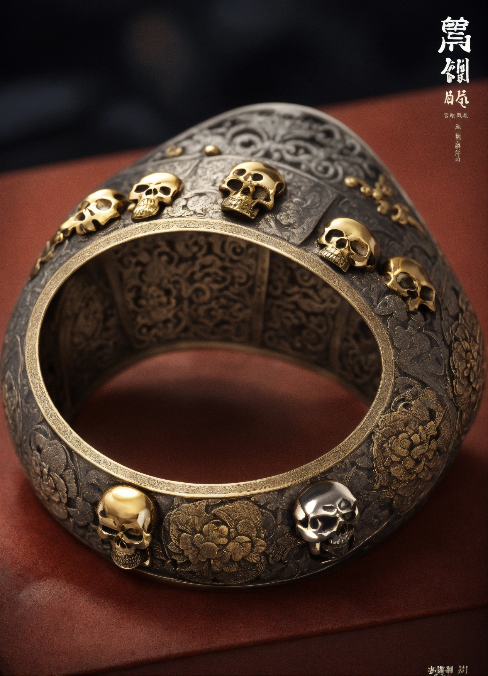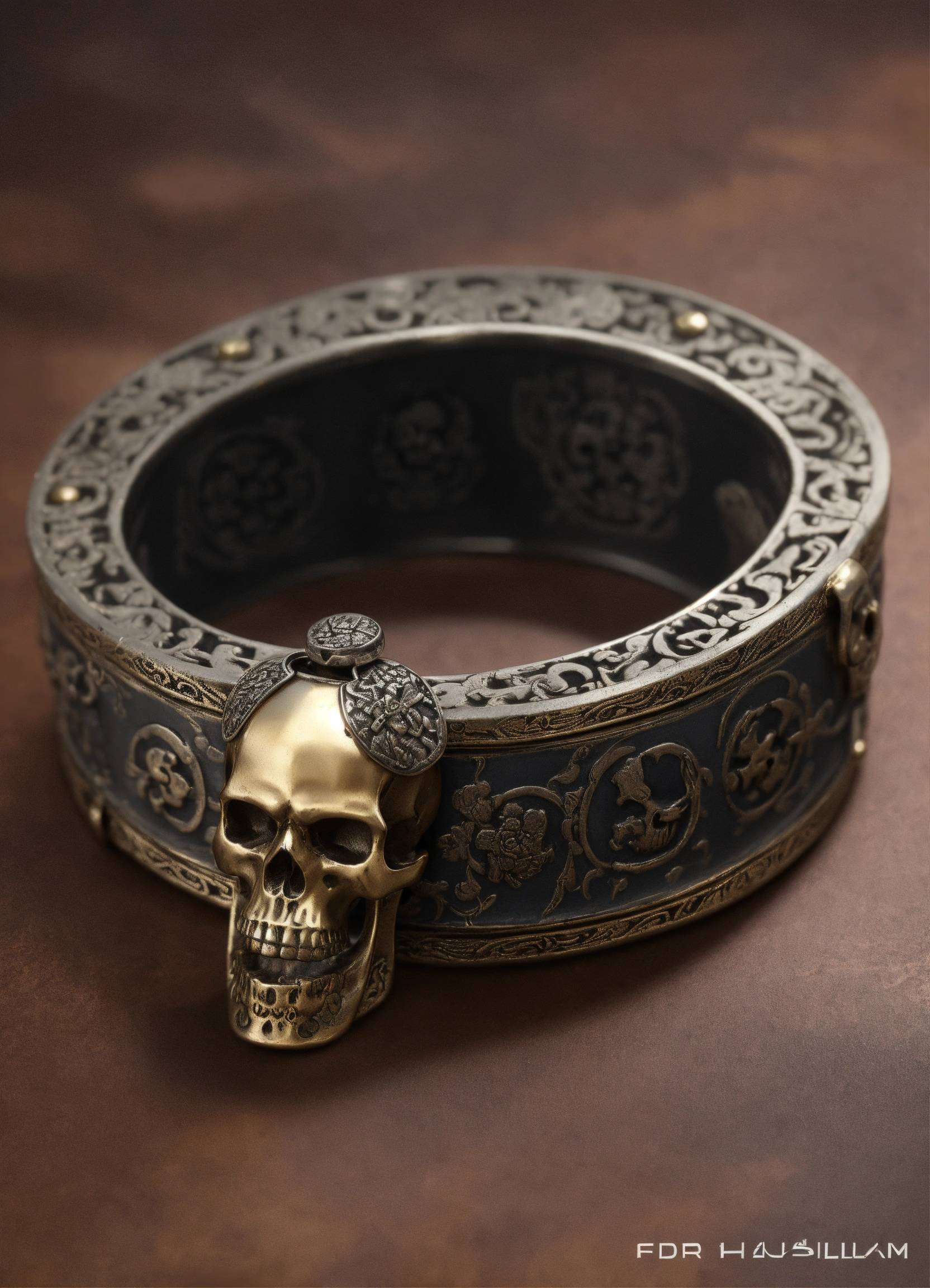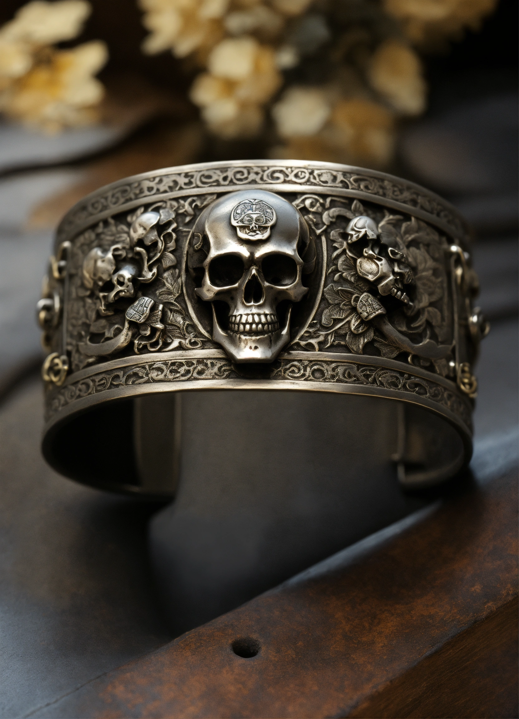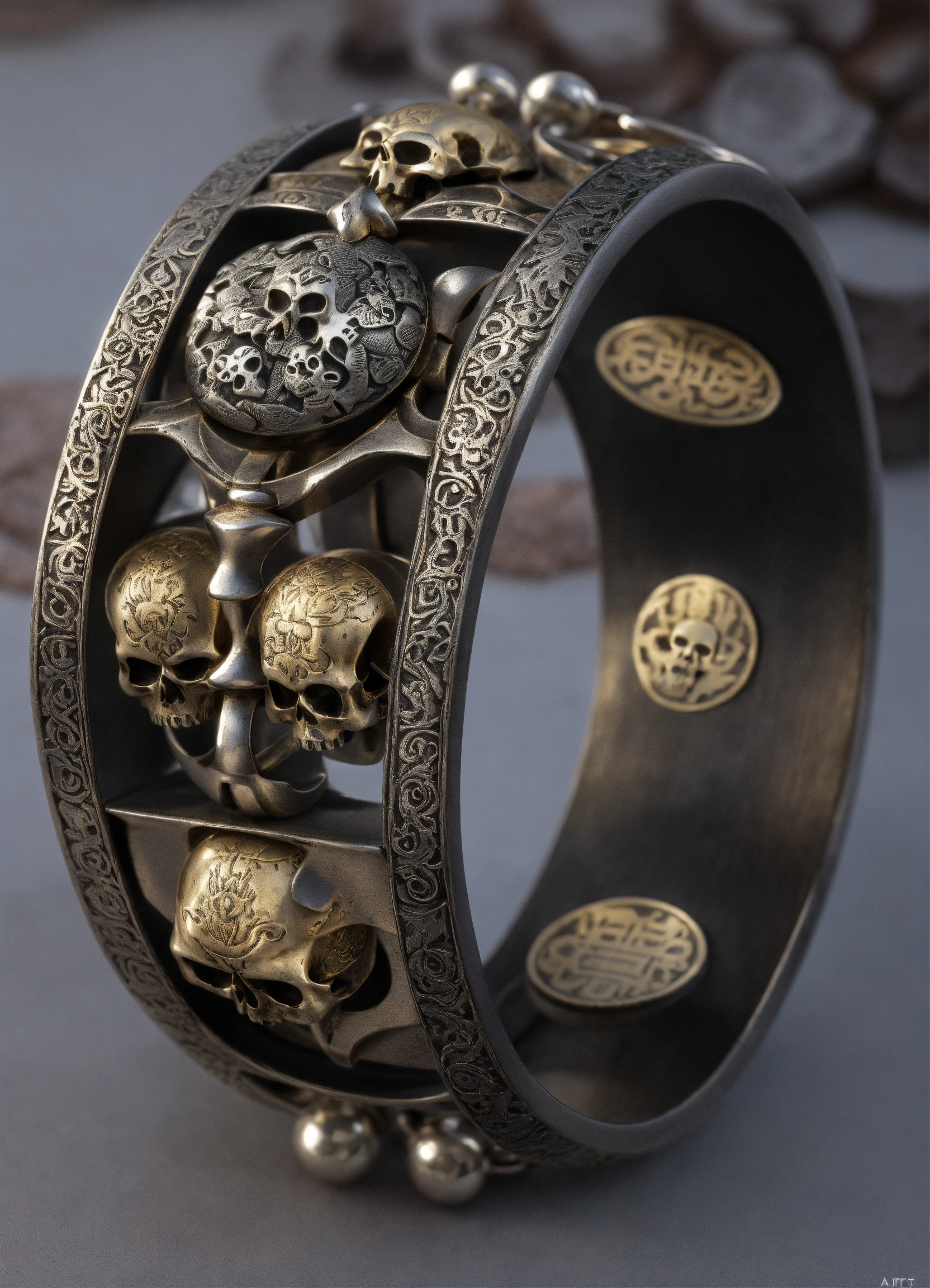 Edo period bracelet, ford hallam style, skull motif, shibuichi, tsuba, iron, silver, silver material, highly detailed, artstation, concept art, sharp focus