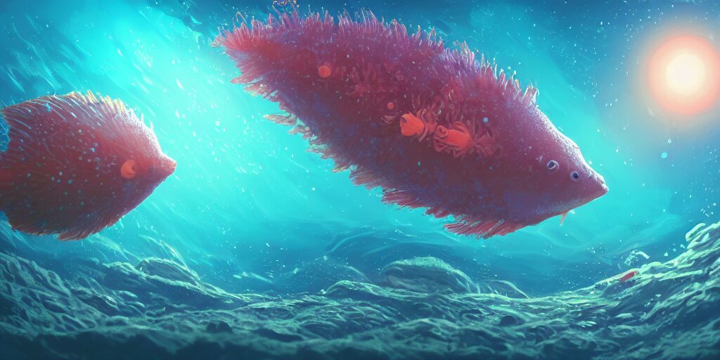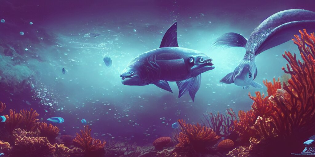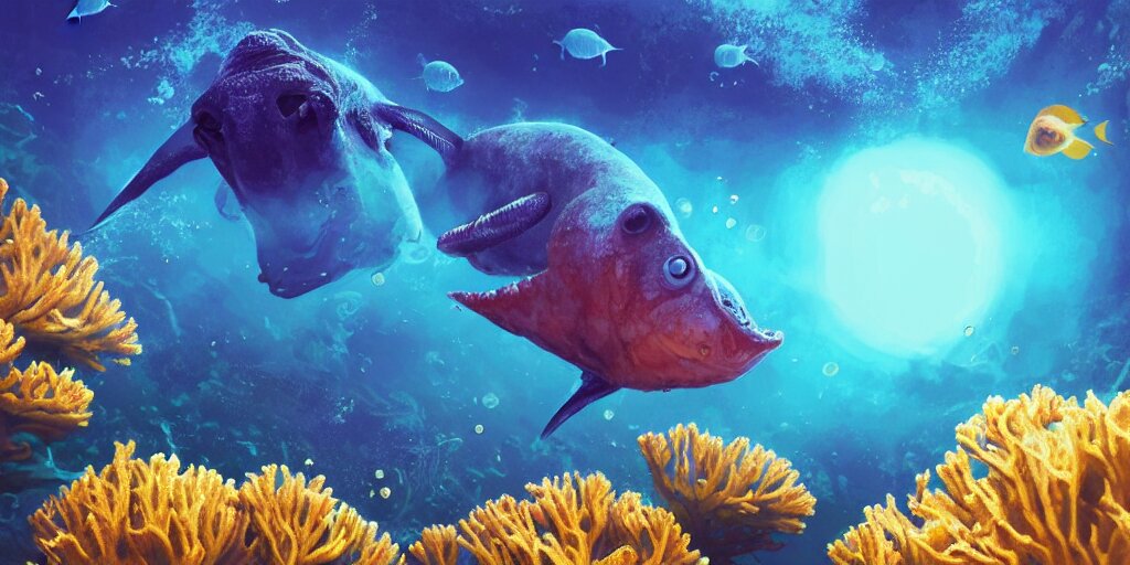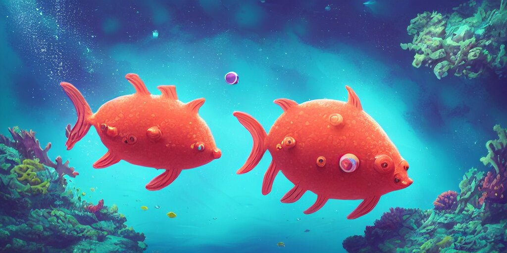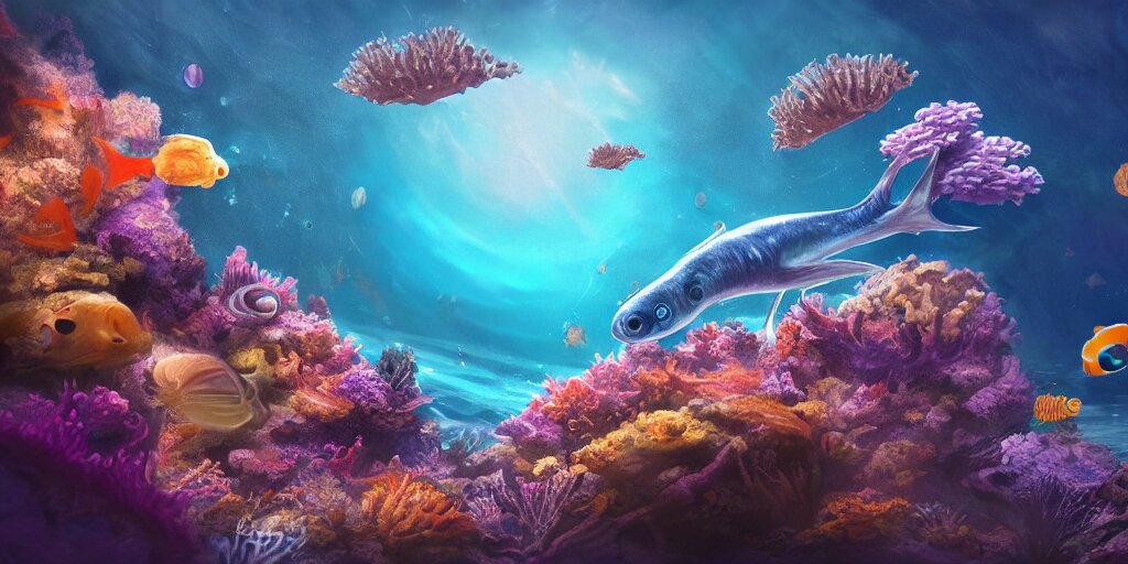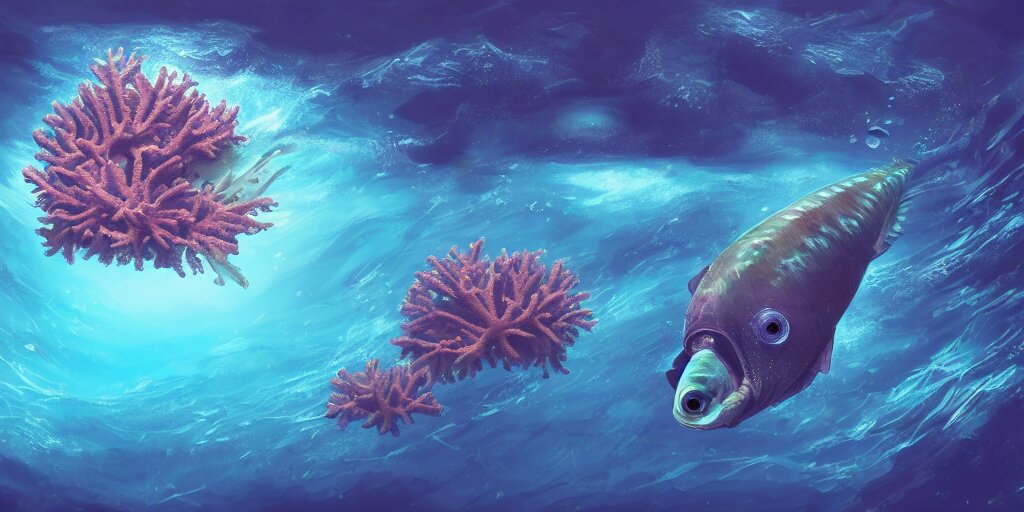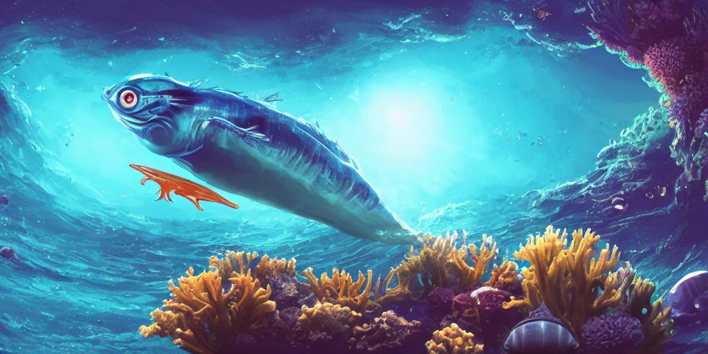 Photo of an extremely cute alien fish swimming an alien habitable underwater planet, coral reefs, dream-like atmosphere, water, plants, peaceful, serenity, calm ocean, tansparent water, reefs, fish, coral, inner peace, awareness, silence, nature, evolution, wide angle, super highly detailed, professional digital painting, artstation, concept art, smooth, sharp focus, no blur, no dof, extreme illustration, unreal engine 5, photorealism, hd quality, 8k resolution, cinema 4d, 3d, beautiful, cinematic, art by artgerm and greg rutkowski and alphonse mucha and loish and wlop