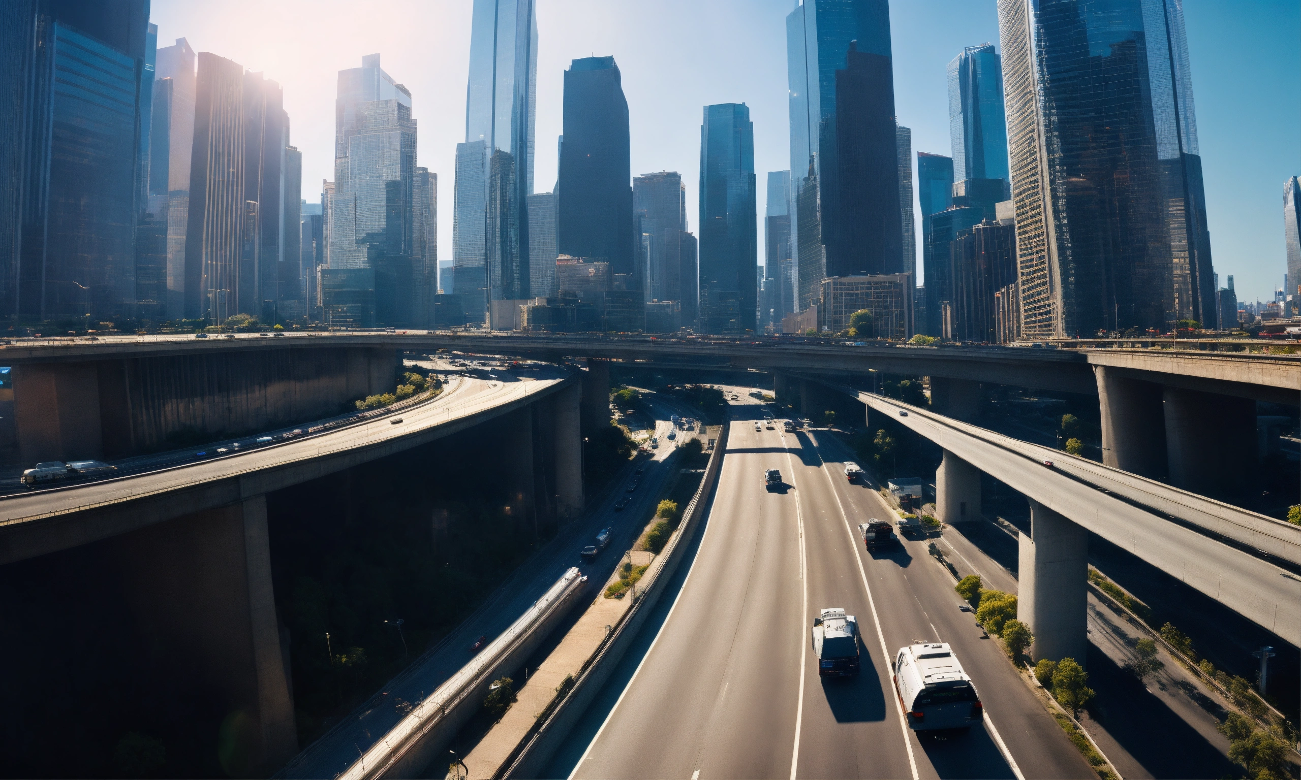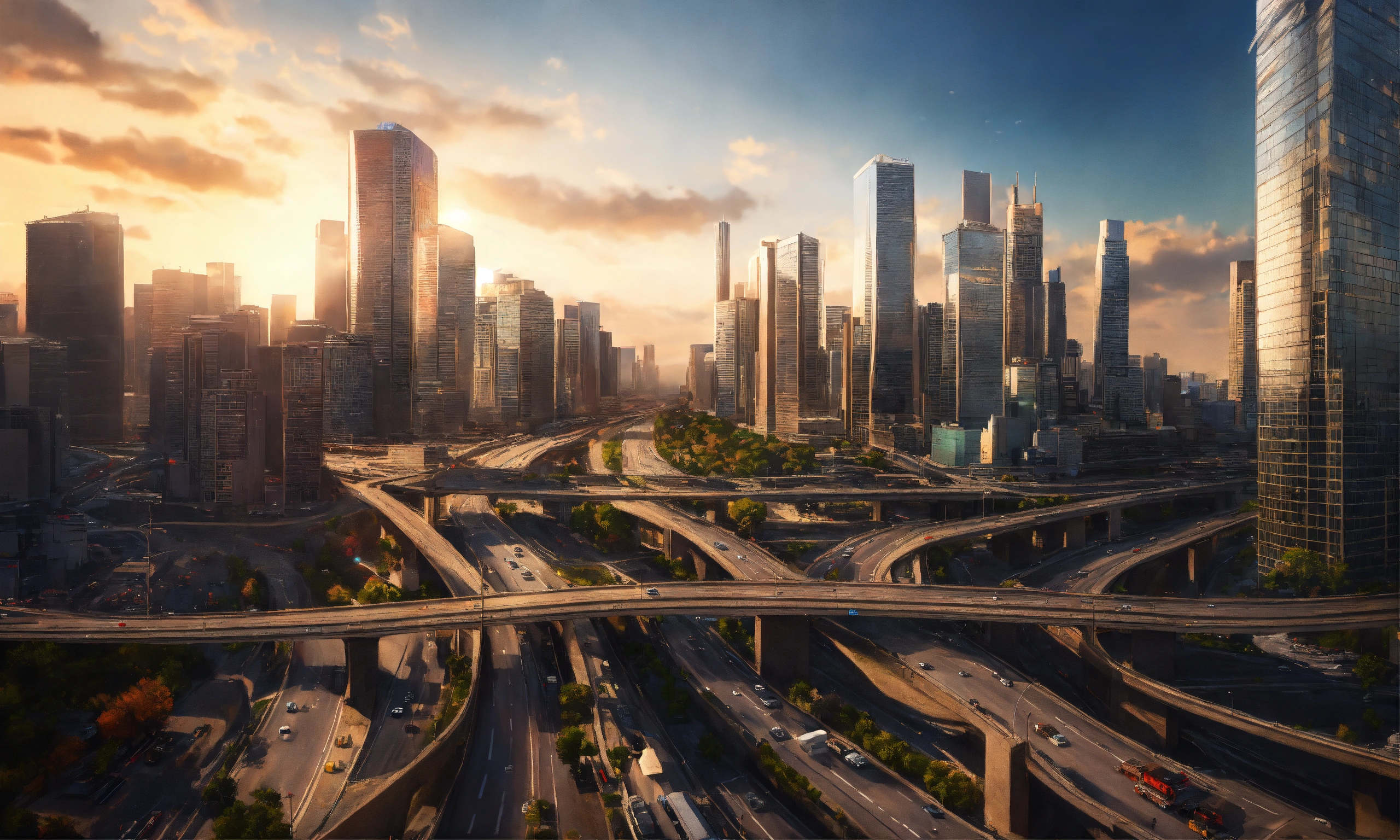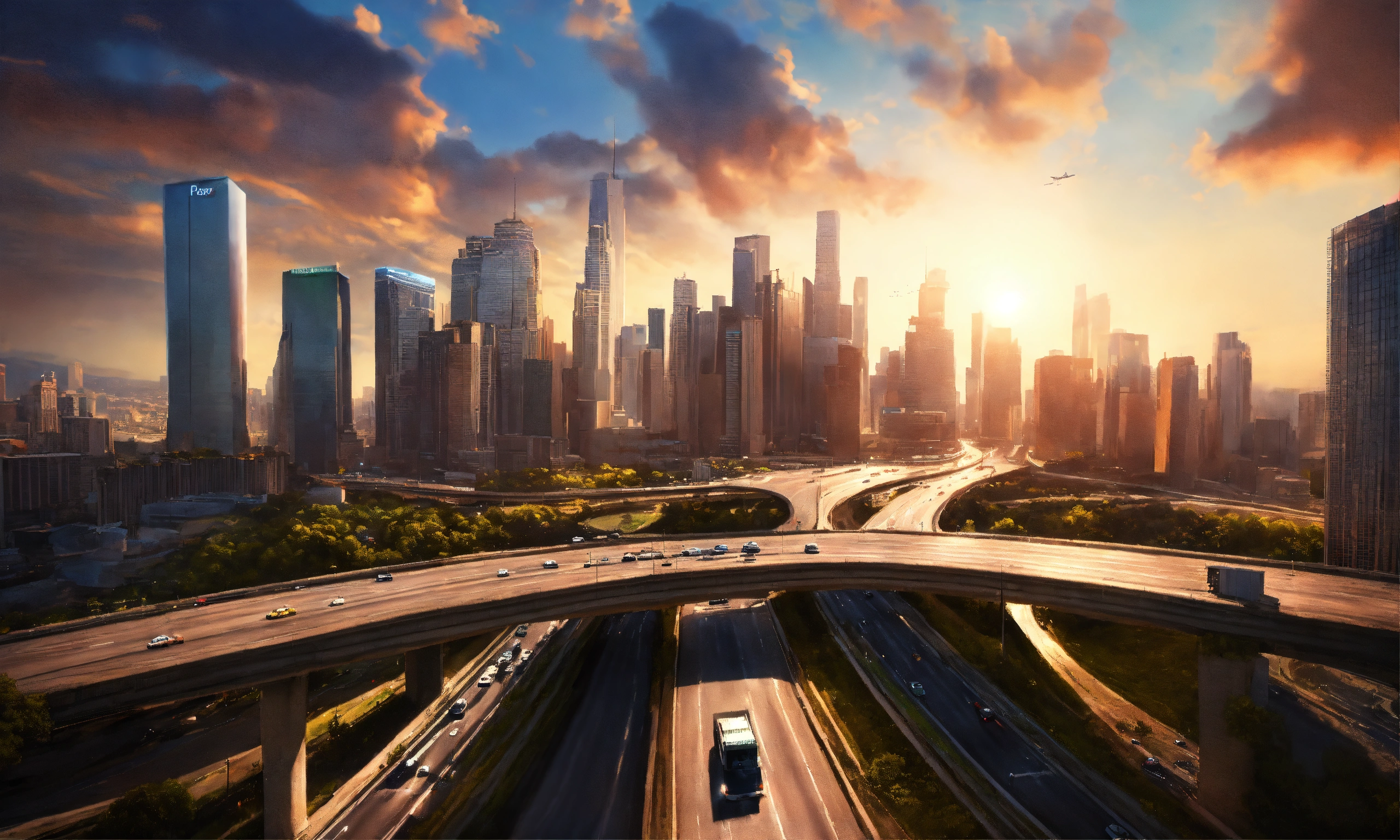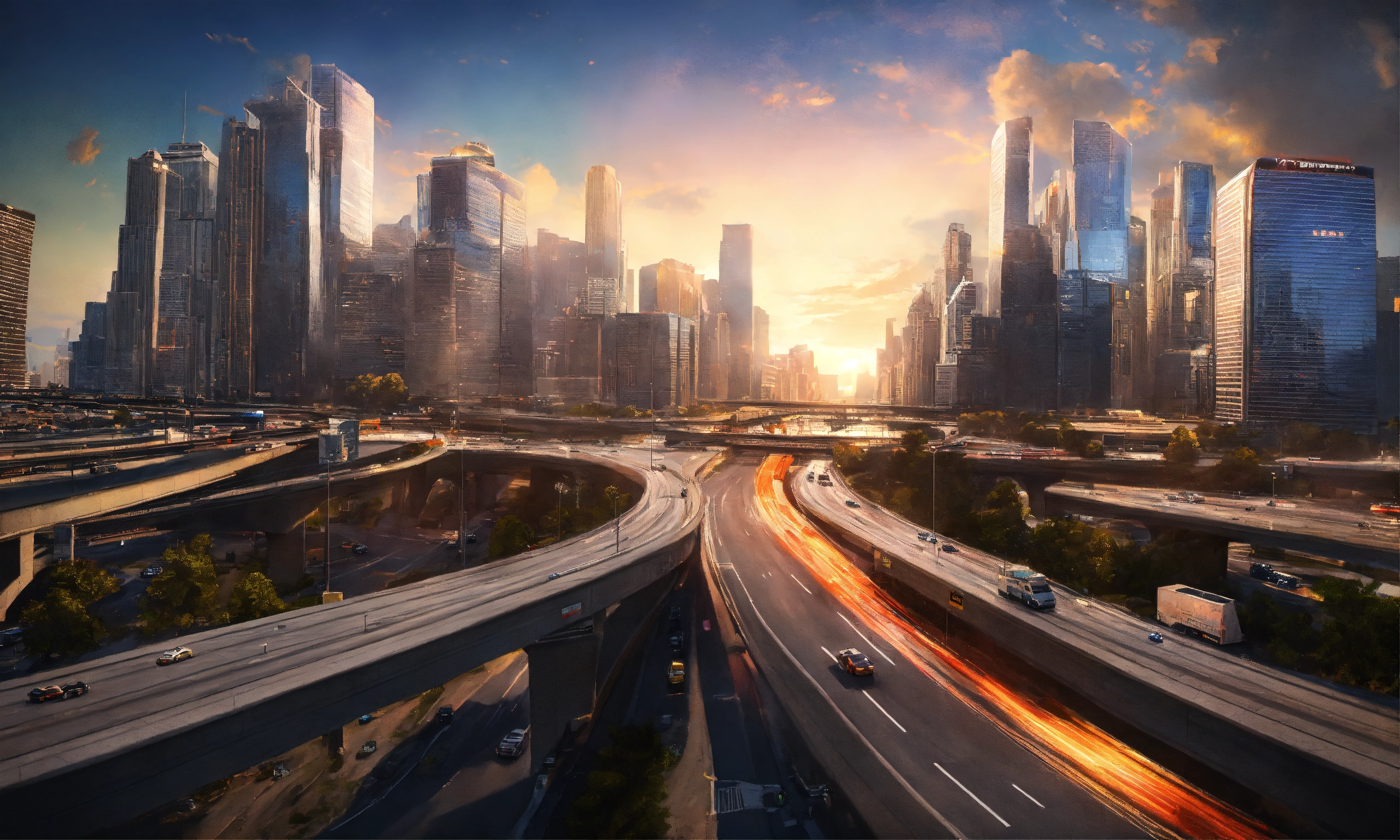 Perspective, with a freeway in the center and skyscrapers on both sides, fantacy, fisheye, pixar, wild angle, 4k
