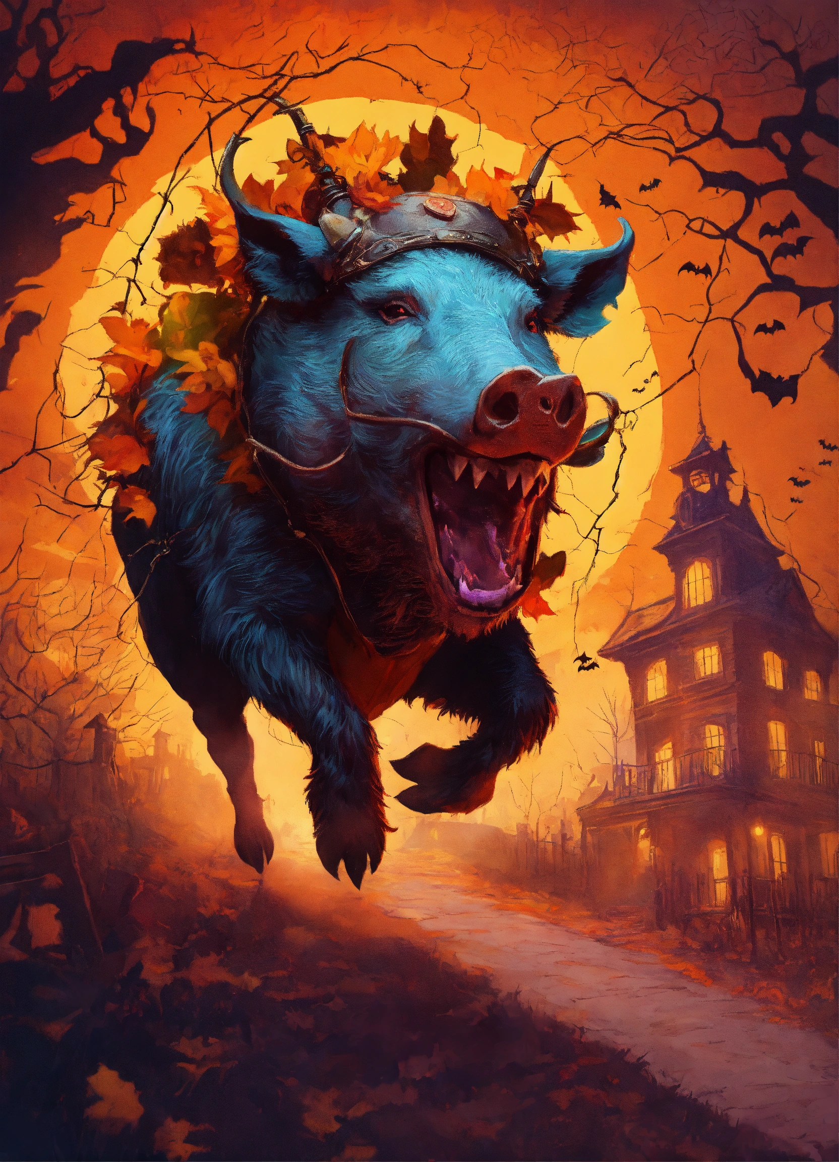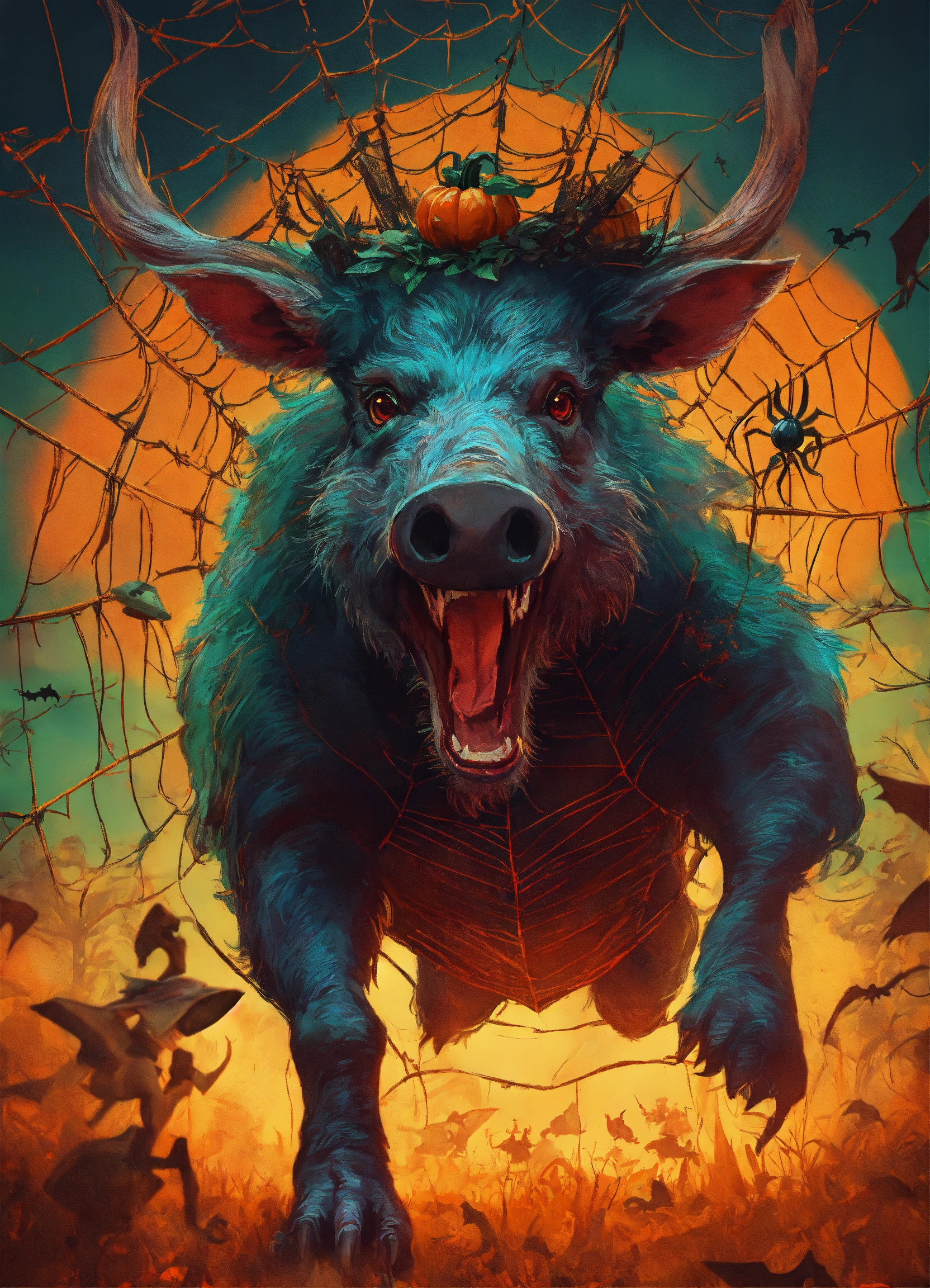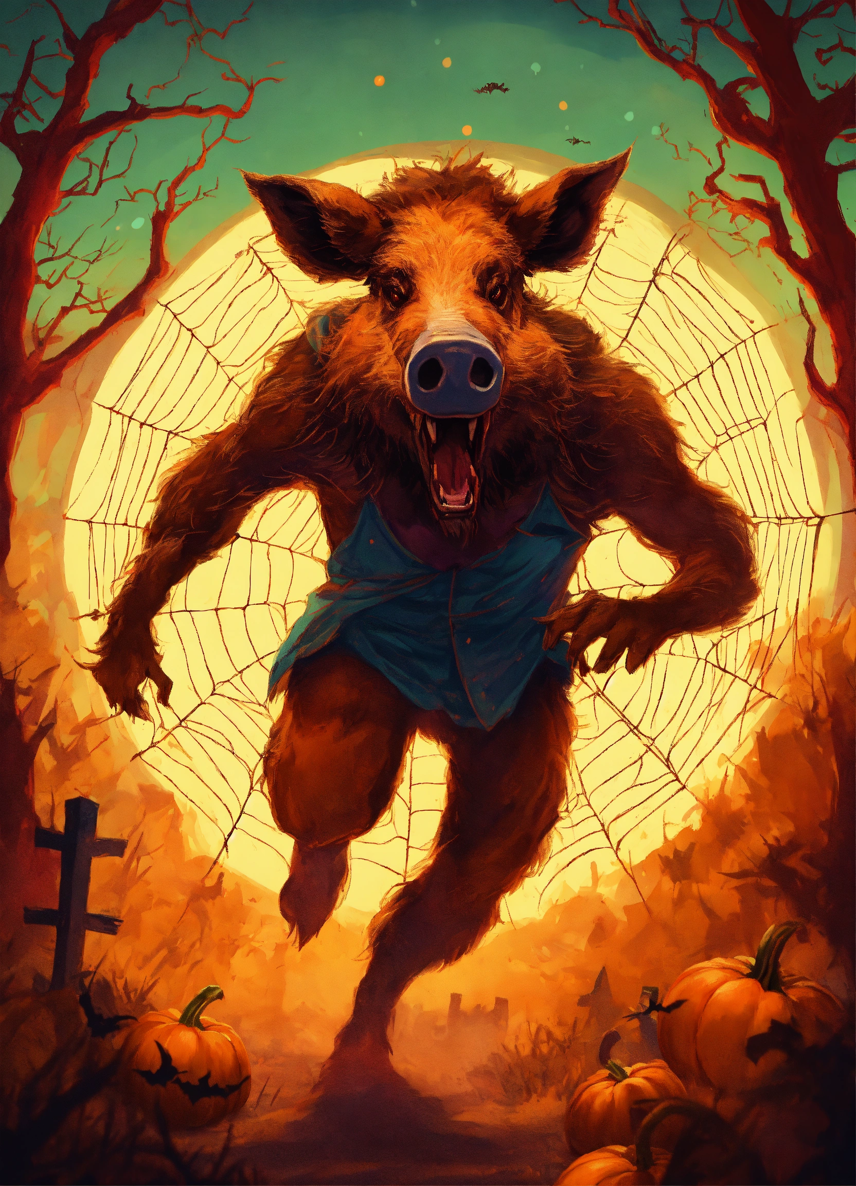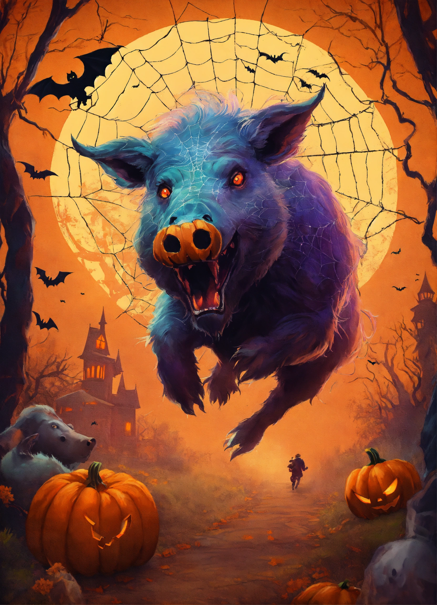 Humoristic body mixed with wild boar head, running, halloween, haunted mansion, ghost, pumpkin, spider web amazing colors, digital illustration